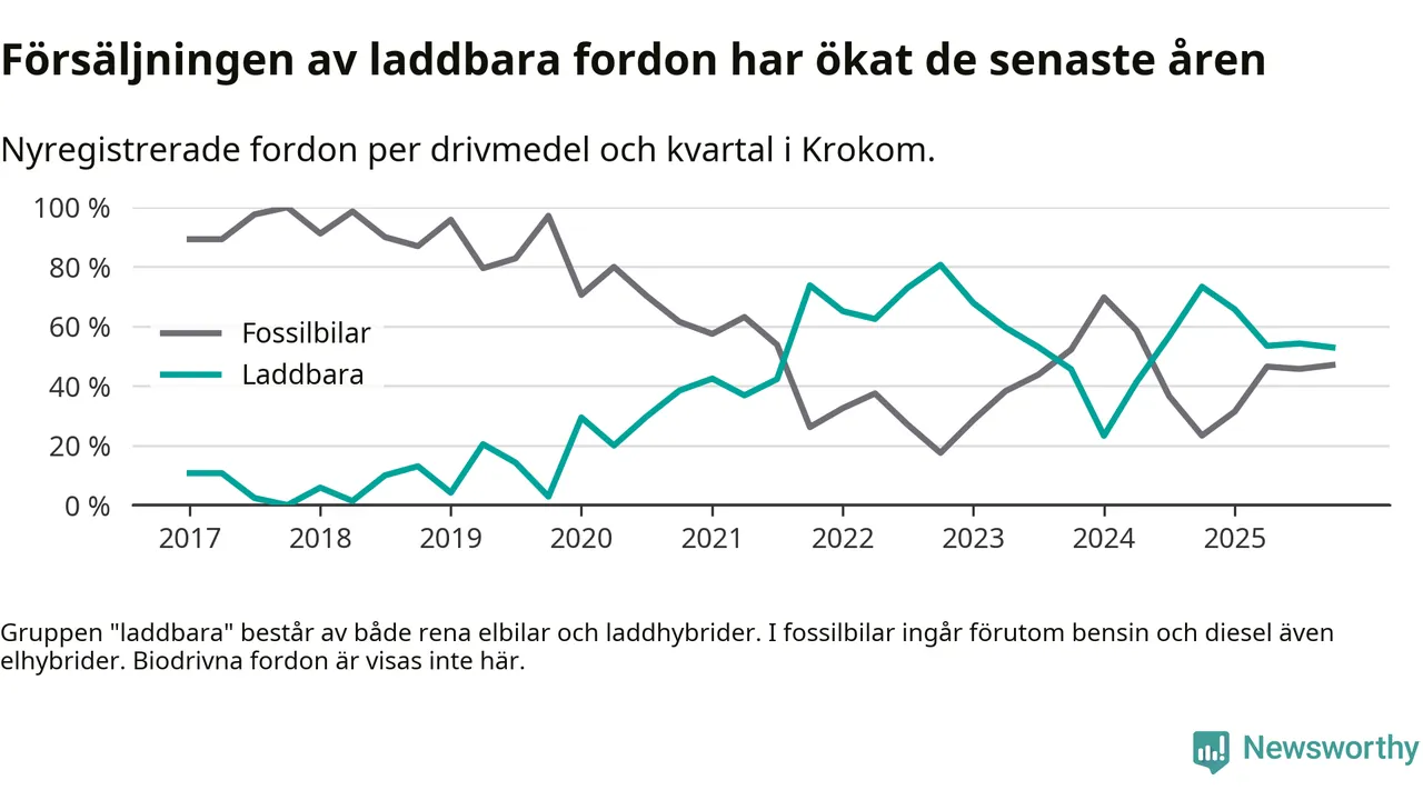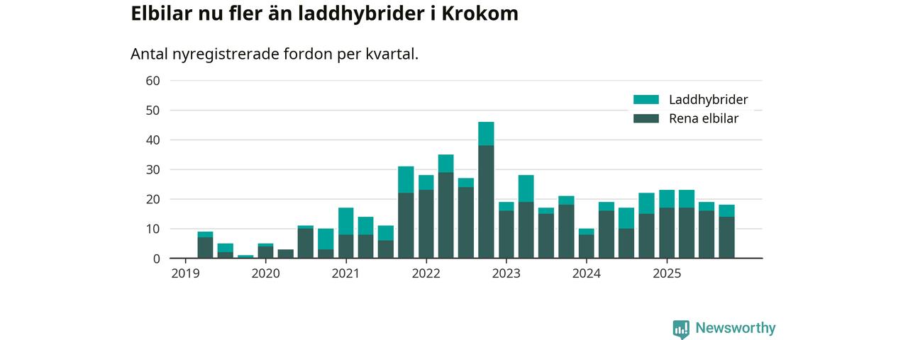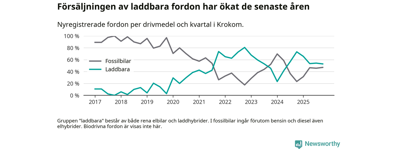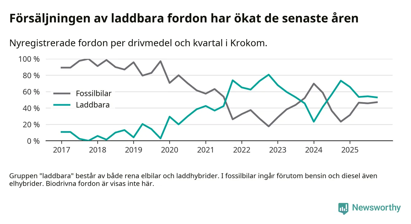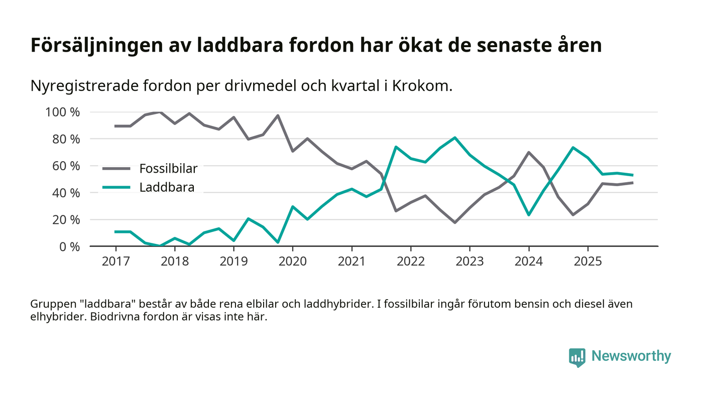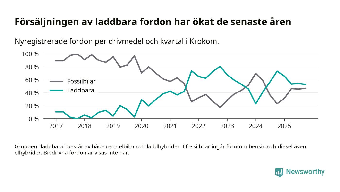 Under fjärde kvartalet 2025 var 53 procent av alla nyregistrerade personbilar i Krokom laddbara (sammanlagt registrerades 34 nya bilar). Merparten av de laddbara bilarna var rena elbilar (41 procent av alla).