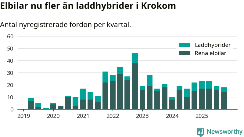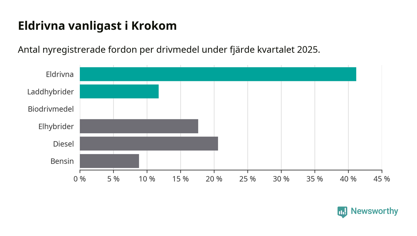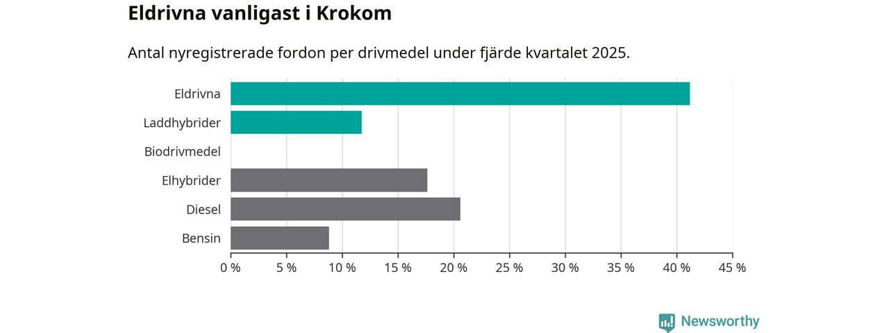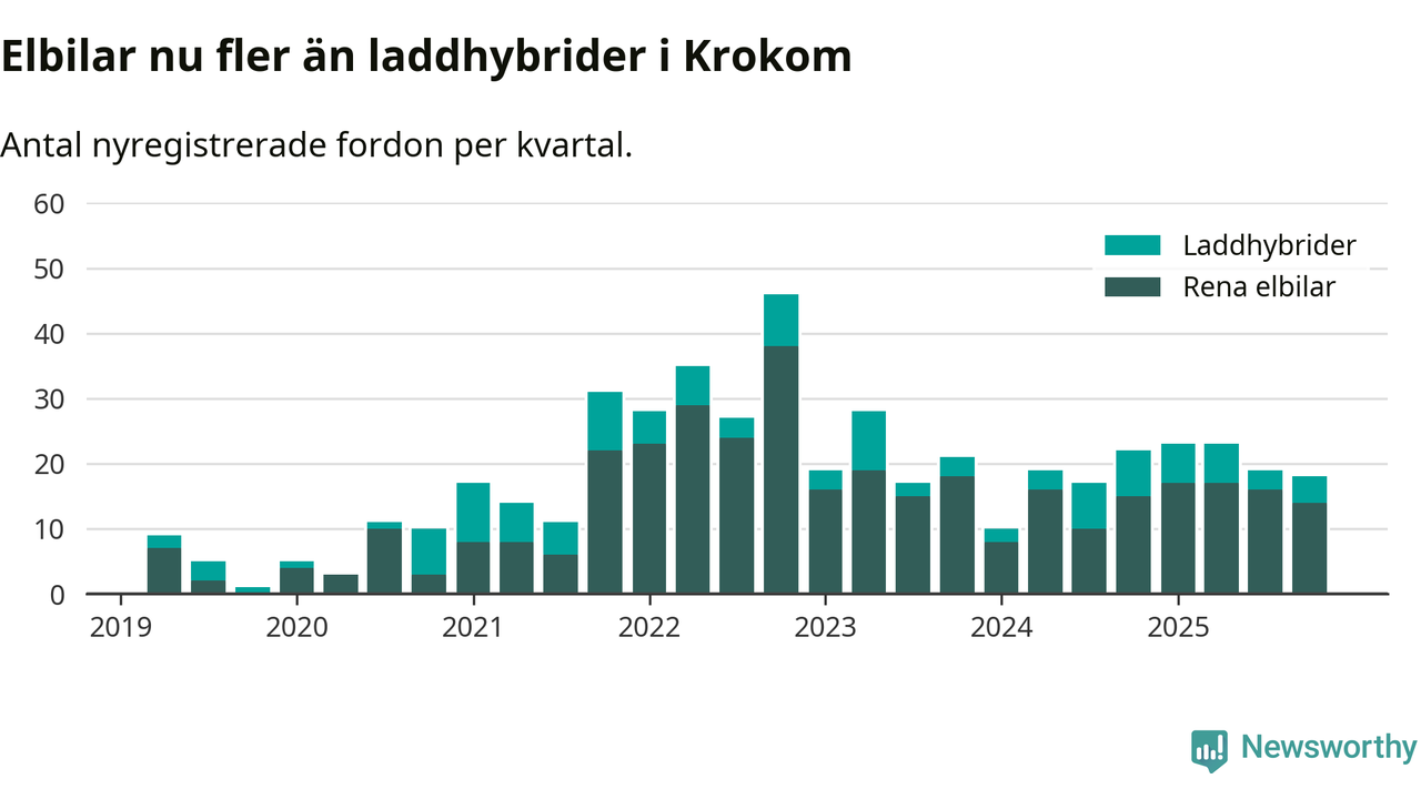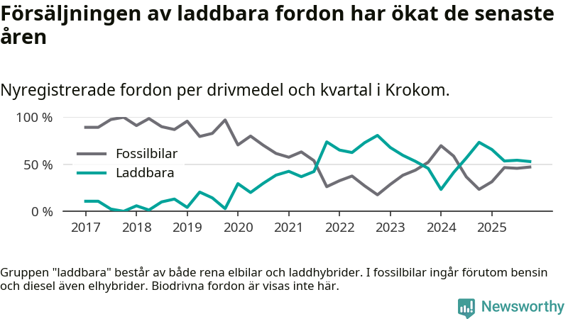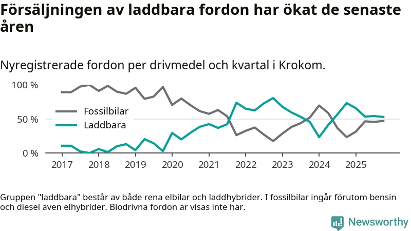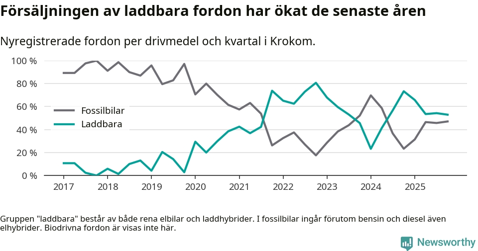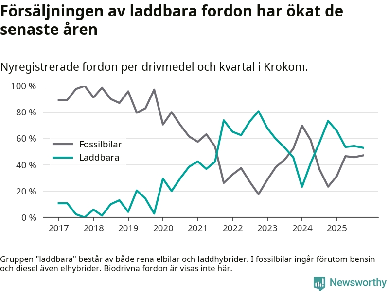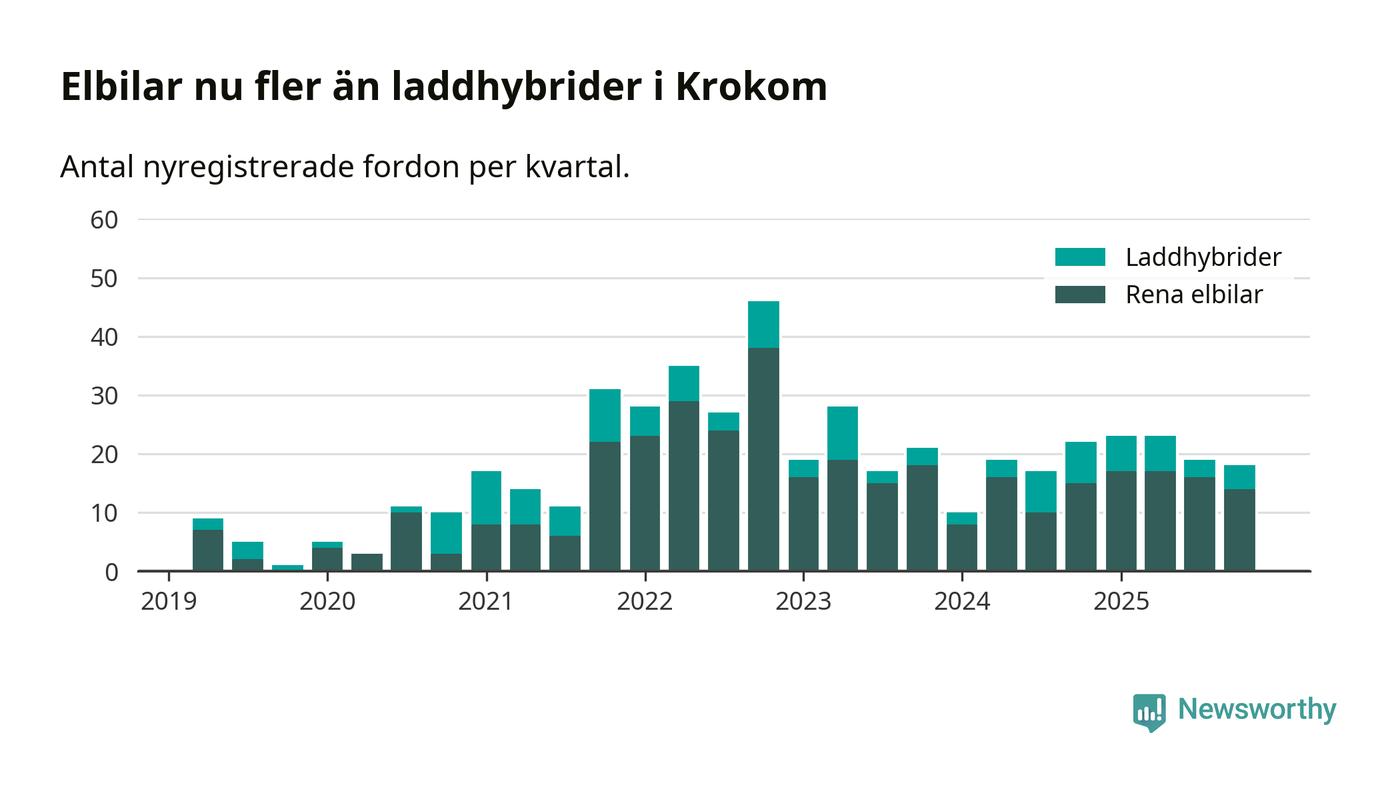 Under fjärde kvartalet 2025 var 53 procent av alla nyregistrerade personbilar i Krokom laddbara (sammanlagt registrerades 34 nya bilar). Merparten av de laddbara bilarna var rena elbilar (41 procent av alla).