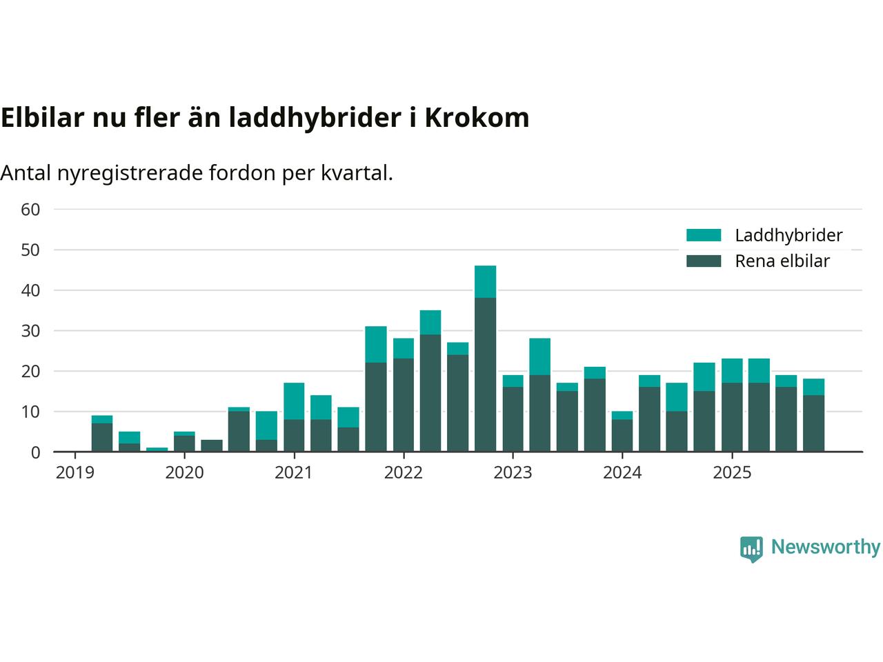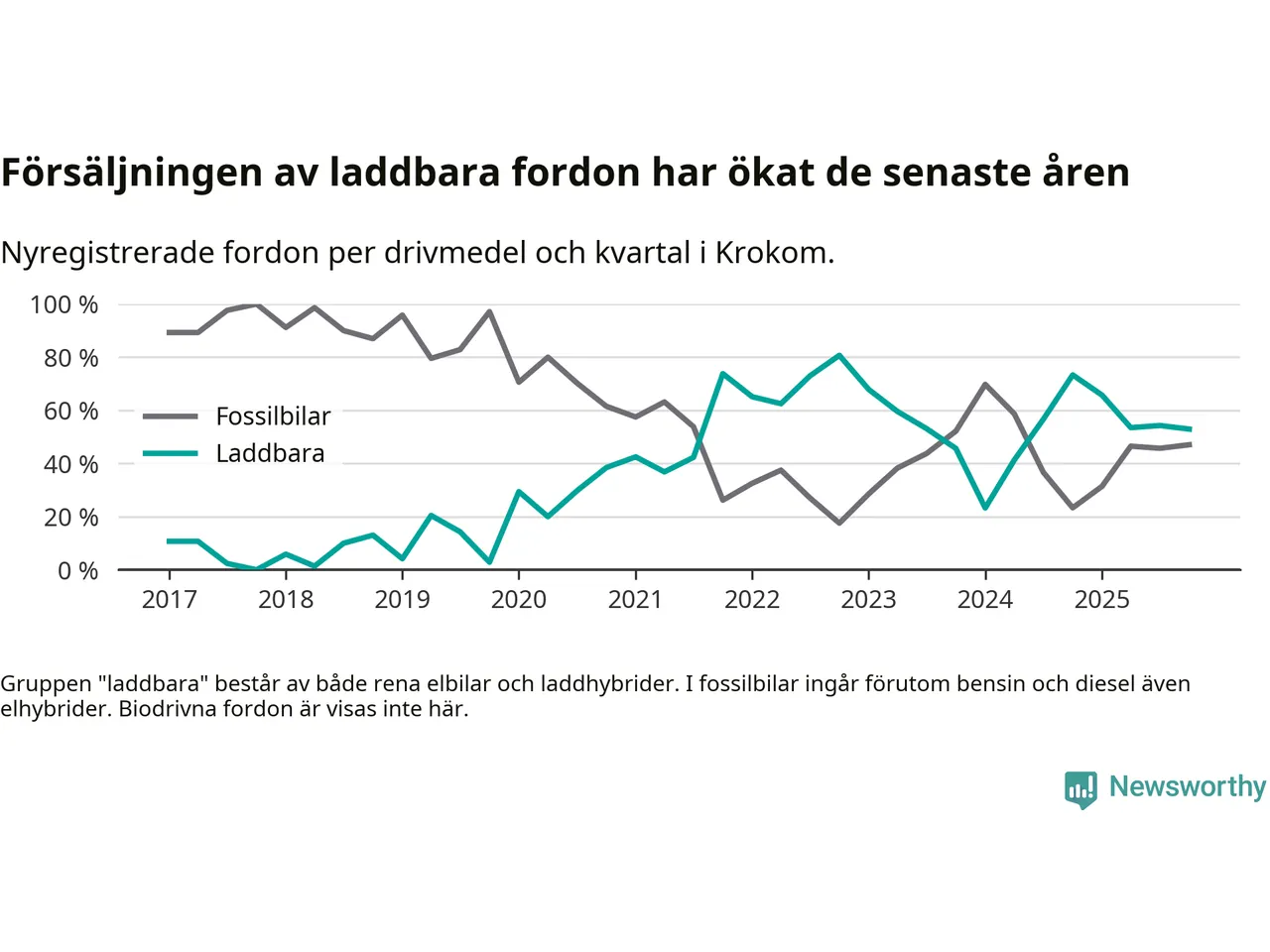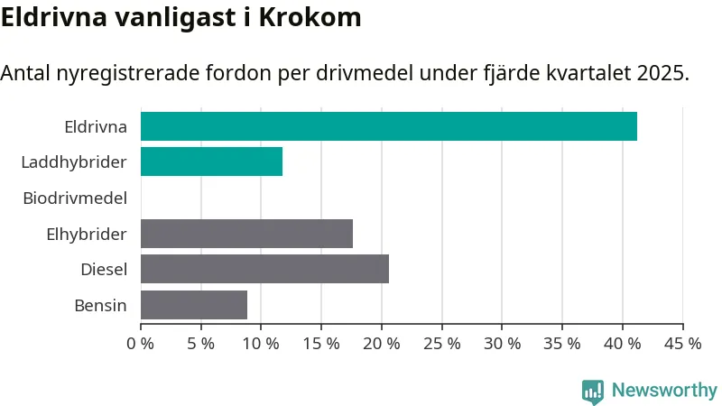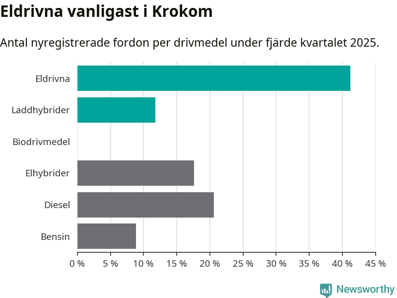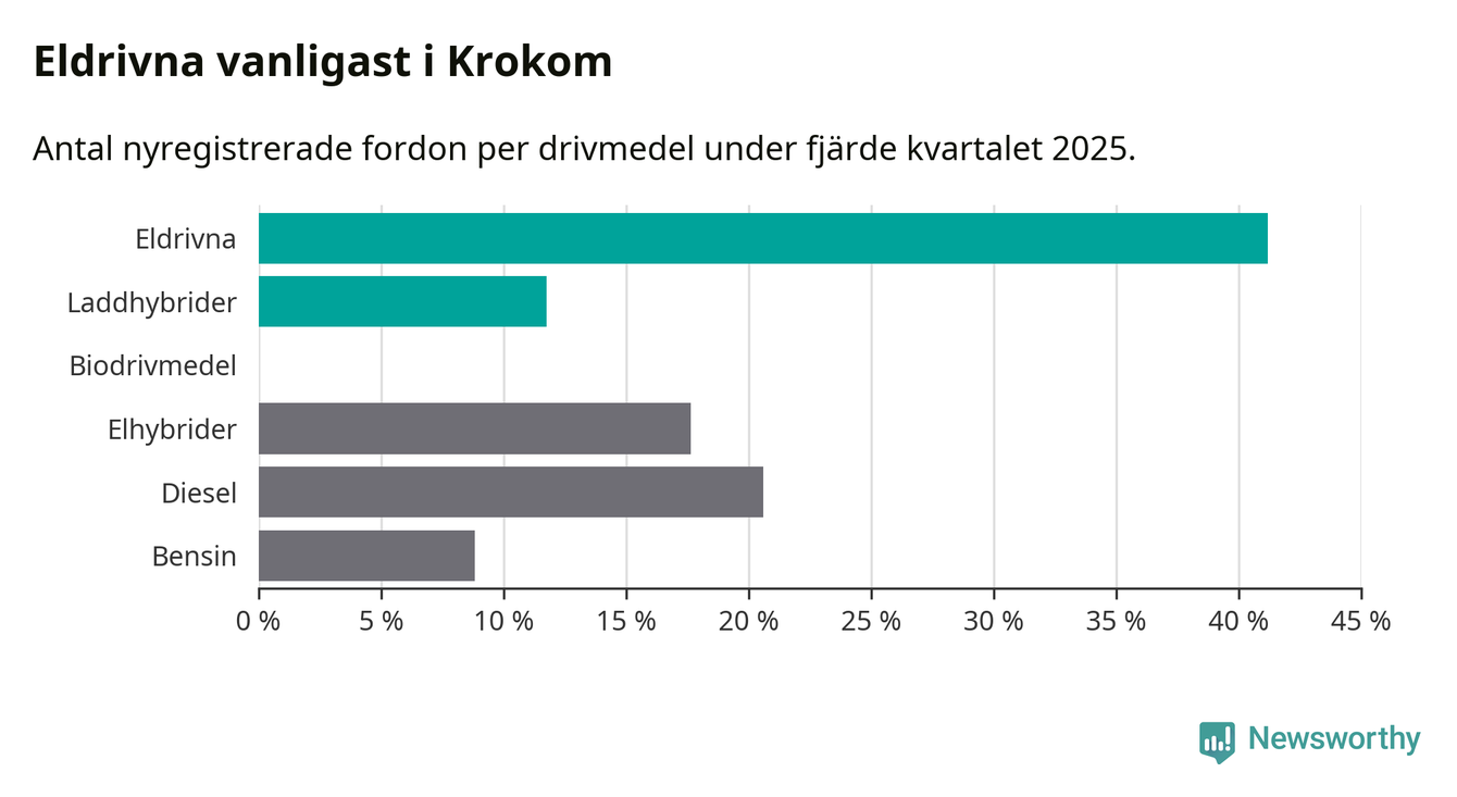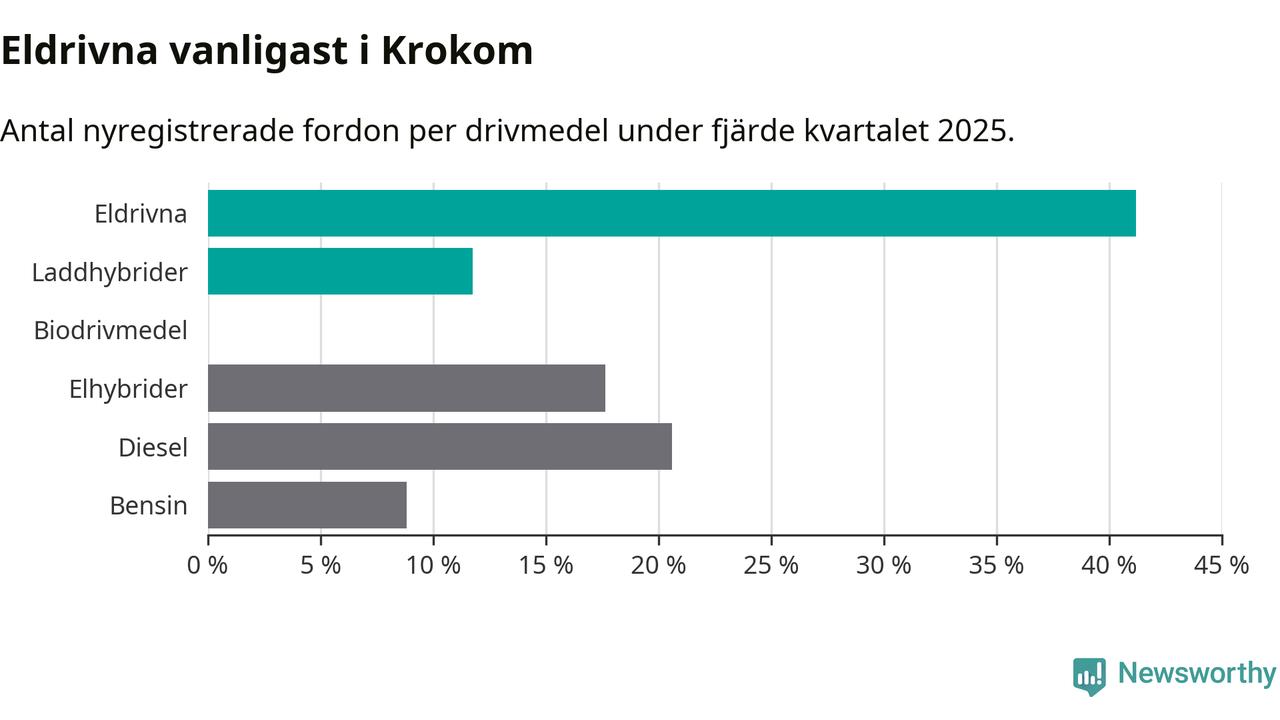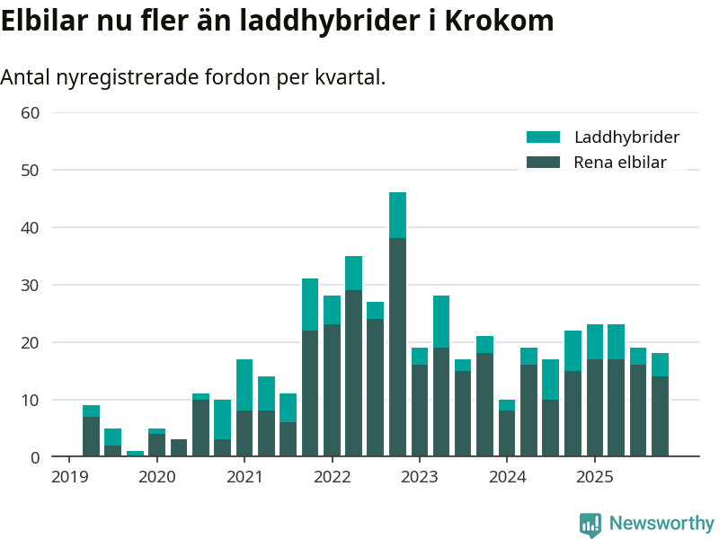Under fjärde kvartalet 2025 var 53 procent av alla nyregistrerade personbilar i Krokom laddbara (sammanlagt registrerades 34 nya bilar). Merparten av de laddbara bilarna var rena elbilar (41 procent av alla).