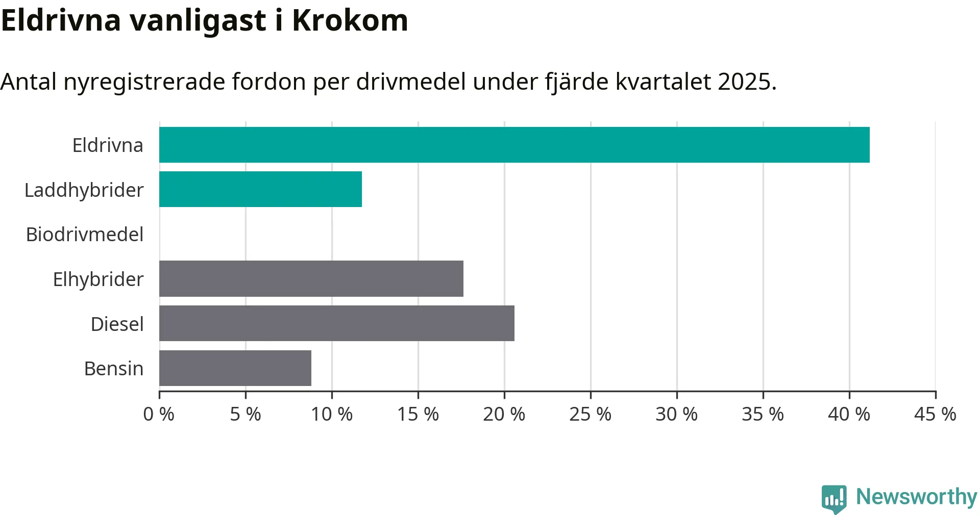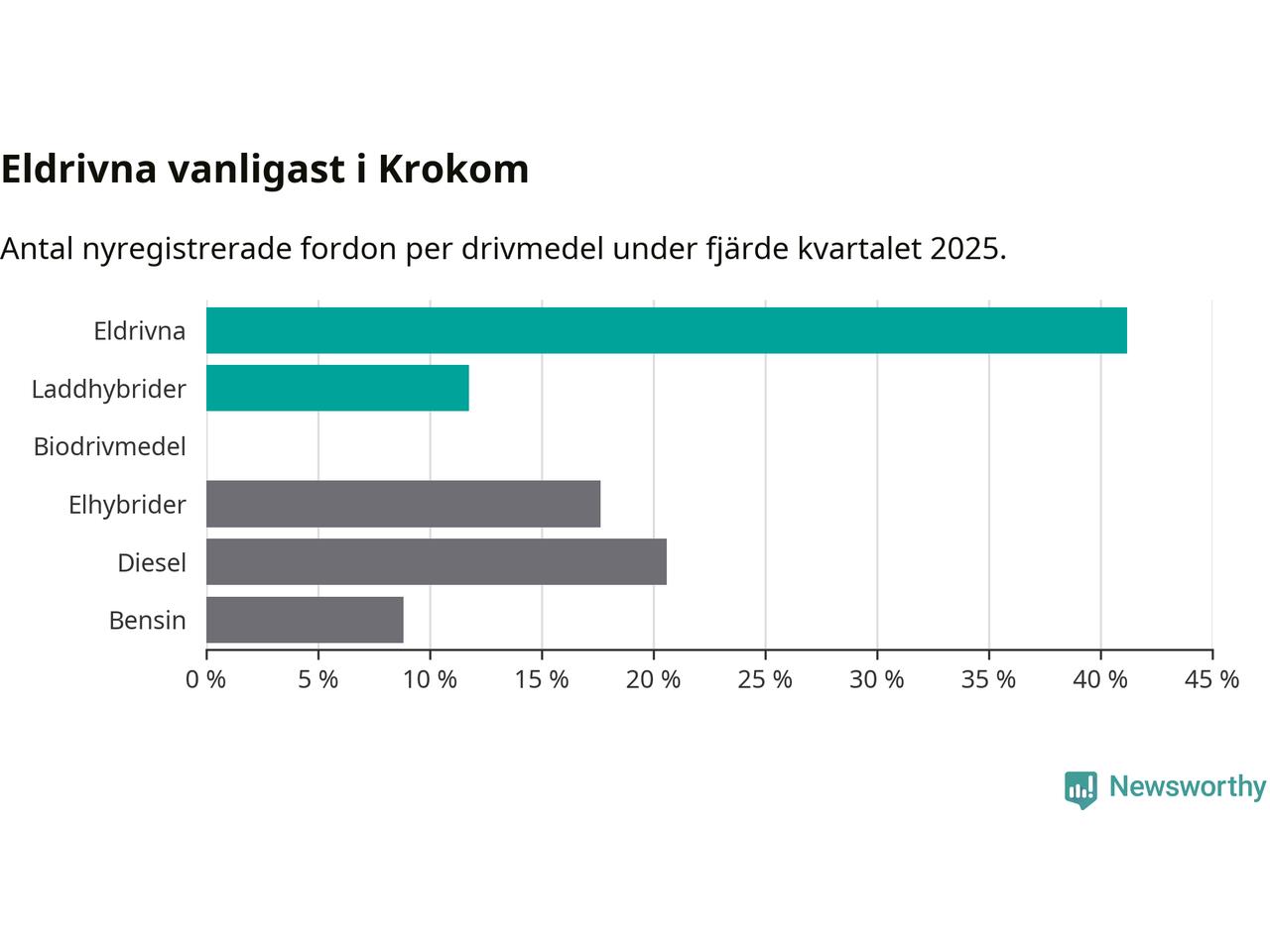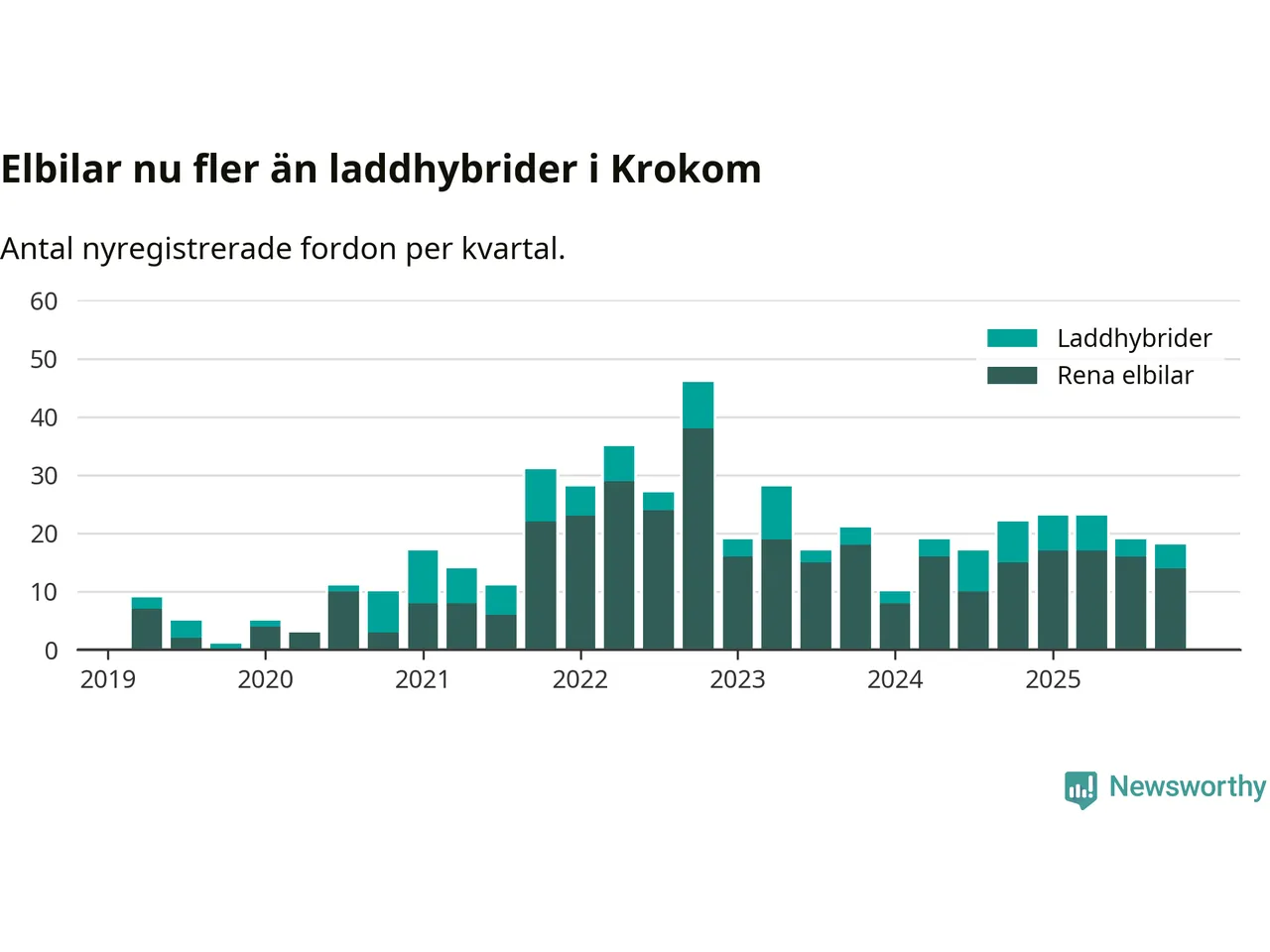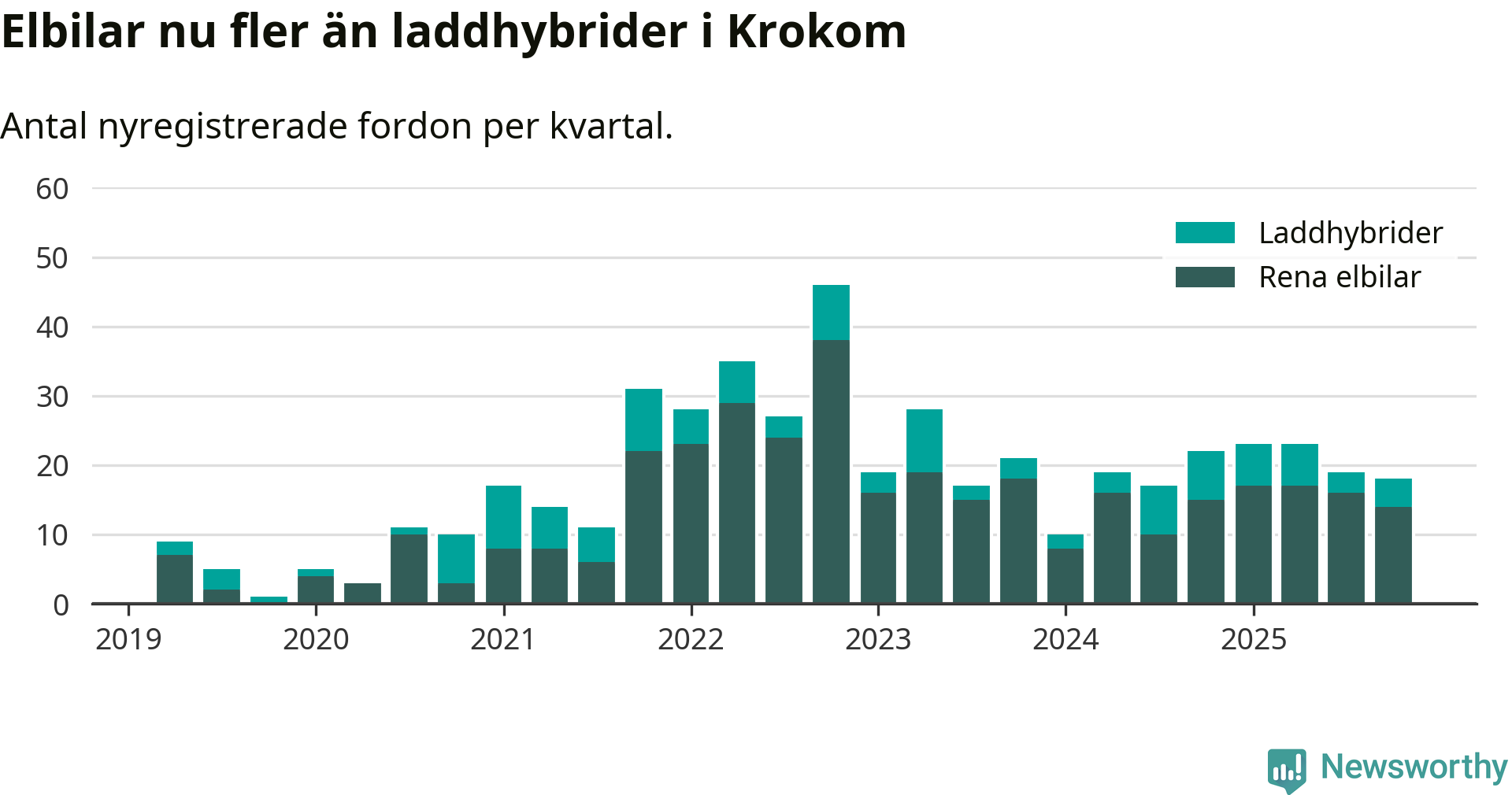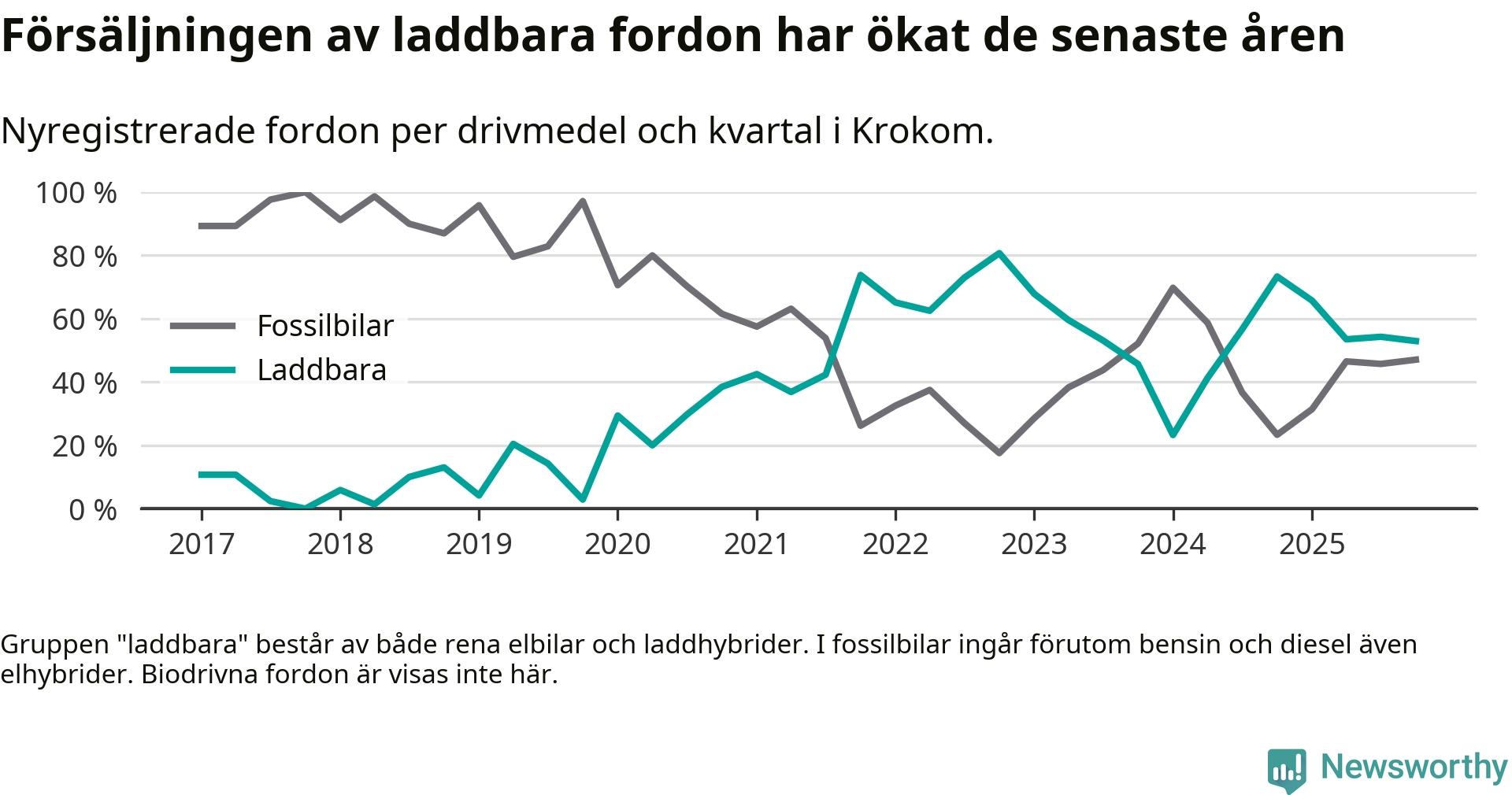 Under fjärde kvartalet 2025 var 53 procent av alla nyregistrerade personbilar i Krokom laddbara (sammanlagt registrerades 34 nya bilar). Merparten av de laddbara bilarna var rena elbilar (41 procent av alla).