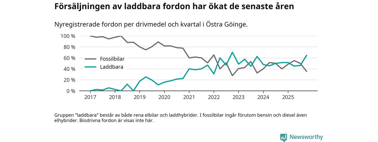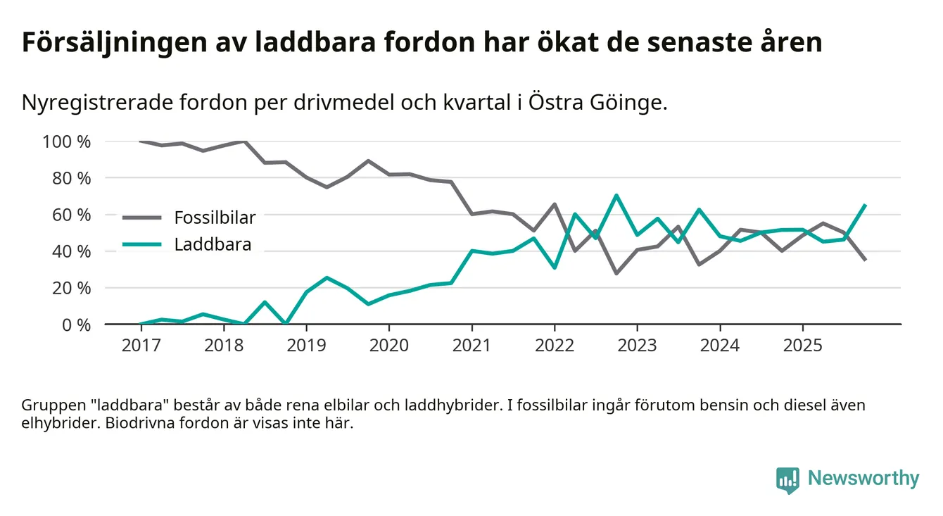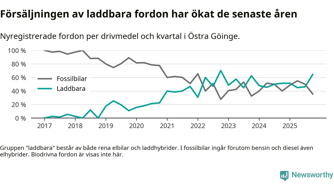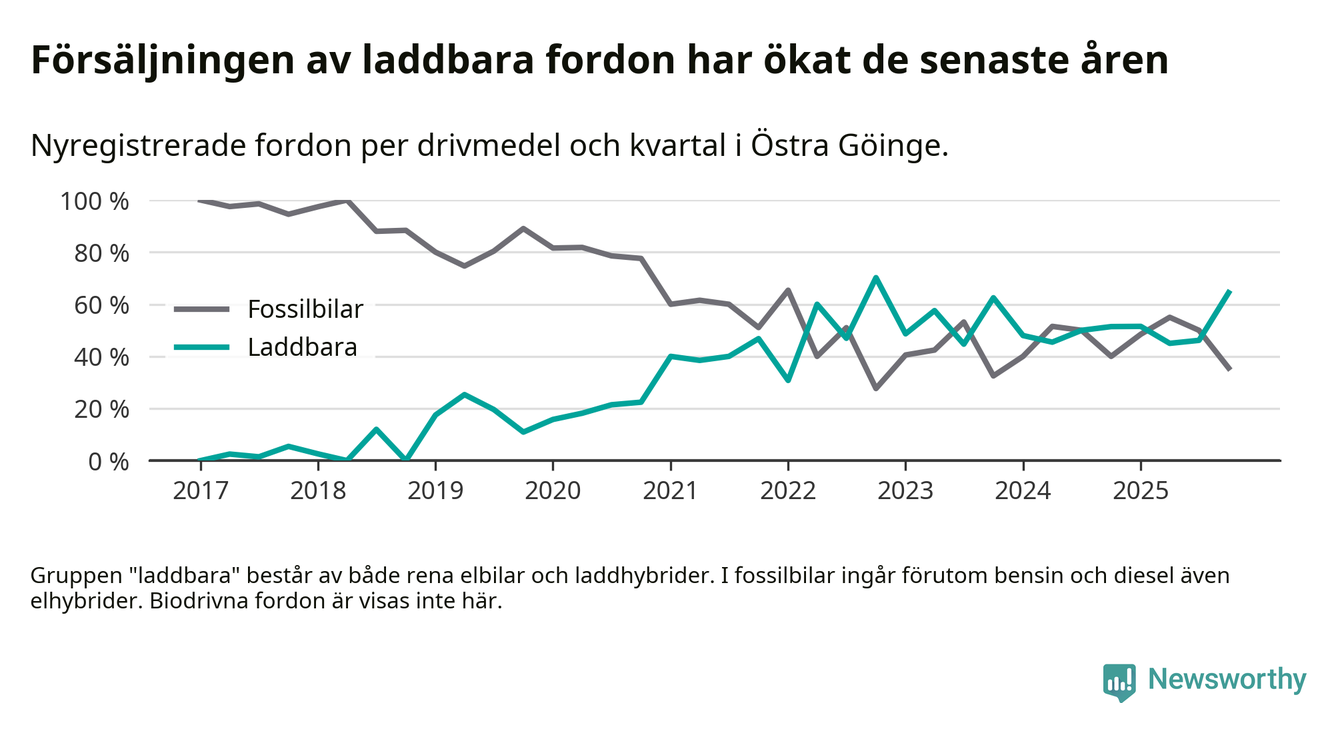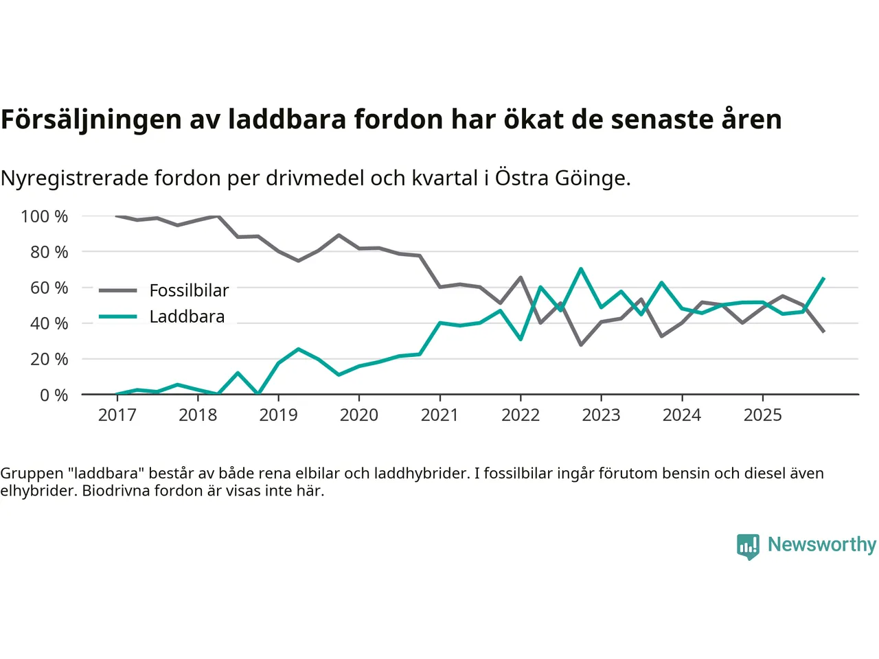 Under fjärde kvartalet 2025 var 64 procent av alla nyregistrerade personbilar i Östra Göinge laddbara (sammanlagt registrerades 45 nya bilar). Merparten av de laddbara bilarna var rena elbilar (36 procent av alla).