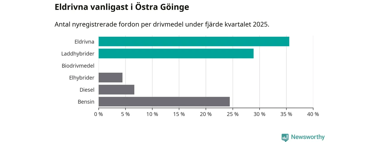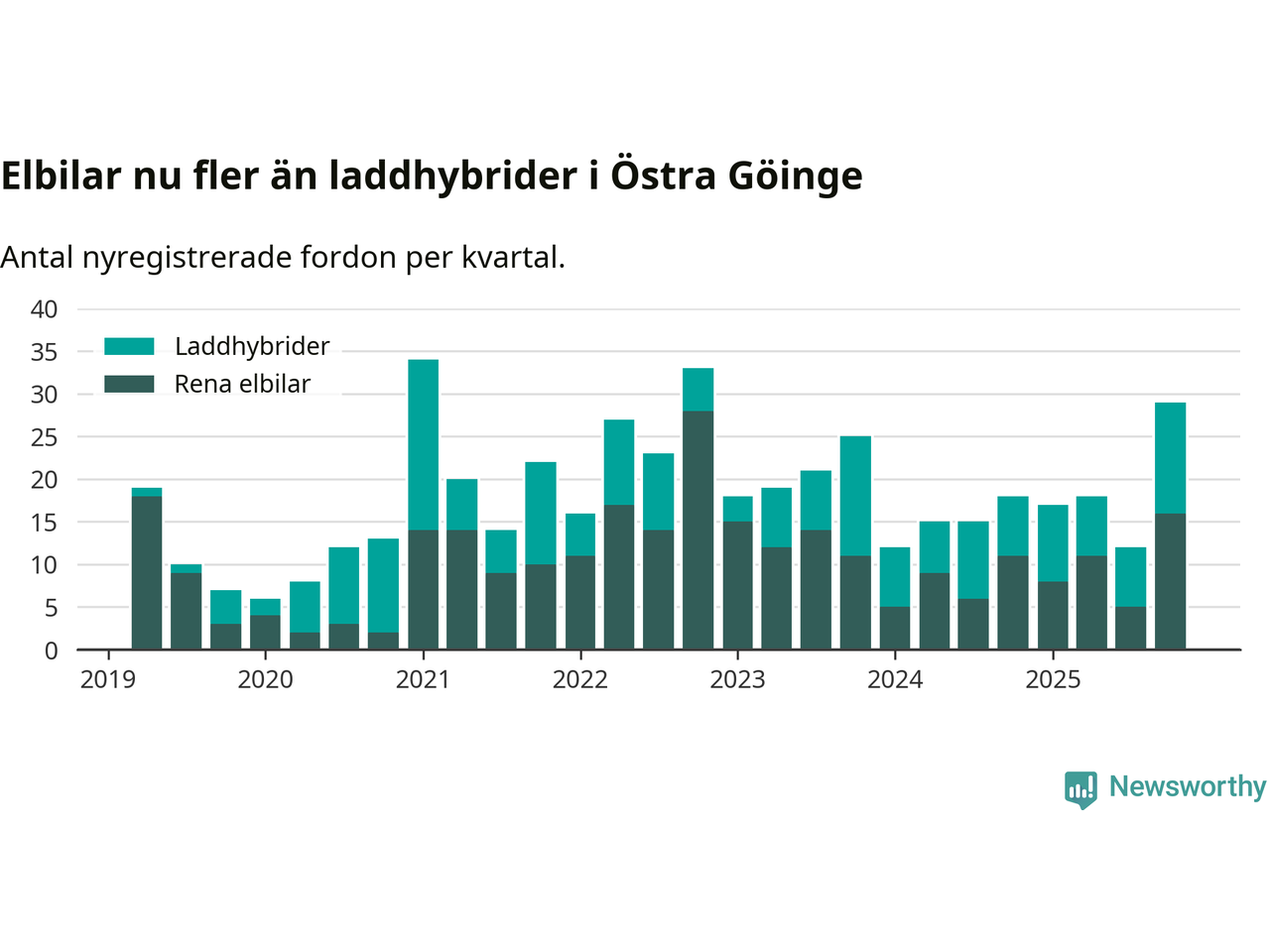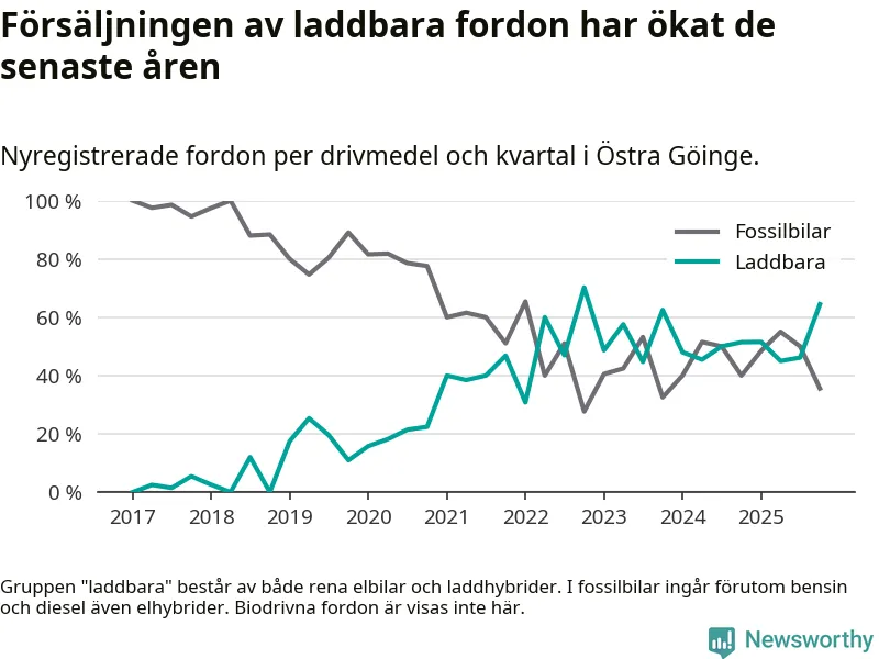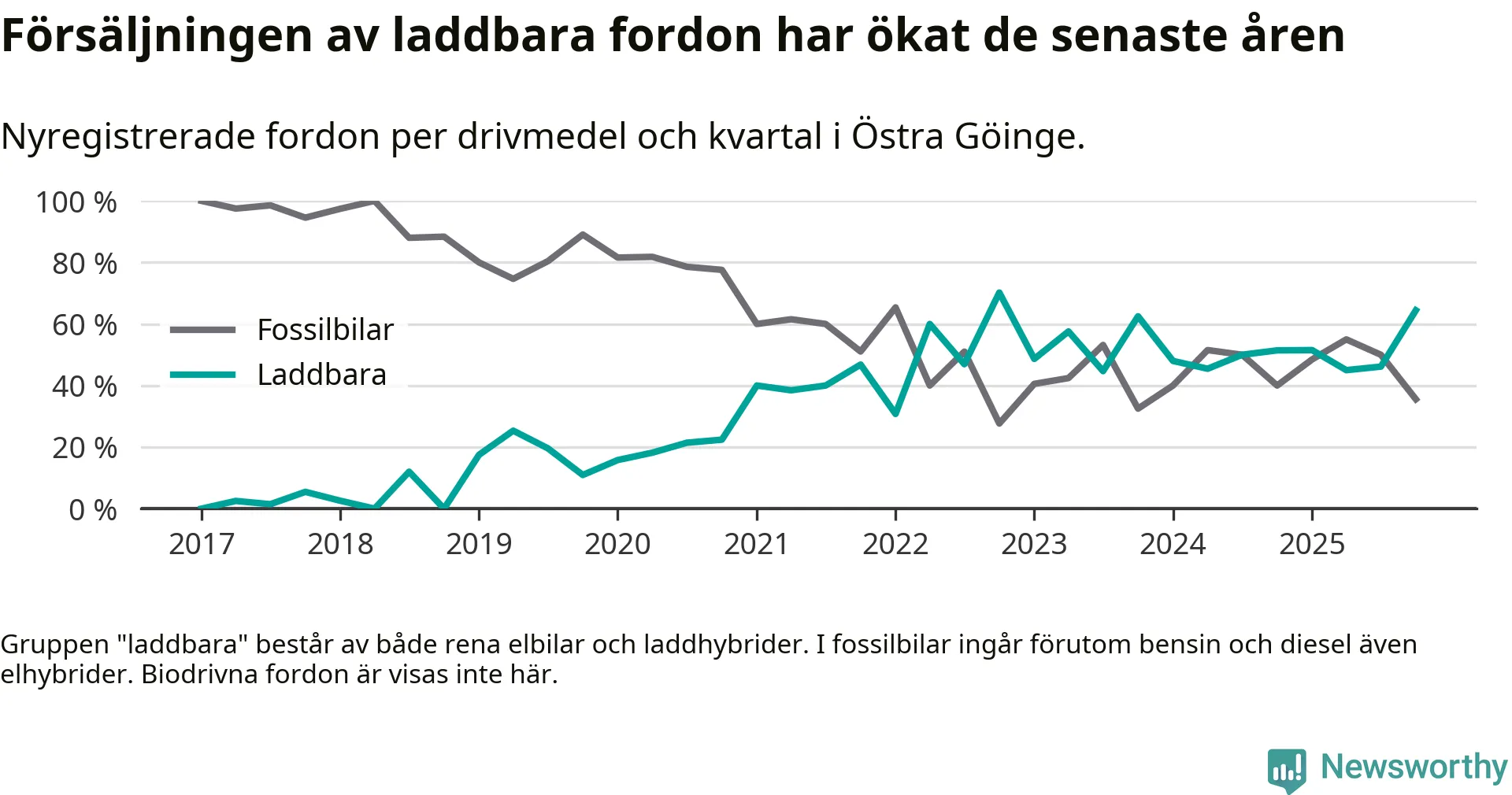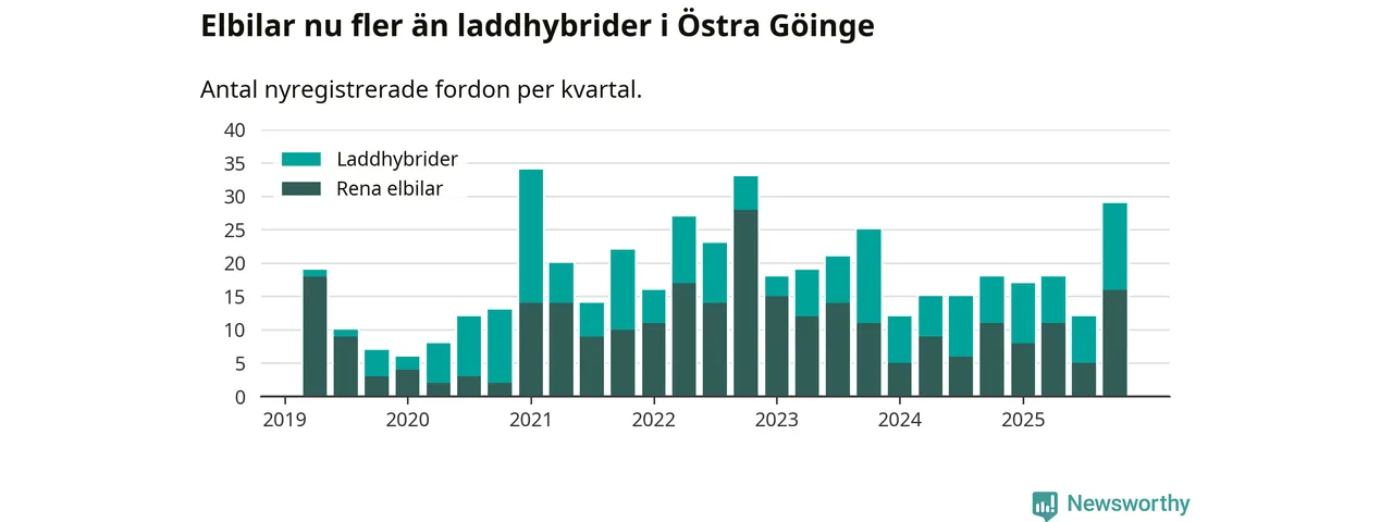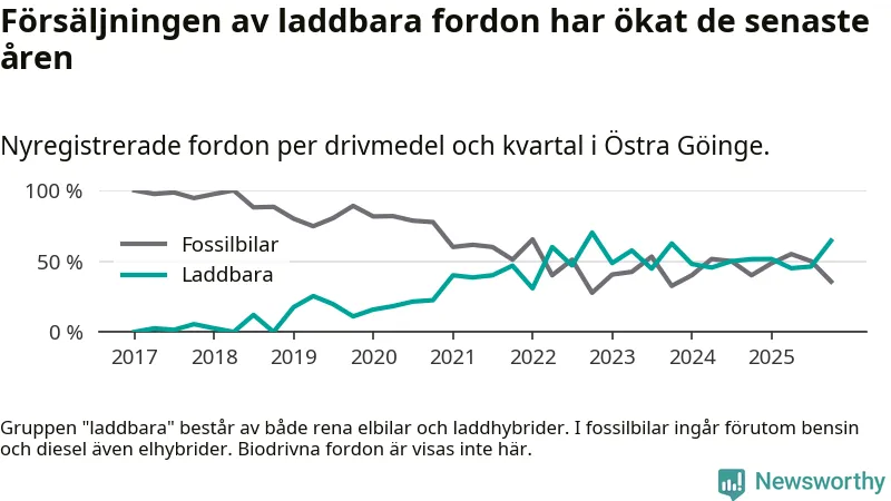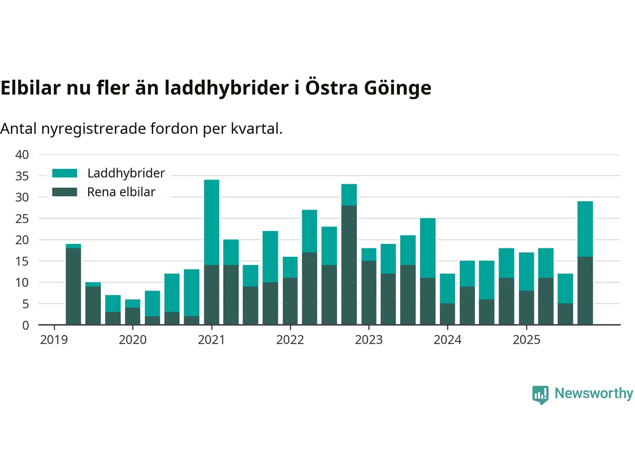 Under fjärde kvartalet 2025 var 64 procent av alla nyregistrerade personbilar i Östra Göinge laddbara (sammanlagt registrerades 45 nya bilar). Merparten av de laddbara bilarna var rena elbilar (36 procent av alla).