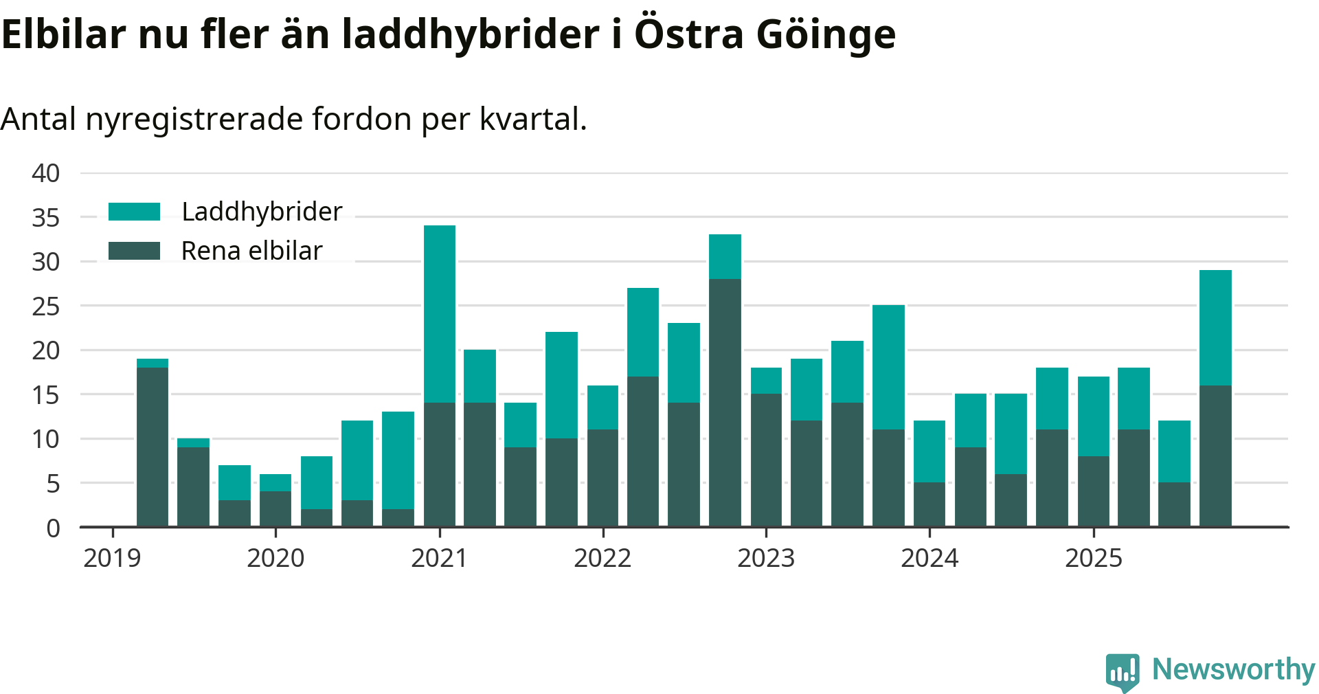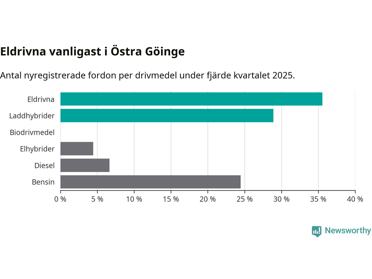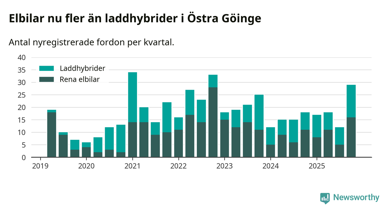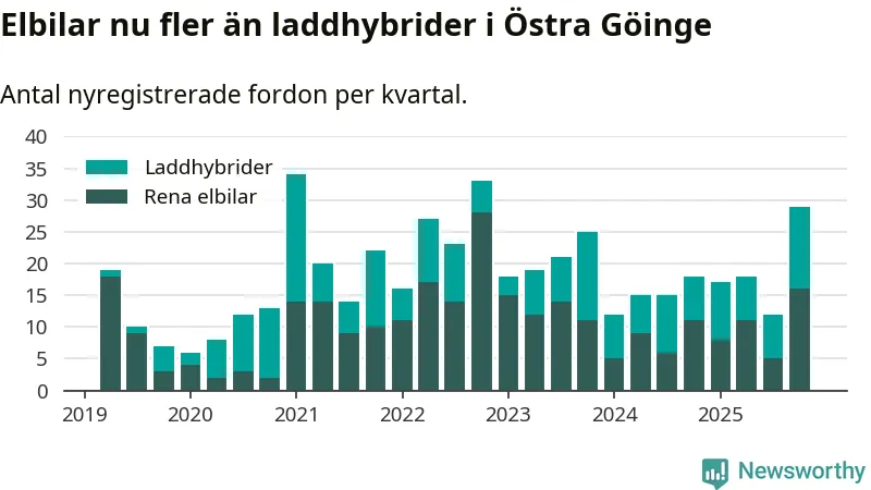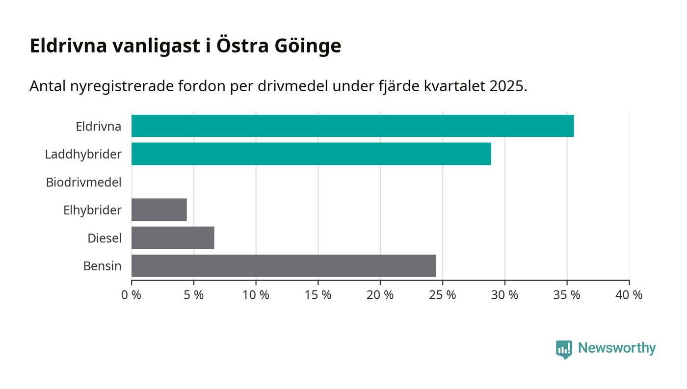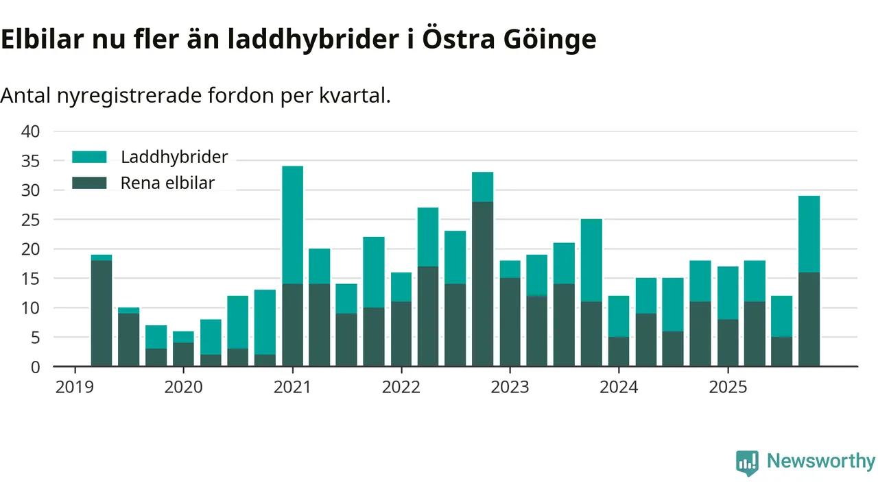 Under fjärde kvartalet 2025 var 64 procent av alla nyregistrerade personbilar i Östra Göinge laddbara (sammanlagt registrerades 45 nya bilar). Merparten av de laddbara bilarna var rena elbilar (36 procent av alla).