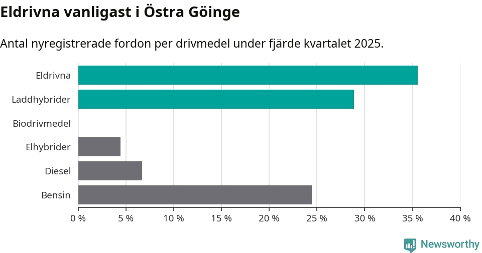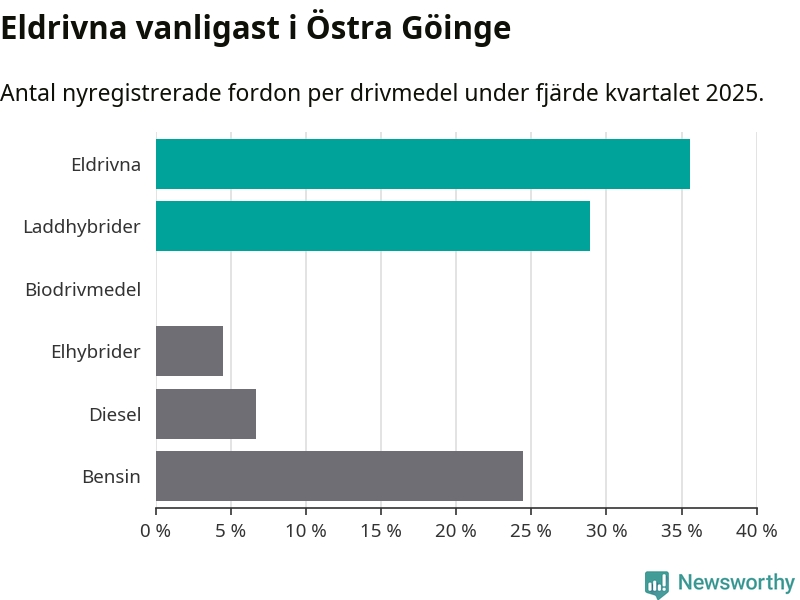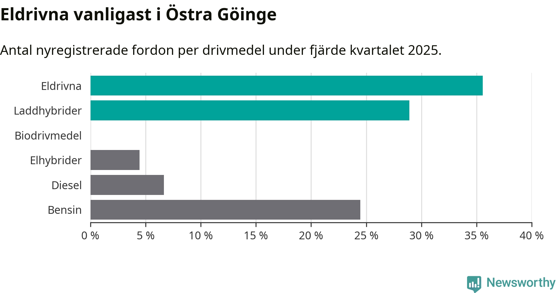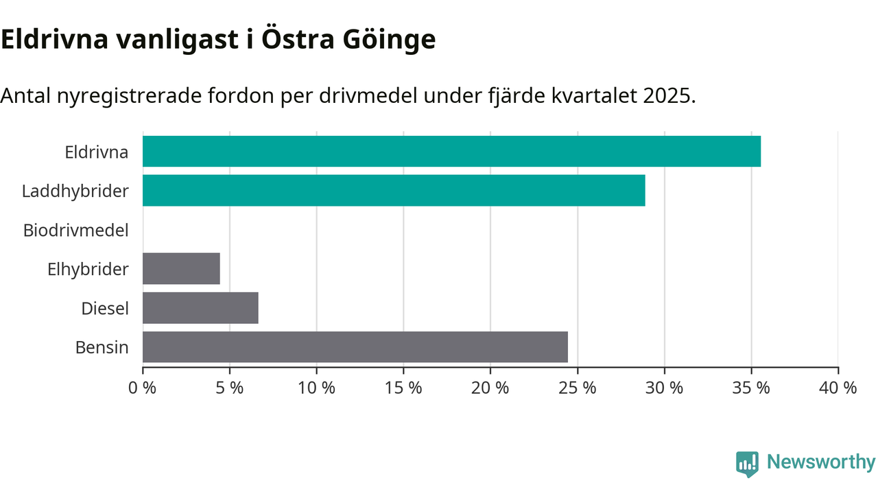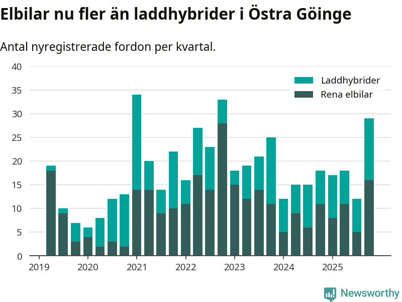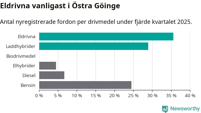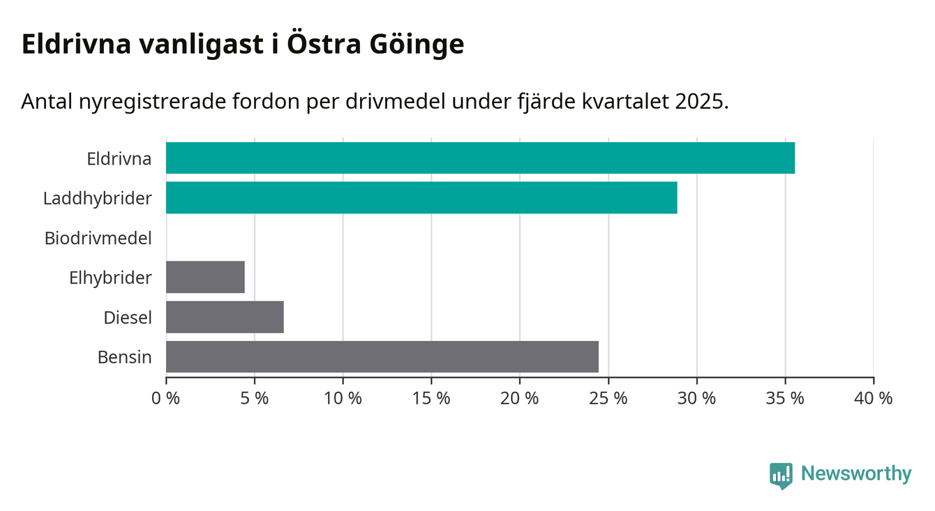 Under fjärde kvartalet 2025 var 64 procent av alla nyregistrerade personbilar i Östra Göinge laddbara (sammanlagt registrerades 45 nya bilar). Merparten av de laddbara bilarna var rena elbilar (36 procent av alla).