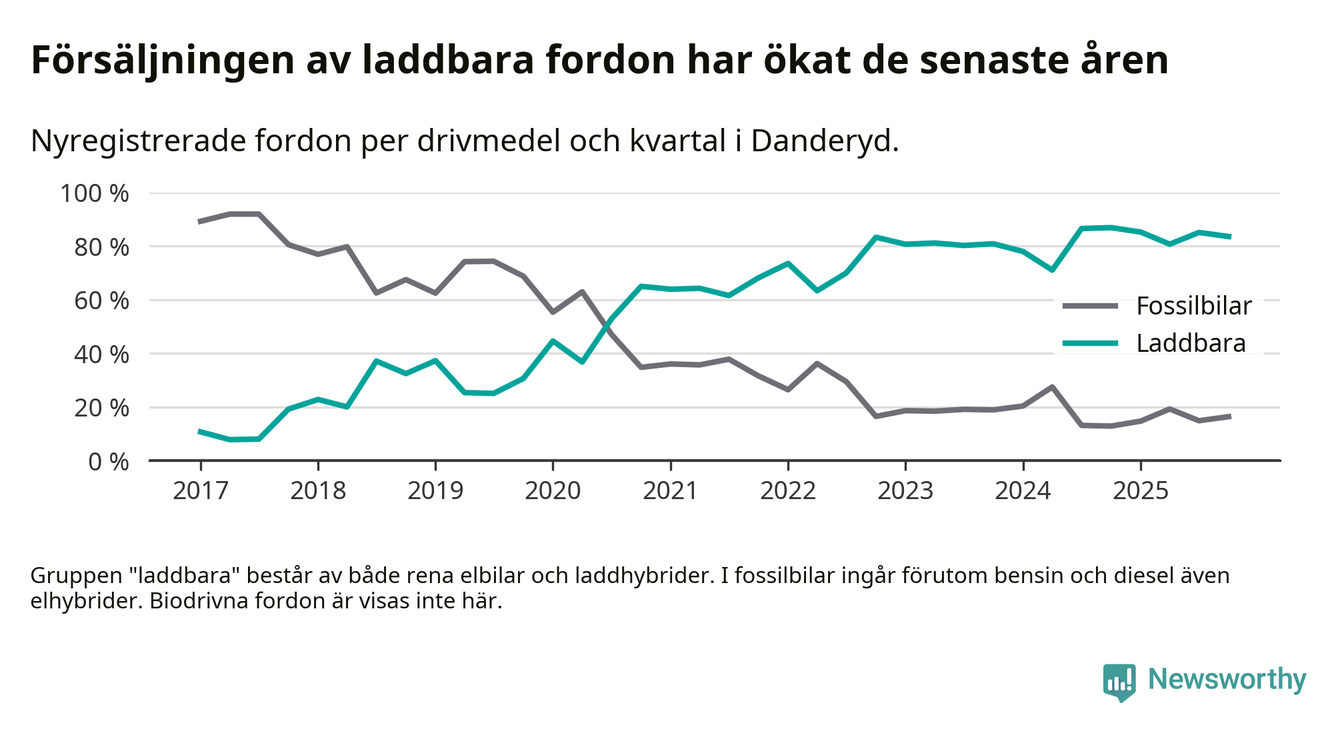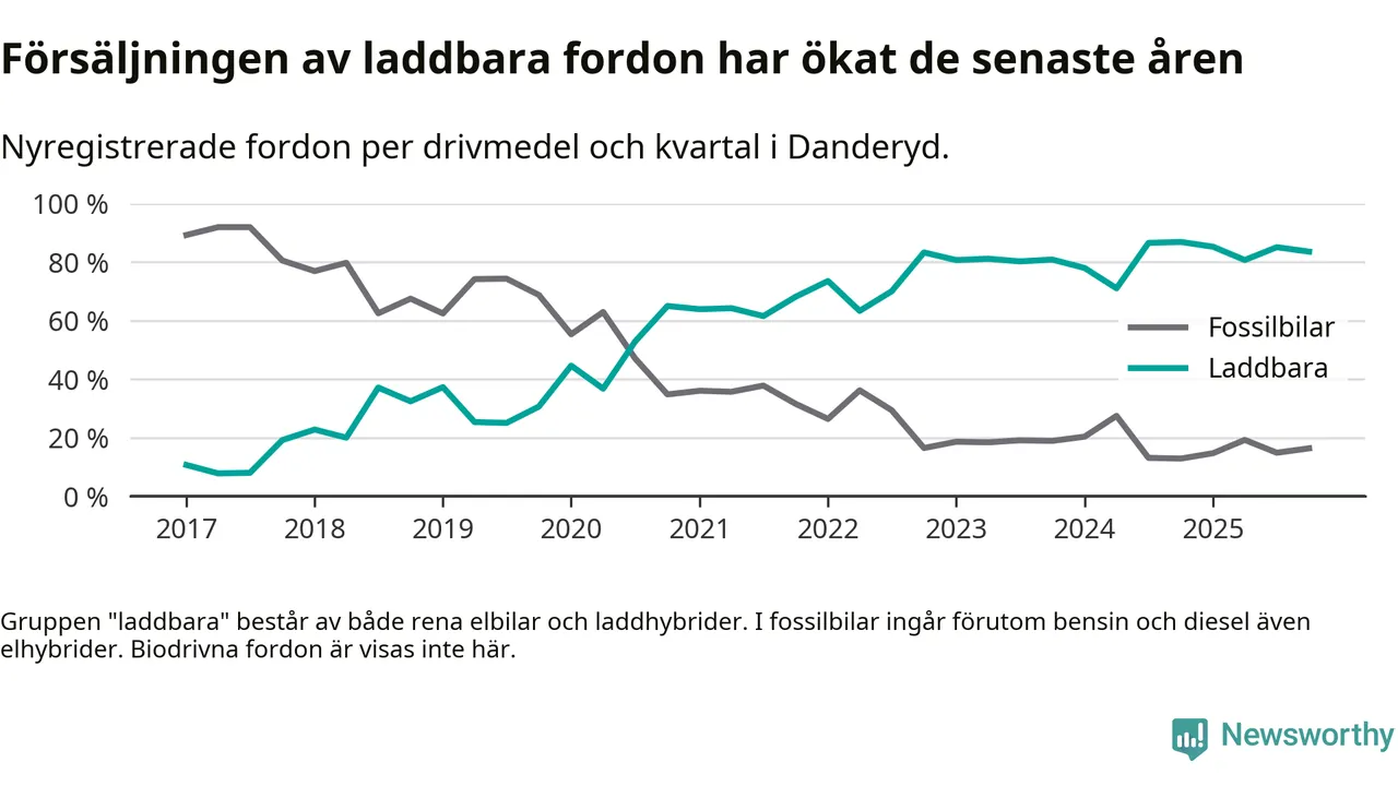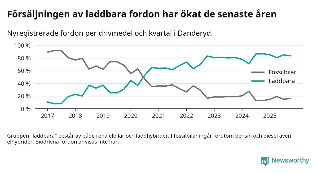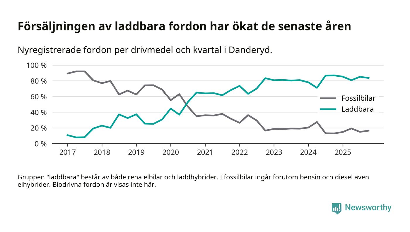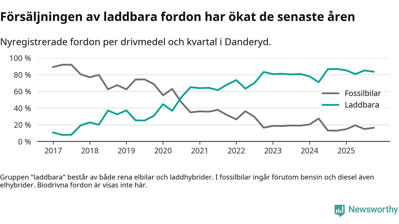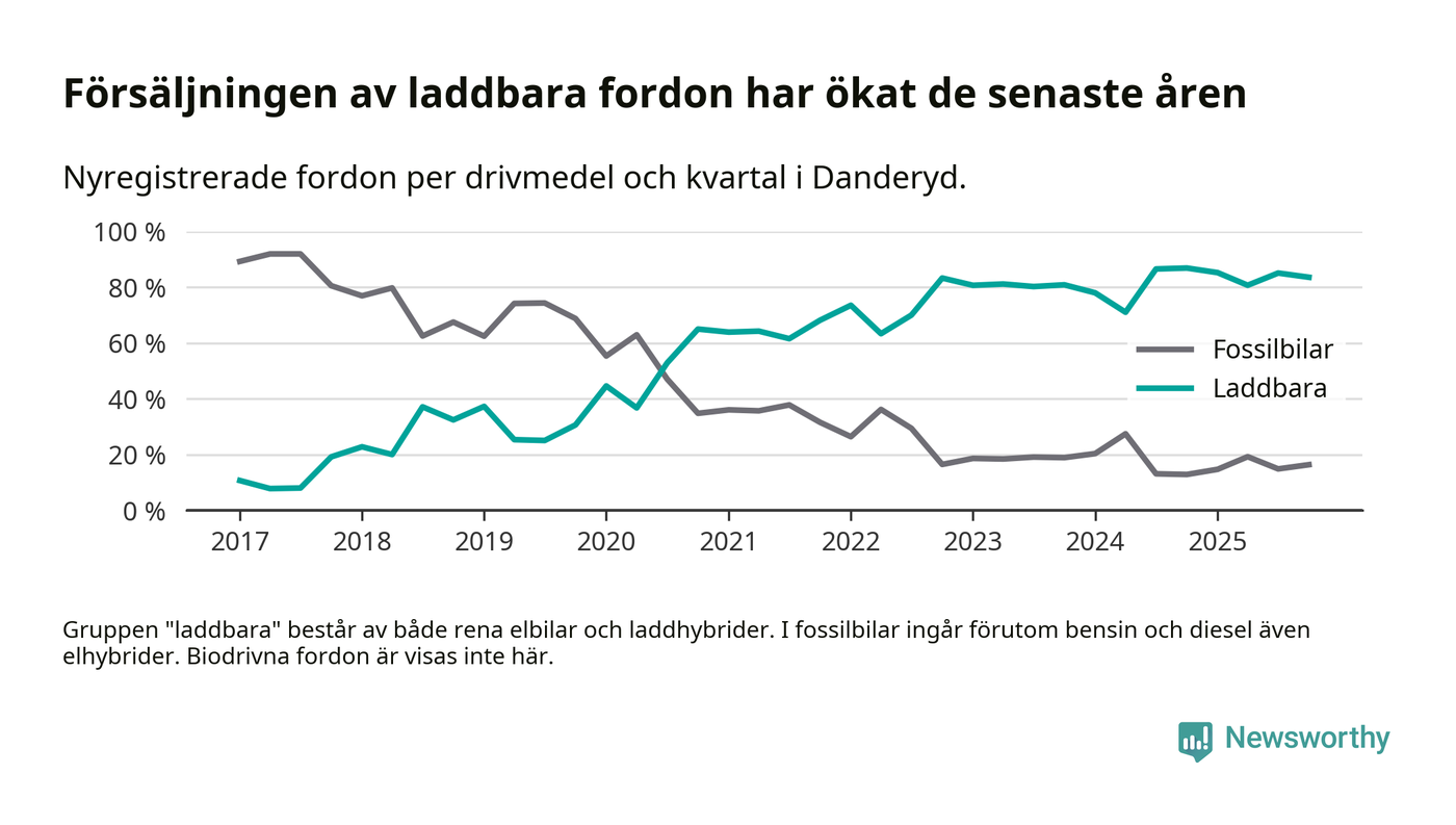 Under fjärde kvartalet 2025 var 84 procent av alla nyregistrerade personbilar i Danderyd laddbara (sammanlagt registrerades 482 nya bilar). Merparten av de laddbara bilarna var rena elbilar (54 procent av alla).
