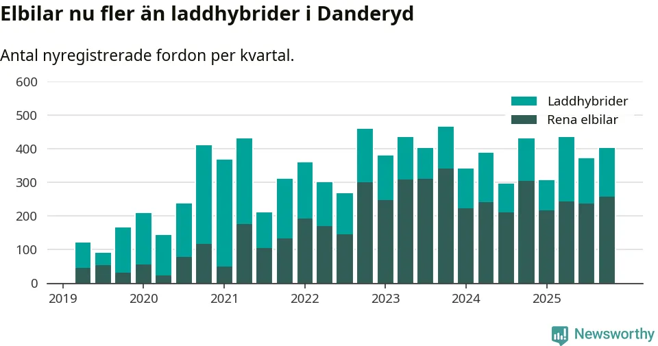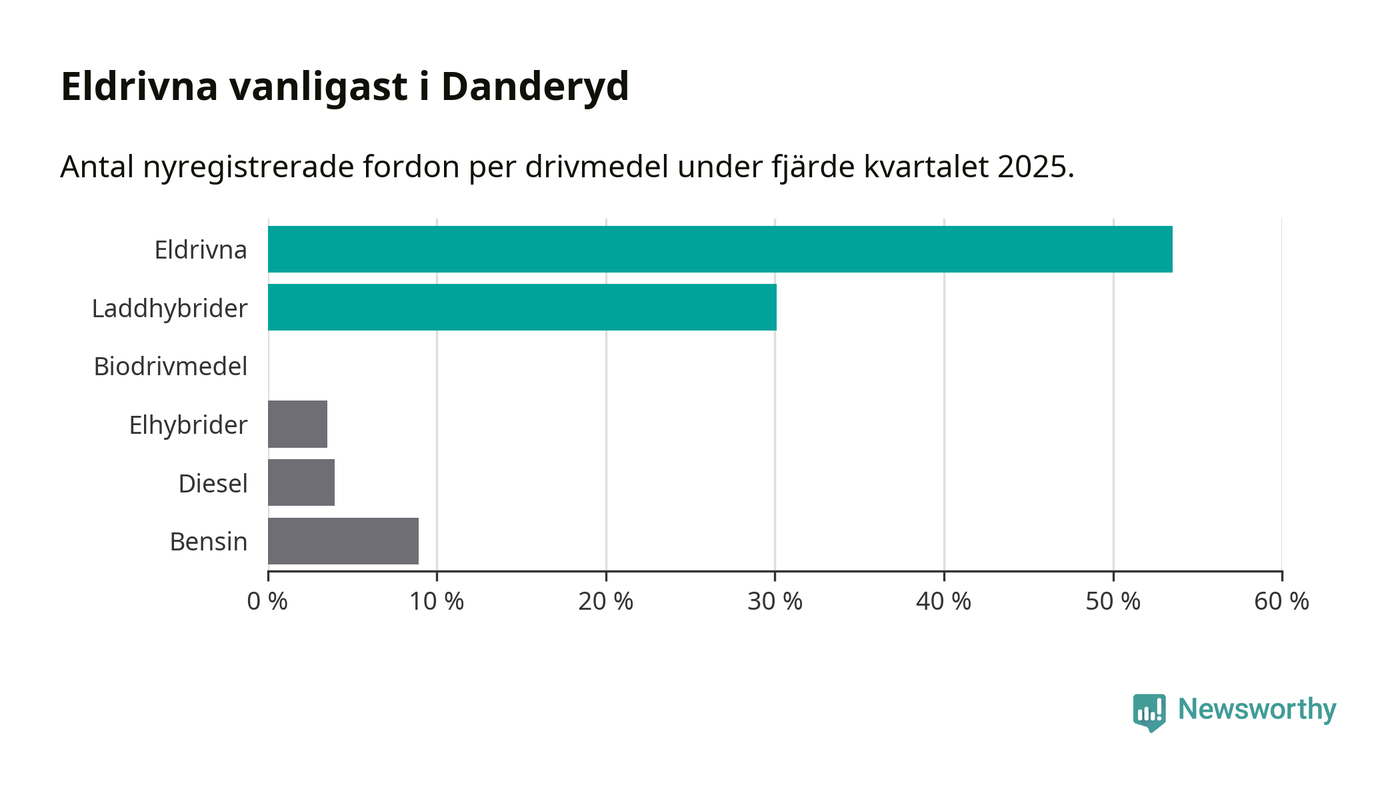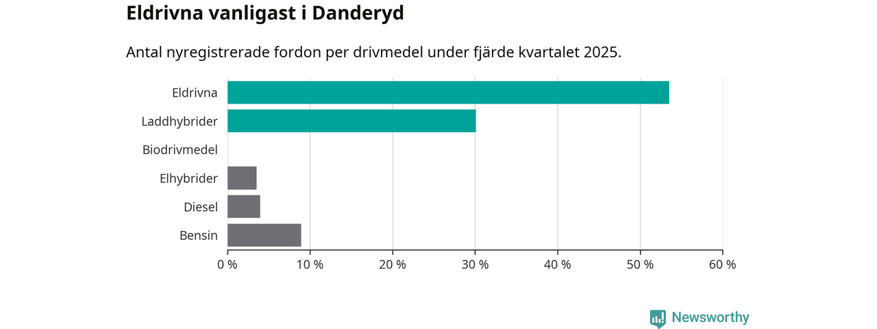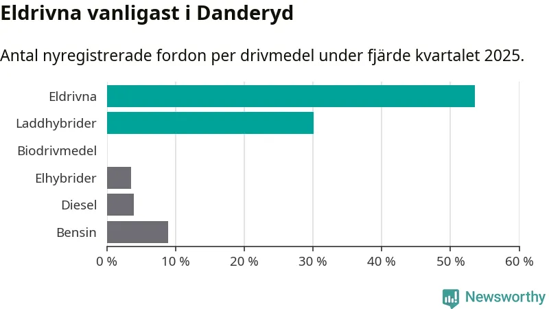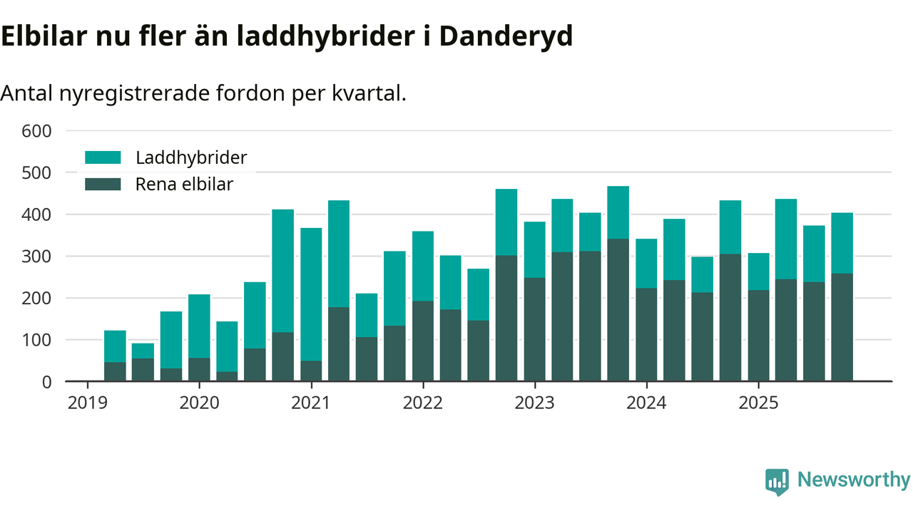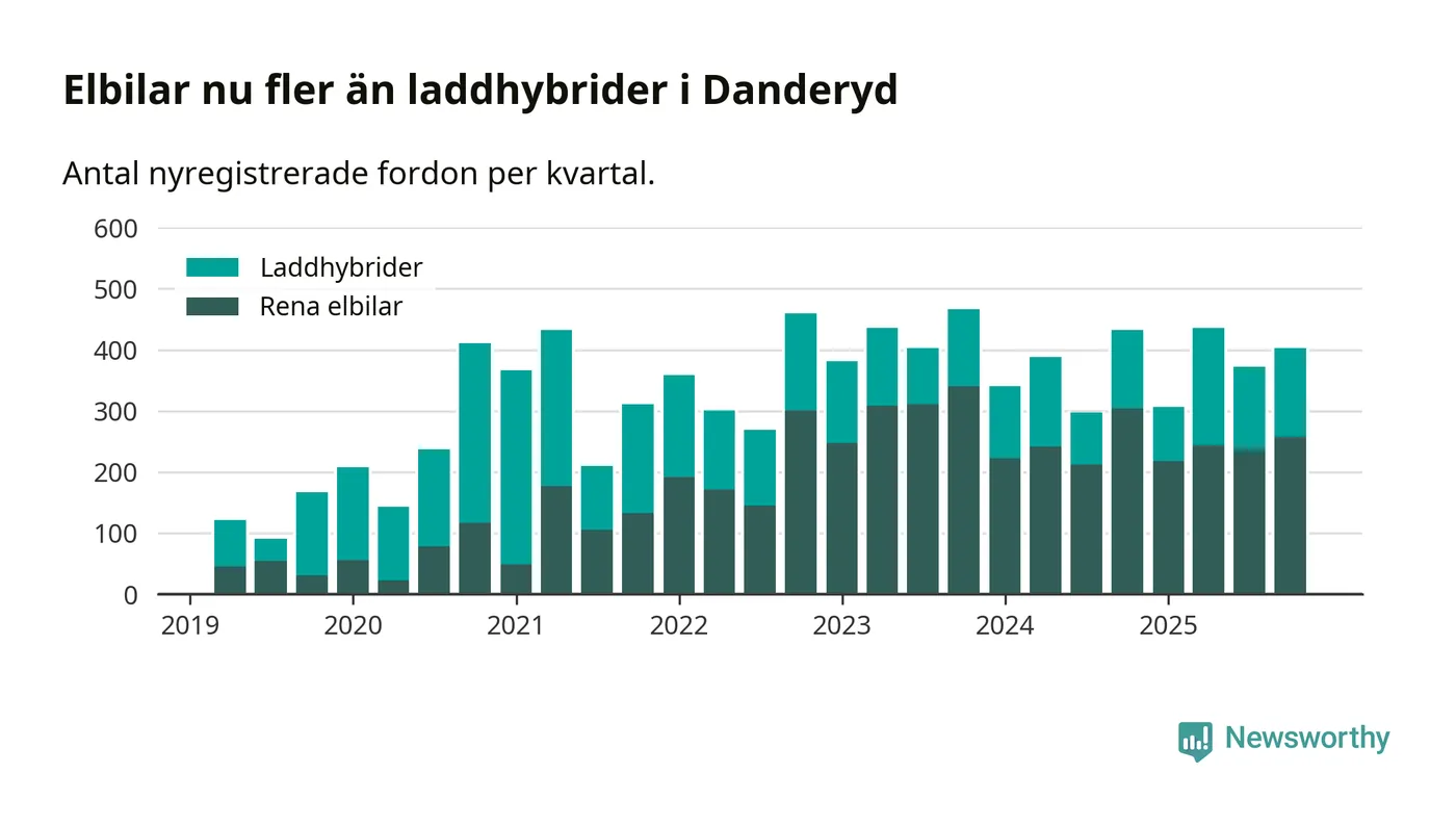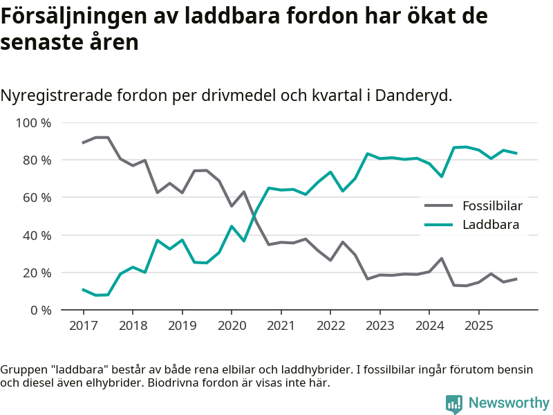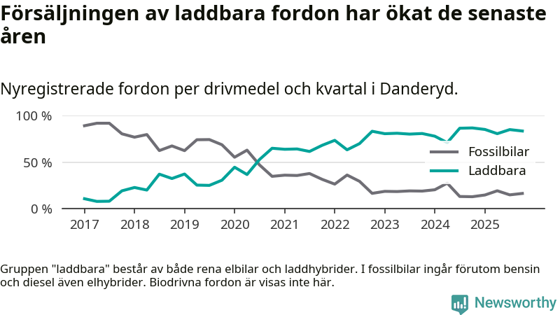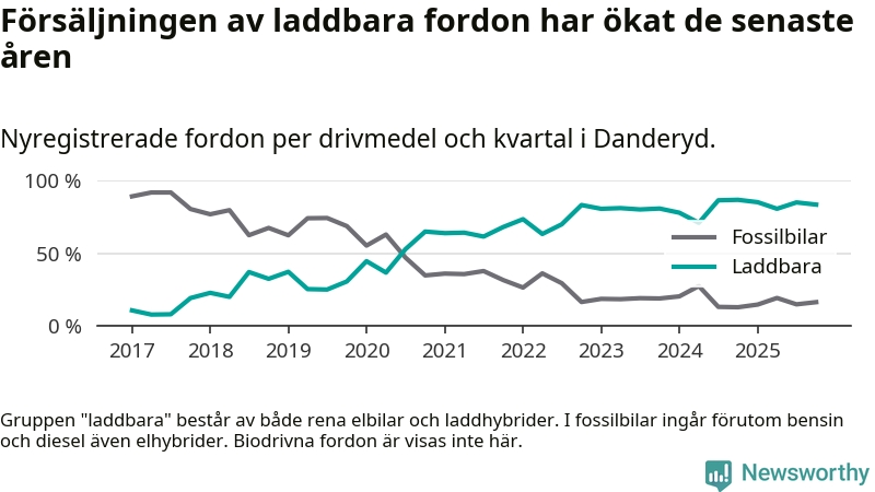 Under fjärde kvartalet 2025 var 84 procent av alla nyregistrerade personbilar i Danderyd laddbara (sammanlagt registrerades 482 nya bilar). Merparten av de laddbara bilarna var rena elbilar (54 procent av alla).