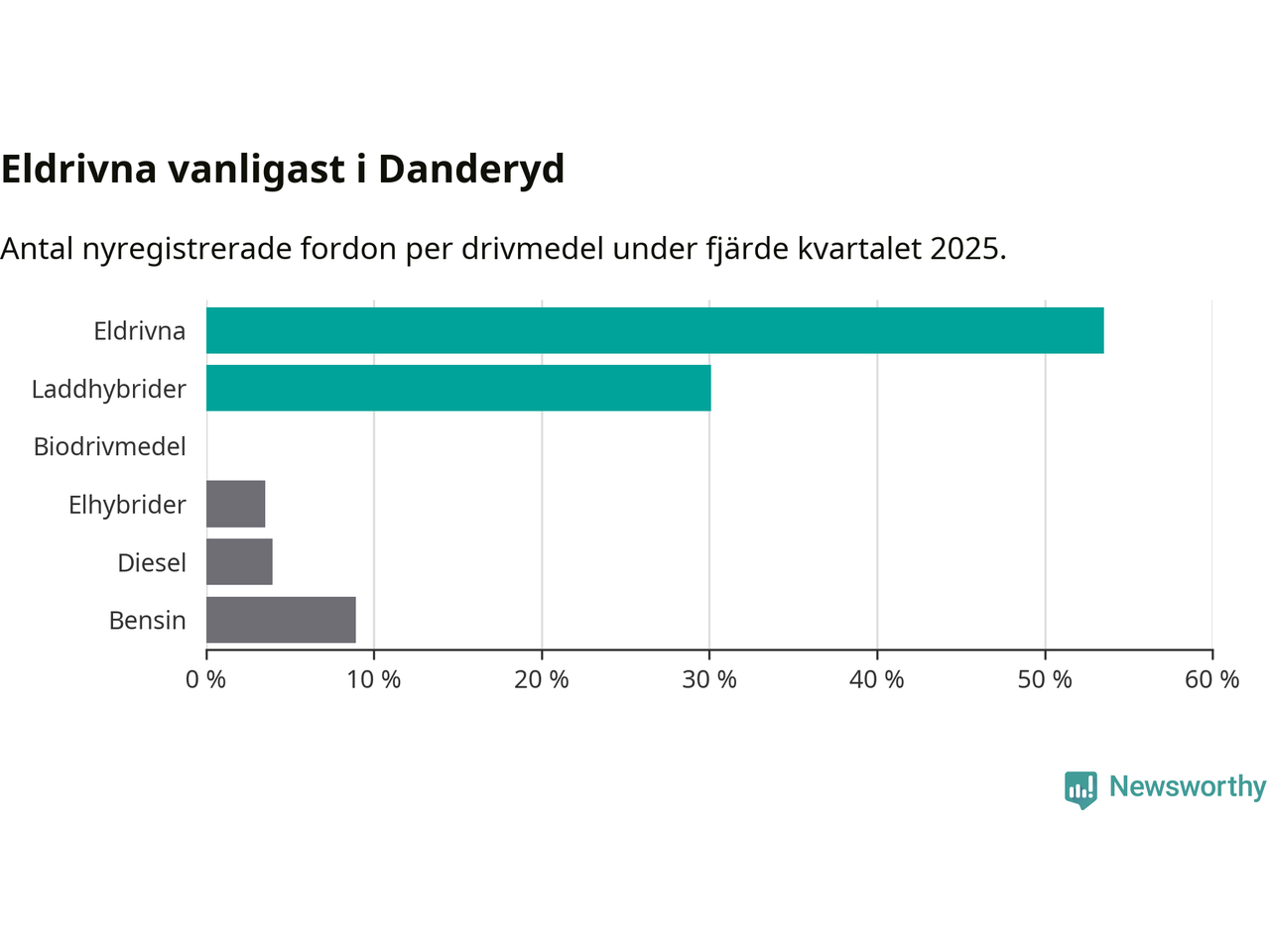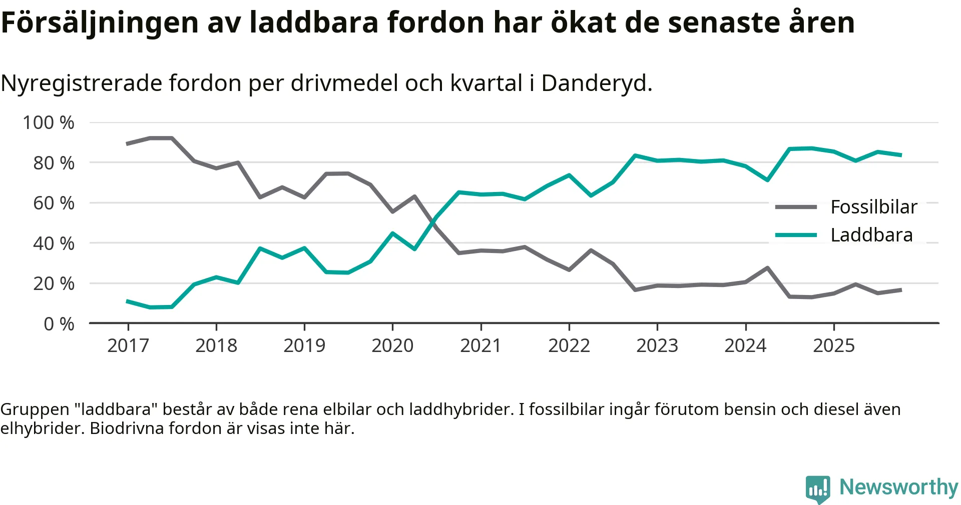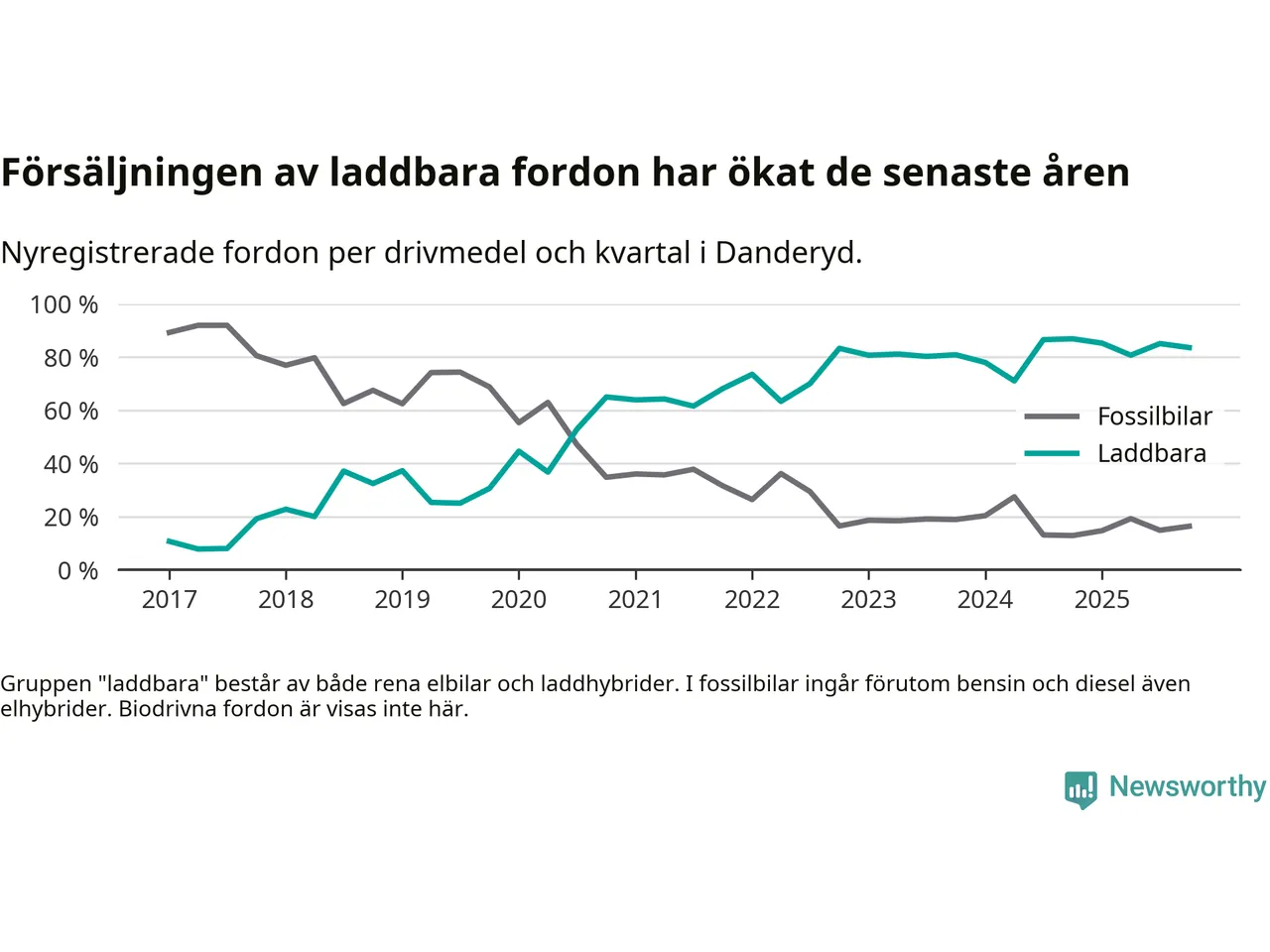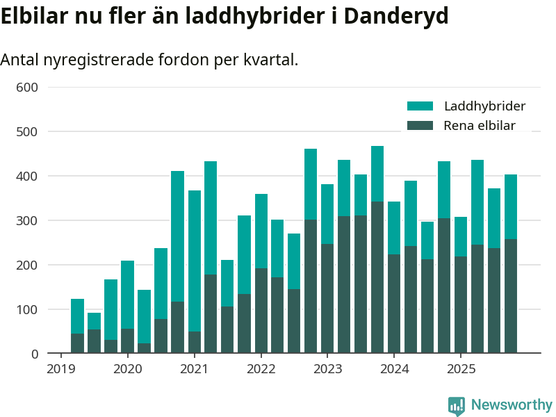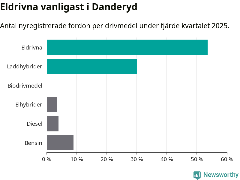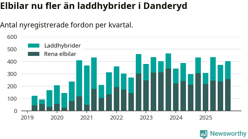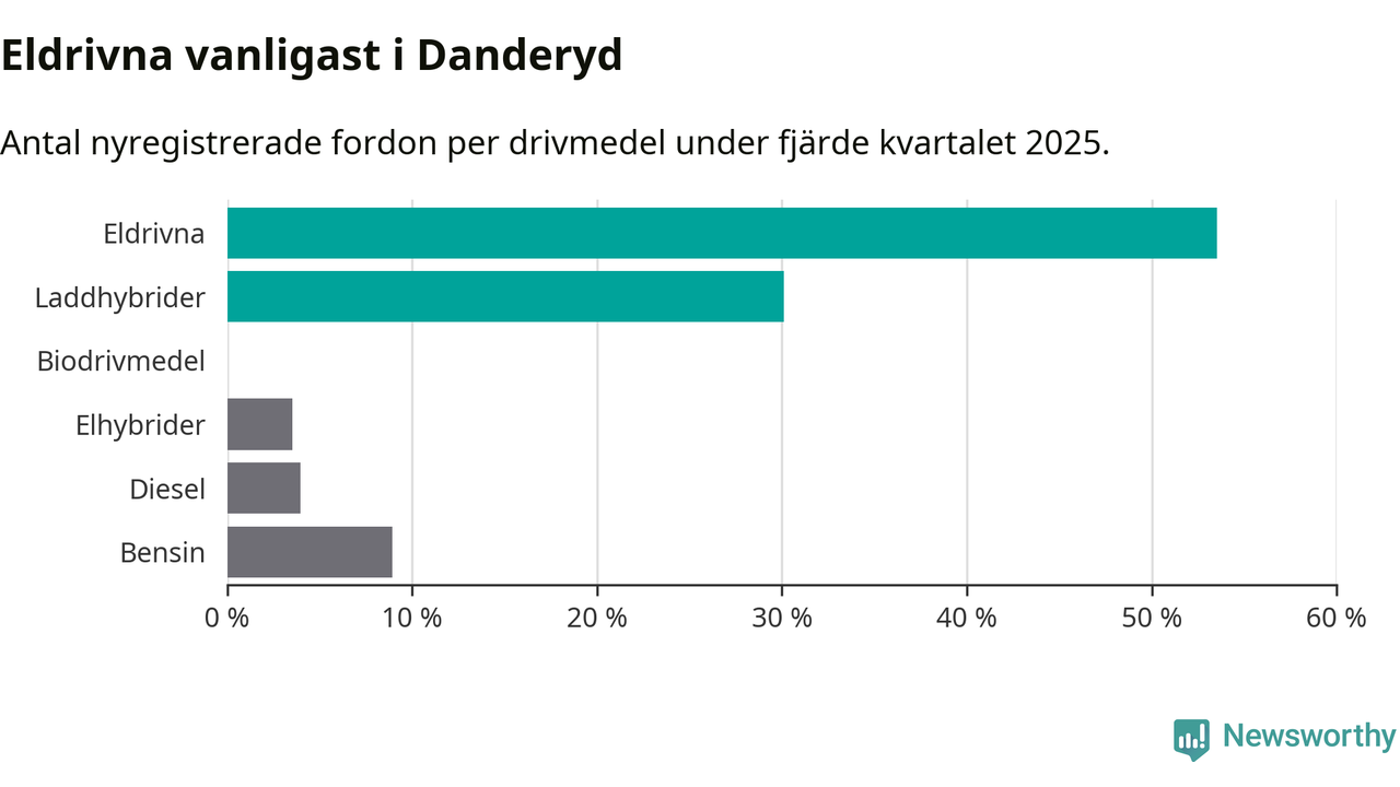 Under fjärde kvartalet 2025 var 84 procent av alla nyregistrerade personbilar i Danderyd laddbara (sammanlagt registrerades 482 nya bilar). Merparten av de laddbara bilarna var rena elbilar (54 procent av alla).