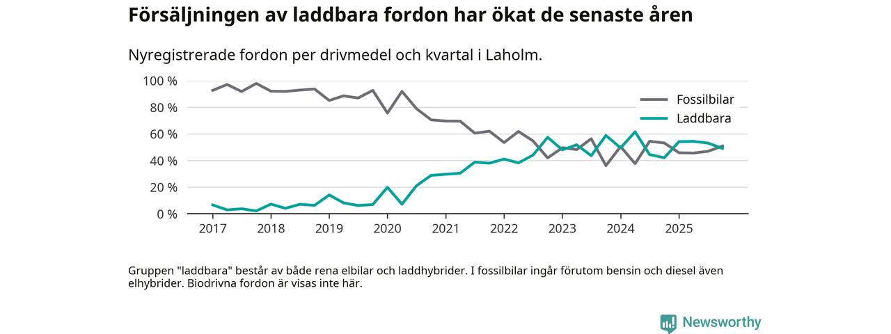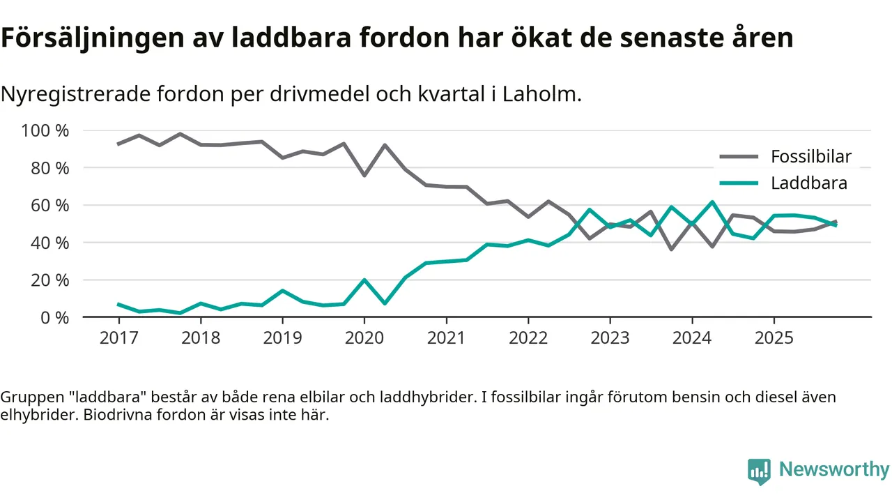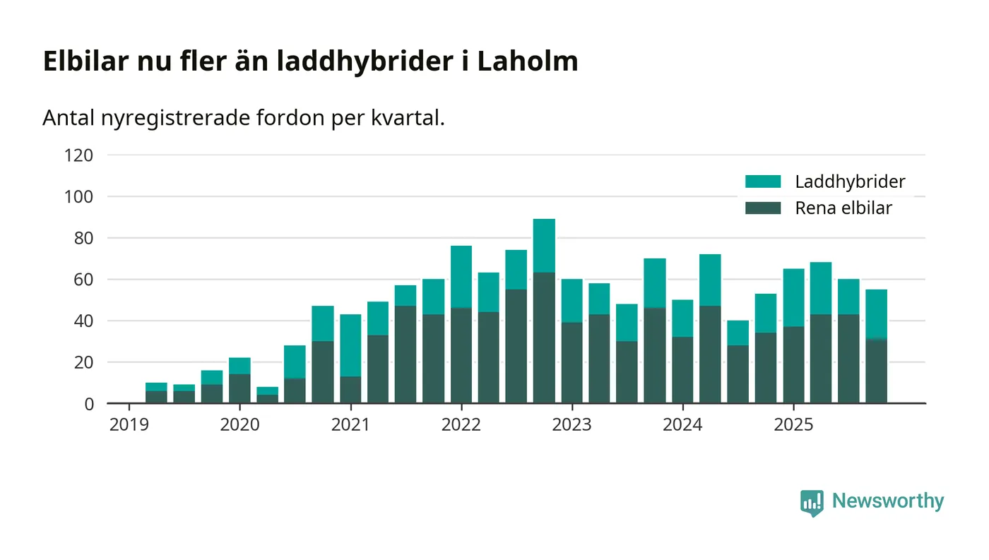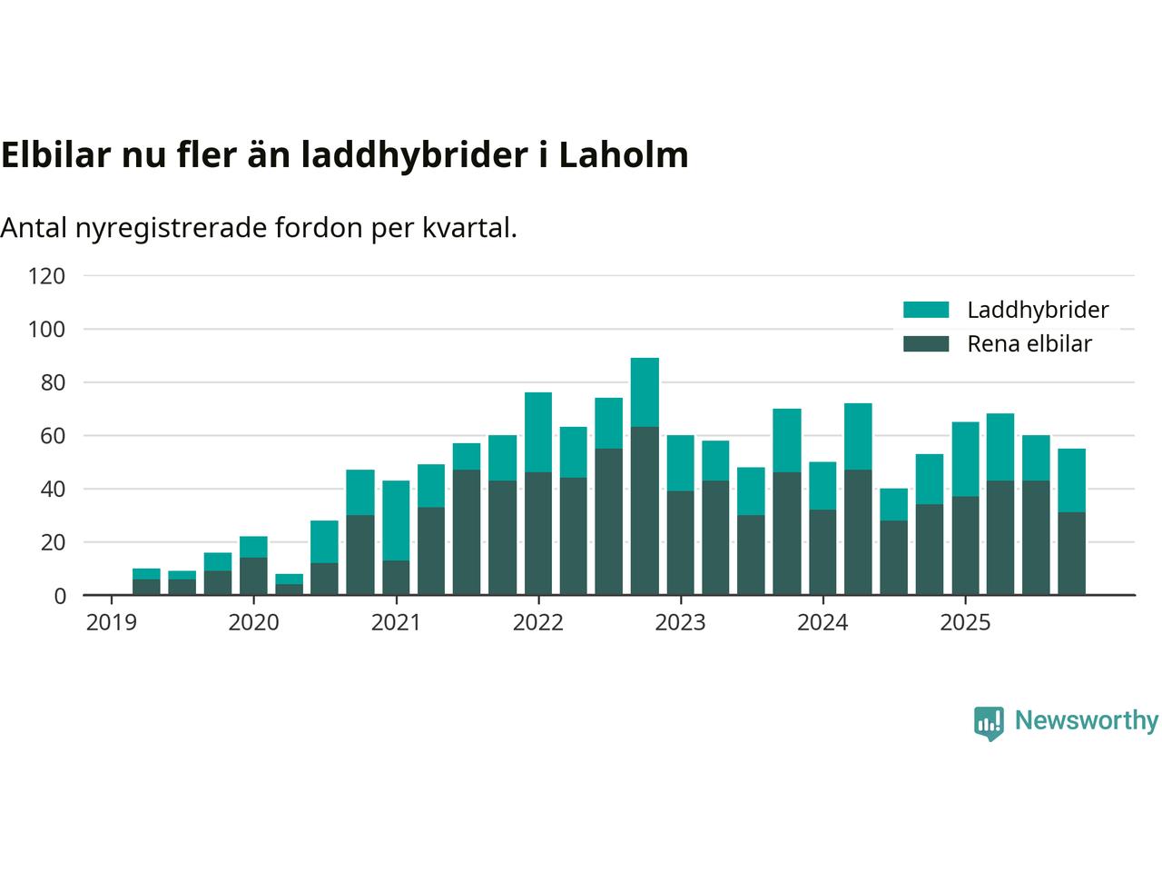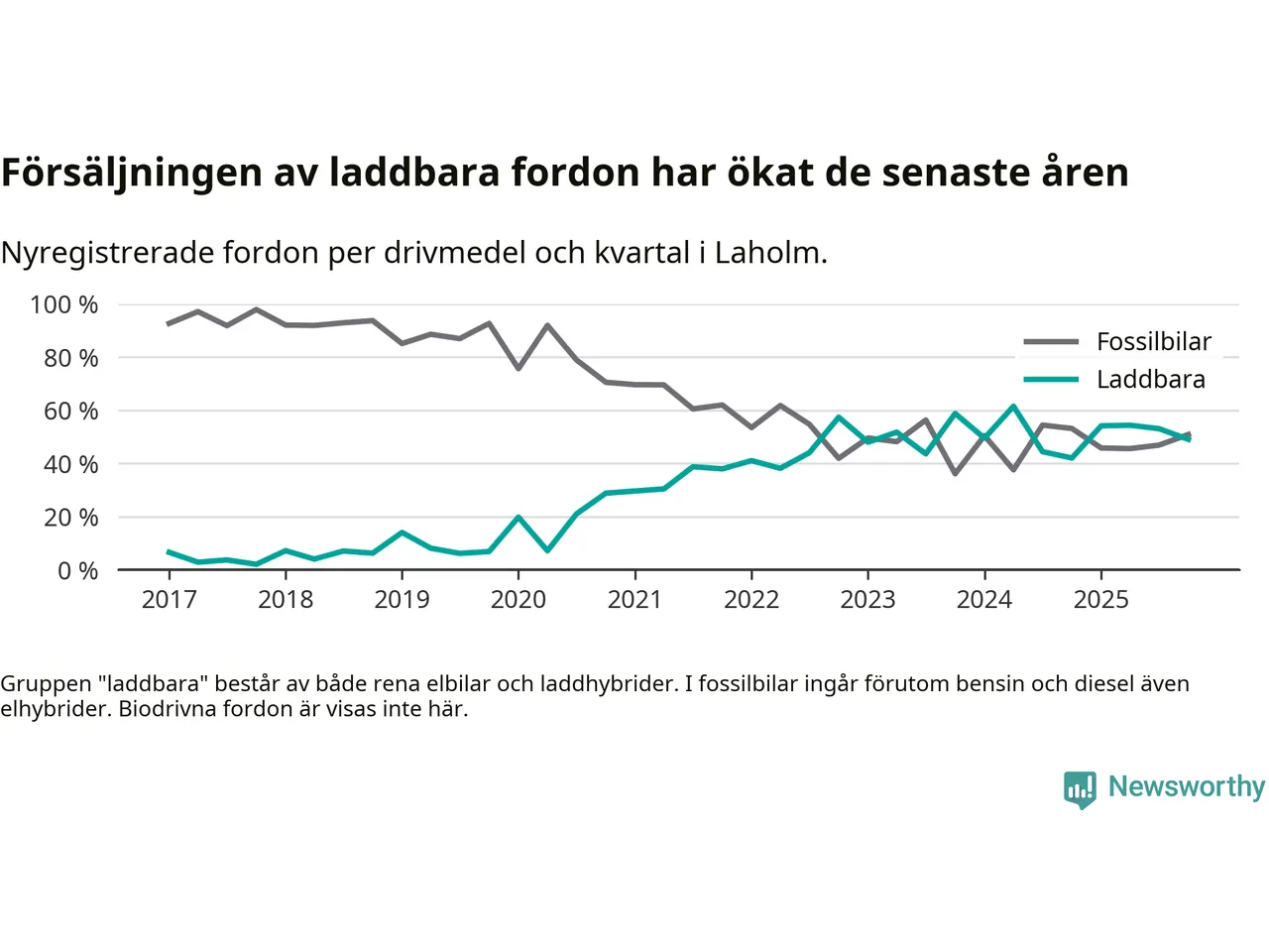 Under fjärde kvartalet 2025 var 49 procent av alla nyregistrerade personbilar i Laholm laddbara (sammanlagt registrerades 112 nya bilar). Merparten av de laddbara bilarna var rena elbilar (28 procent av alla).