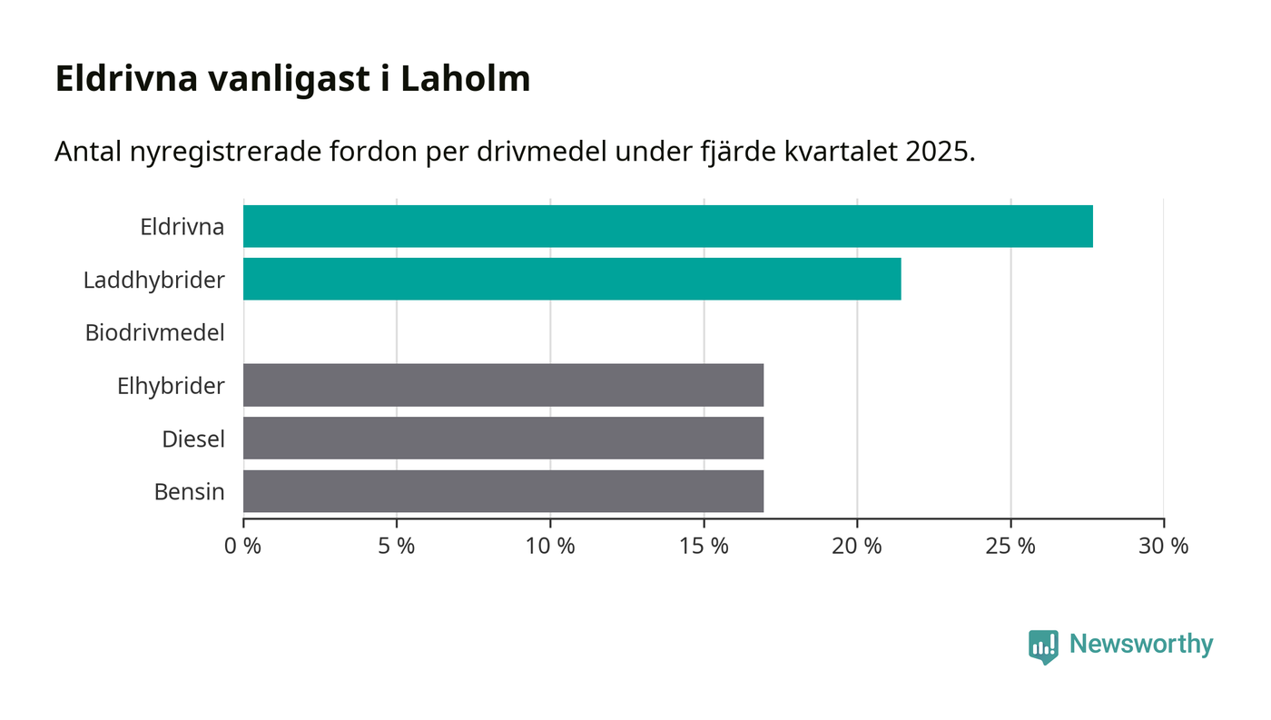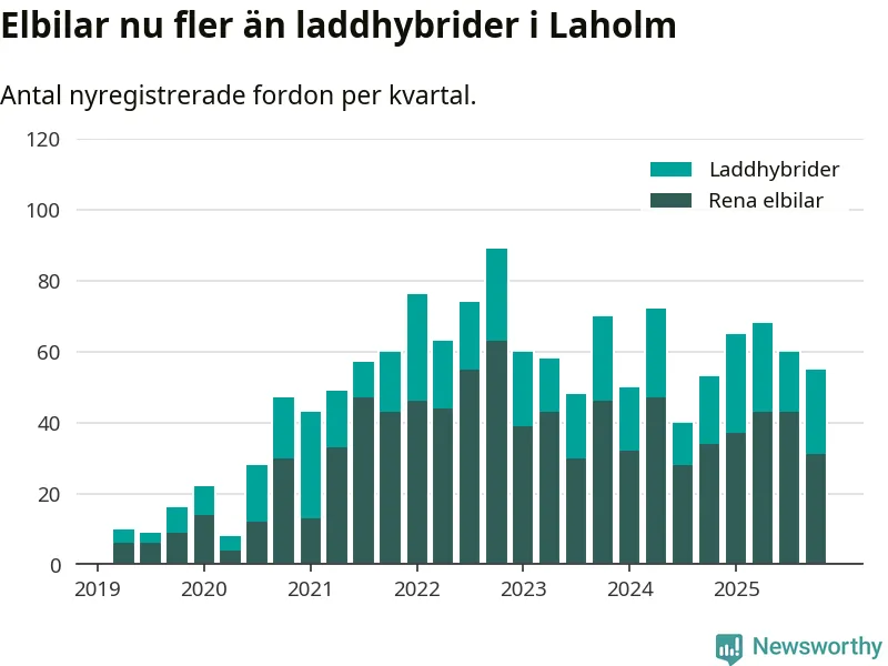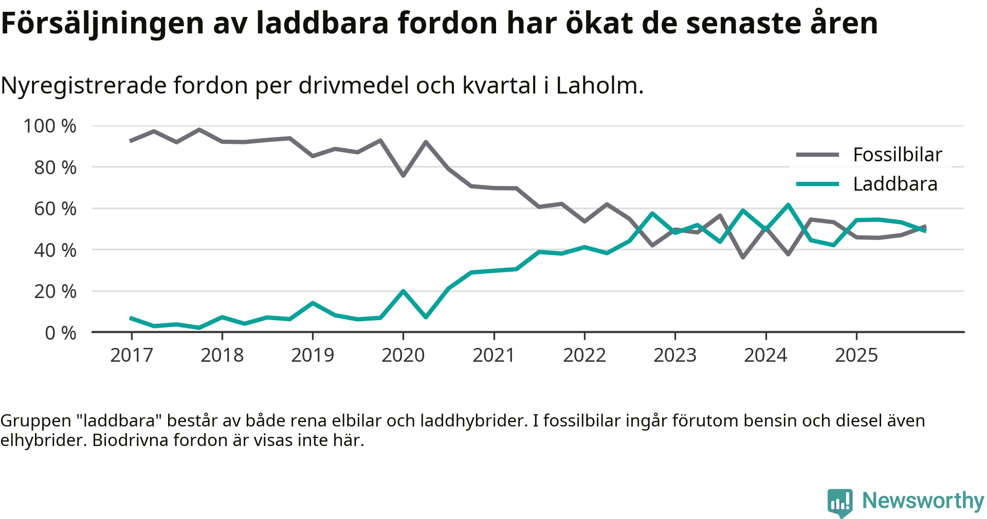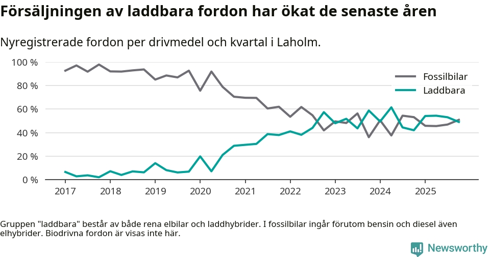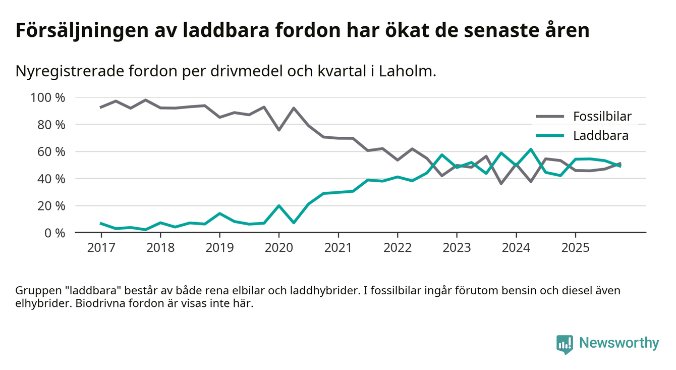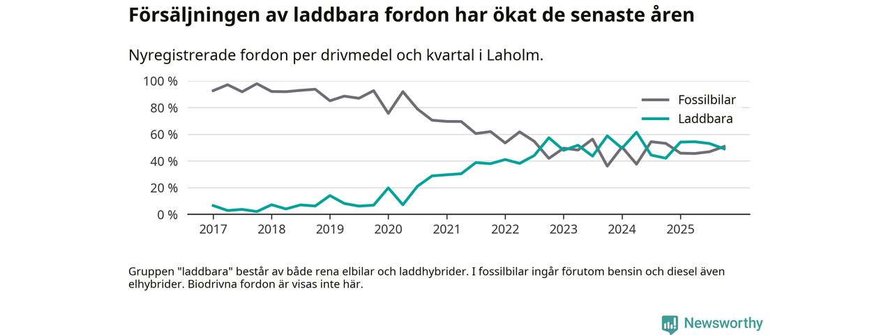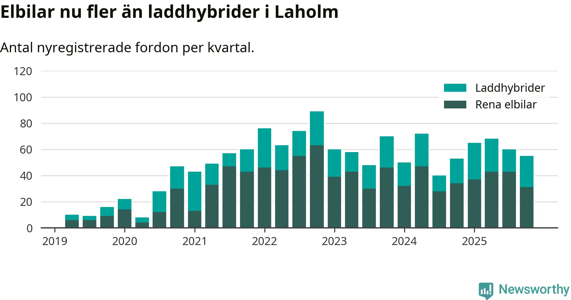 Under fjärde kvartalet 2025 var 49 procent av alla nyregistrerade personbilar i Laholm laddbara (sammanlagt registrerades 112 nya bilar). Merparten av de laddbara bilarna var rena elbilar (28 procent av alla).