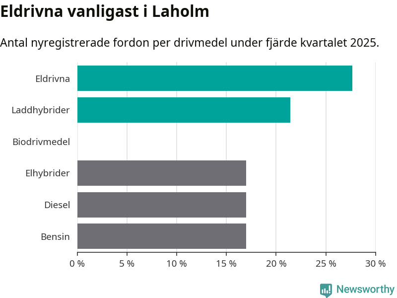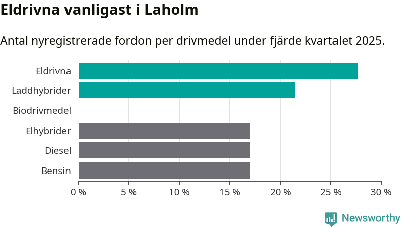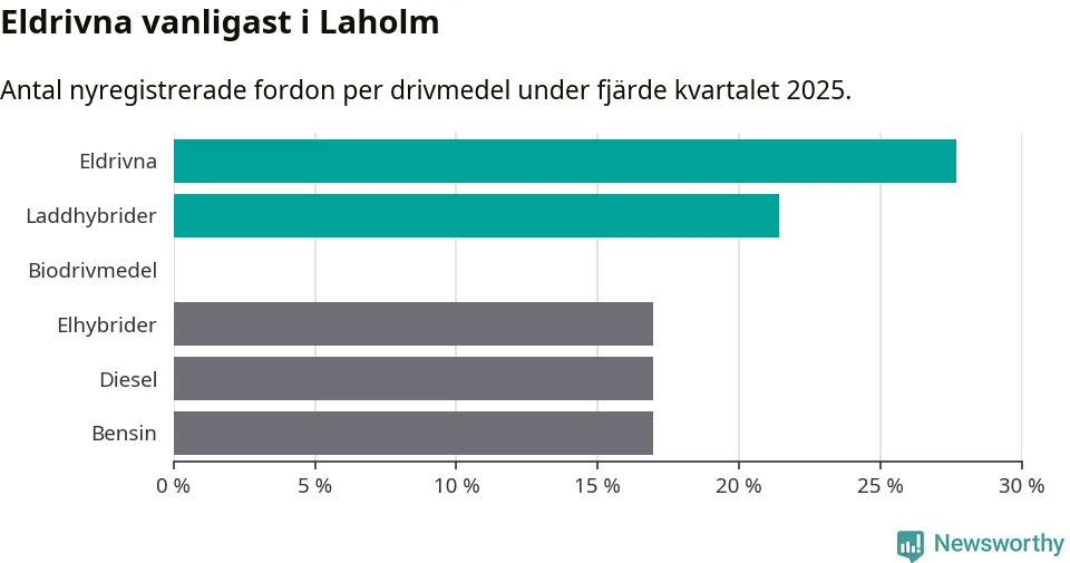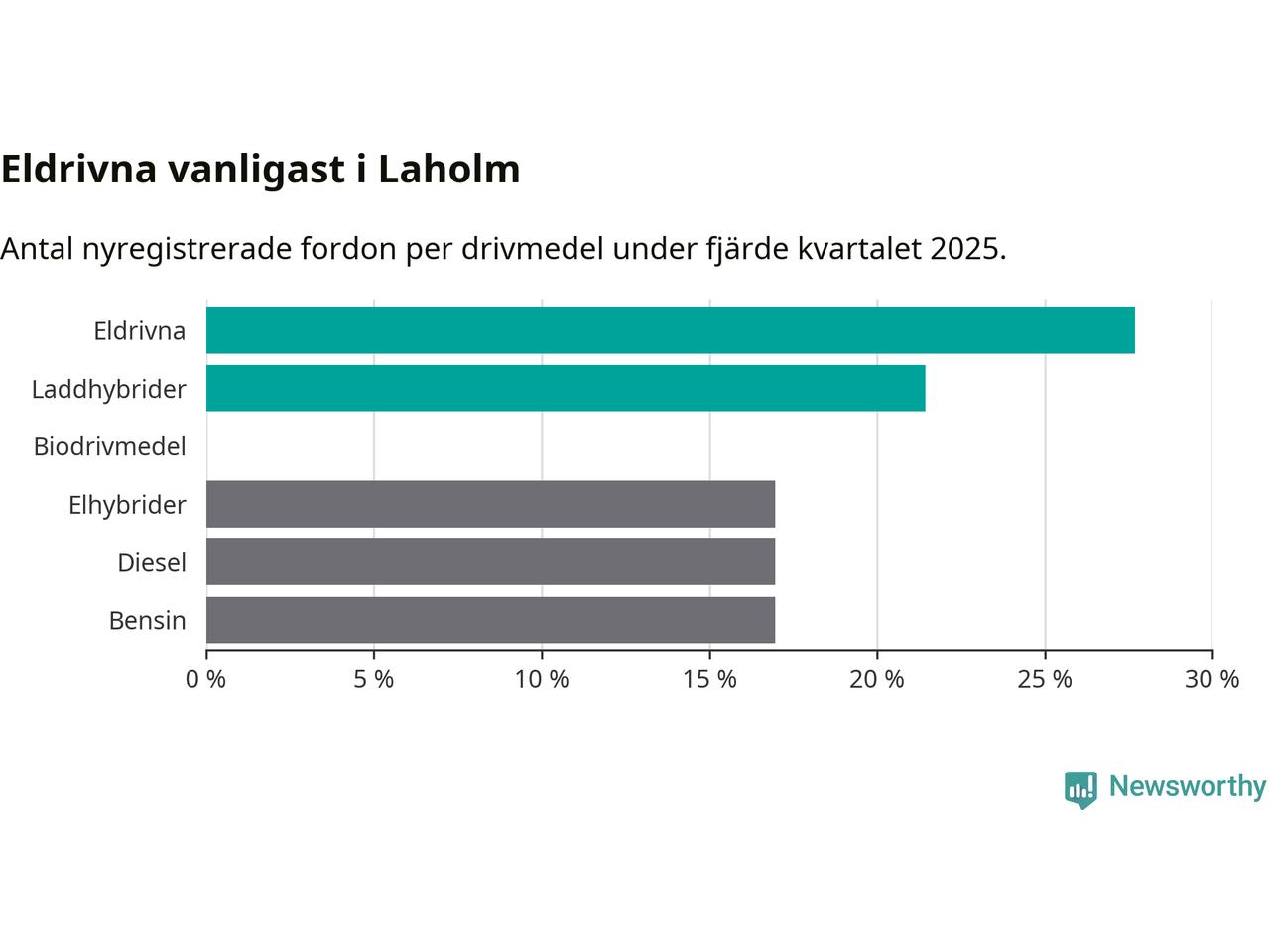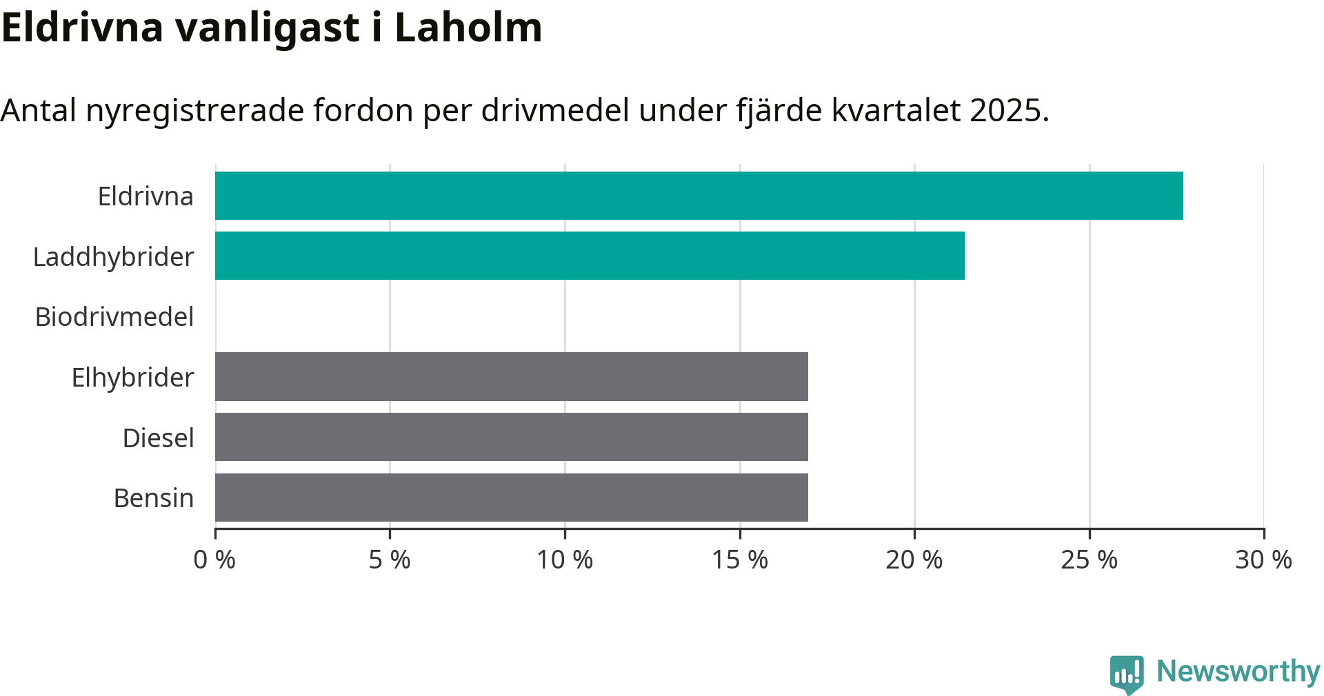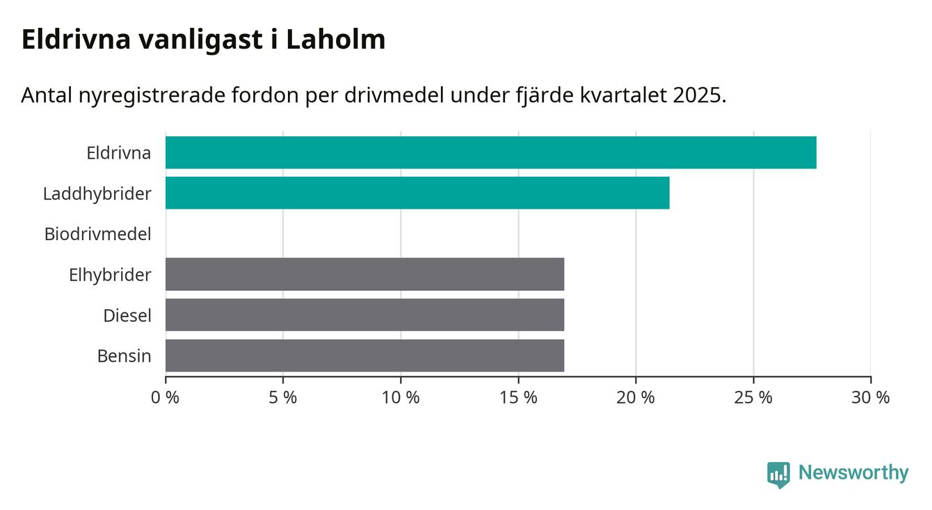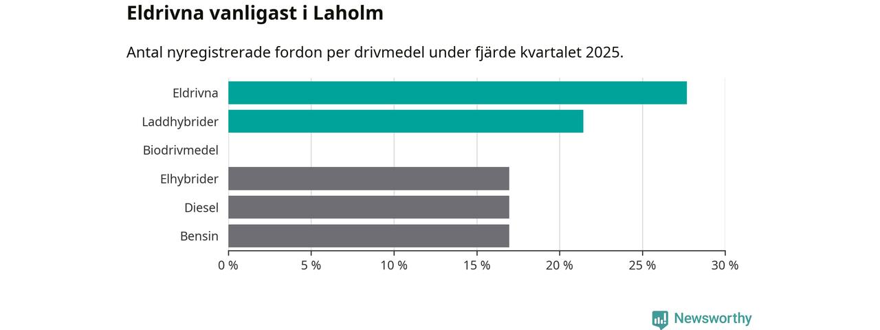 Under fjärde kvartalet 2025 var 49 procent av alla nyregistrerade personbilar i Laholm laddbara (sammanlagt registrerades 112 nya bilar). Merparten av de laddbara bilarna var rena elbilar (28 procent av alla).