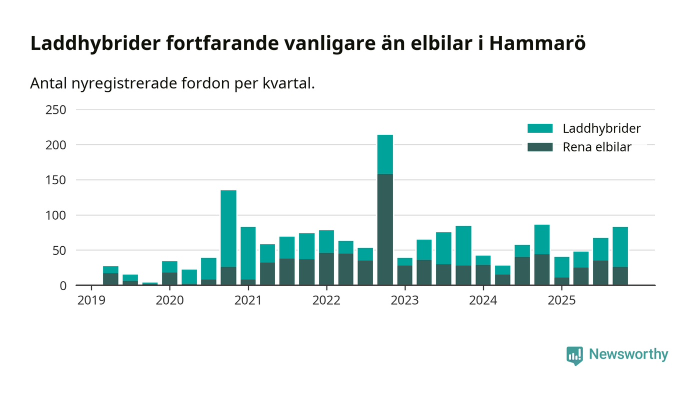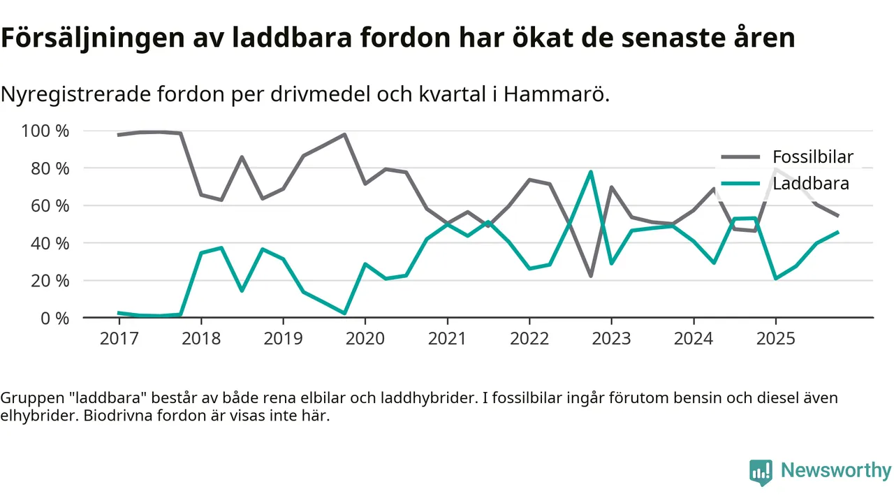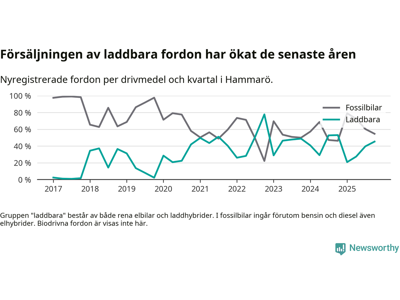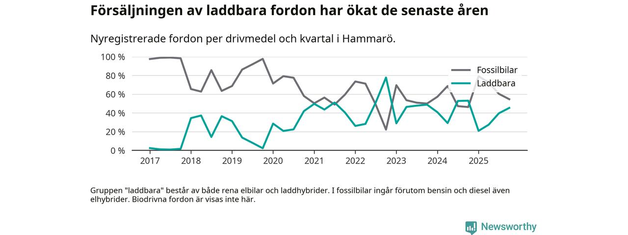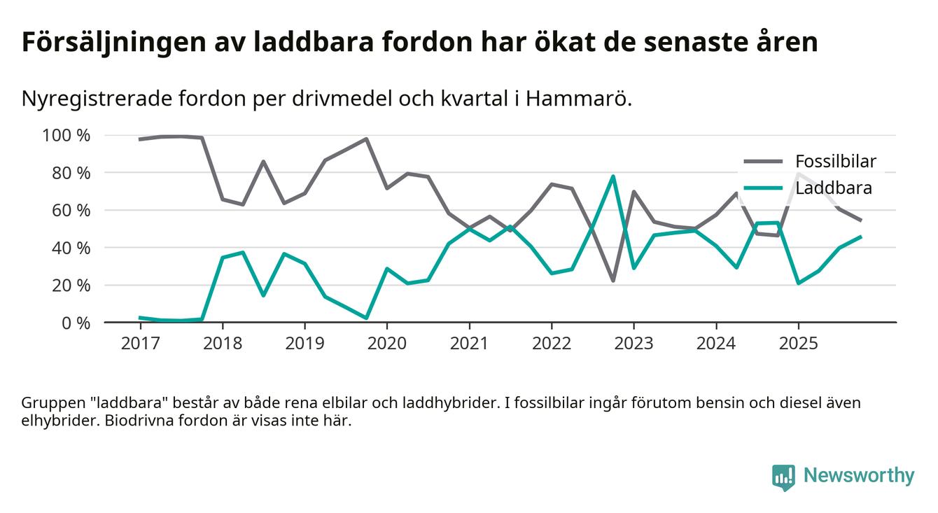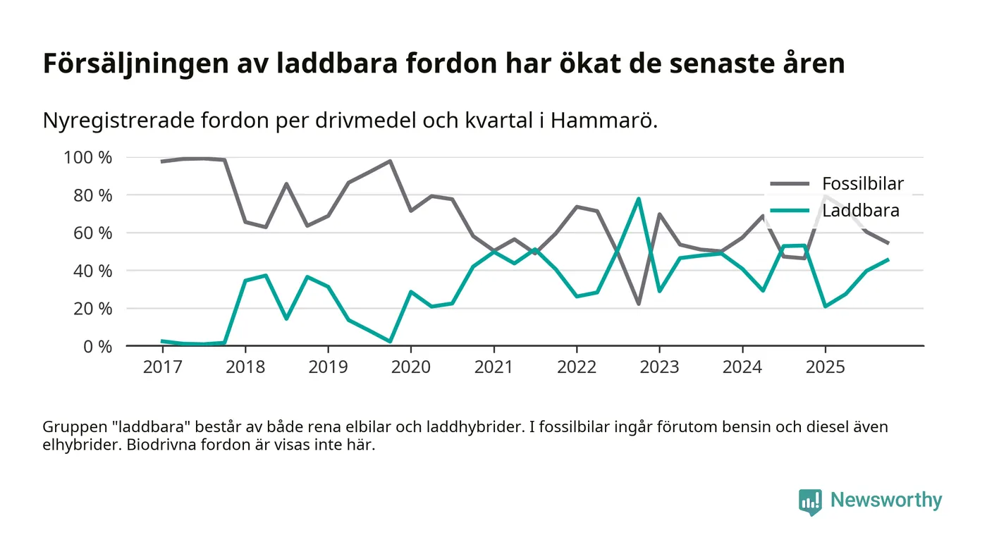Under fjärde kvartalet 2025 var 45 procent av alla nyregistrerade personbilar på Hammarö laddbara (sammanlagt registrerades 183 nya bilar). Merparten av de laddbara bilarna var så kallade laddhybrider, det vill säga fordon som går att ladda och köra på el, men som även har en förbränningsmotor. 14 procent av alla nya bilar var rena elbilar.