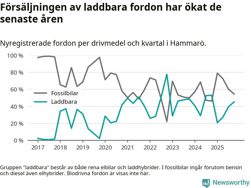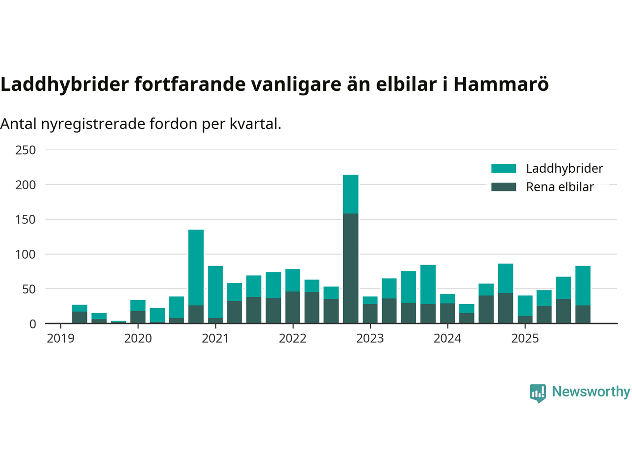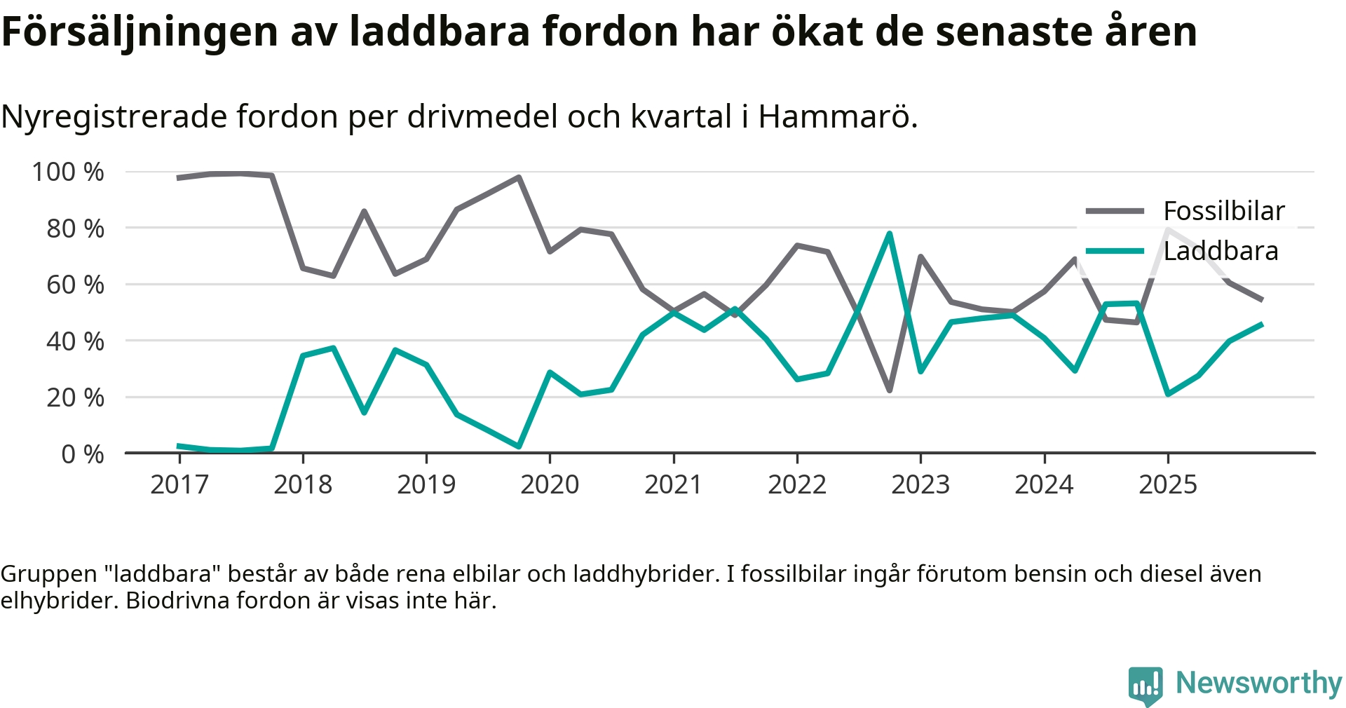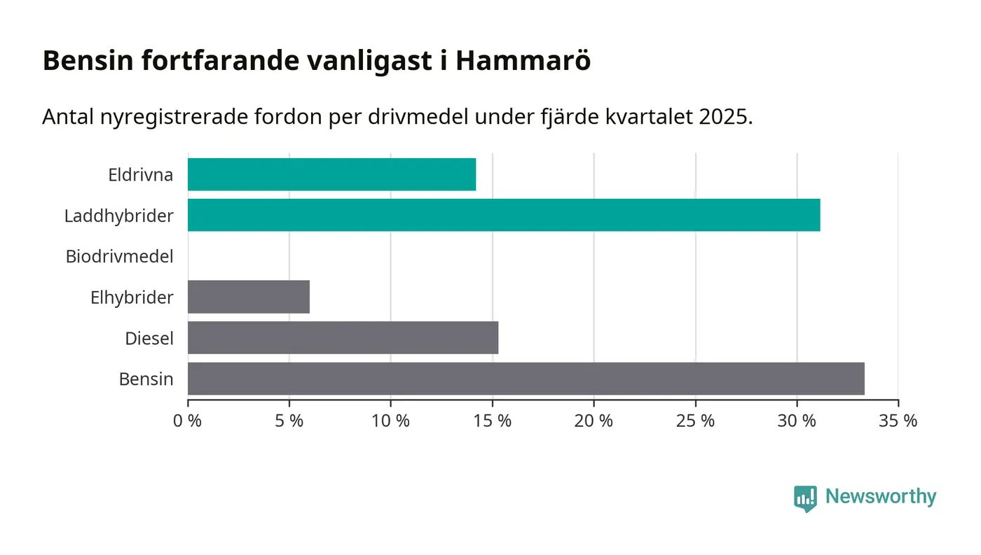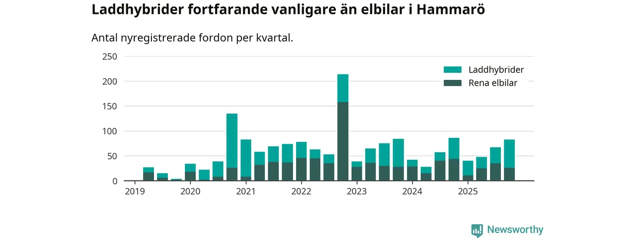 Under fjärde kvartalet 2025 var 45 procent av alla nyregistrerade personbilar på Hammarö laddbara (sammanlagt registrerades 183 nya bilar). Merparten av de laddbara bilarna var så kallade laddhybrider, det vill säga fordon som går att ladda och köra på el, men som även har en förbränningsmotor. 14 procent av alla nya bilar var rena elbilar.