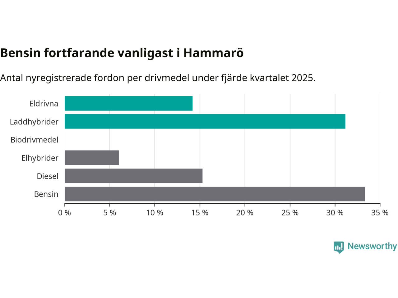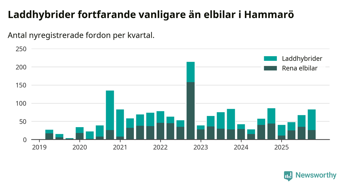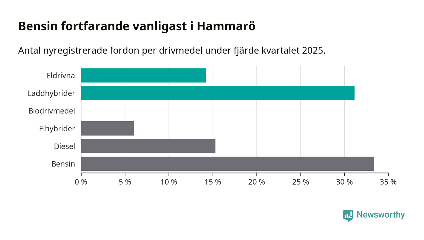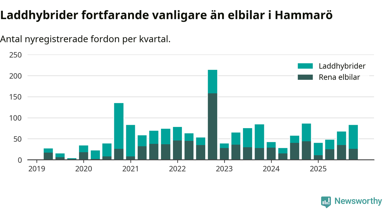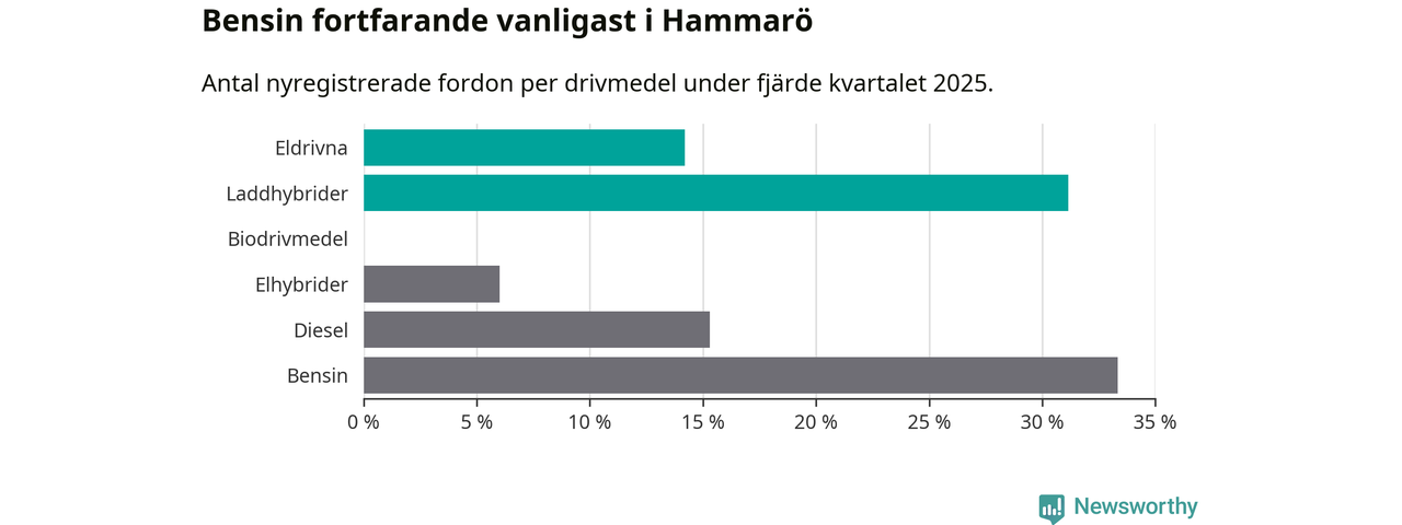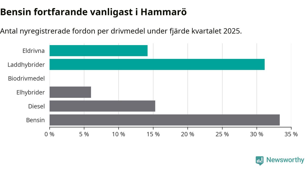 Under fjärde kvartalet 2025 var 45 procent av alla nyregistrerade personbilar på Hammarö laddbara (sammanlagt registrerades 183 nya bilar). Merparten av de laddbara bilarna var så kallade laddhybrider, det vill säga fordon som går att ladda och köra på el, men som även har en förbränningsmotor. 14 procent av alla nya bilar var rena elbilar.