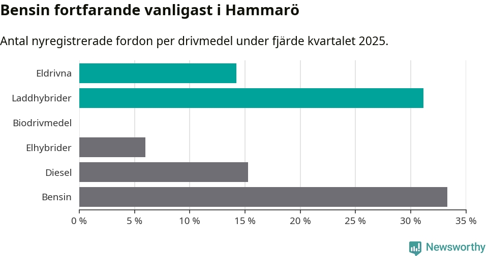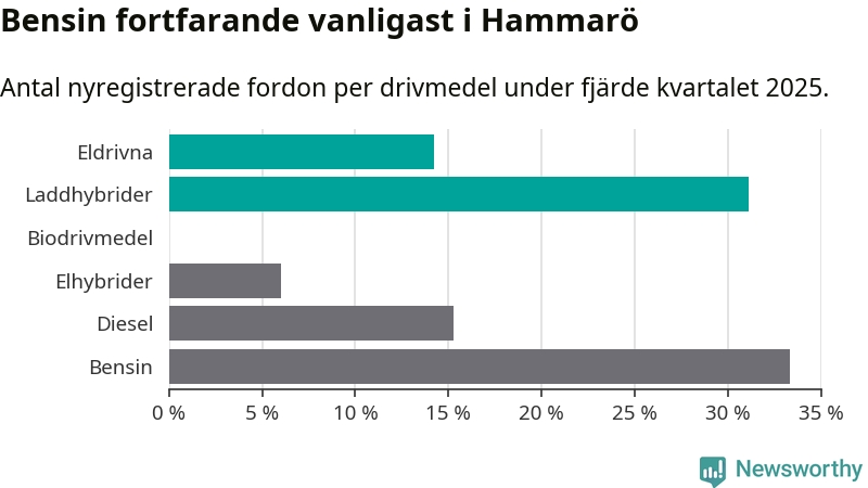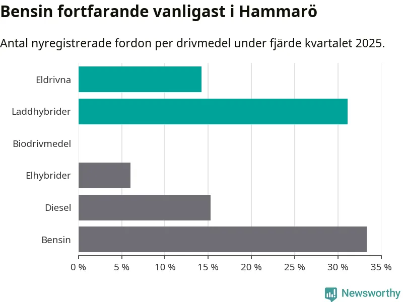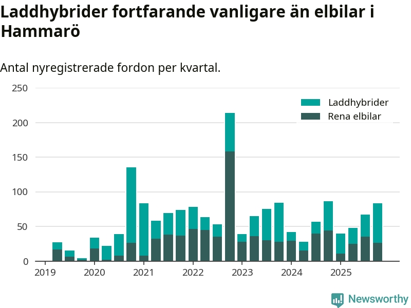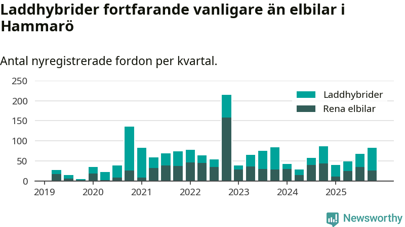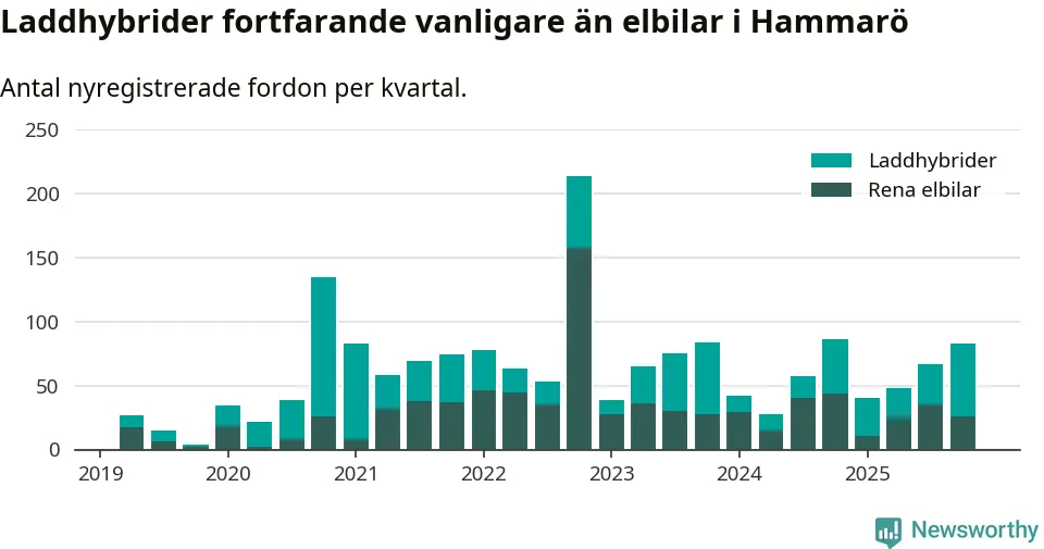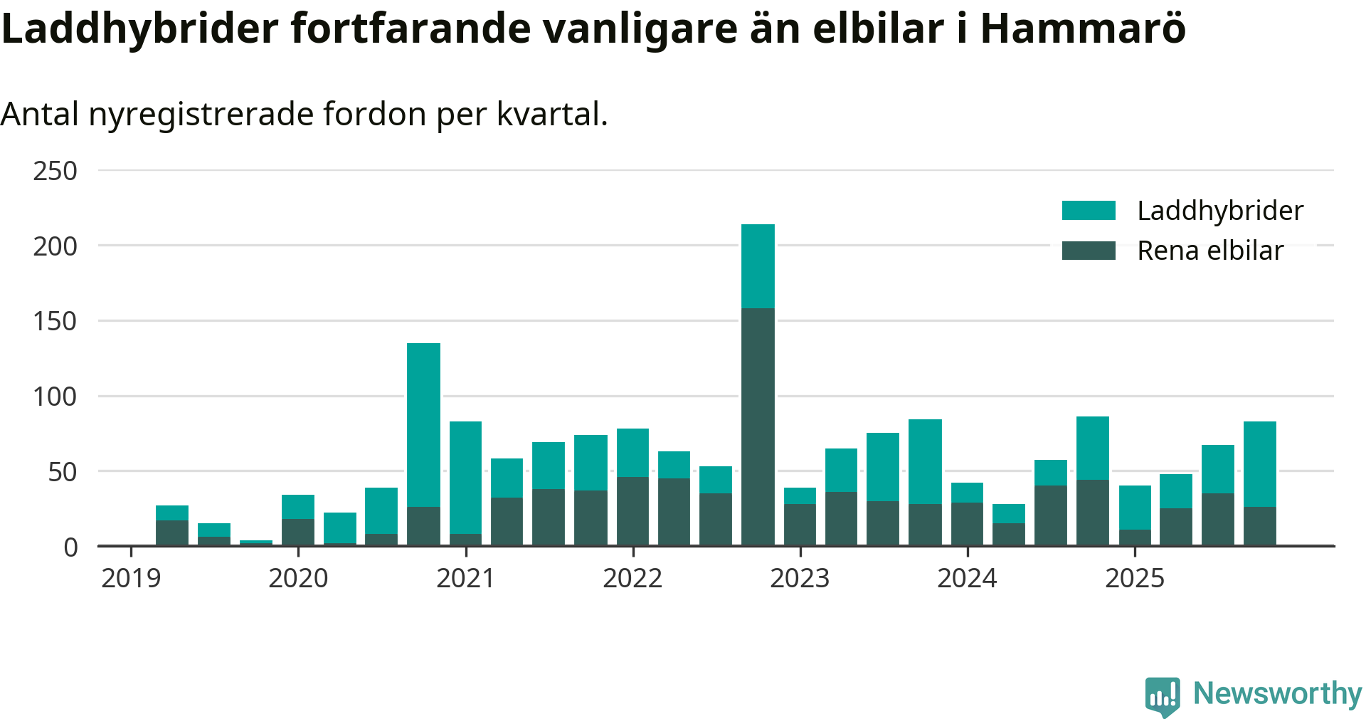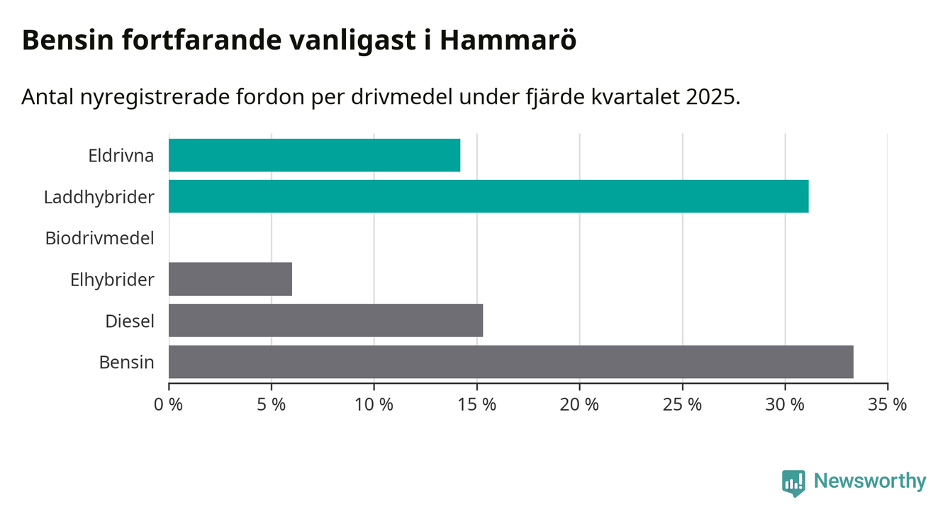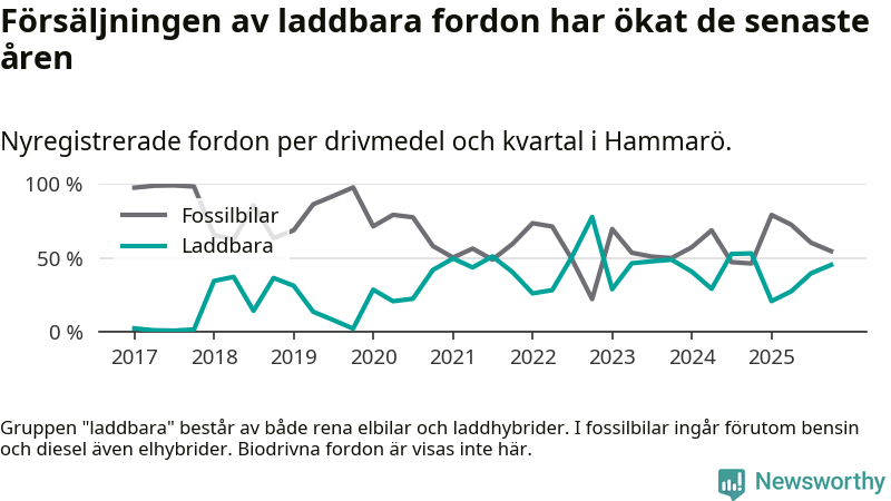 Under fjärde kvartalet 2025 var 45 procent av alla nyregistrerade personbilar på Hammarö laddbara (sammanlagt registrerades 183 nya bilar). Merparten av de laddbara bilarna var så kallade laddhybrider, det vill säga fordon som går att ladda och köra på el, men som även har en förbränningsmotor. 14 procent av alla nya bilar var rena elbilar.
