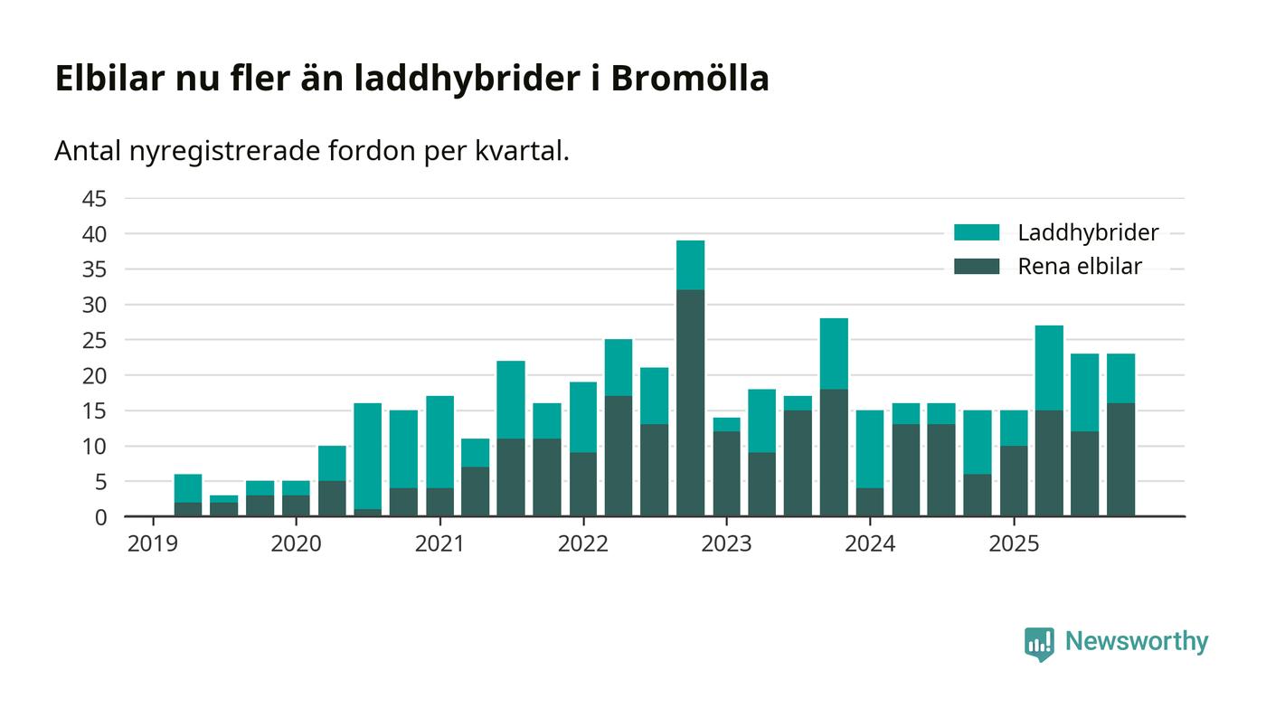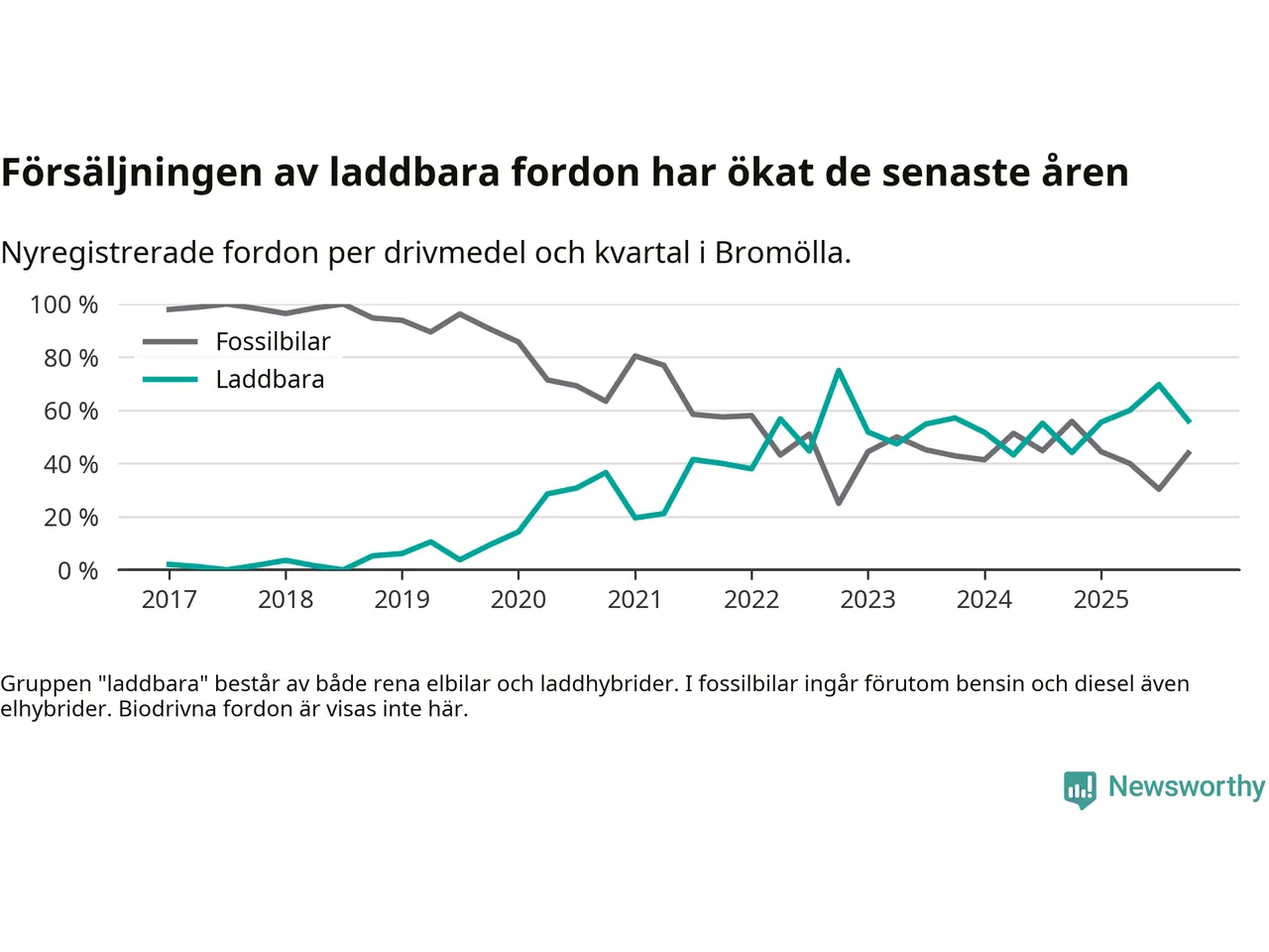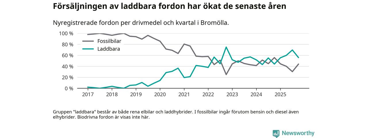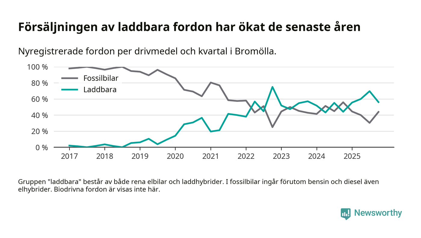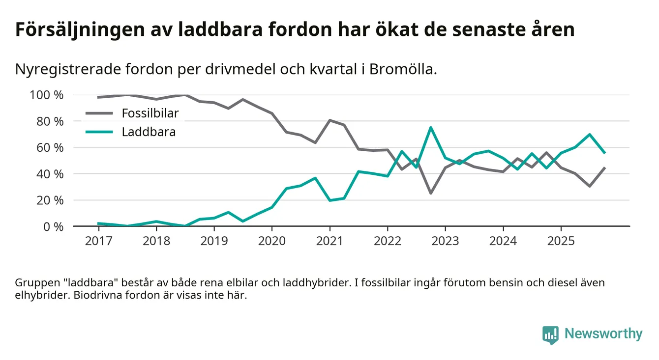 Under fjärde kvartalet 2025 var 56 procent av alla nyregistrerade personbilar i Bromölla laddbara (sammanlagt registrerades 41 nya bilar). Merparten av de laddbara bilarna var rena elbilar (39 procent av alla).