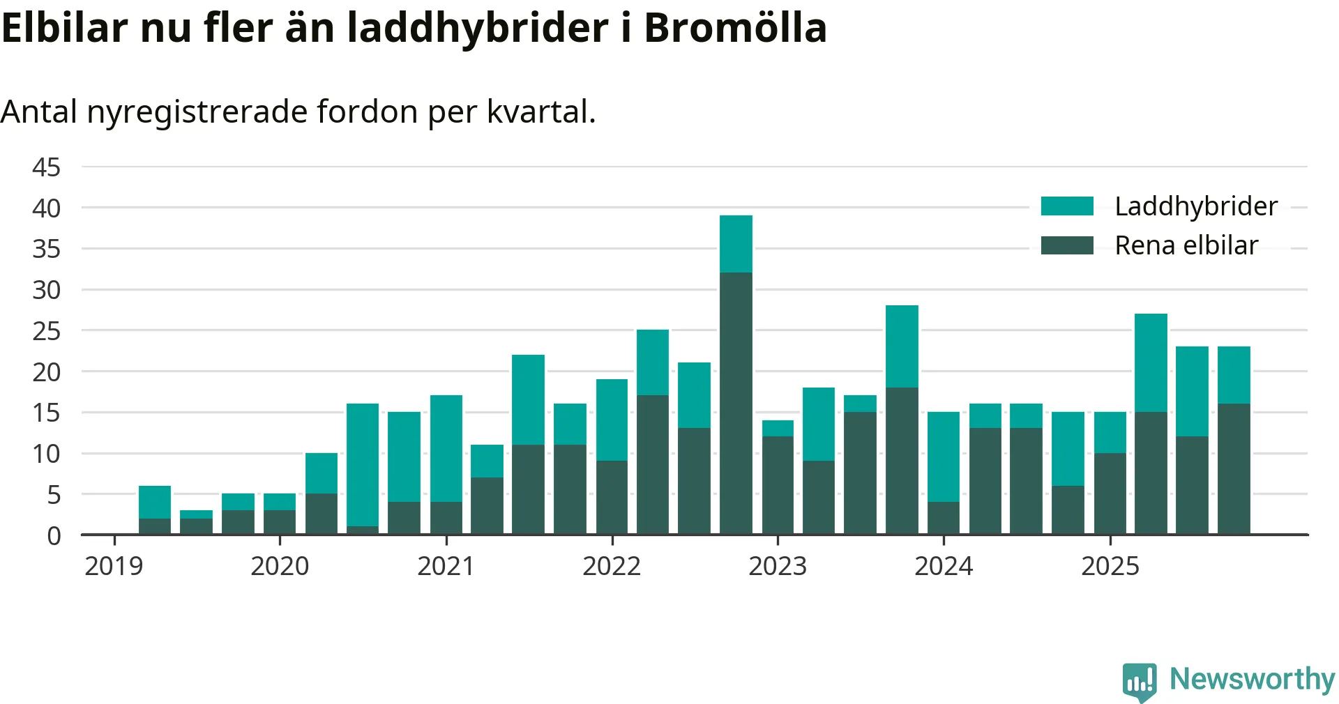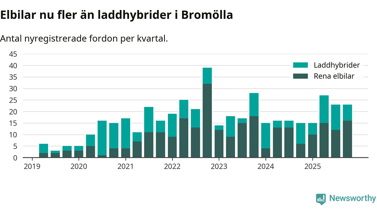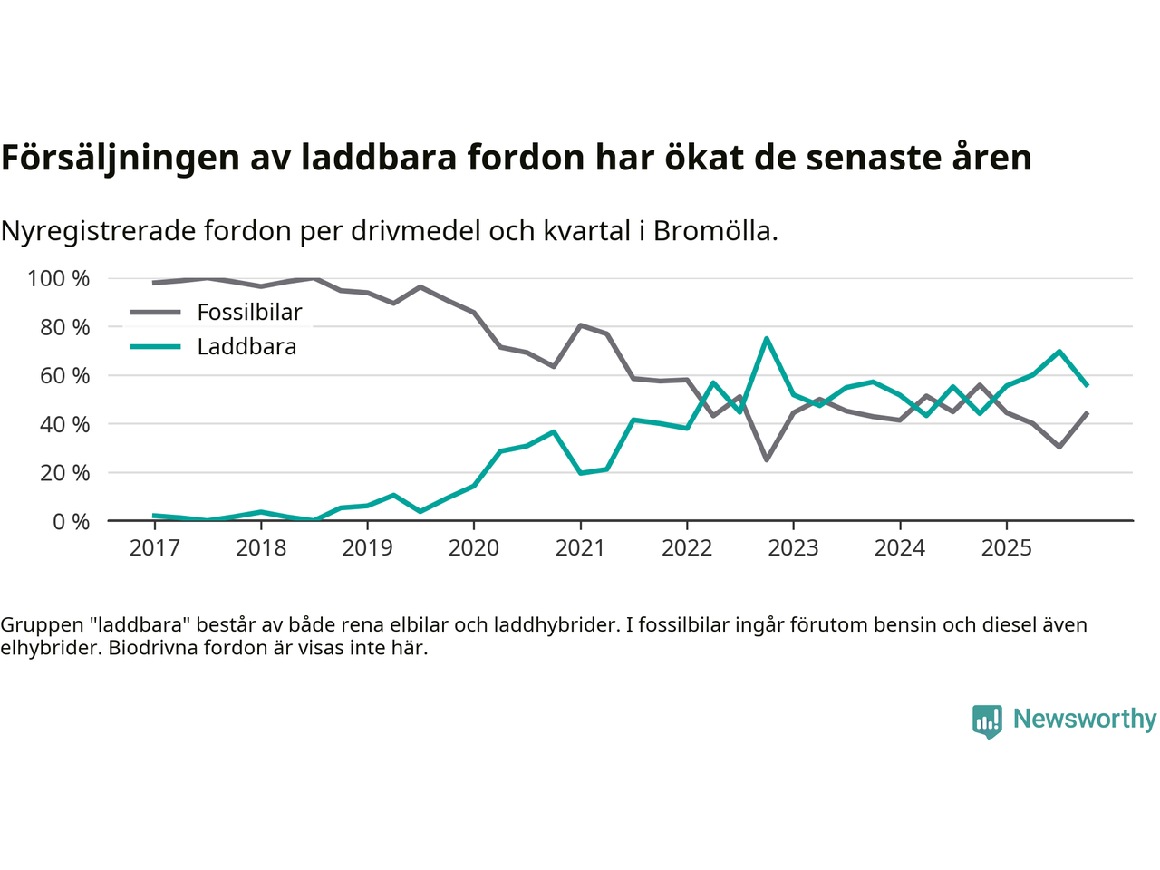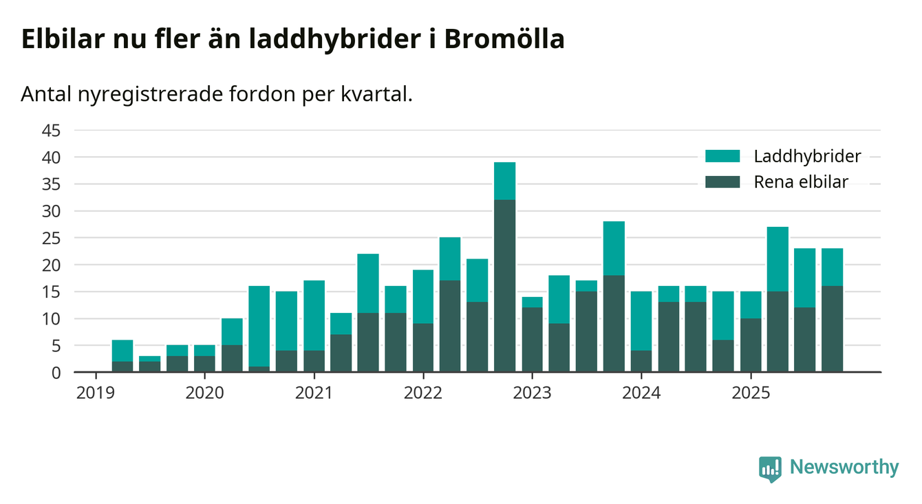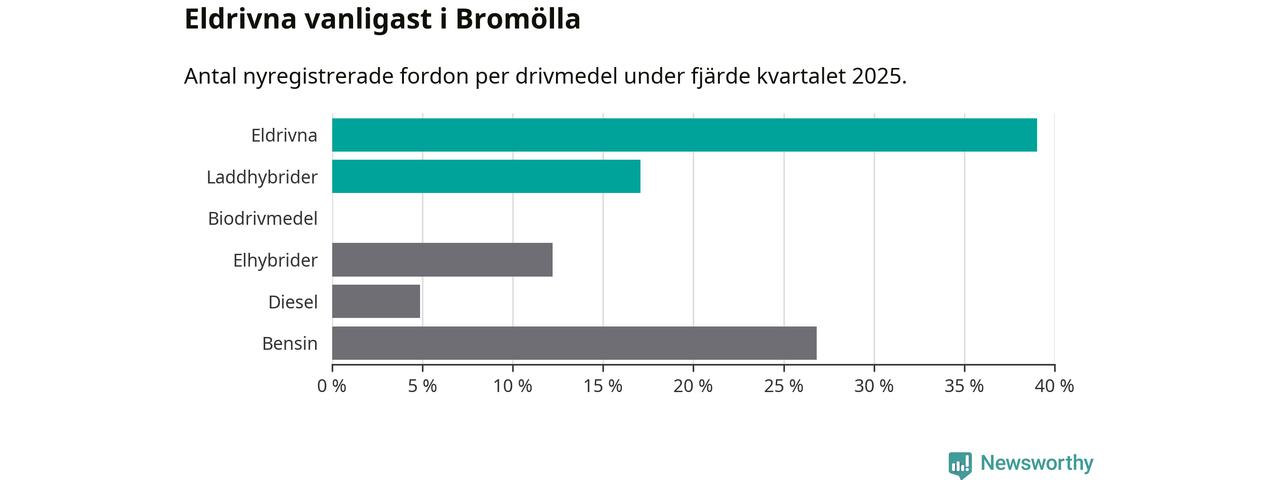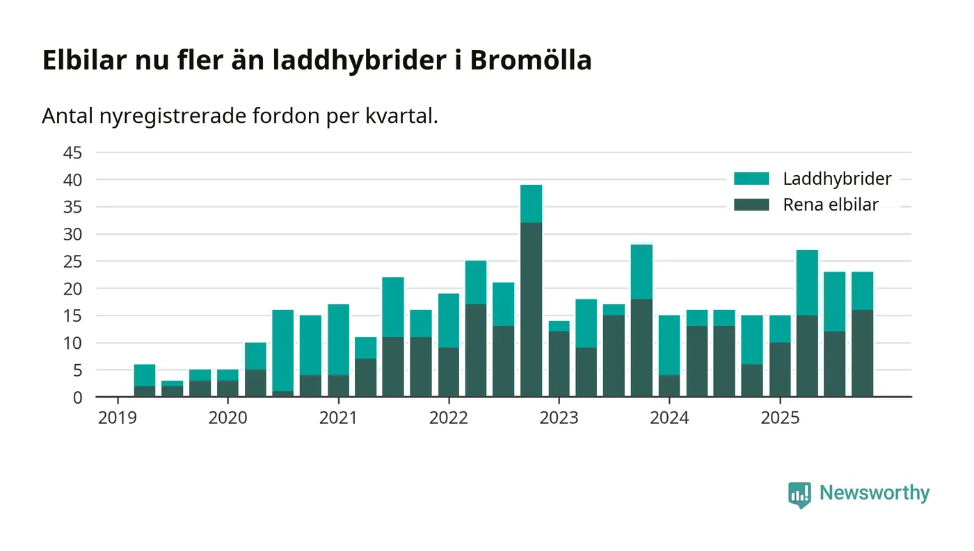 Under fjärde kvartalet 2025 var 56 procent av alla nyregistrerade personbilar i Bromölla laddbara (sammanlagt registrerades 41 nya bilar). Merparten av de laddbara bilarna var rena elbilar (39 procent av alla).