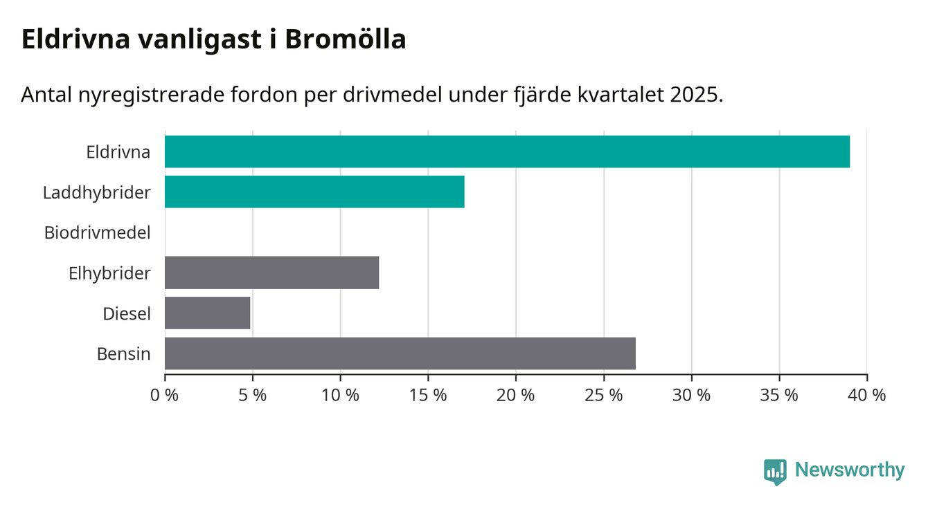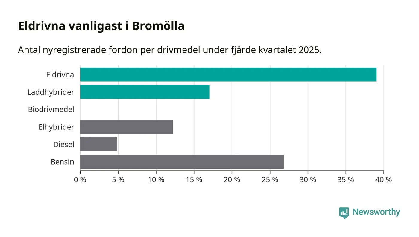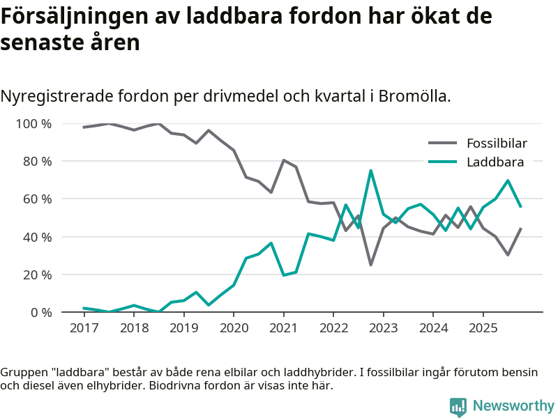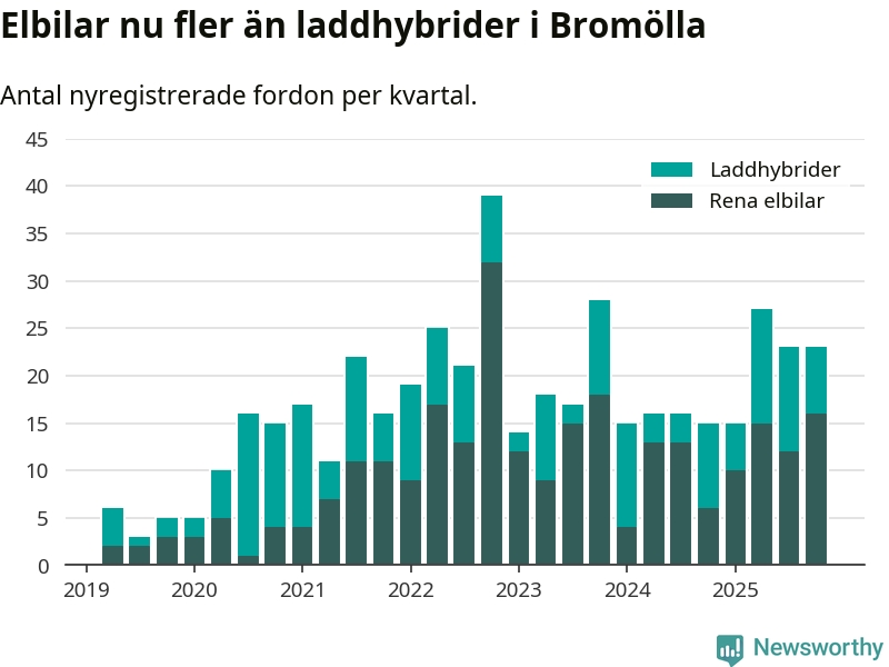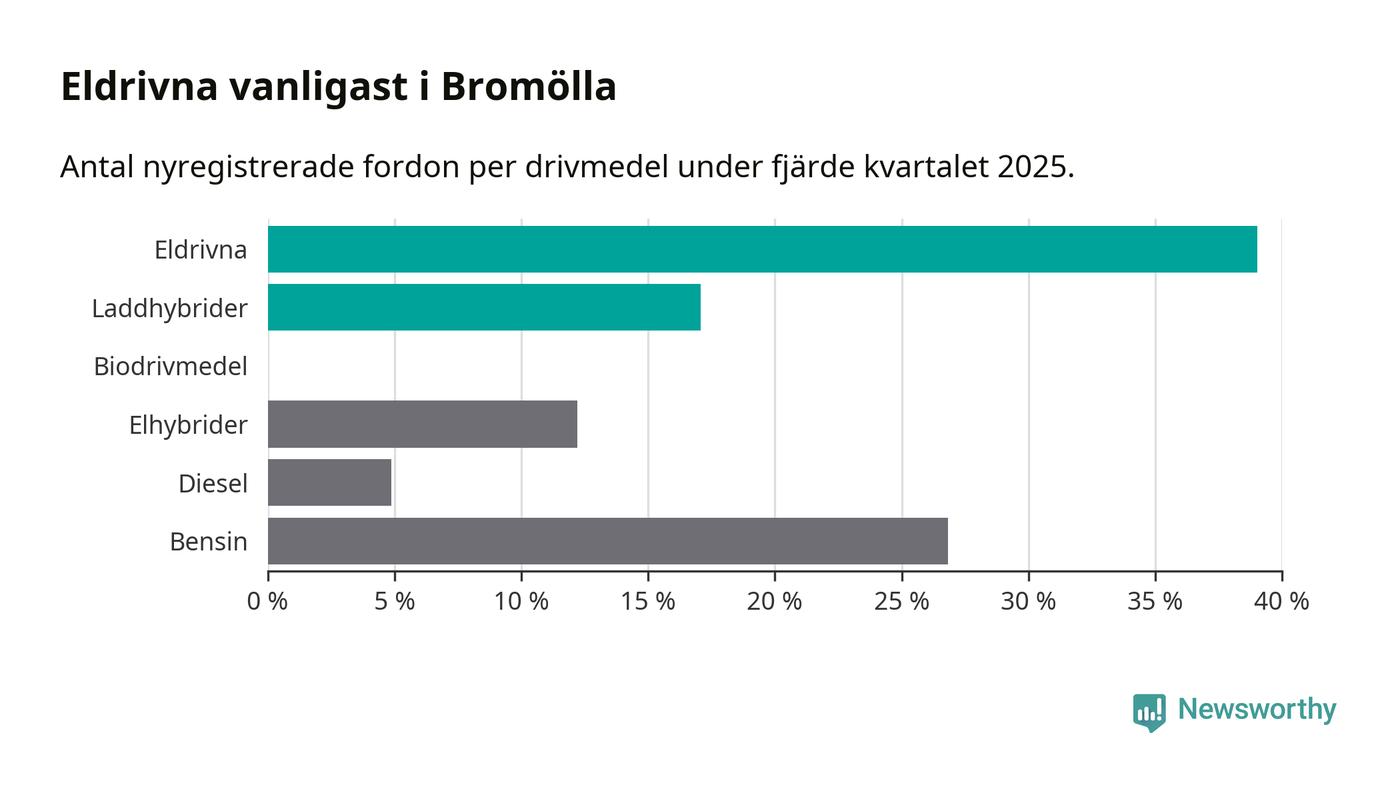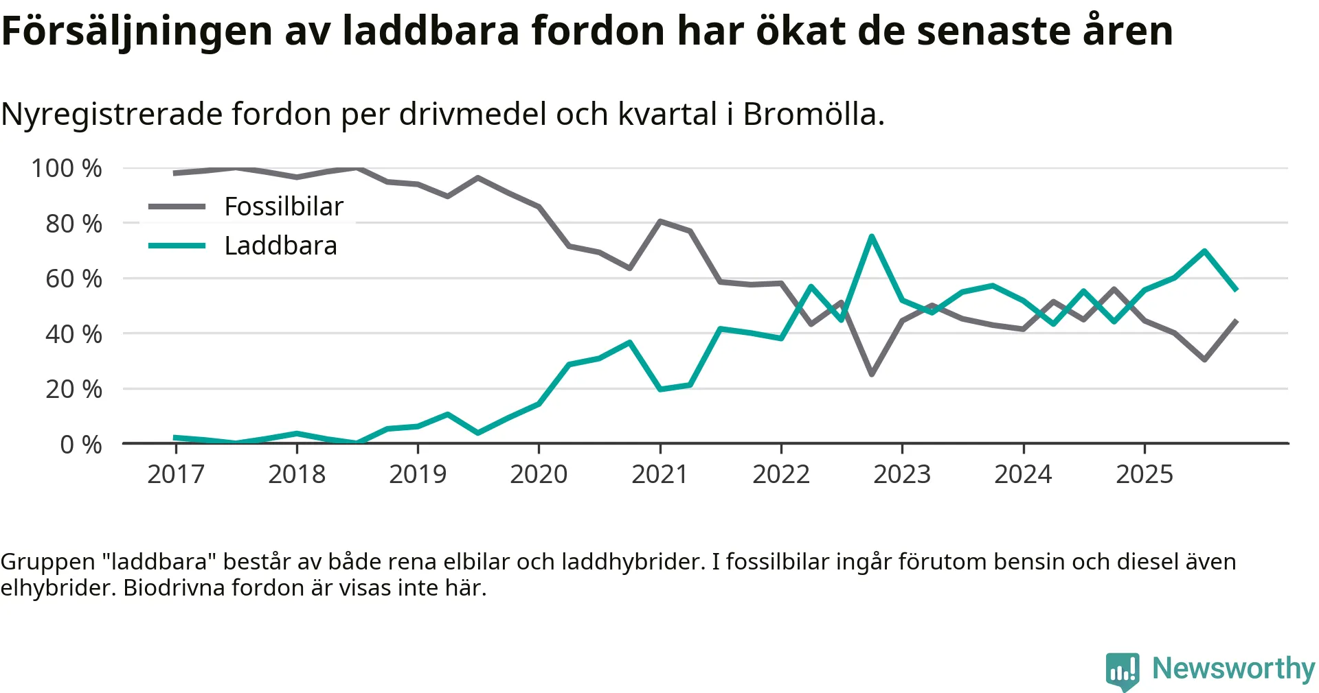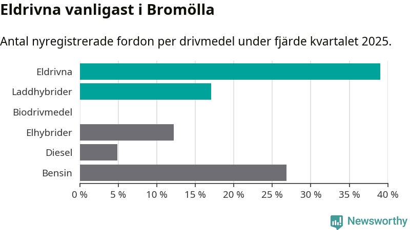 Under fjärde kvartalet 2025 var 56 procent av alla nyregistrerade personbilar i Bromölla laddbara (sammanlagt registrerades 41 nya bilar). Merparten av de laddbara bilarna var rena elbilar (39 procent av alla).