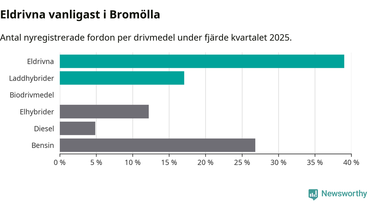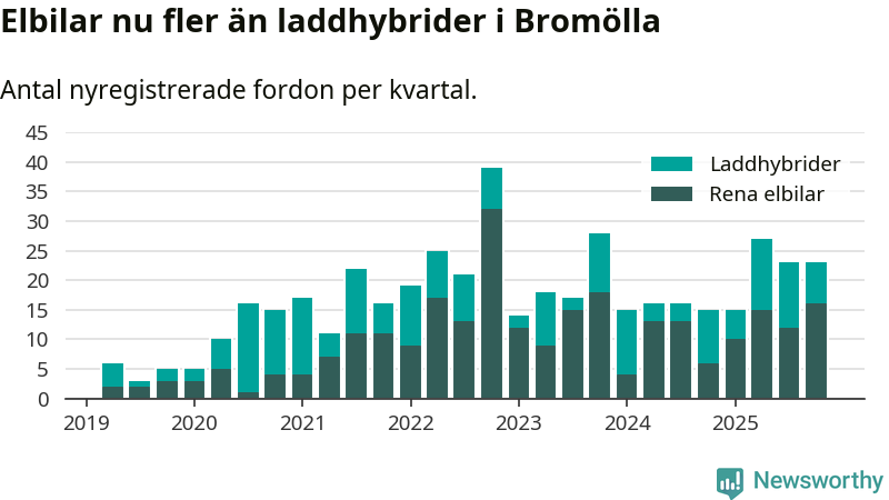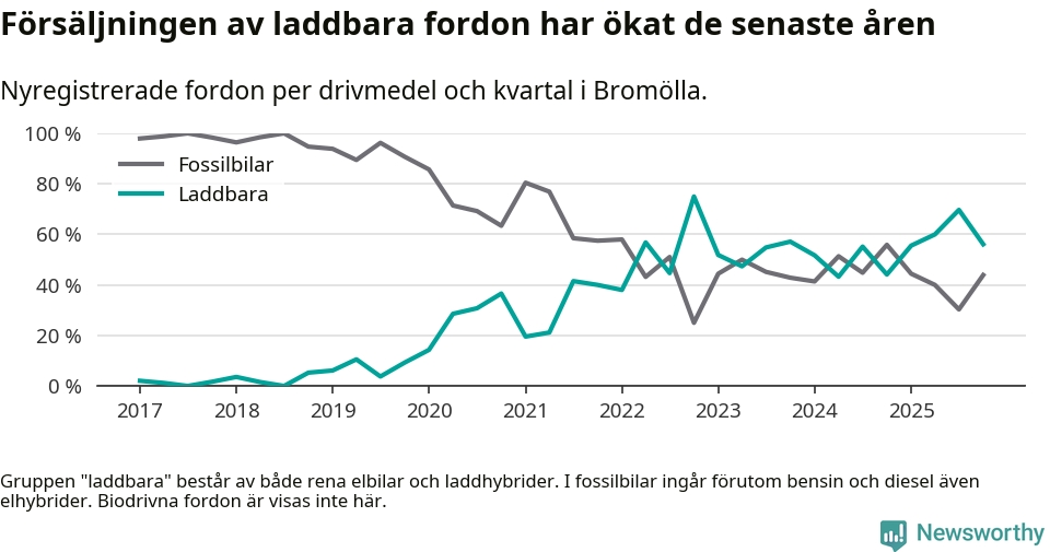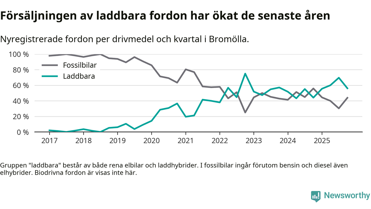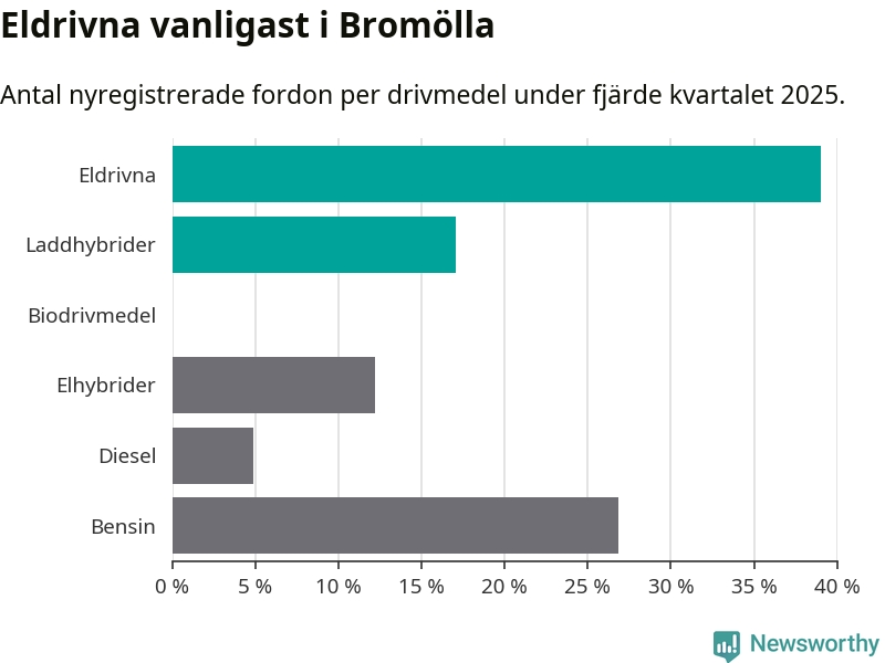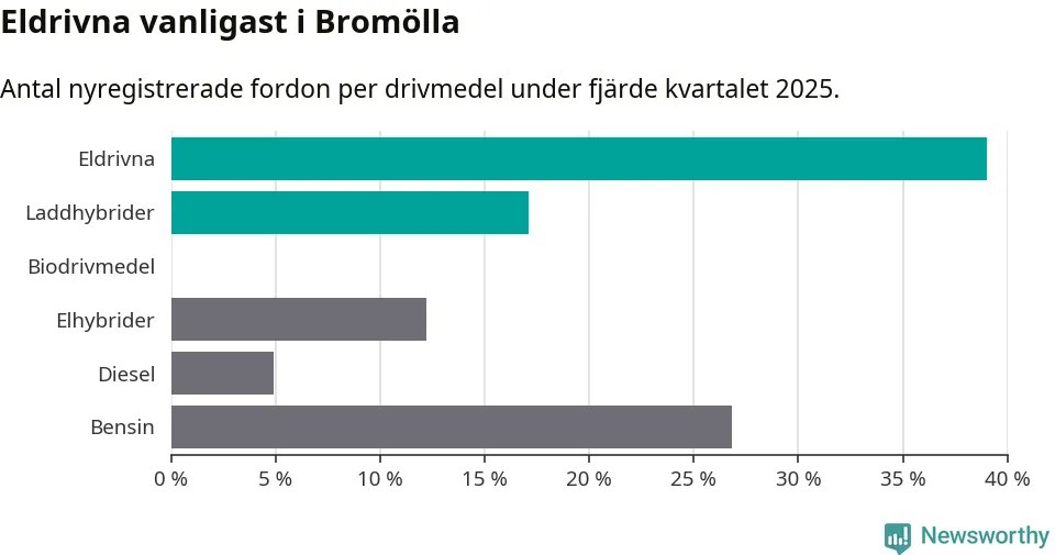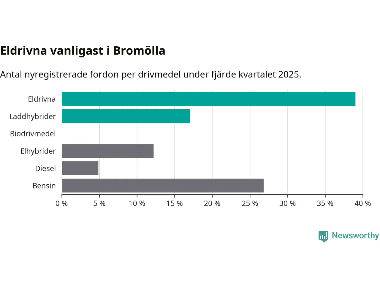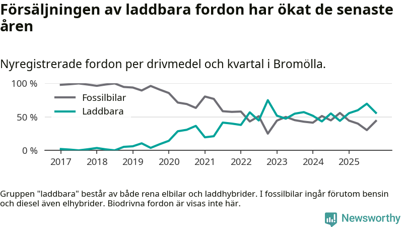 Under fjärde kvartalet 2025 var 56 procent av alla nyregistrerade personbilar i Bromölla laddbara (sammanlagt registrerades 41 nya bilar). Merparten av de laddbara bilarna var rena elbilar (39 procent av alla).