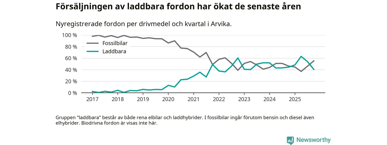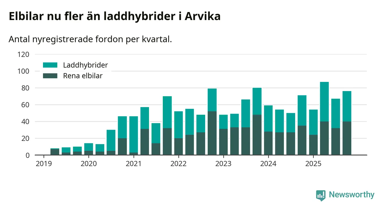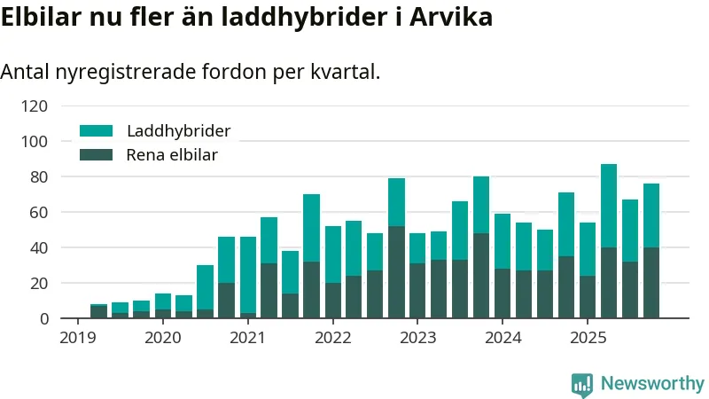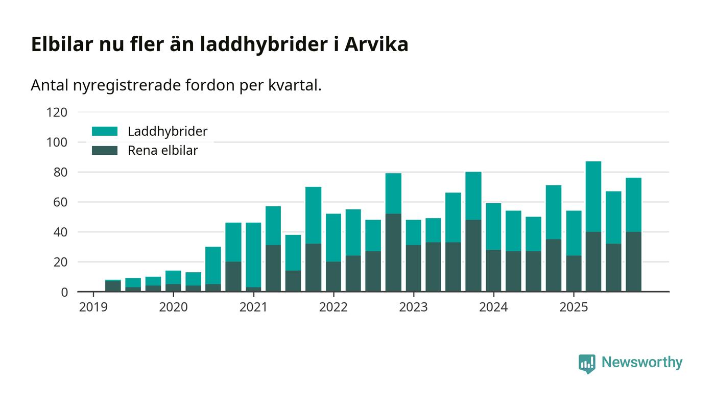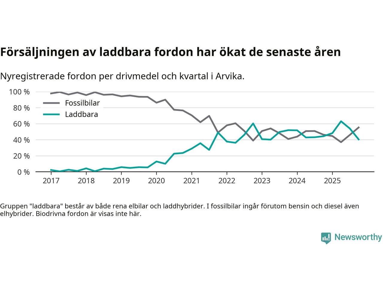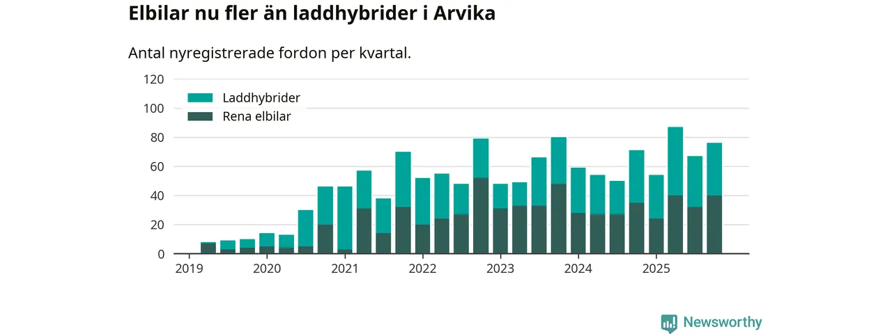 Under fjärde kvartalet 2025 var 40 procent av alla nyregistrerade personbilar i Arvika laddbara (sammanlagt registrerades 188 nya bilar). Merparten av de laddbara bilarna var rena elbilar (21 procent av alla).
