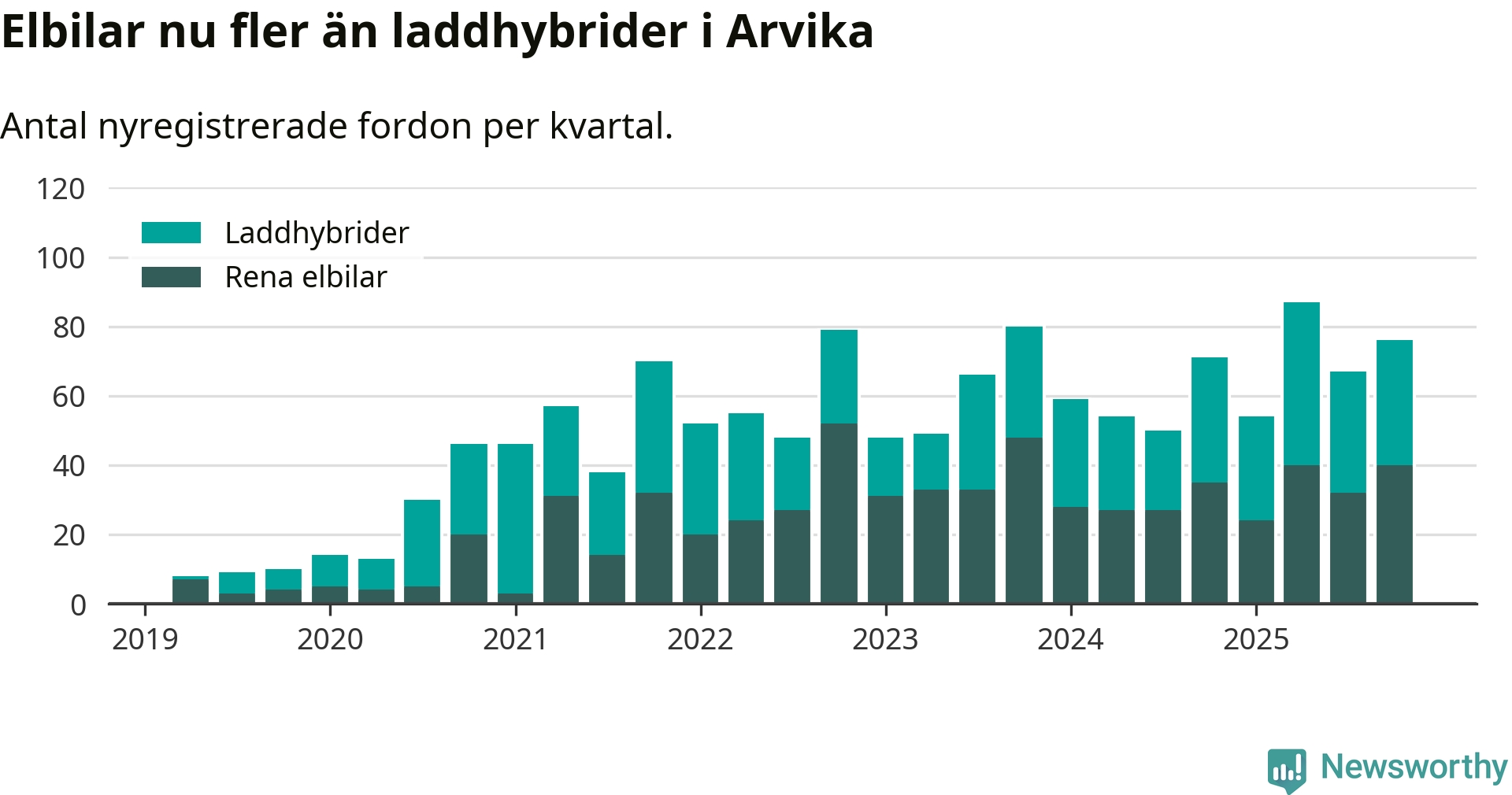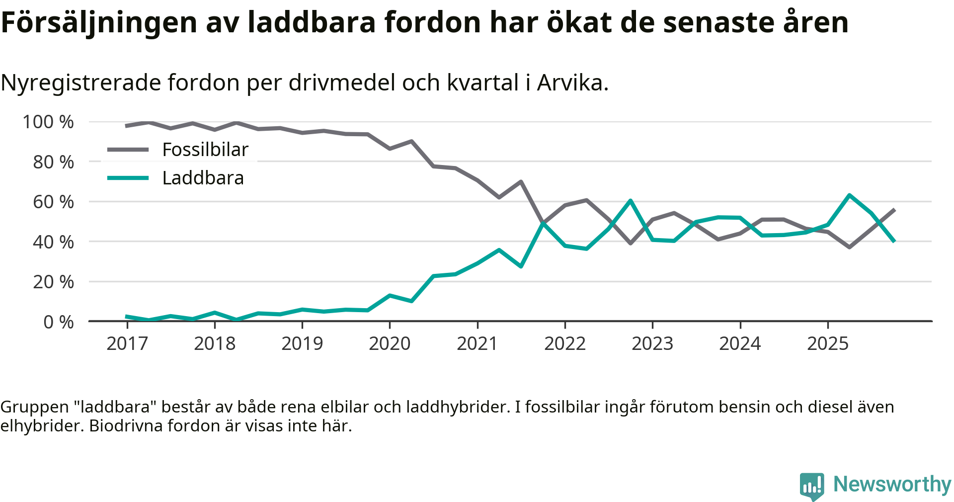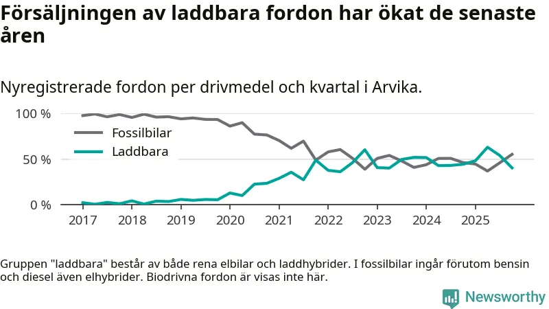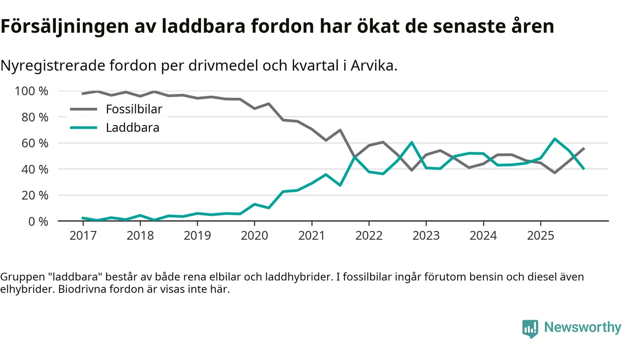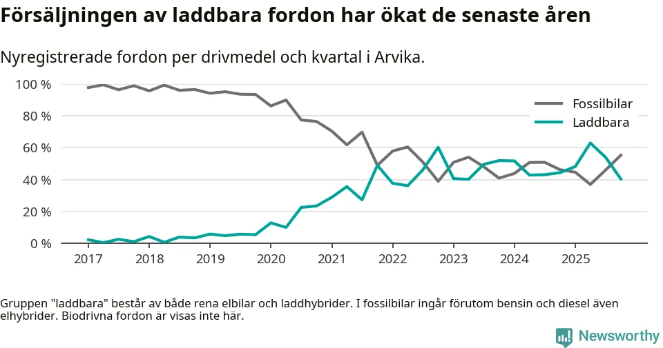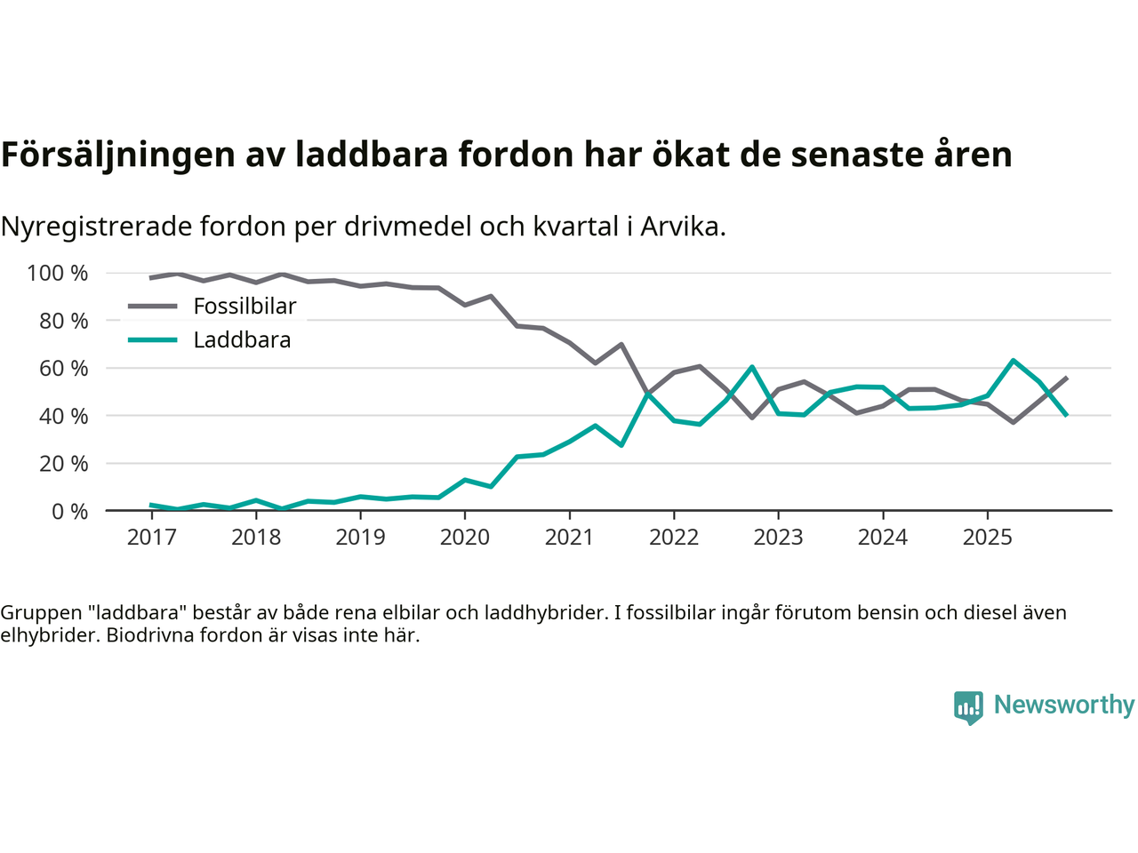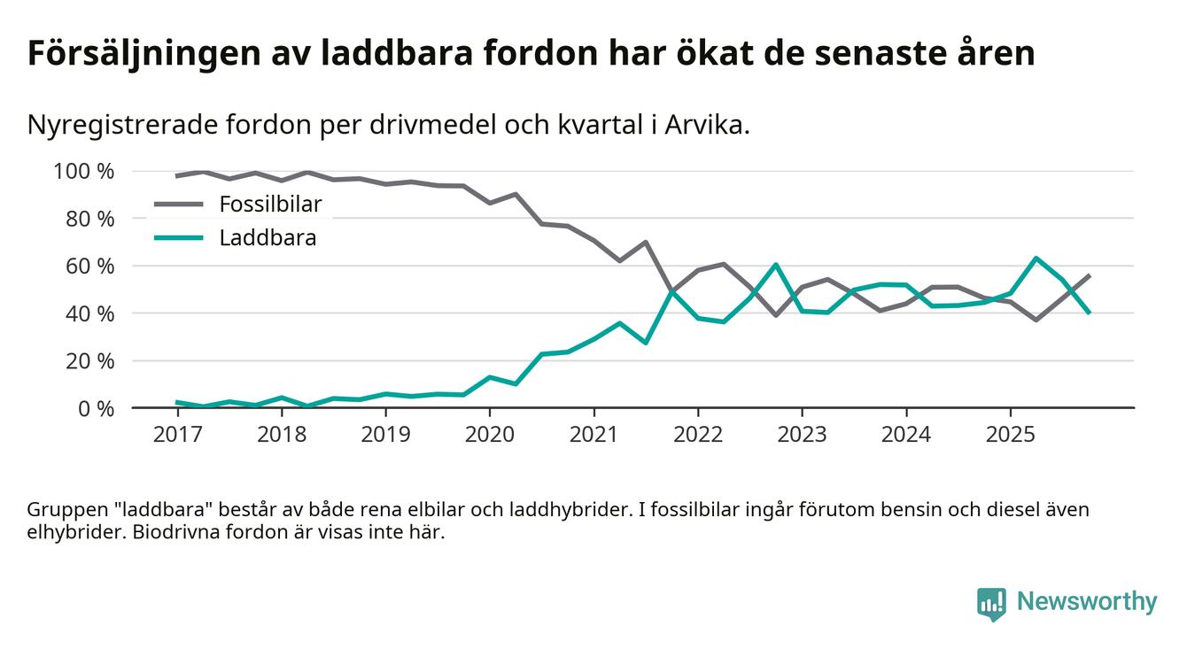 Under fjärde kvartalet 2025 var 40 procent av alla nyregistrerade personbilar i Arvika laddbara (sammanlagt registrerades 188 nya bilar). Merparten av de laddbara bilarna var rena elbilar (21 procent av alla).