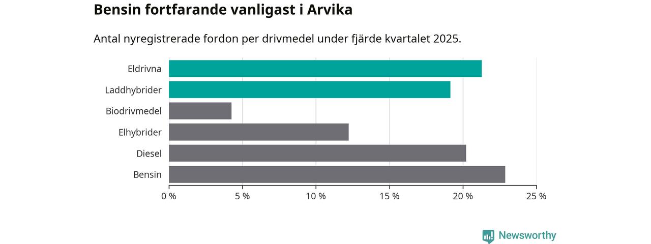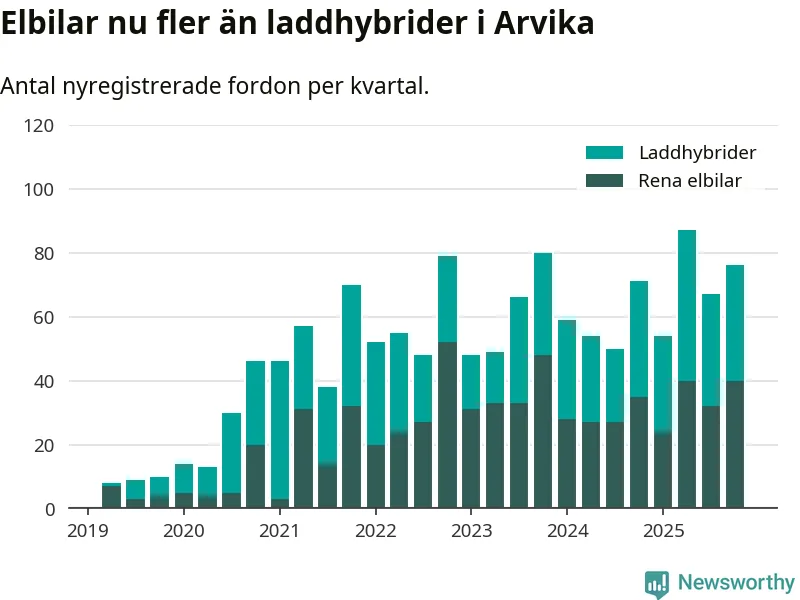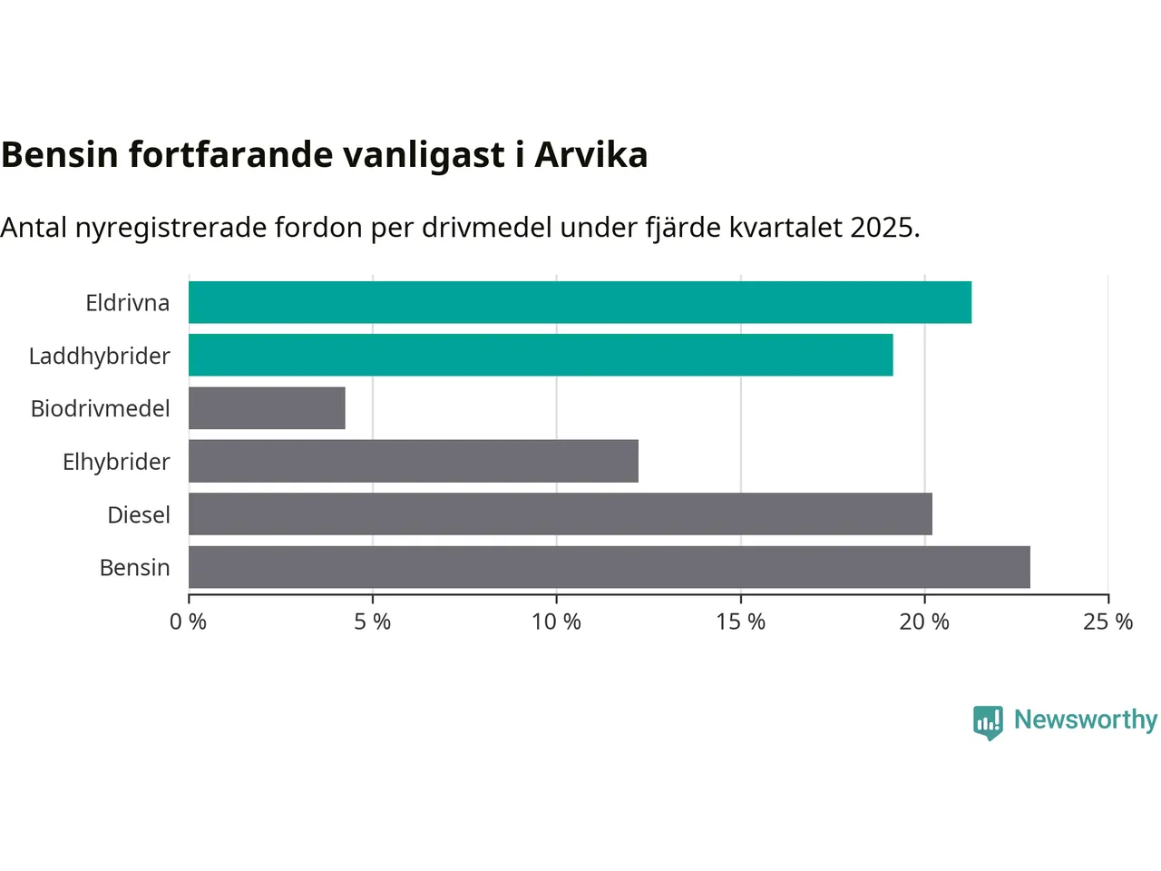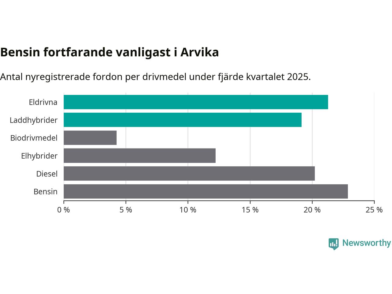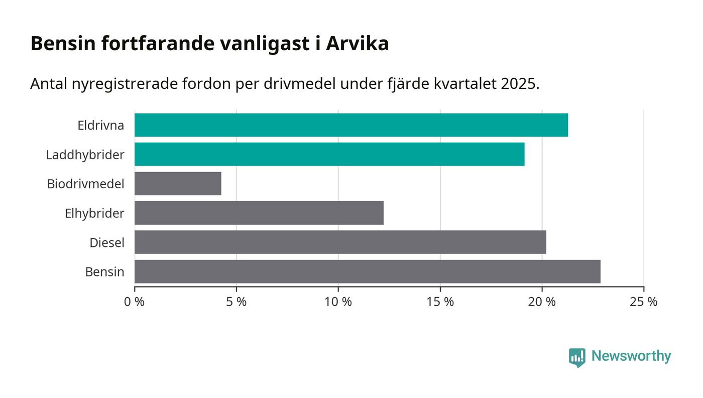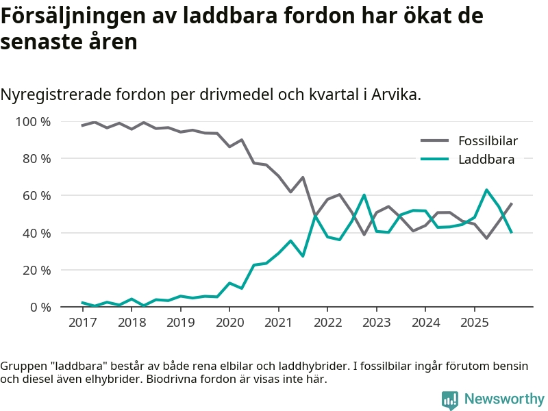 Under fjärde kvartalet 2025 var 40 procent av alla nyregistrerade personbilar i Arvika laddbara (sammanlagt registrerades 188 nya bilar). Merparten av de laddbara bilarna var rena elbilar (21 procent av alla).