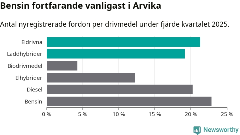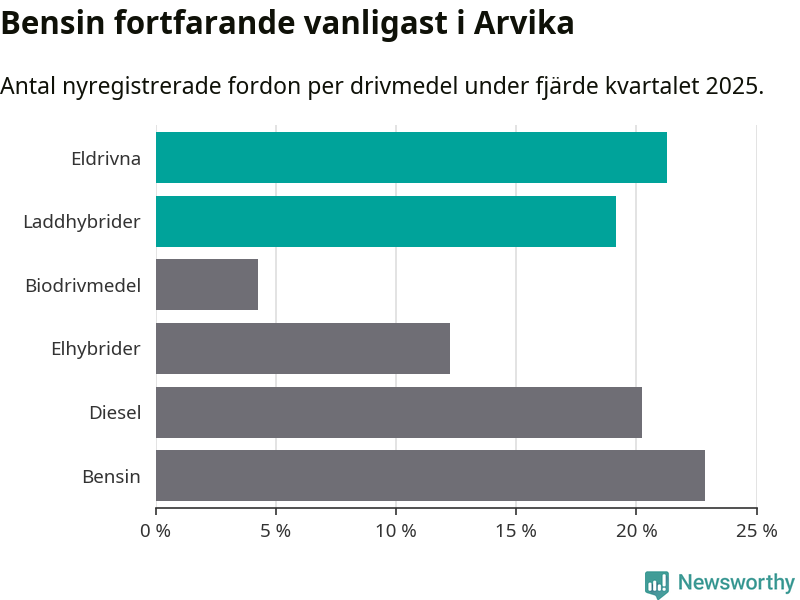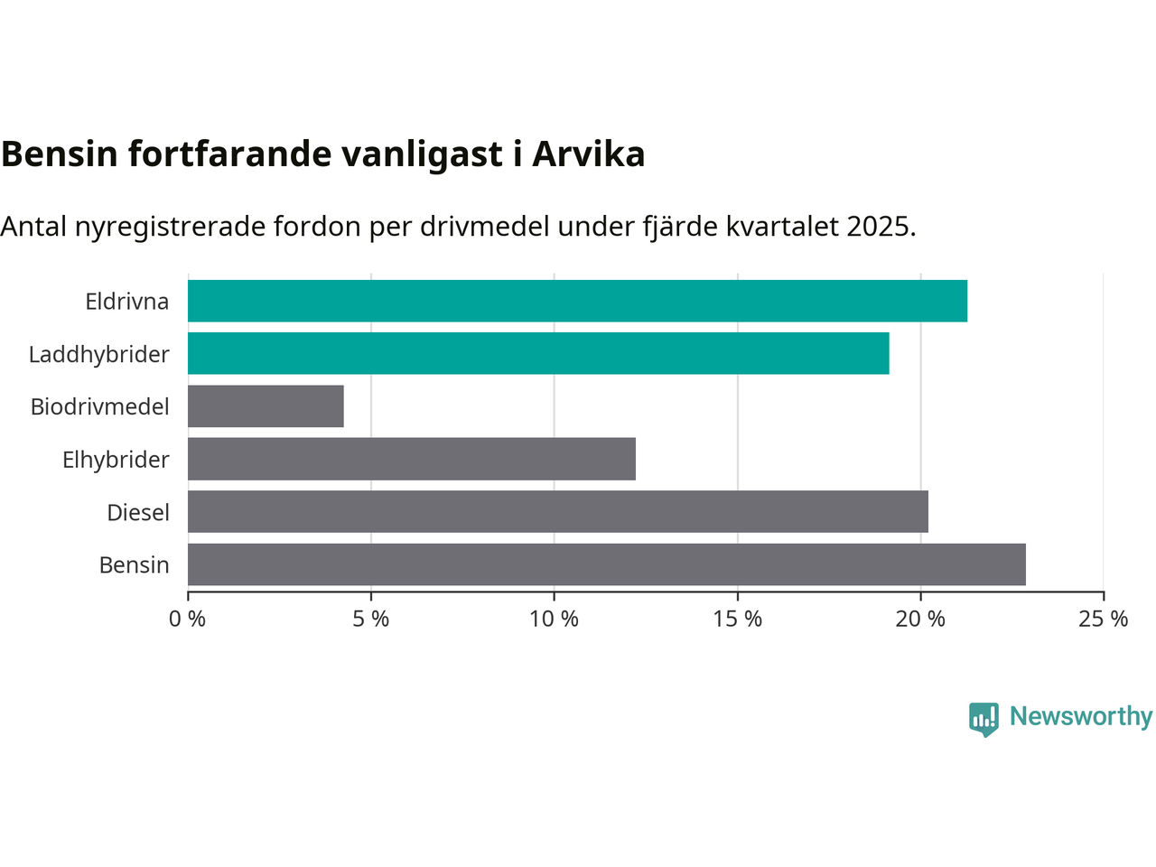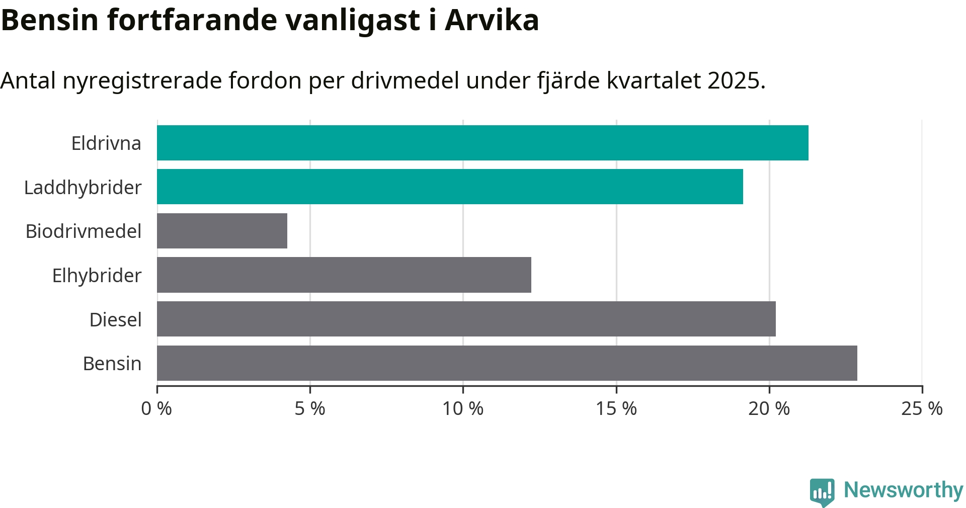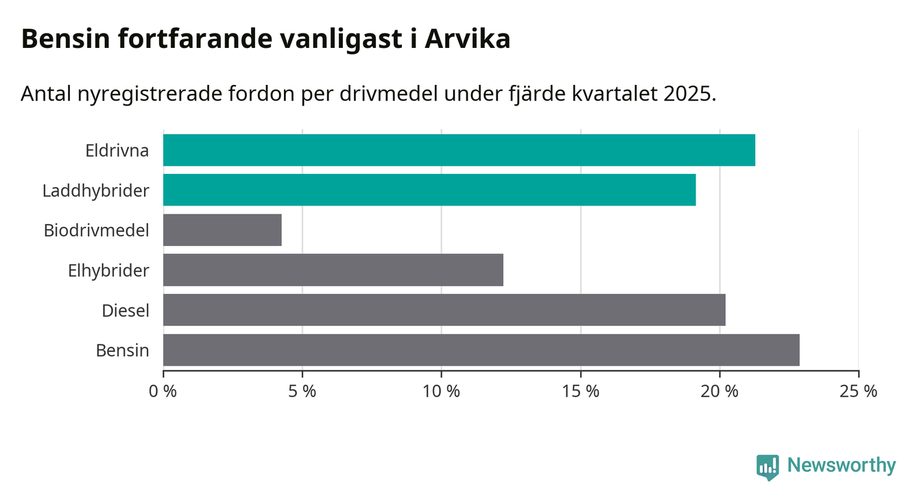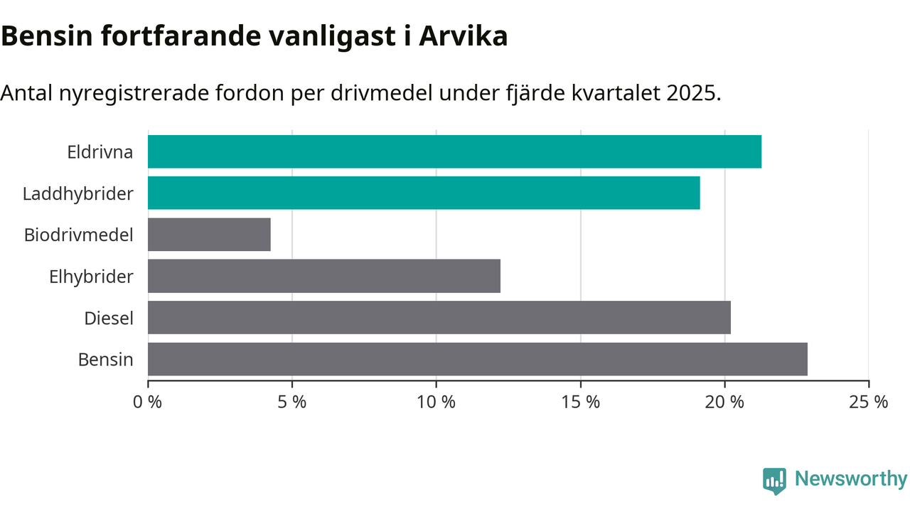 Under fjärde kvartalet 2025 var 40 procent av alla nyregistrerade personbilar i Arvika laddbara (sammanlagt registrerades 188 nya bilar). Merparten av de laddbara bilarna var rena elbilar (21 procent av alla).