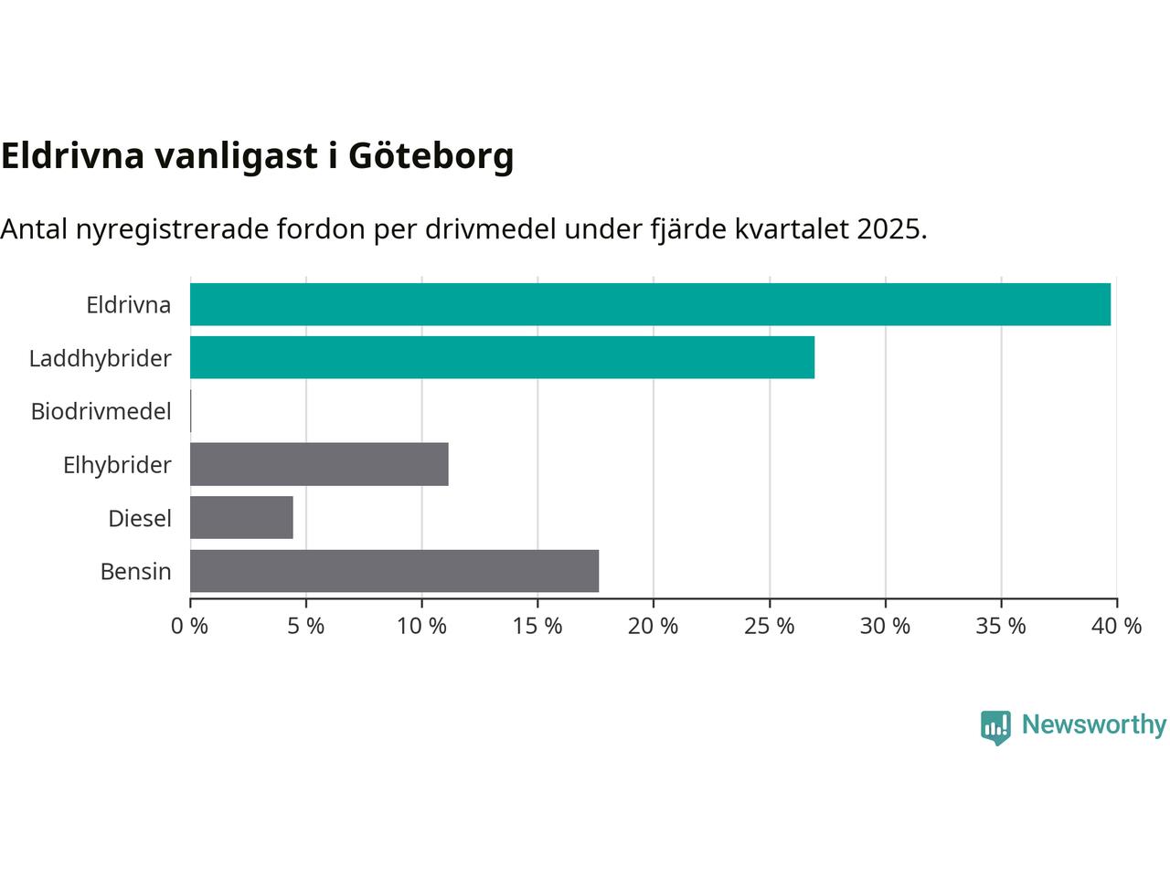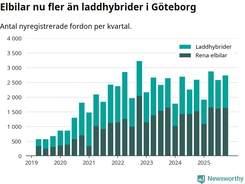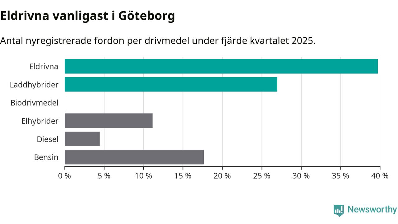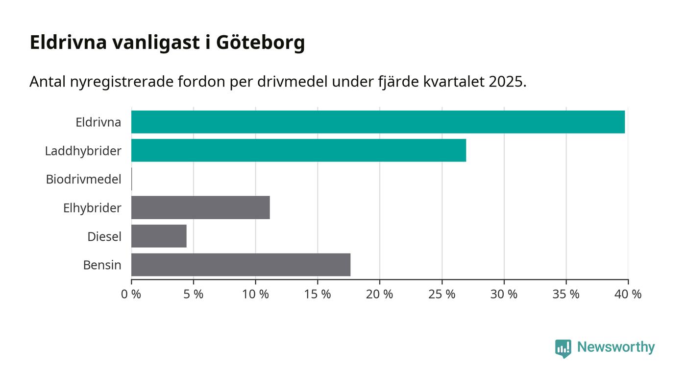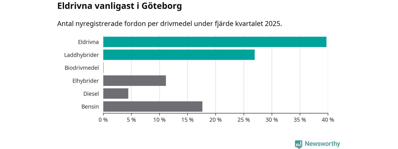 Under fjärde kvartalet 2025 var 67 procent av alla nyregistrerade personbilar i Göteborg laddbara (sammanlagt registrerades 4 107 nya bilar). Merparten av de laddbara bilarna var rena elbilar (40 procent av alla).