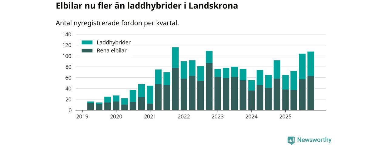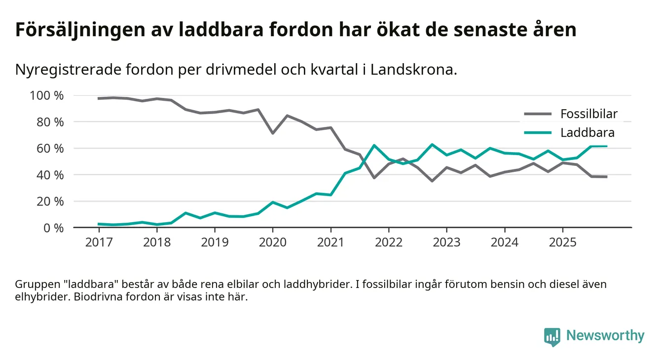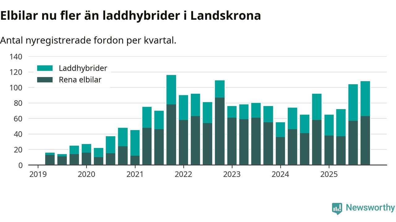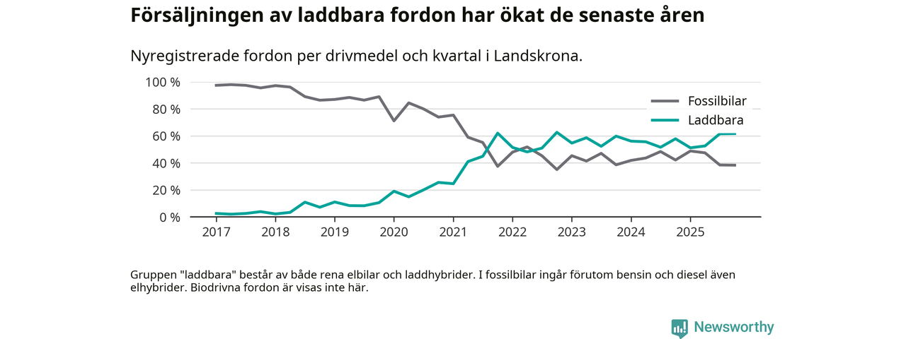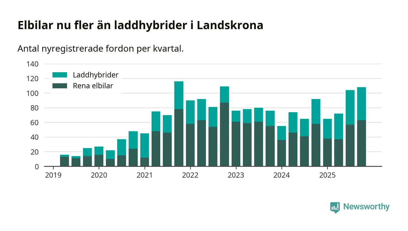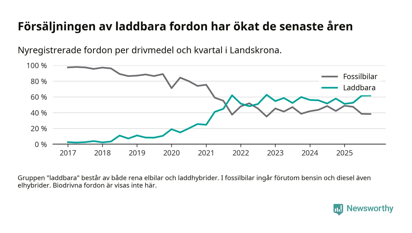 Under fjärde kvartalet 2025 var 62 procent av alla nyregistrerade personbilar i Landskrona laddbara (sammanlagt registrerades 175 nya bilar). Merparten av de laddbara bilarna var rena elbilar (36 procent av alla).