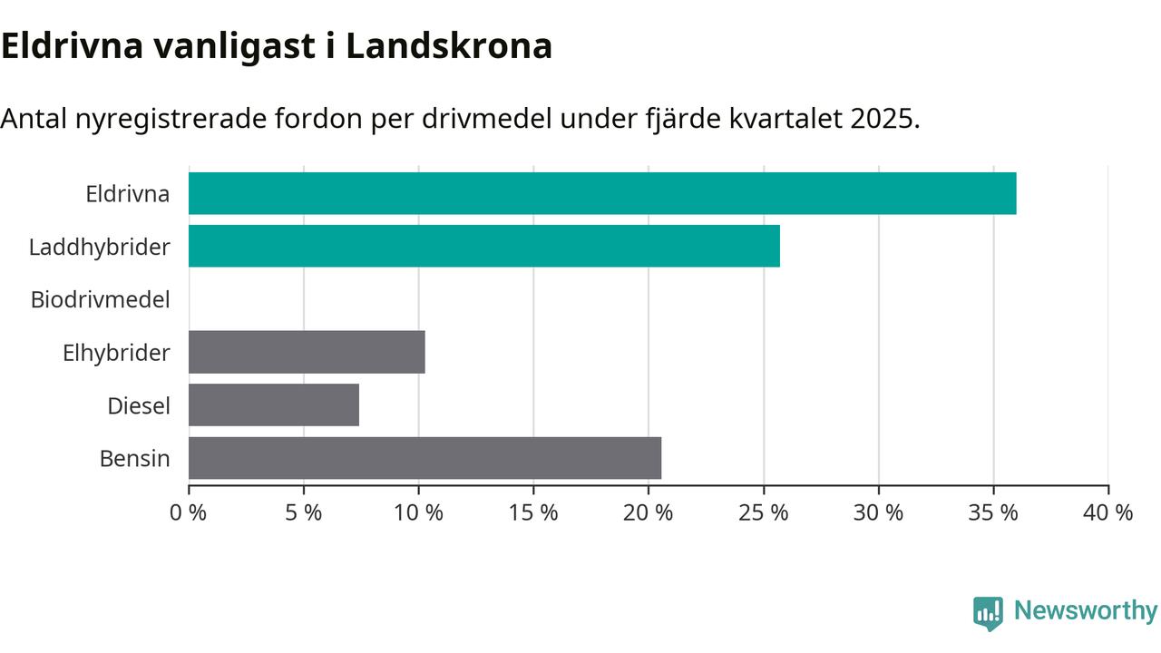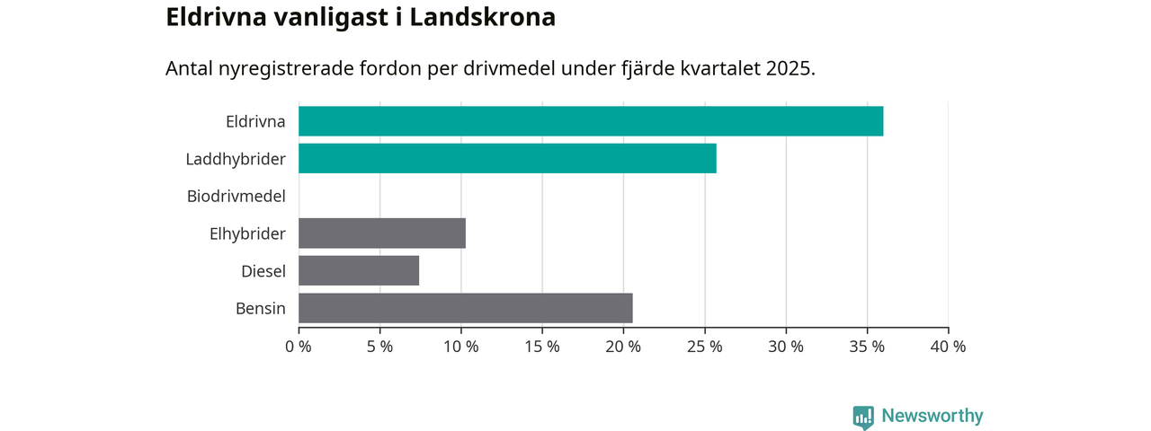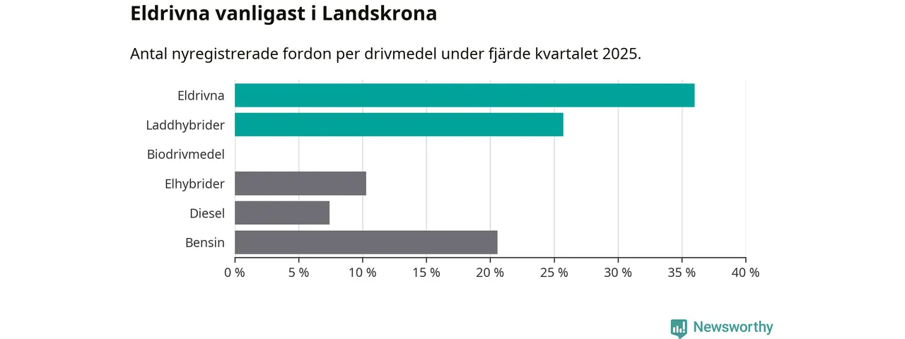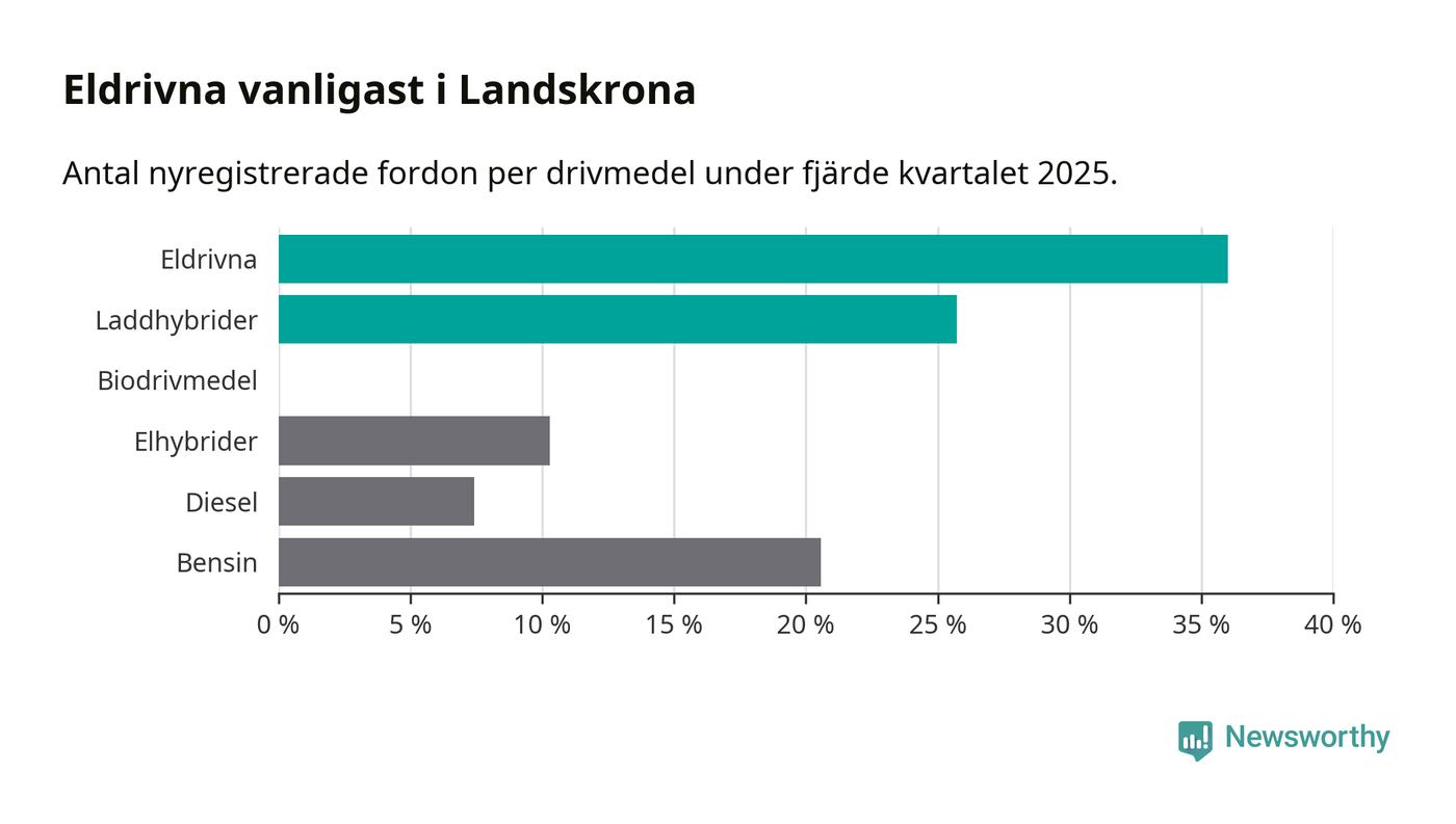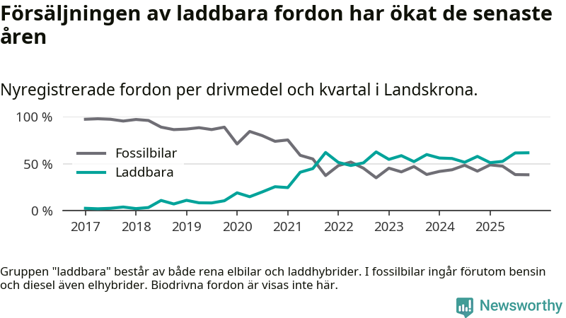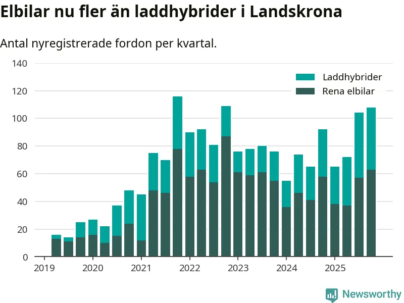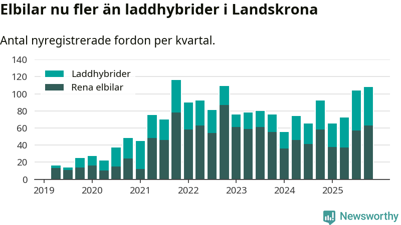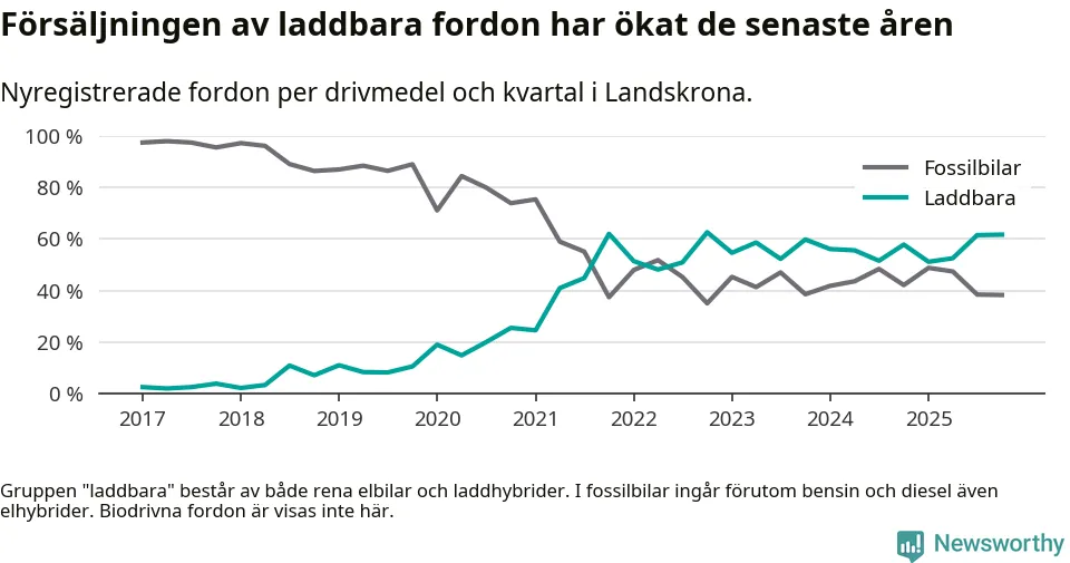 Under fjärde kvartalet 2025 var 62 procent av alla nyregistrerade personbilar i Landskrona laddbara (sammanlagt registrerades 175 nya bilar). Merparten av de laddbara bilarna var rena elbilar (36 procent av alla).