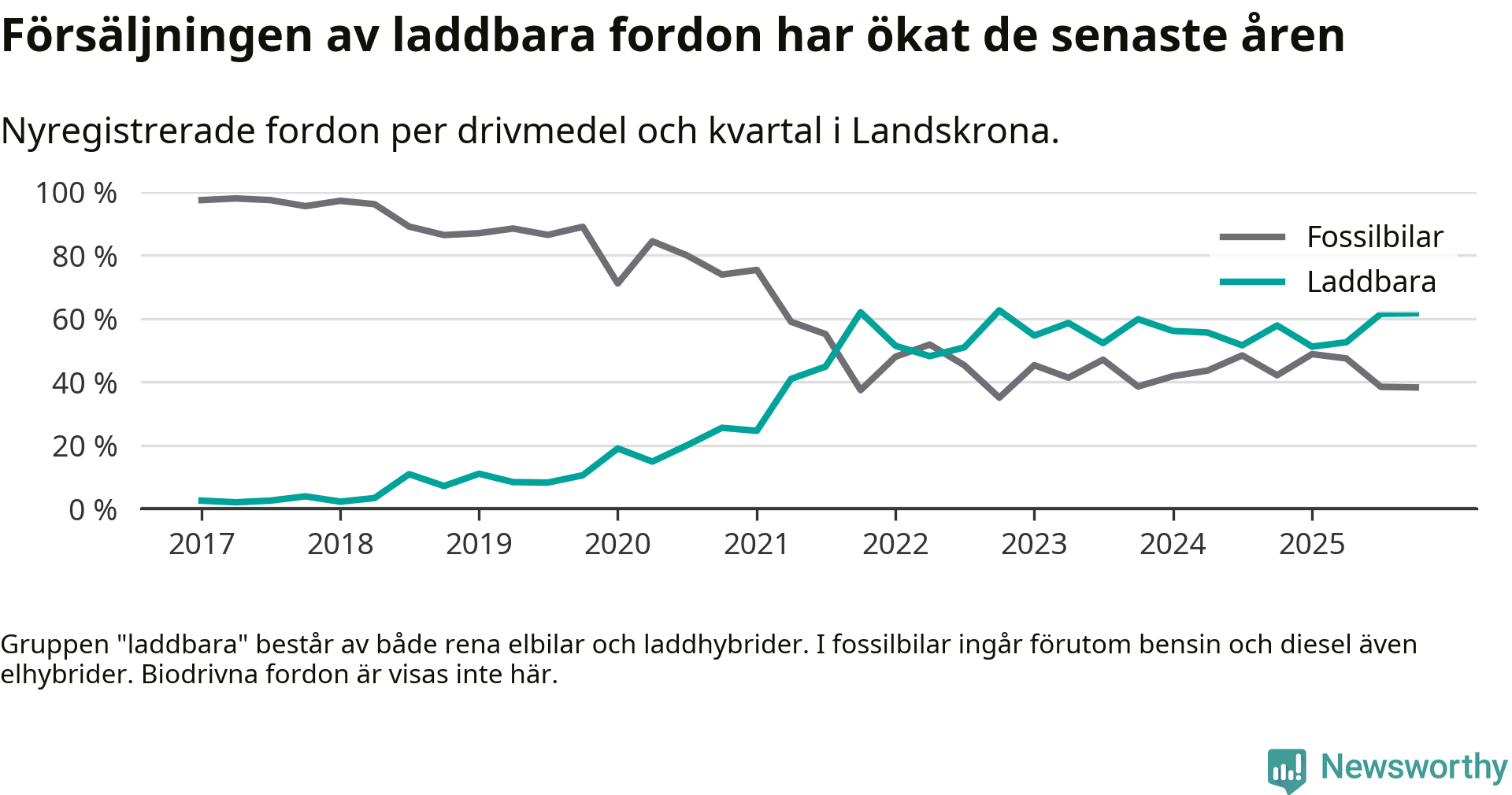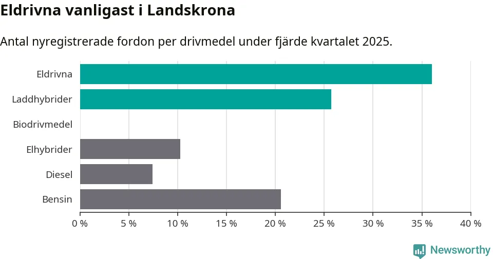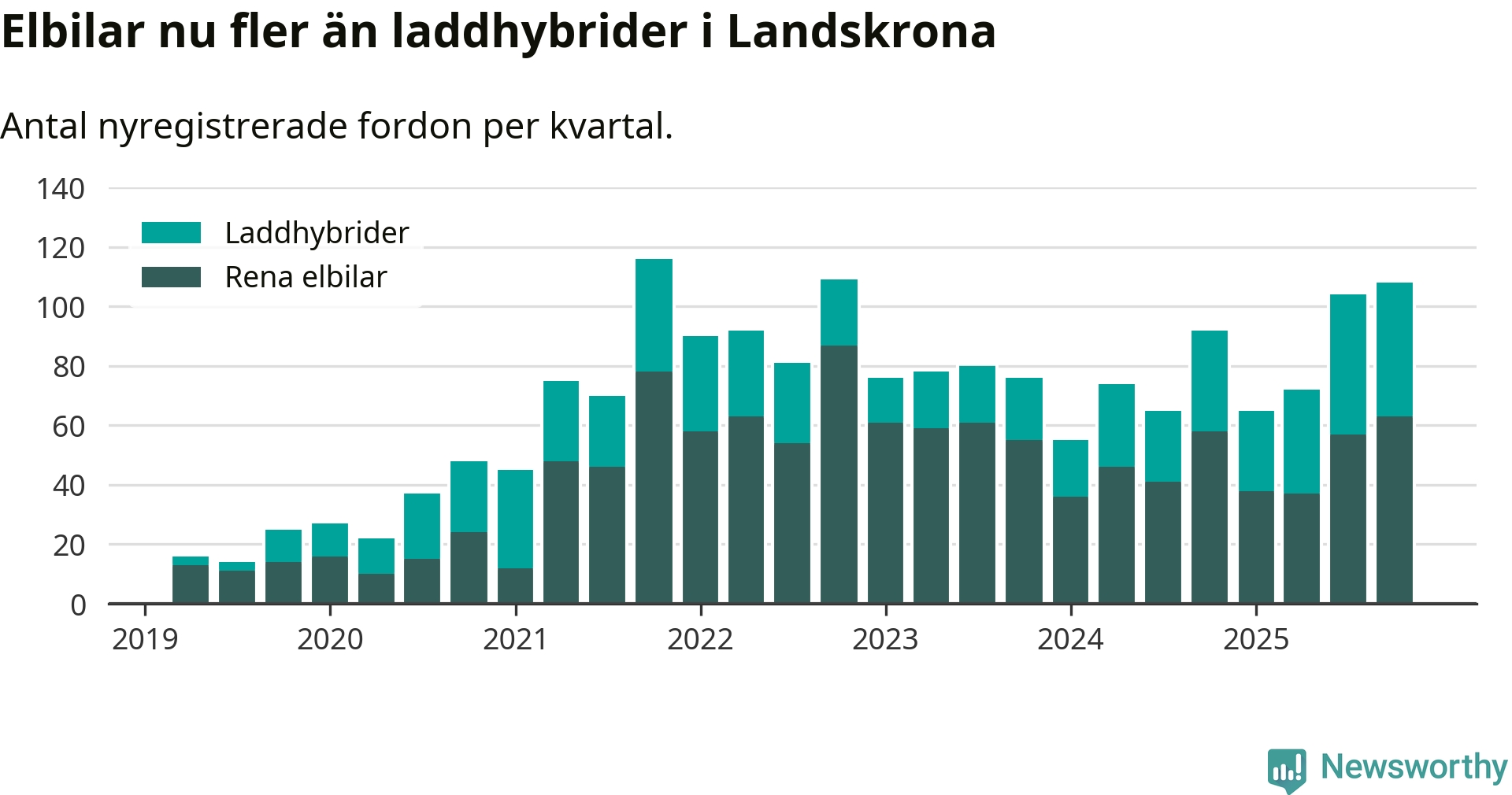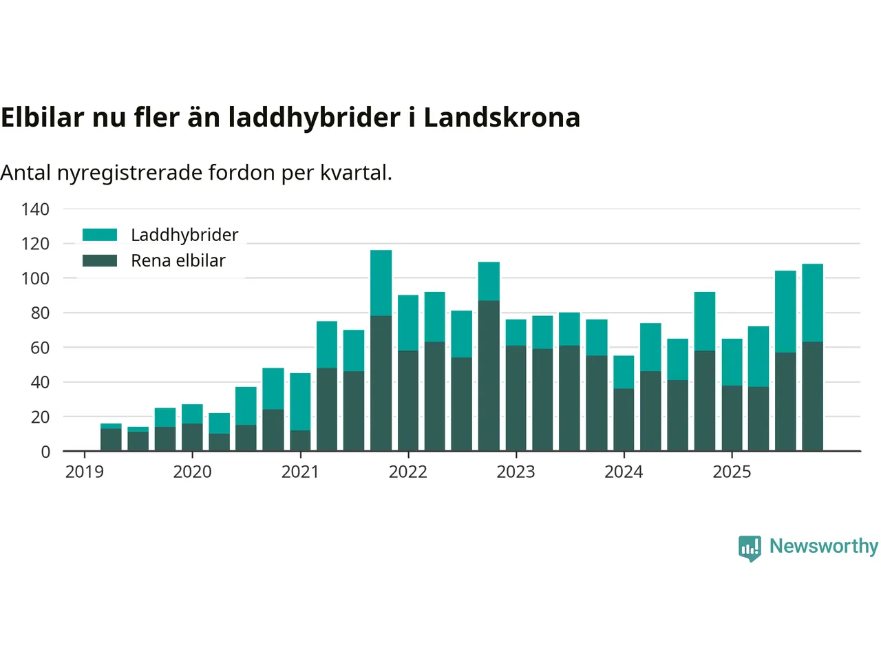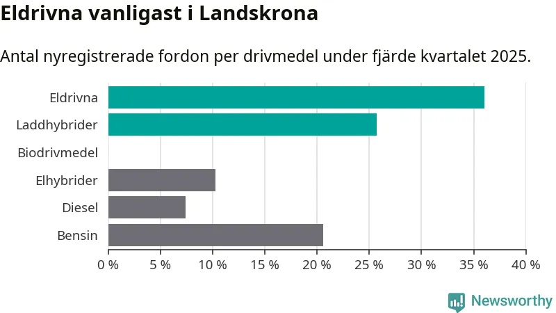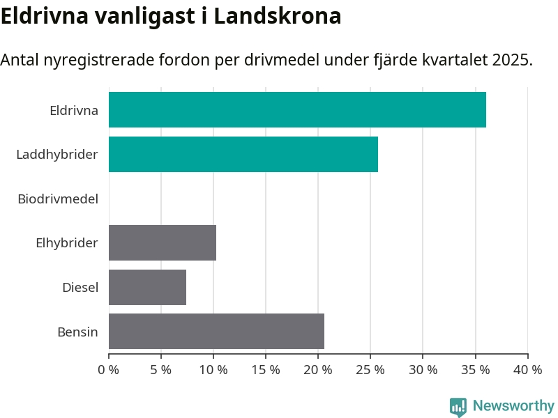 Under fjärde kvartalet 2025 var 62 procent av alla nyregistrerade personbilar i Landskrona laddbara (sammanlagt registrerades 175 nya bilar). Merparten av de laddbara bilarna var rena elbilar (36 procent av alla).