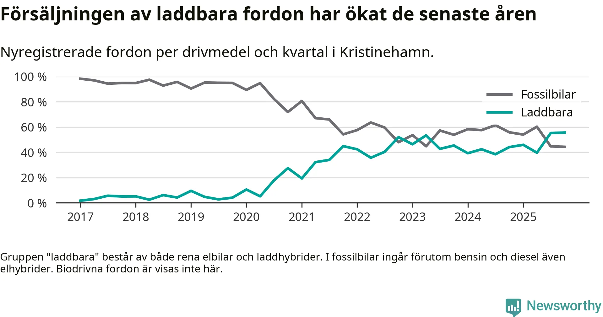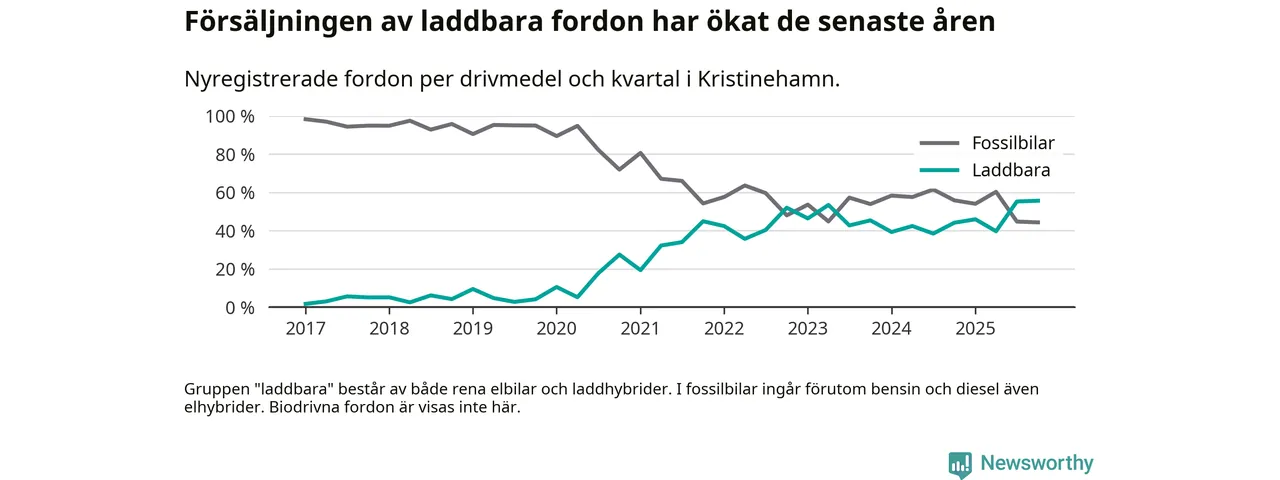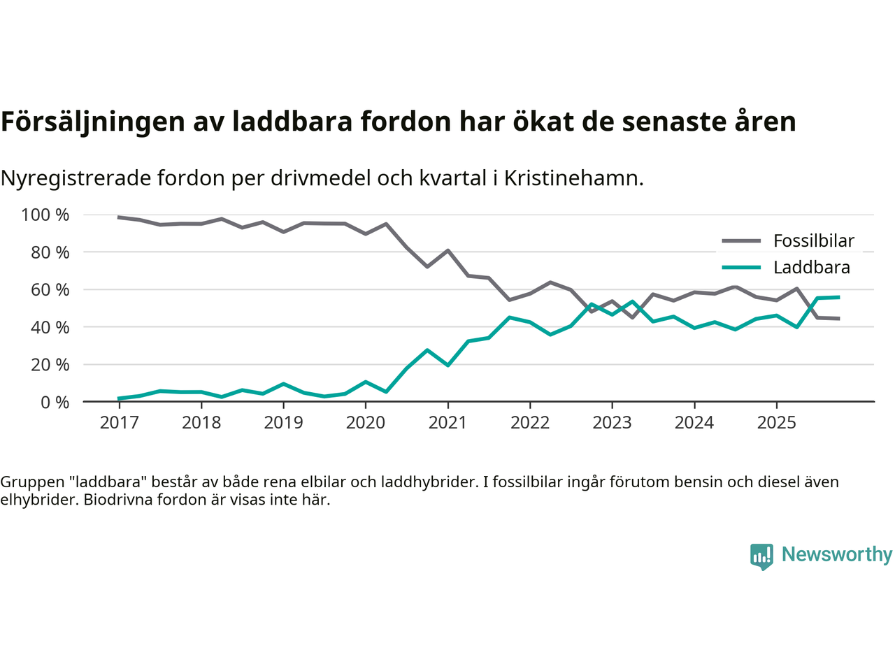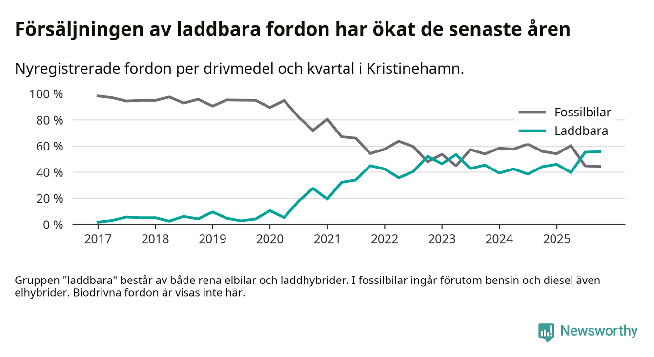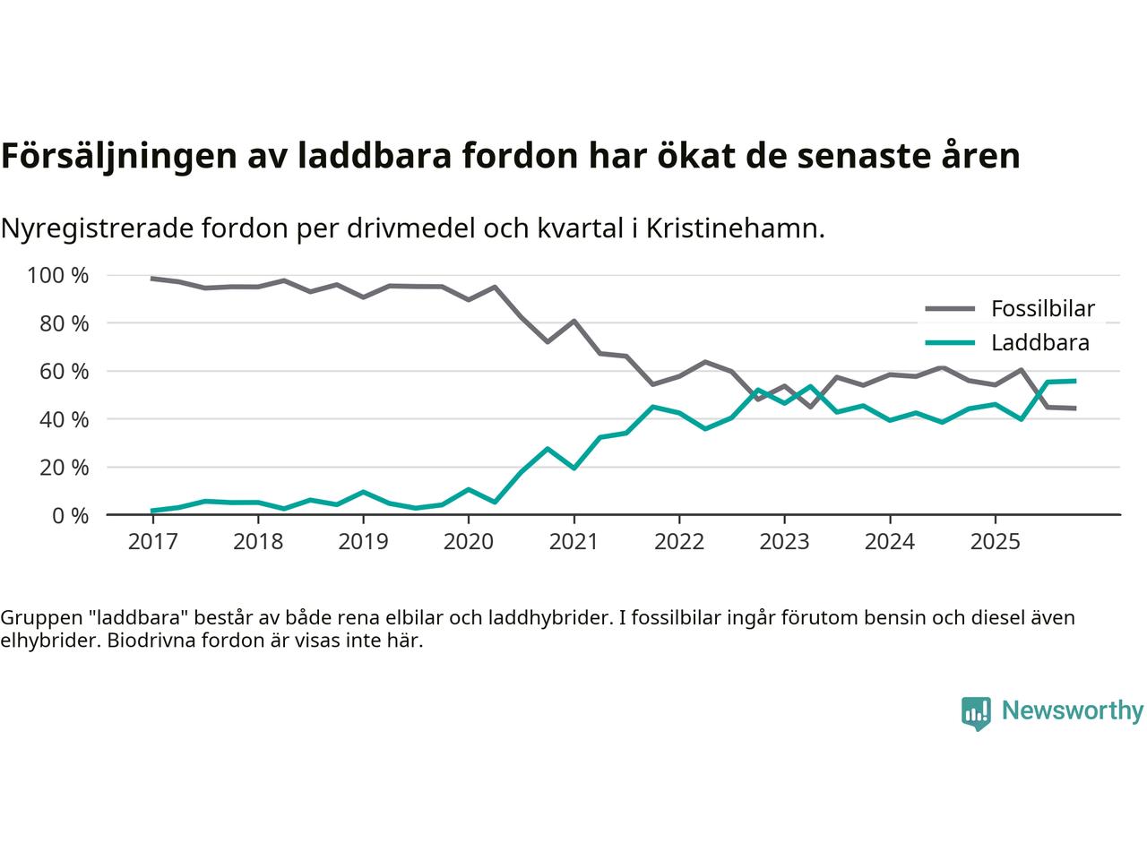 Under fjärde kvartalet 2025 var 56 procent av alla nyregistrerade personbilar i Kristinehamn laddbara (sammanlagt registrerades 115 nya bilar). Merparten av de laddbara bilarna var rena elbilar (32 procent av alla).