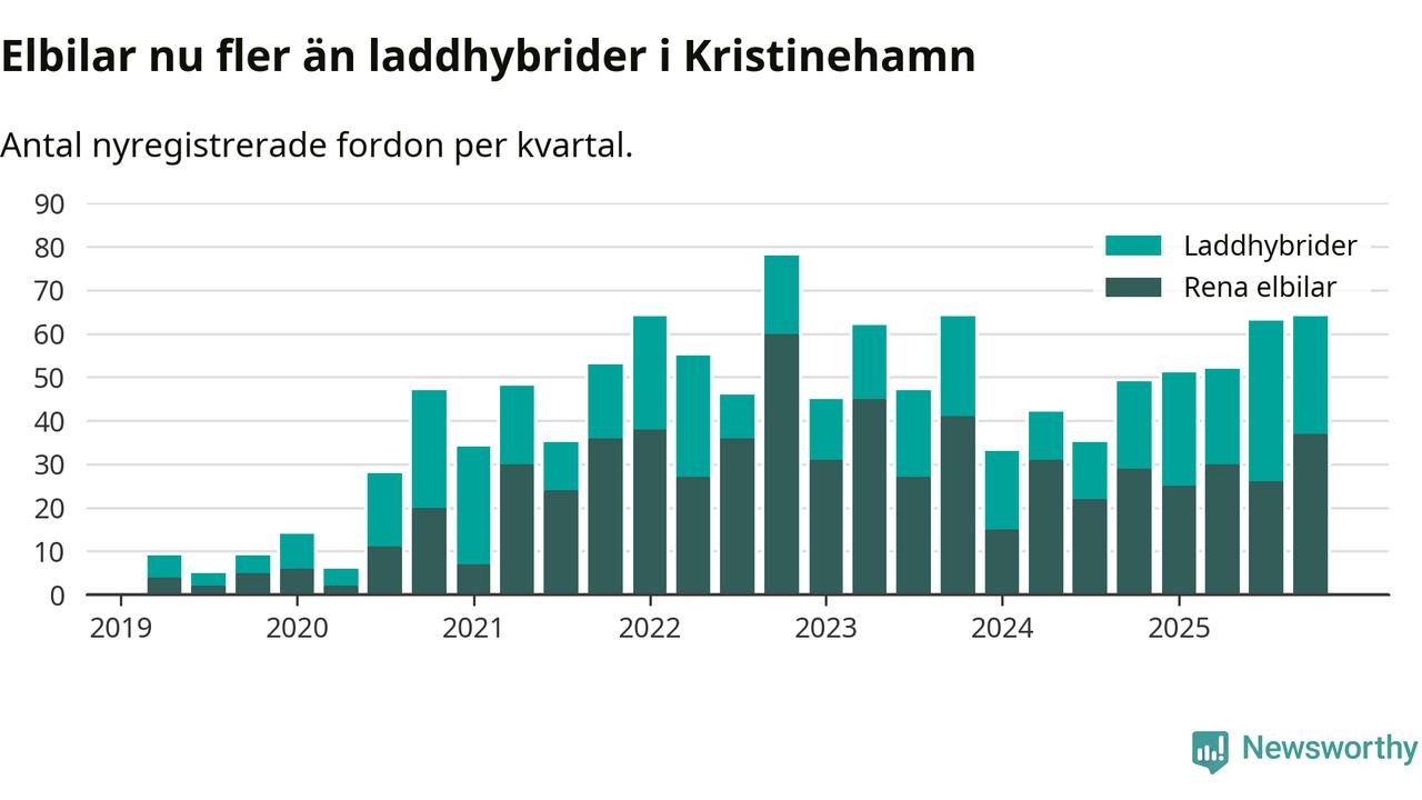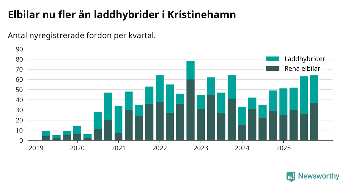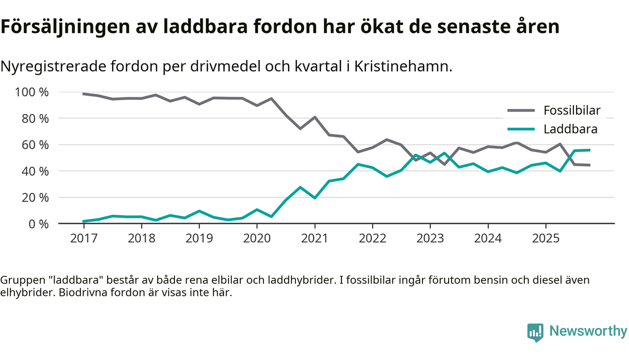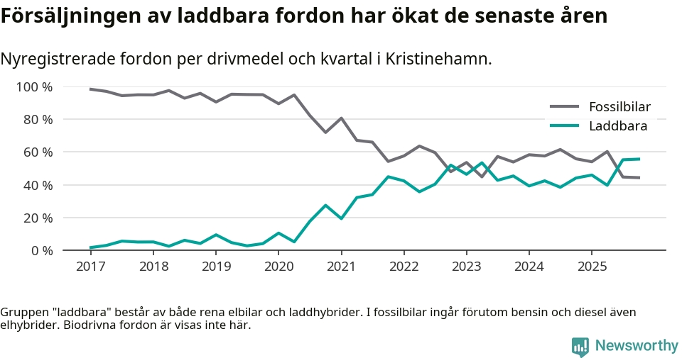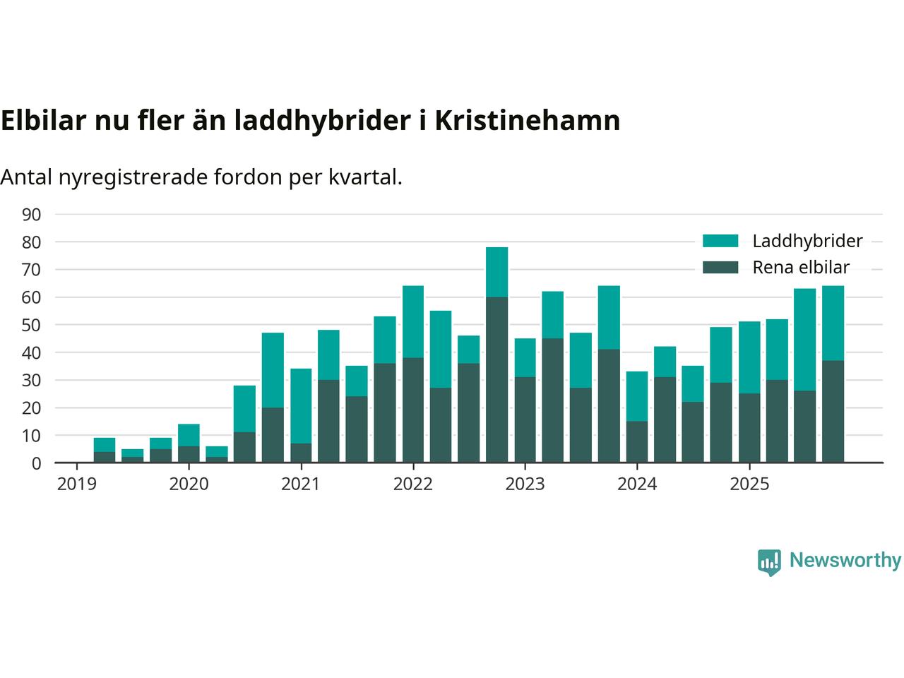 Under fjärde kvartalet 2025 var 56 procent av alla nyregistrerade personbilar i Kristinehamn laddbara (sammanlagt registrerades 115 nya bilar). Merparten av de laddbara bilarna var rena elbilar (32 procent av alla).