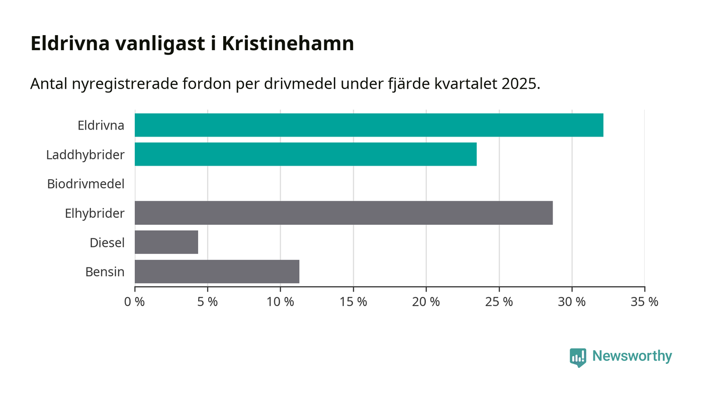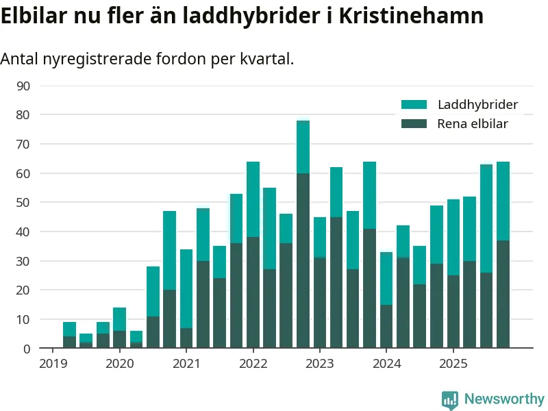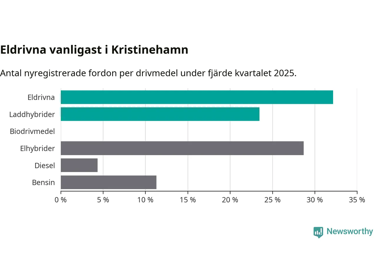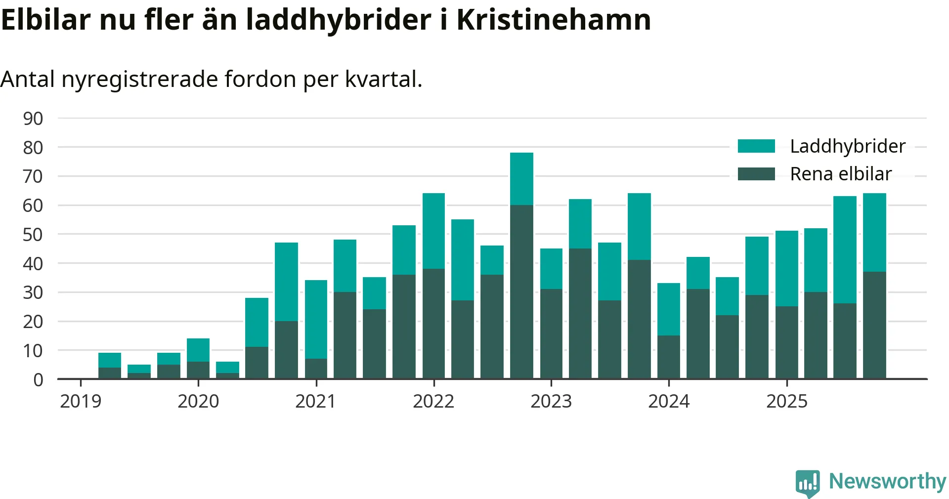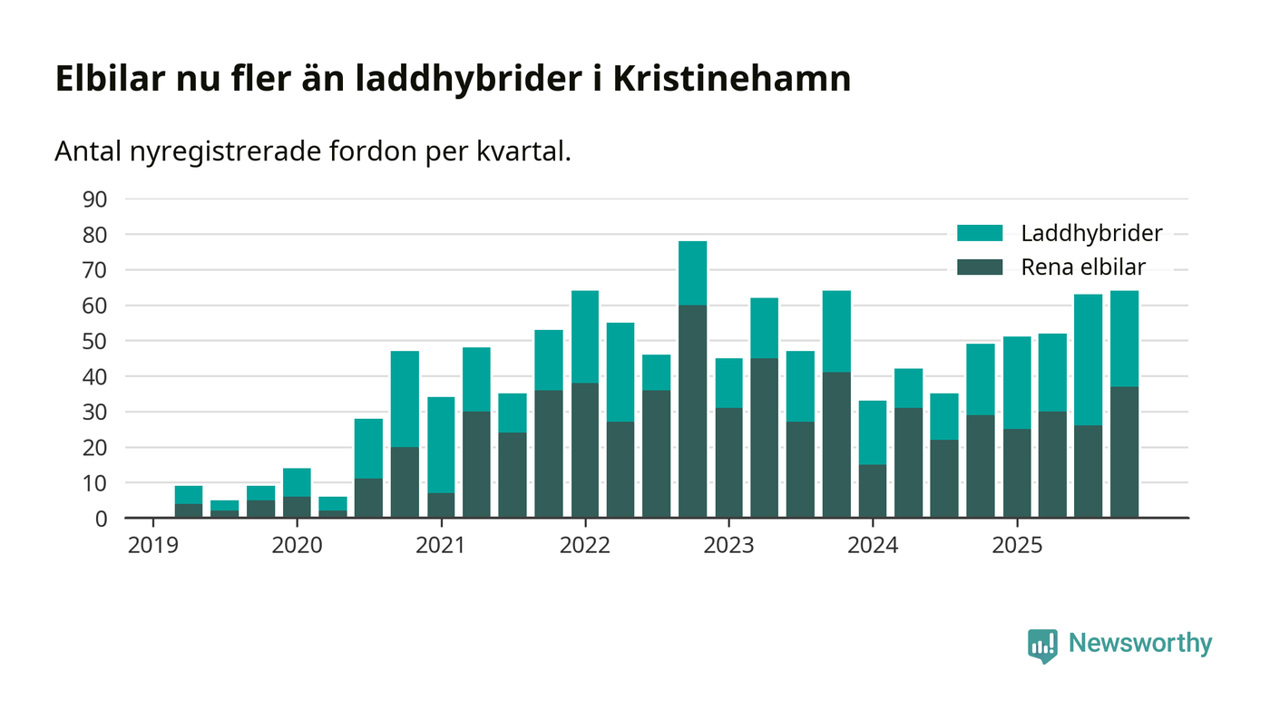 Under fjärde kvartalet 2025 var 56 procent av alla nyregistrerade personbilar i Kristinehamn laddbara (sammanlagt registrerades 115 nya bilar). Merparten av de laddbara bilarna var rena elbilar (32 procent av alla).