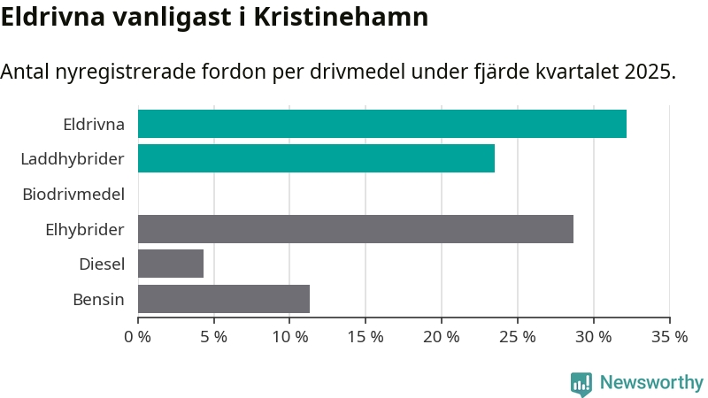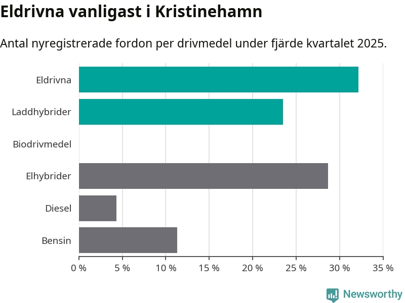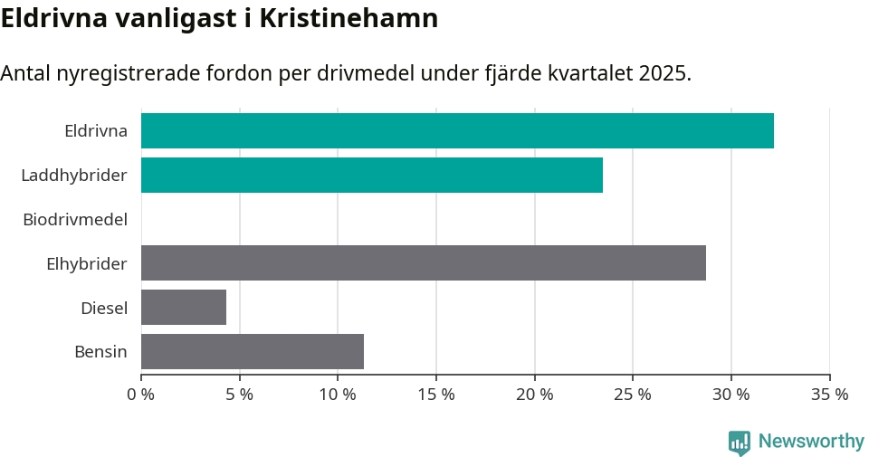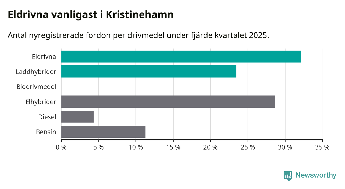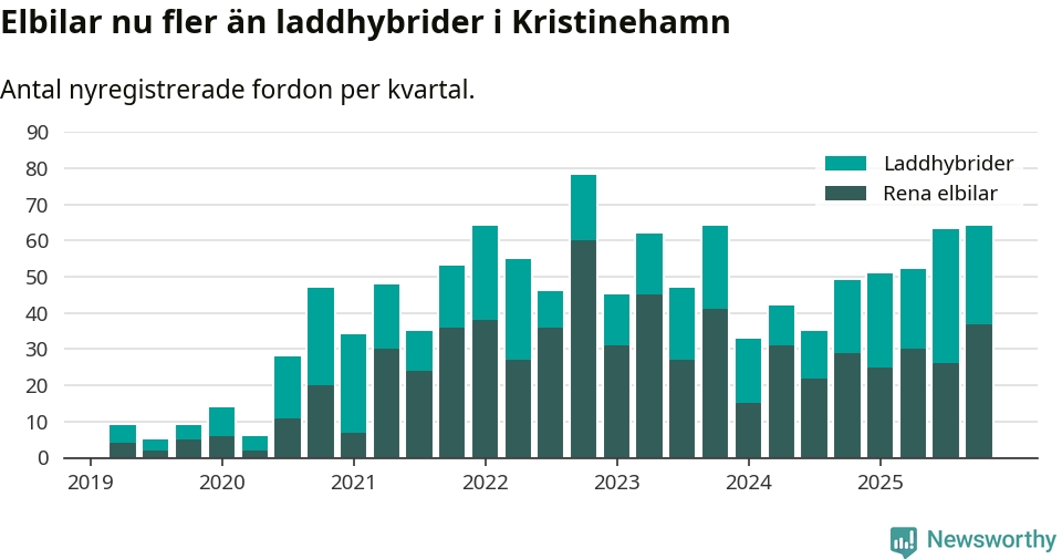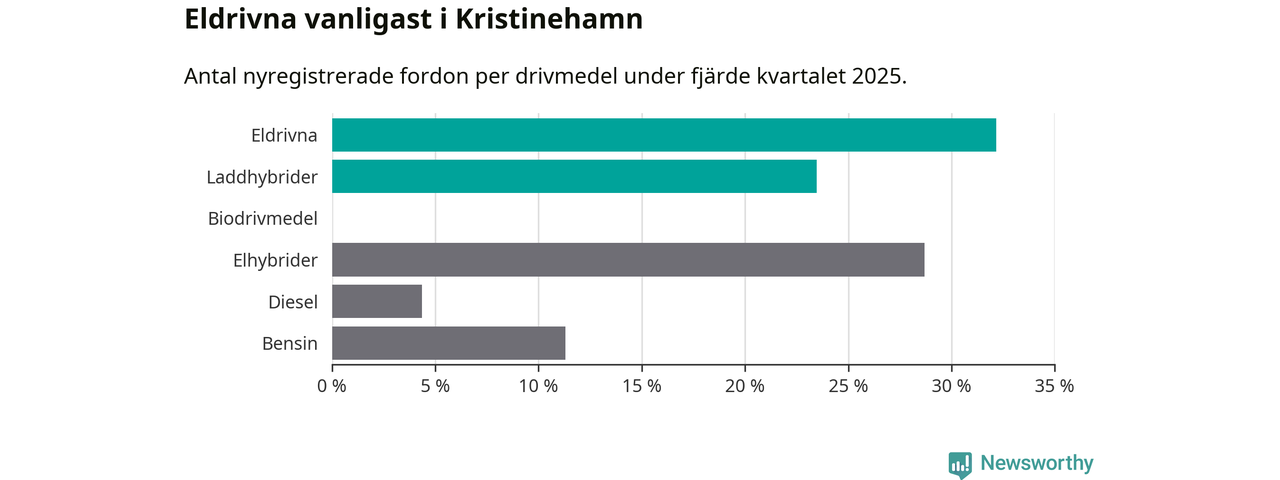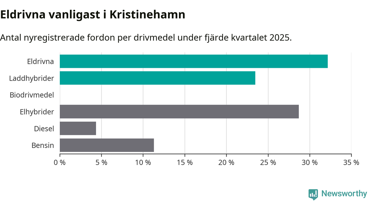 Under fjärde kvartalet 2025 var 56 procent av alla nyregistrerade personbilar i Kristinehamn laddbara (sammanlagt registrerades 115 nya bilar). Merparten av de laddbara bilarna var rena elbilar (32 procent av alla).