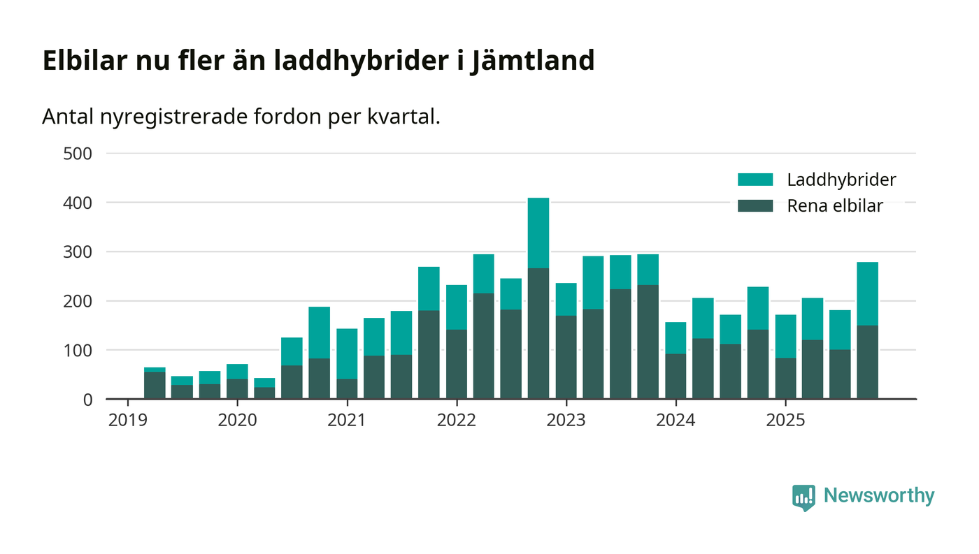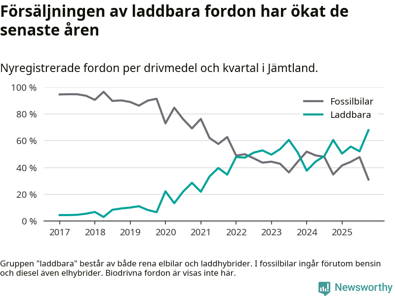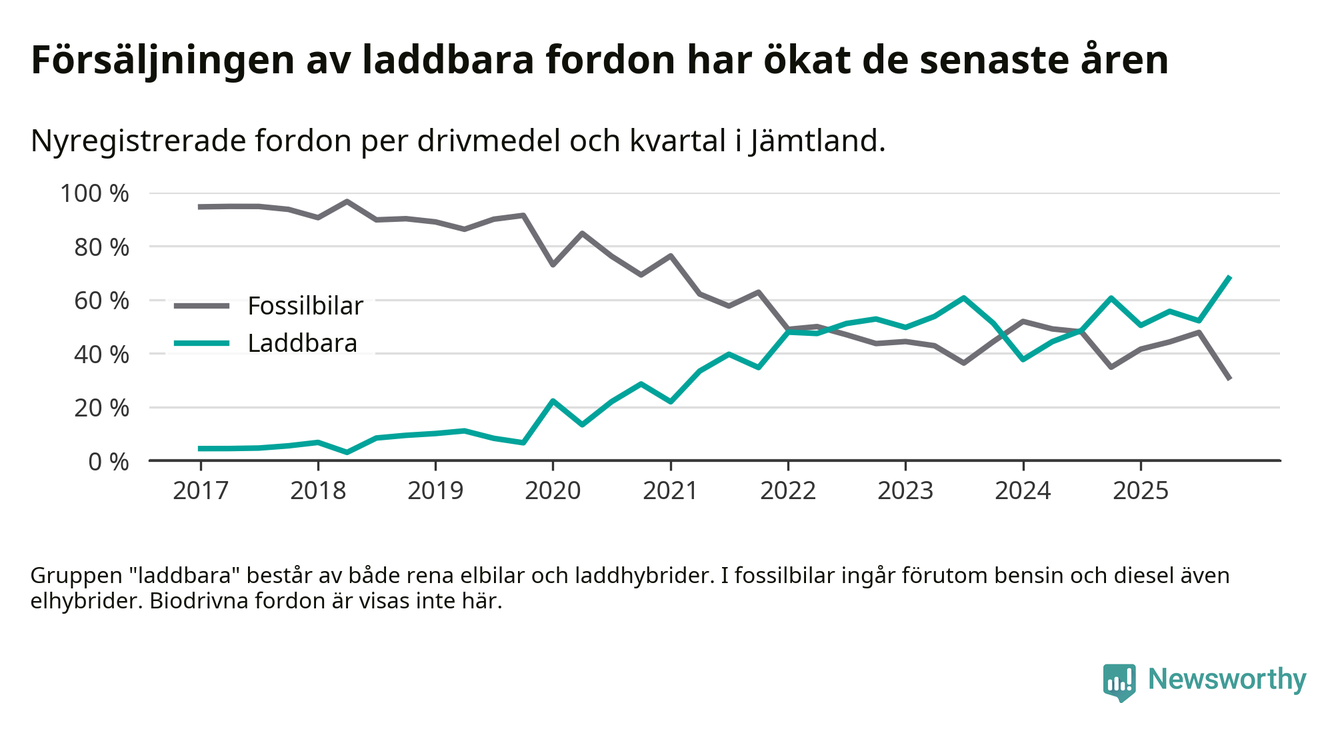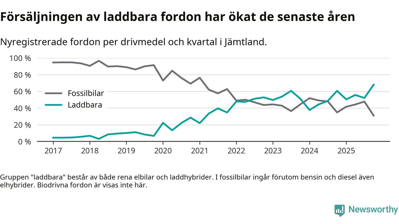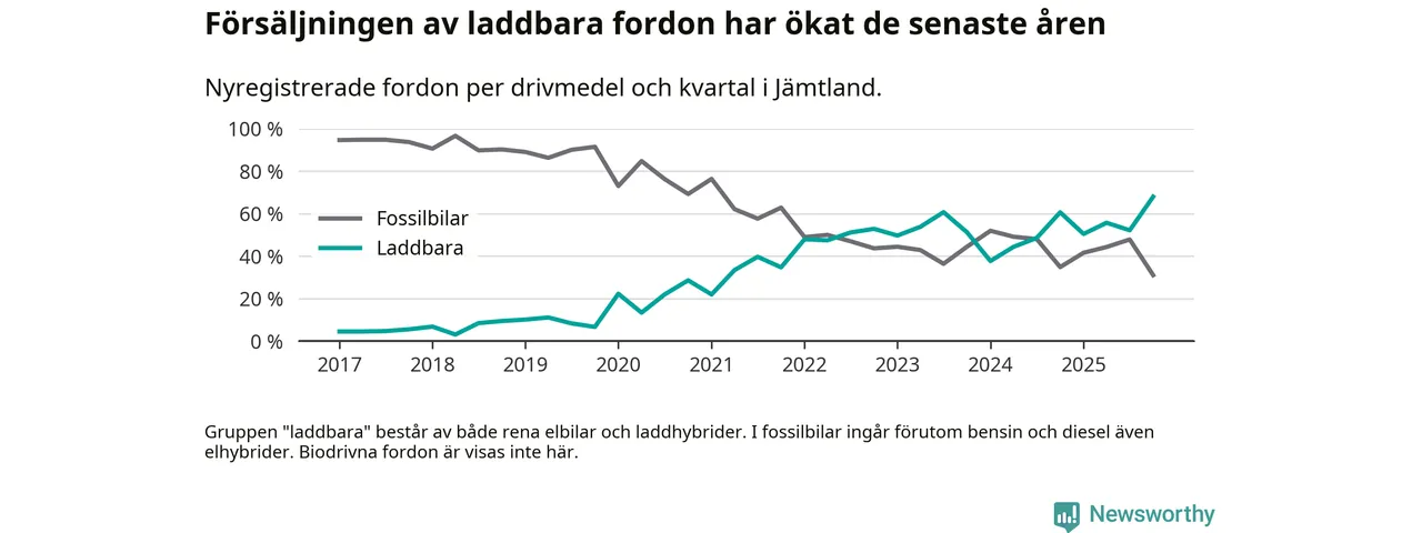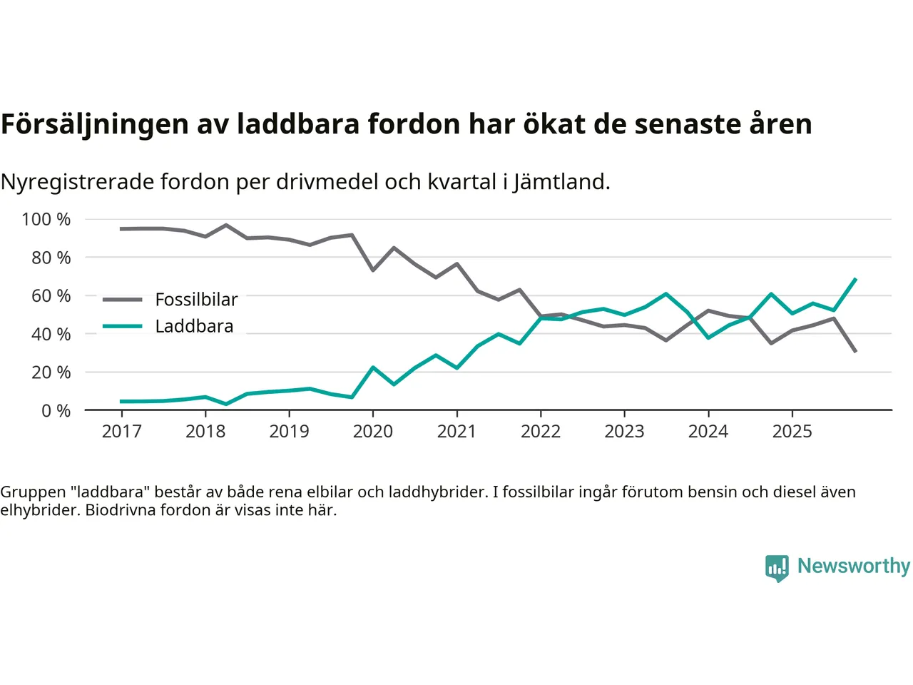 Under fjärde kvartalet 2025 var 68 procent av alla nyregistrerade personbilar i Jämtland laddbara (sammanlagt registrerades 409 nya bilar). Merparten av de laddbara bilarna var rena elbilar (36 procent av alla).