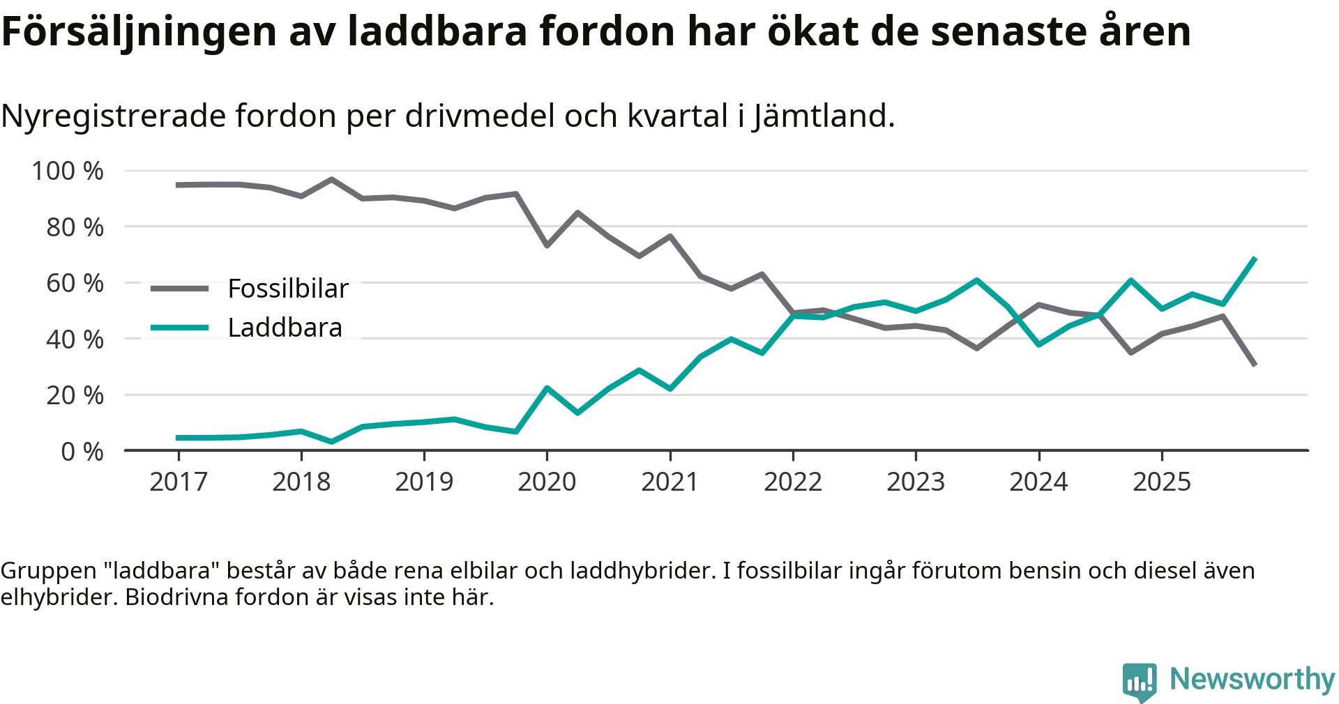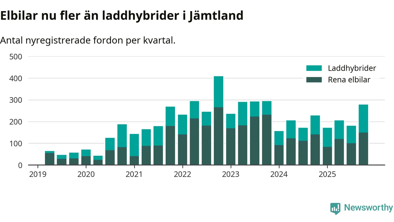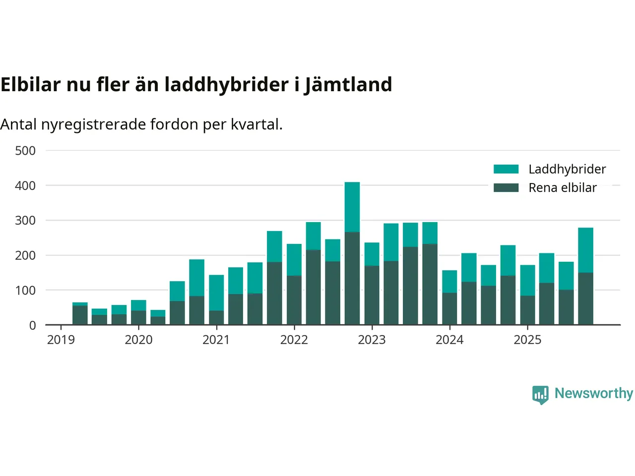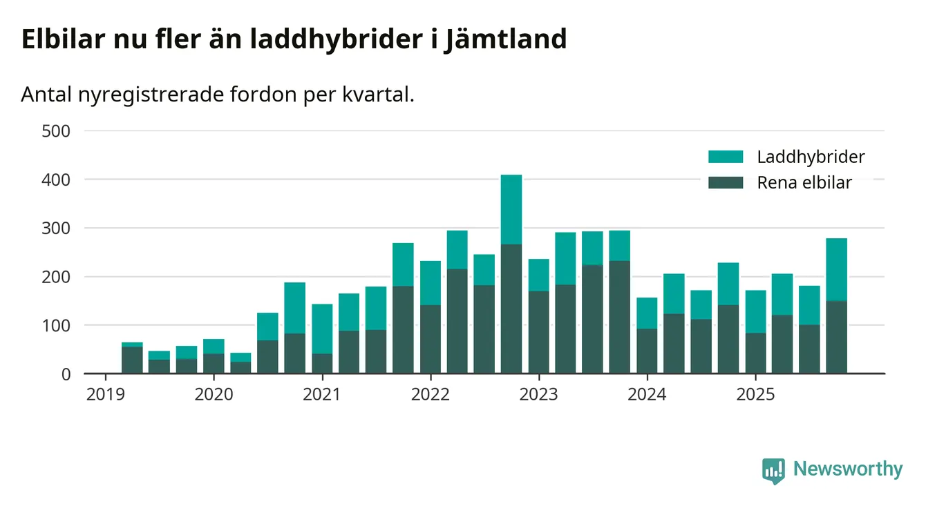 Under fjärde kvartalet 2025 var 68 procent av alla nyregistrerade personbilar i Jämtland laddbara (sammanlagt registrerades 409 nya bilar). Merparten av de laddbara bilarna var rena elbilar (36 procent av alla).