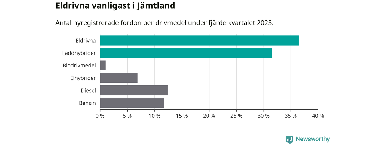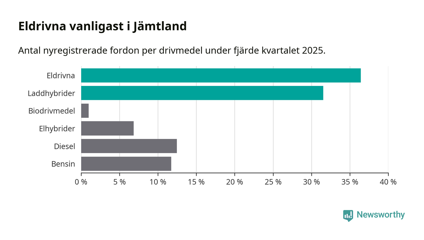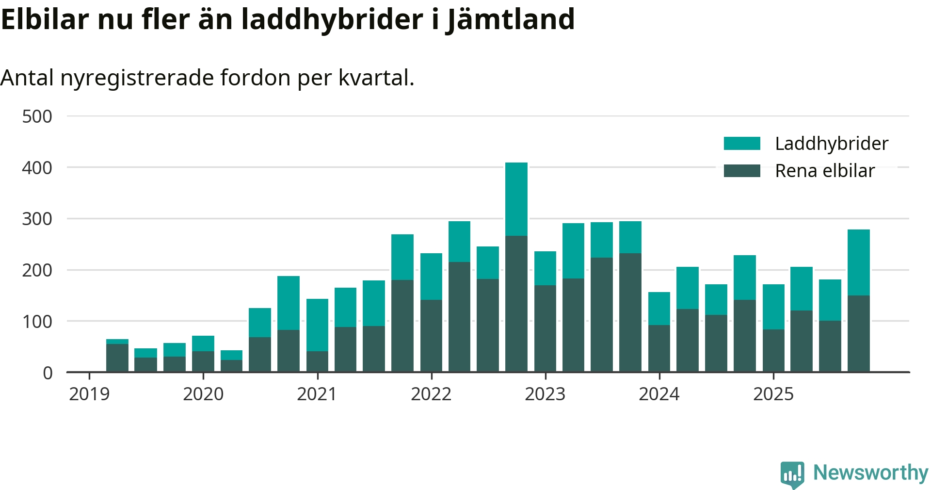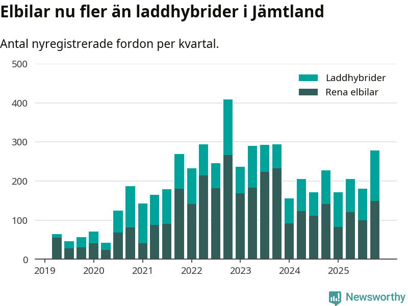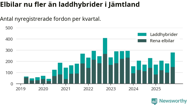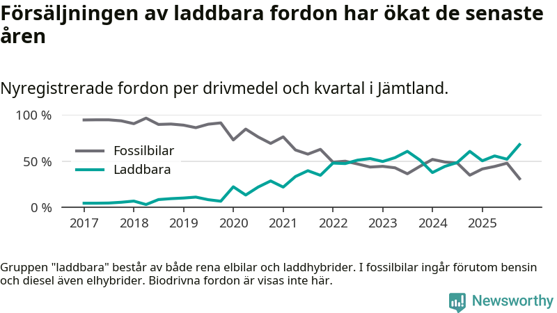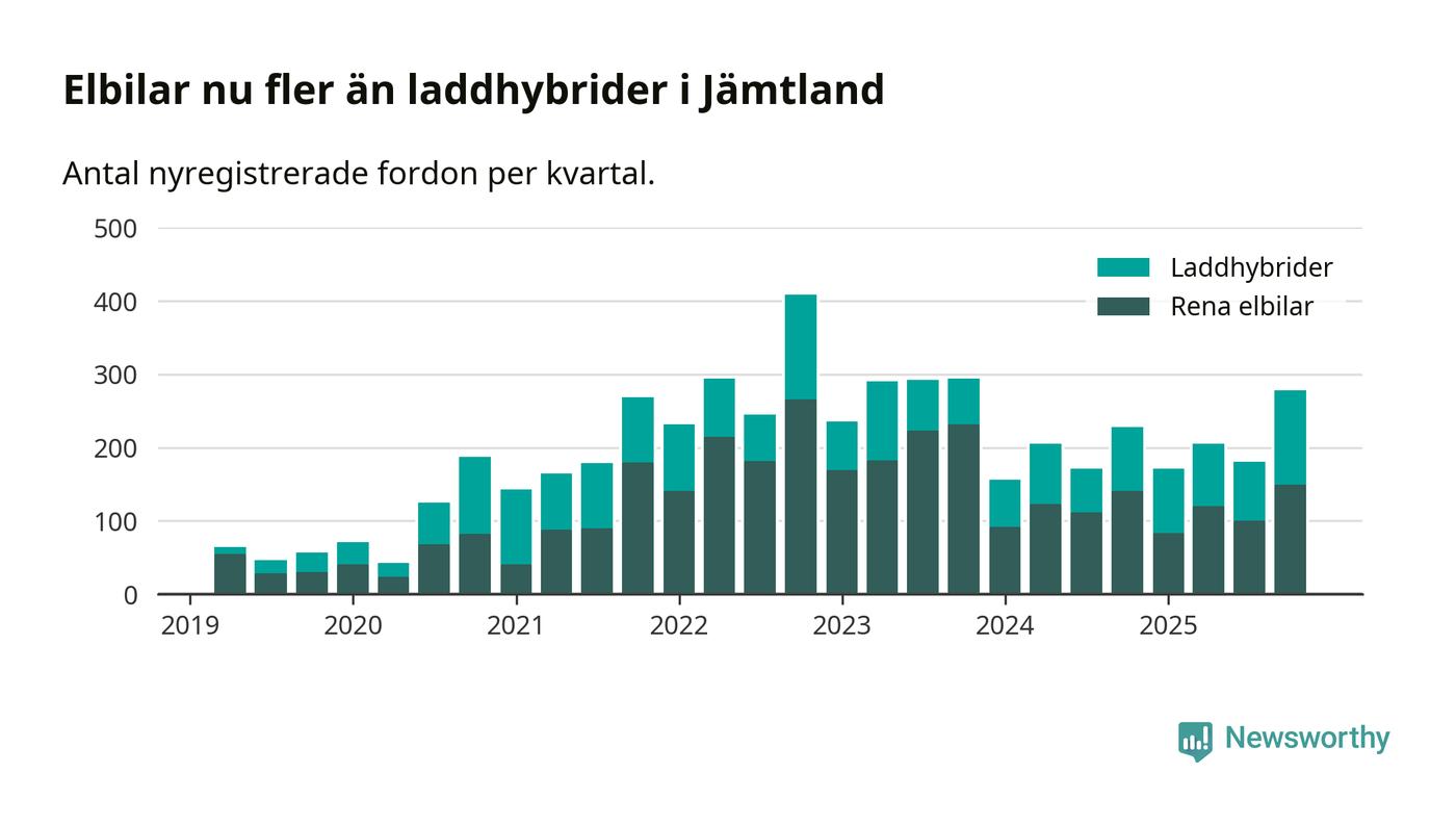 Under fjärde kvartalet 2025 var 68 procent av alla nyregistrerade personbilar i Jämtland laddbara (sammanlagt registrerades 409 nya bilar). Merparten av de laddbara bilarna var rena elbilar (36 procent av alla).