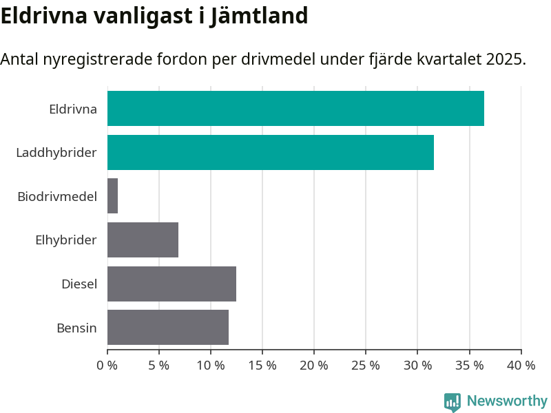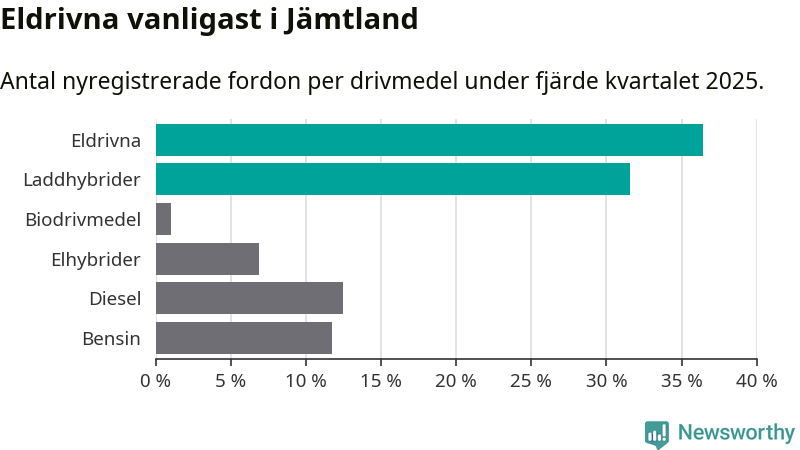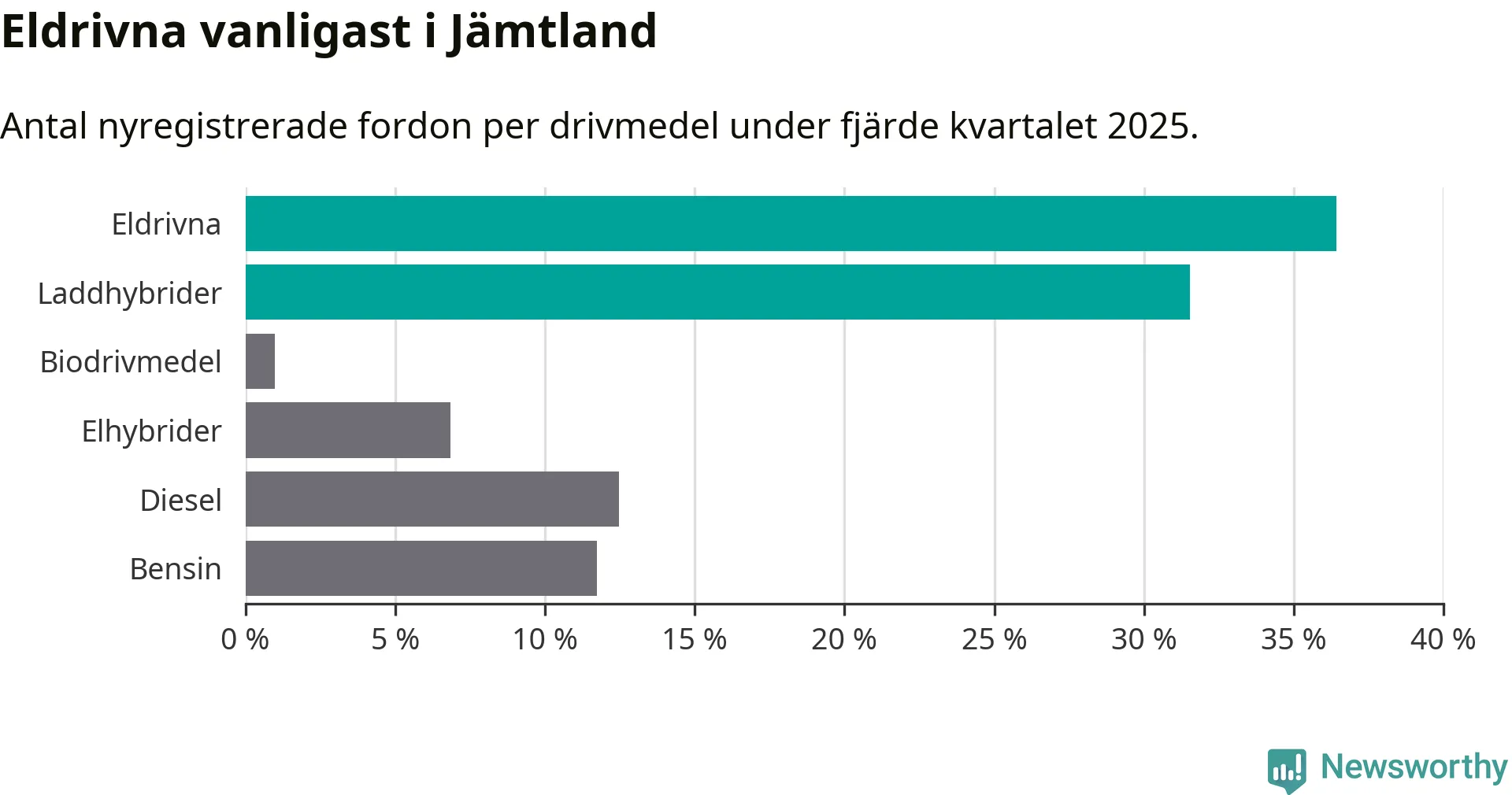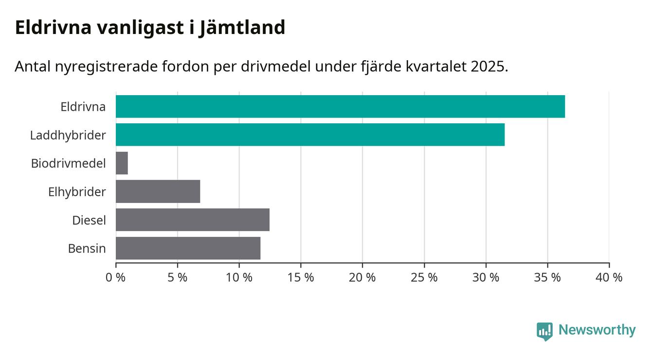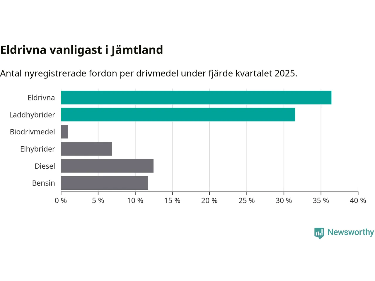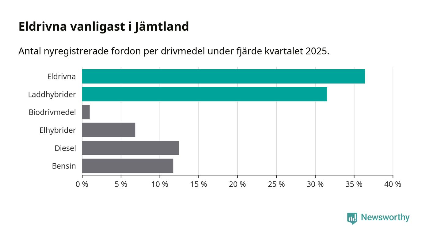 Under fjärde kvartalet 2025 var 68 procent av alla nyregistrerade personbilar i Jämtland laddbara (sammanlagt registrerades 409 nya bilar). Merparten av de laddbara bilarna var rena elbilar (36 procent av alla).