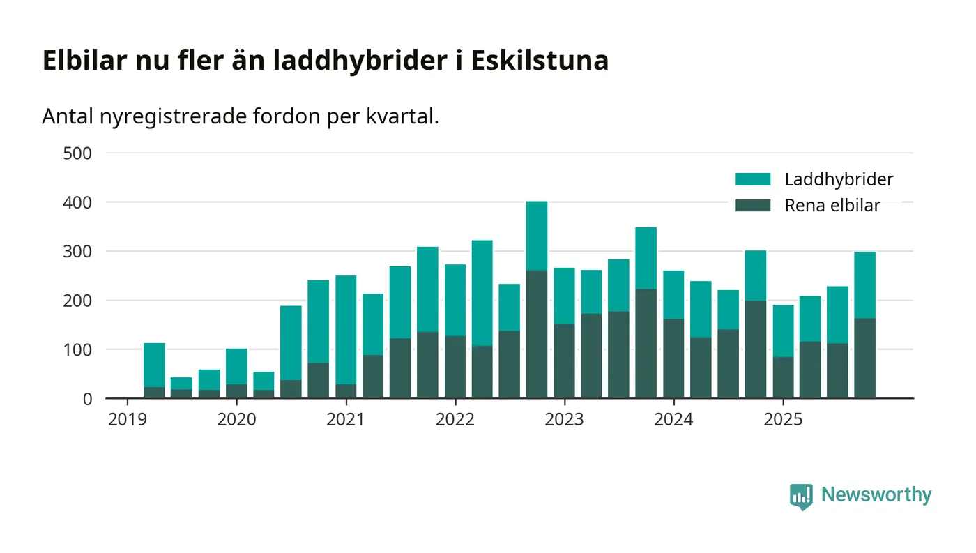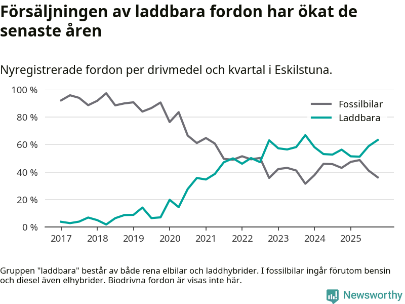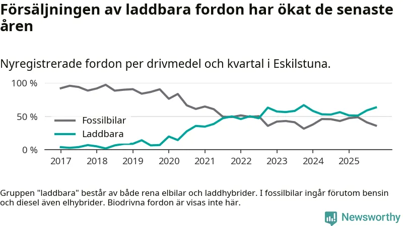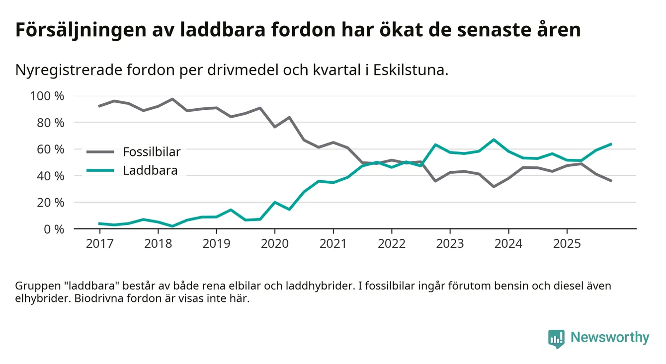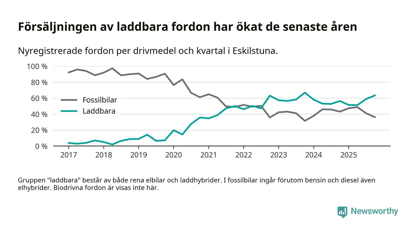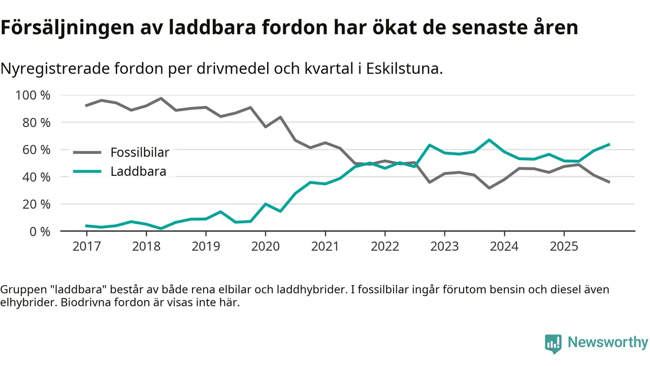 Under fjärde kvartalet 2025 var 63 procent av alla nyregistrerade personbilar i Eskilstuna laddbara (sammanlagt registrerades 470 nya bilar). Merparten av de laddbara bilarna var rena elbilar (35 procent av alla).
