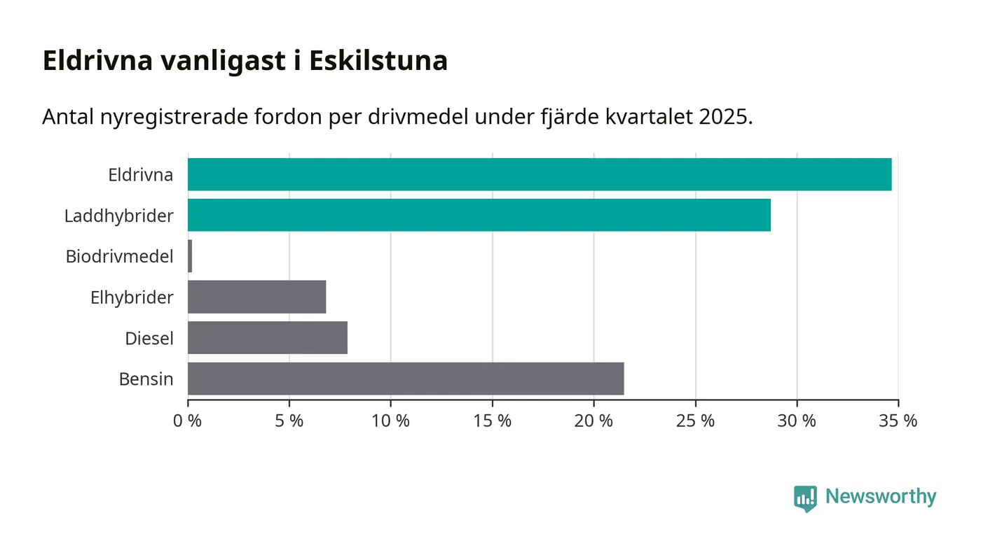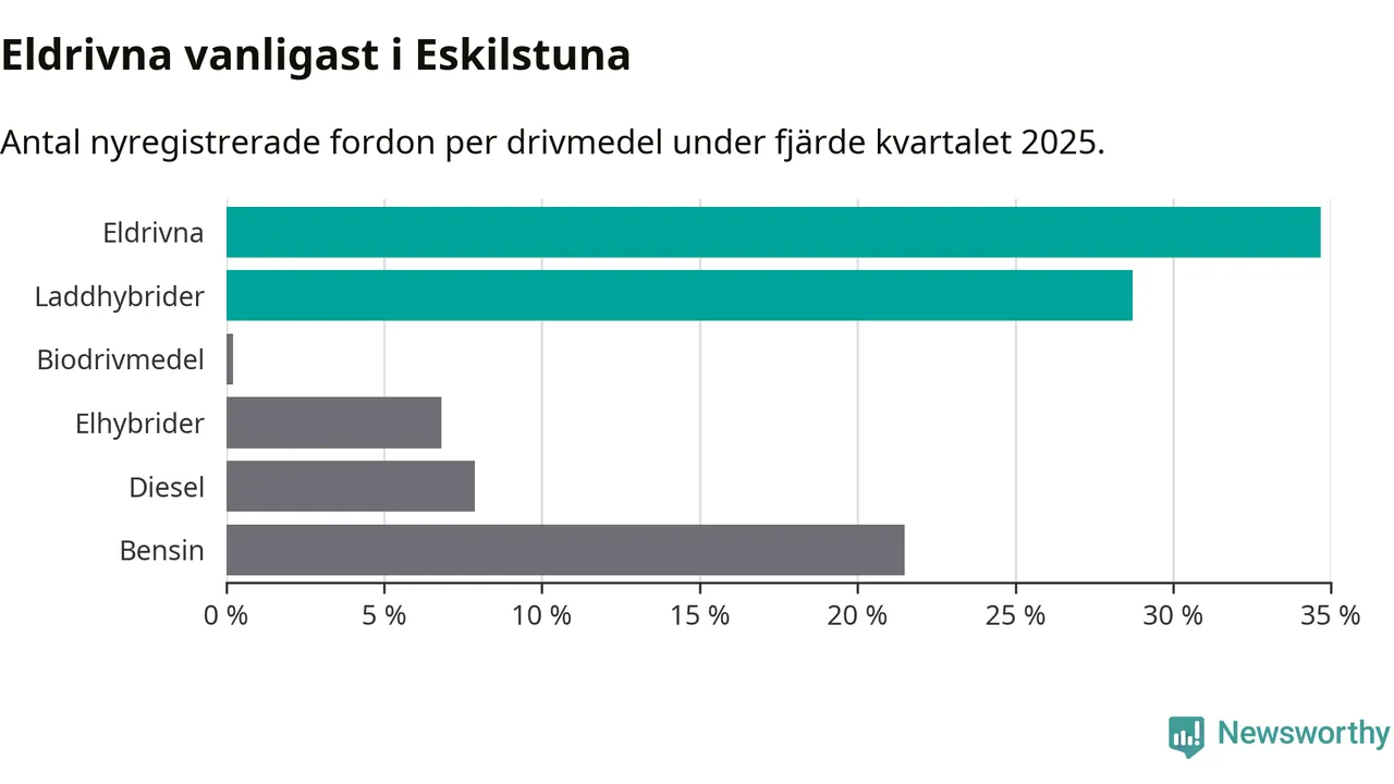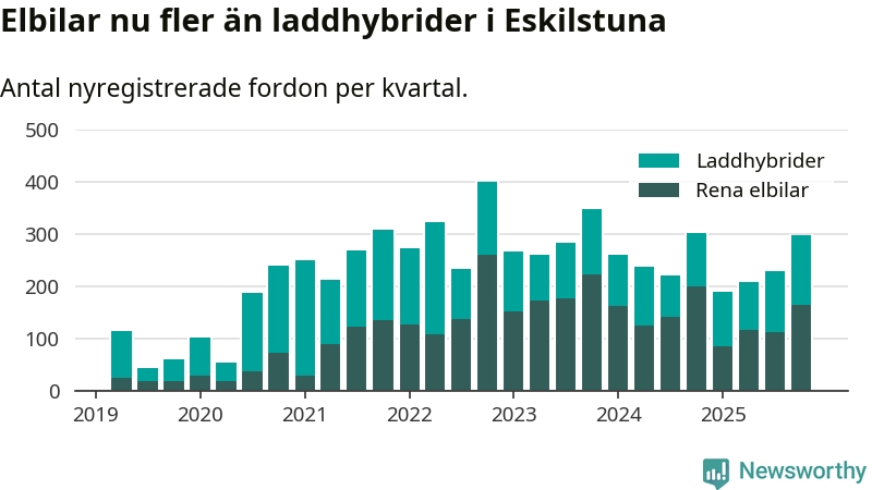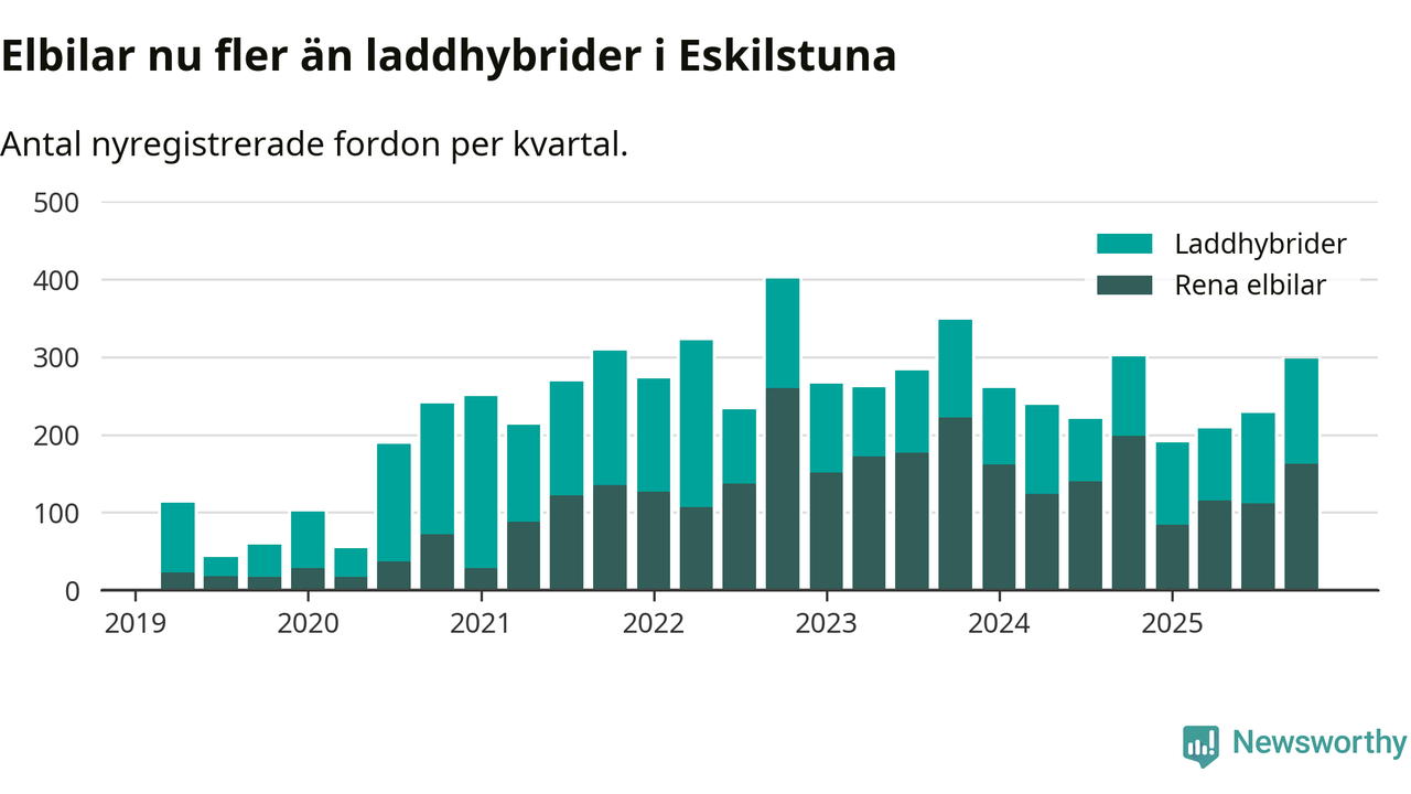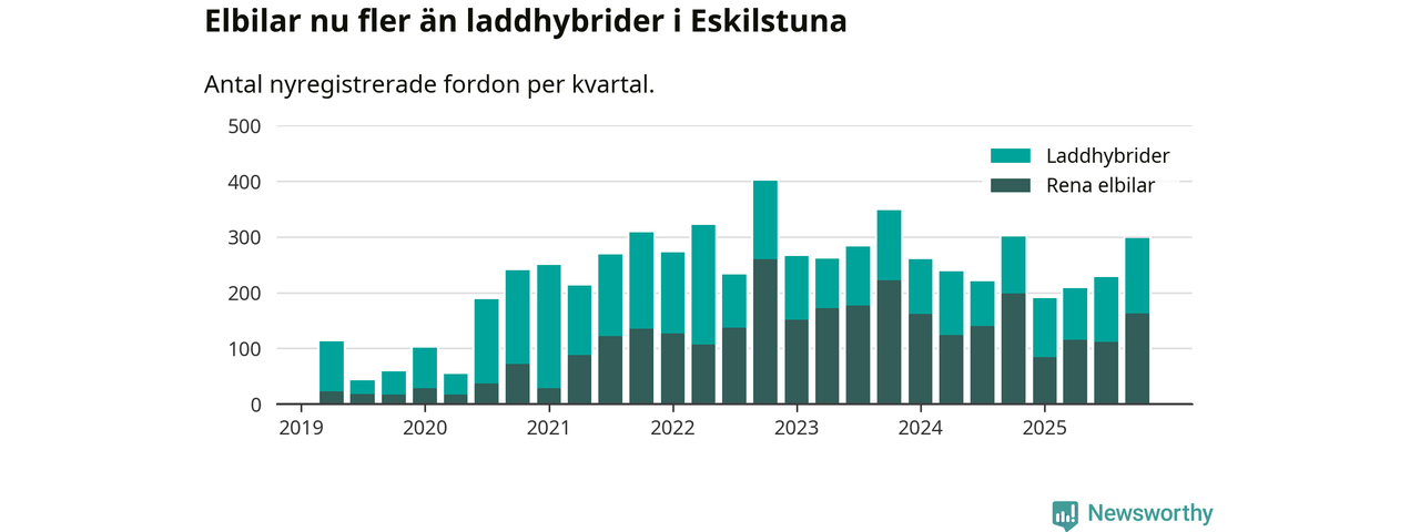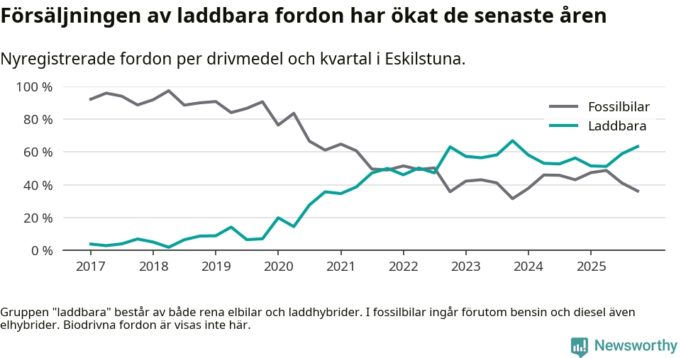 Under fjärde kvartalet 2025 var 63 procent av alla nyregistrerade personbilar i Eskilstuna laddbara (sammanlagt registrerades 470 nya bilar). Merparten av de laddbara bilarna var rena elbilar (35 procent av alla).