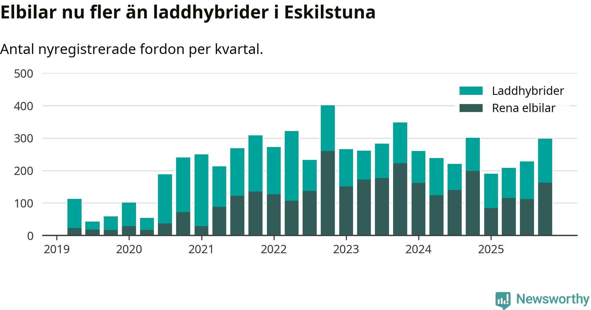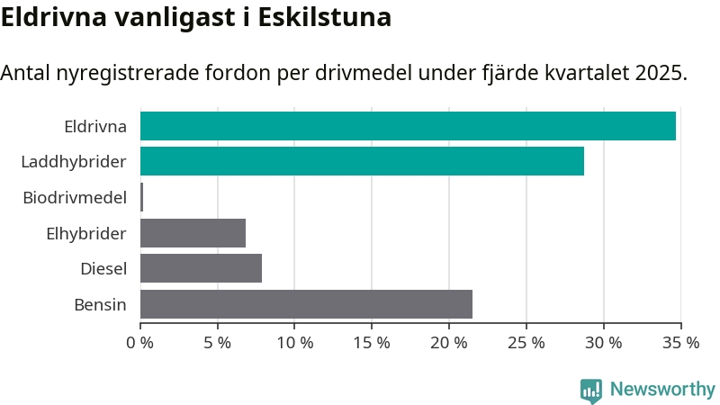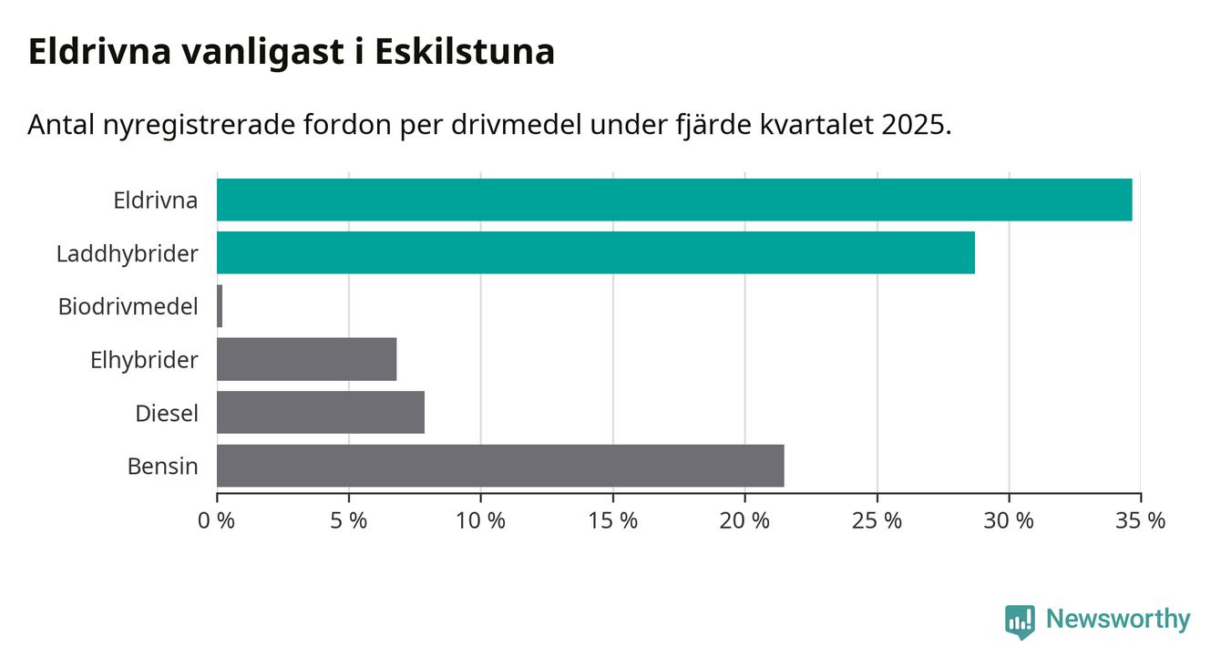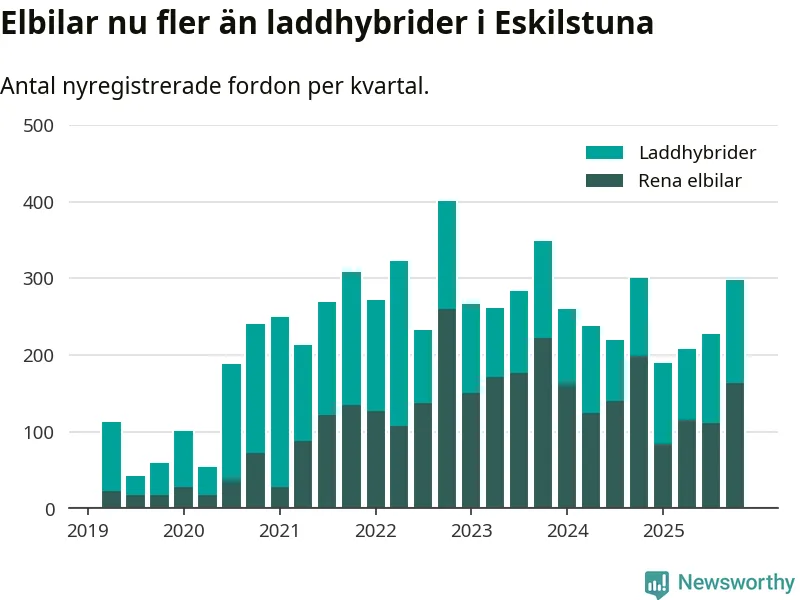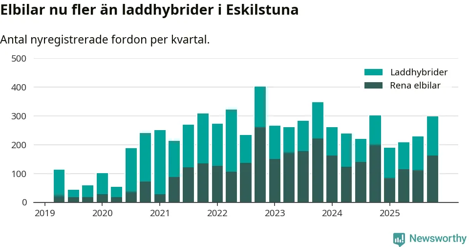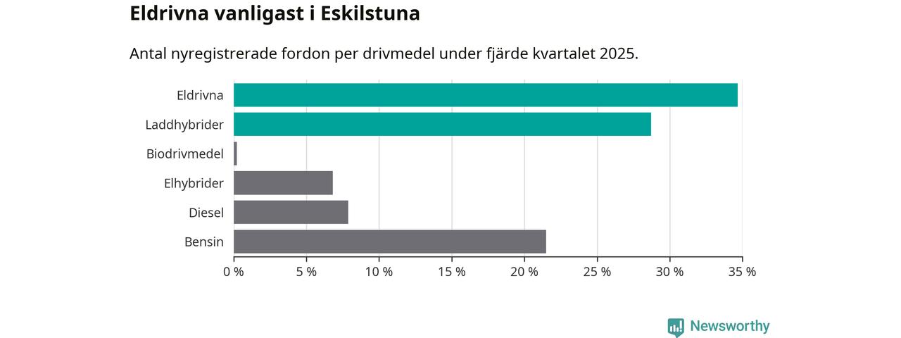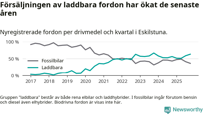 Under fjärde kvartalet 2025 var 63 procent av alla nyregistrerade personbilar i Eskilstuna laddbara (sammanlagt registrerades 470 nya bilar). Merparten av de laddbara bilarna var rena elbilar (35 procent av alla).