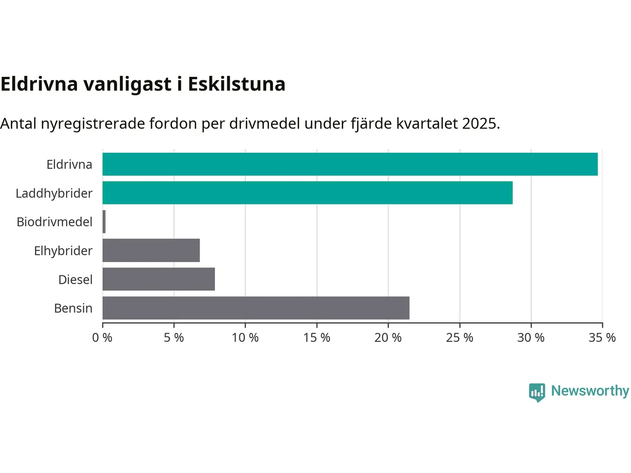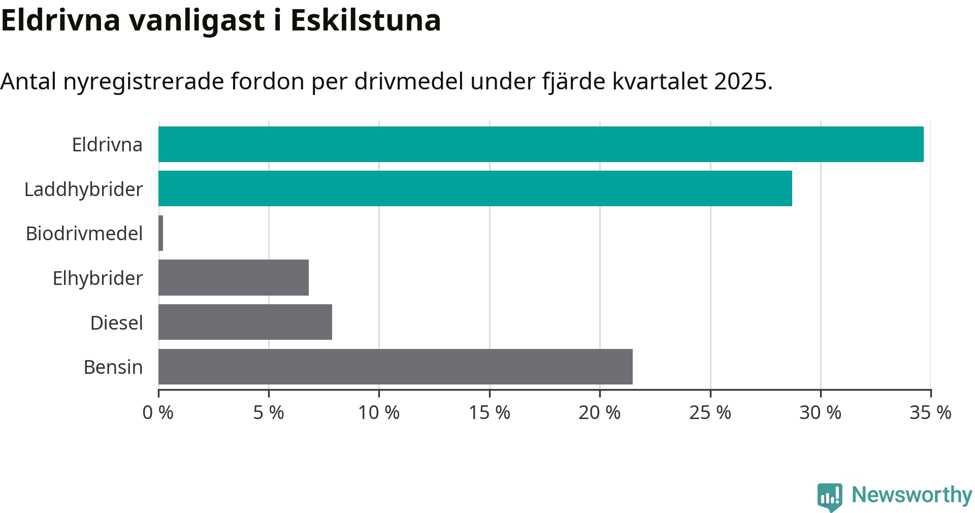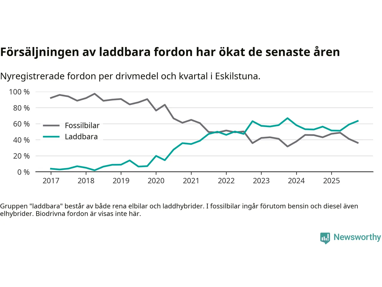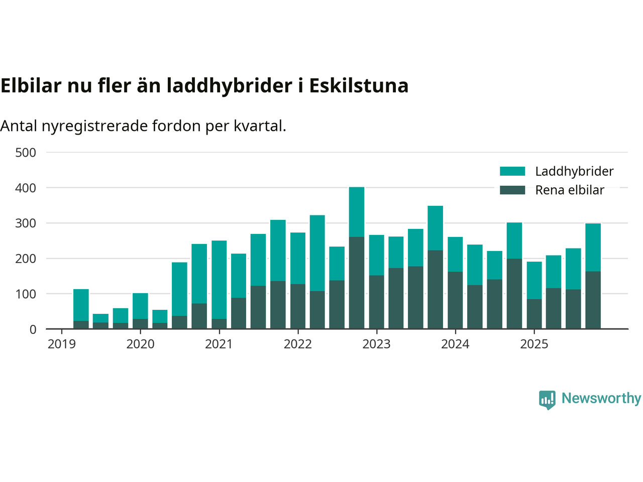 Under fjärde kvartalet 2025 var 63 procent av alla nyregistrerade personbilar i Eskilstuna laddbara (sammanlagt registrerades 470 nya bilar). Merparten av de laddbara bilarna var rena elbilar (35 procent av alla).