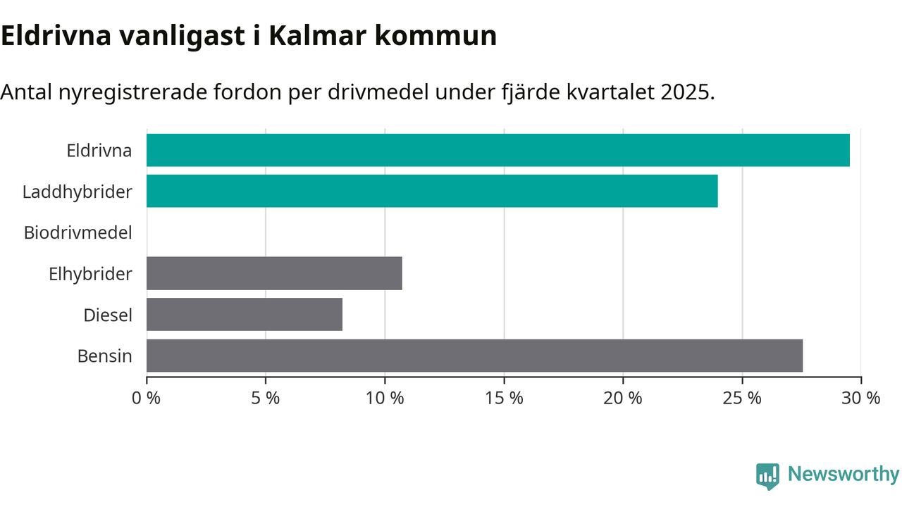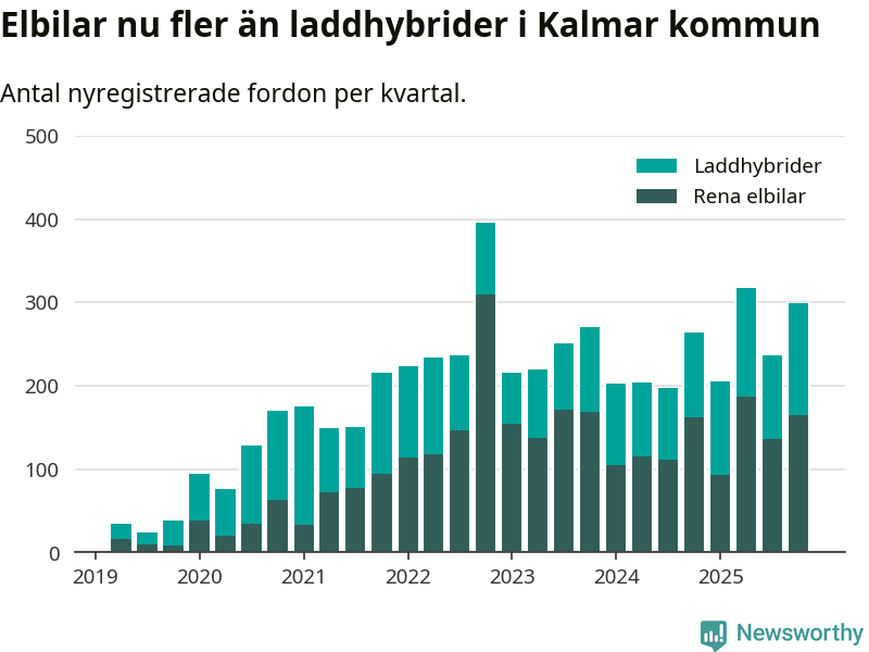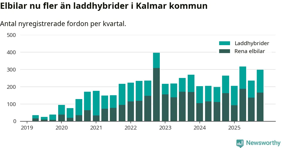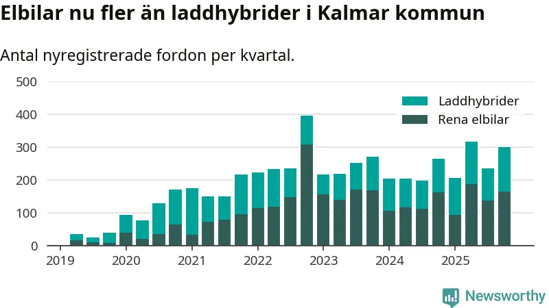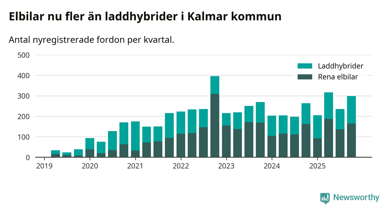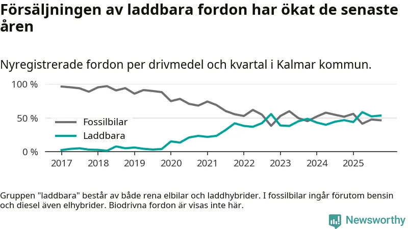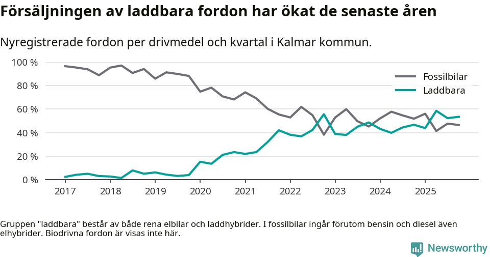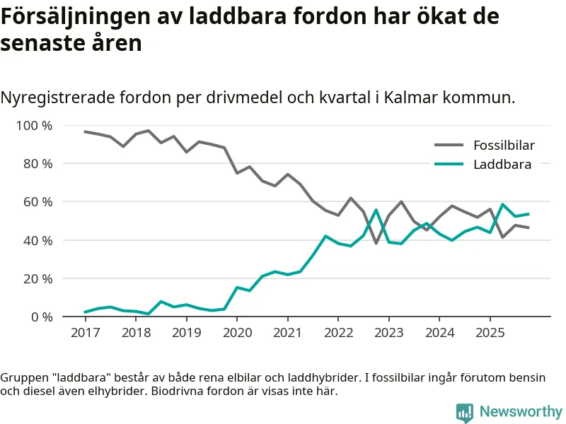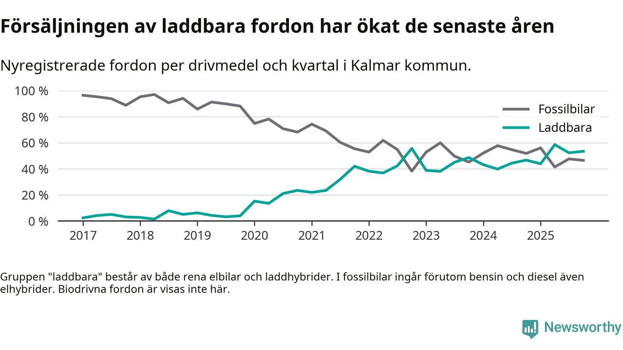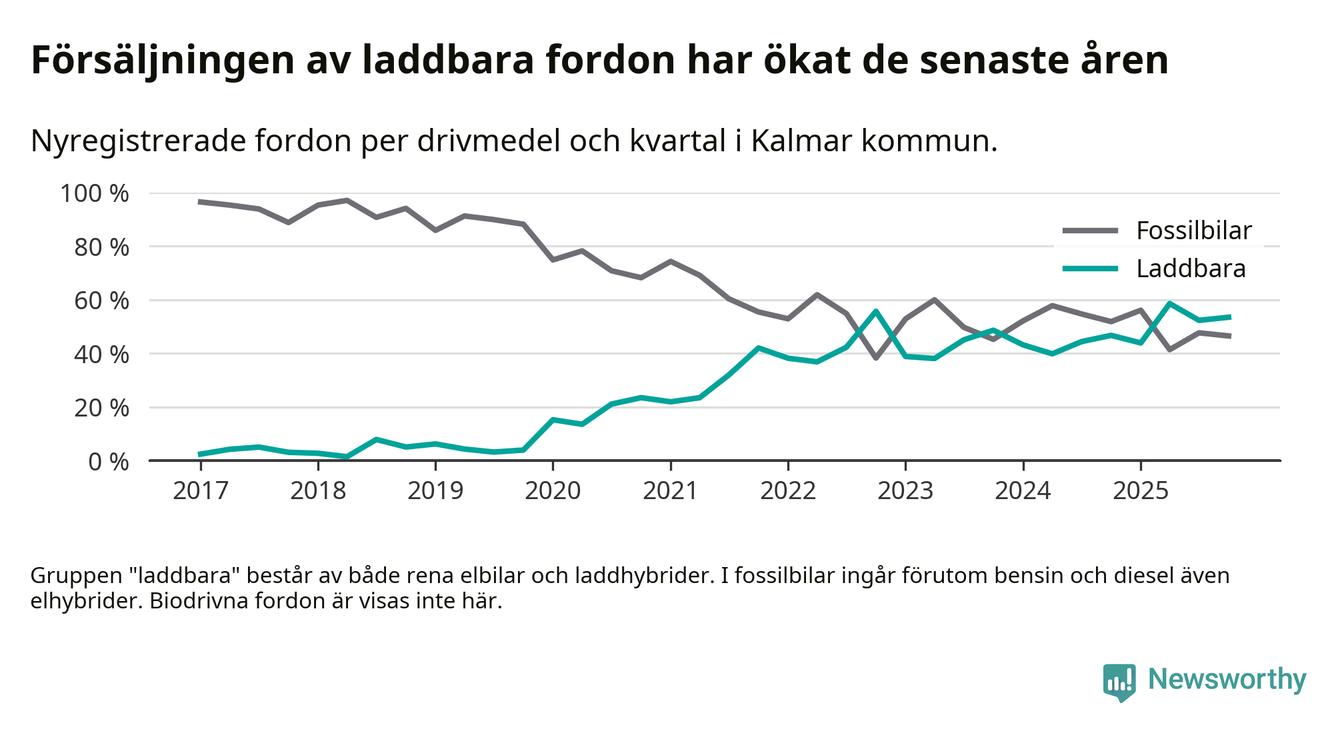 Under fjärde kvartalet 2025 var 53 procent av alla nyregistrerade personbilar i Kalmar kommun laddbara (sammanlagt registrerades 559 nya bilar). Merparten av de laddbara bilarna var rena elbilar (30 procent av alla).