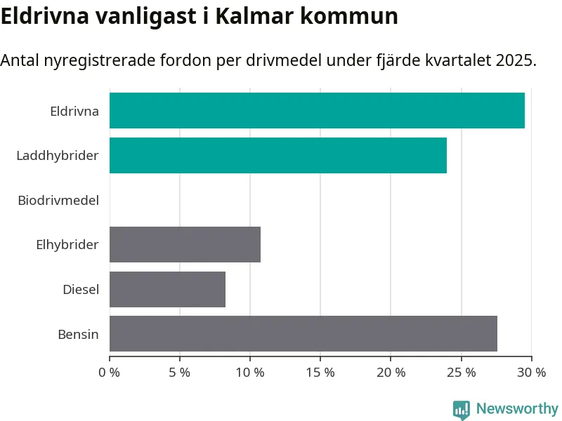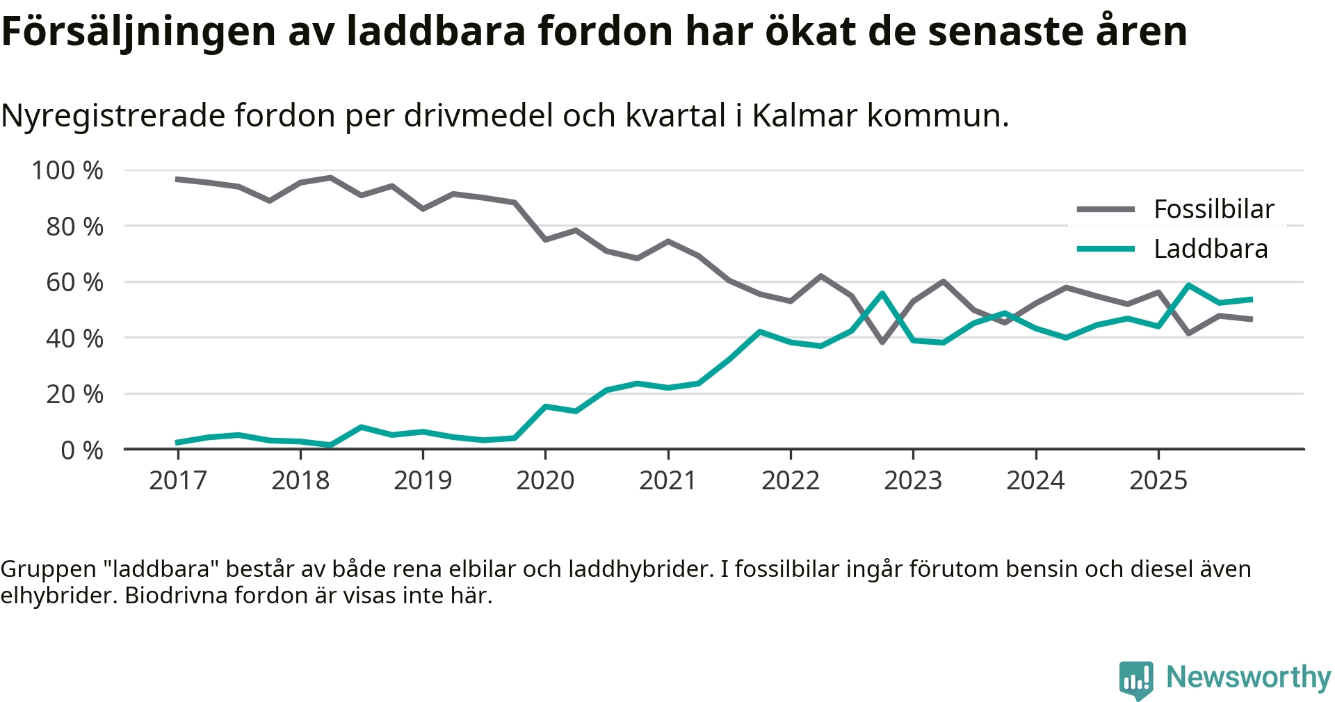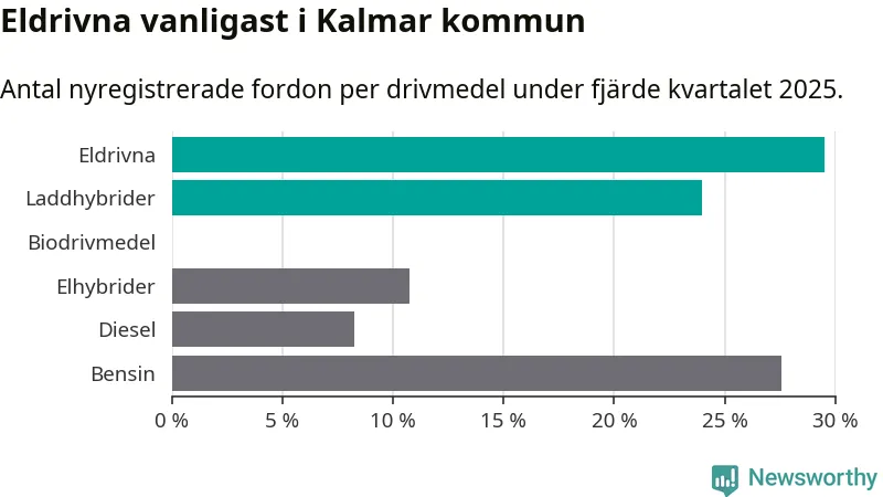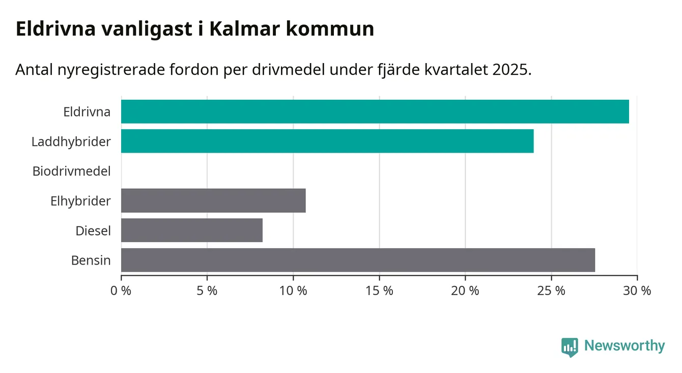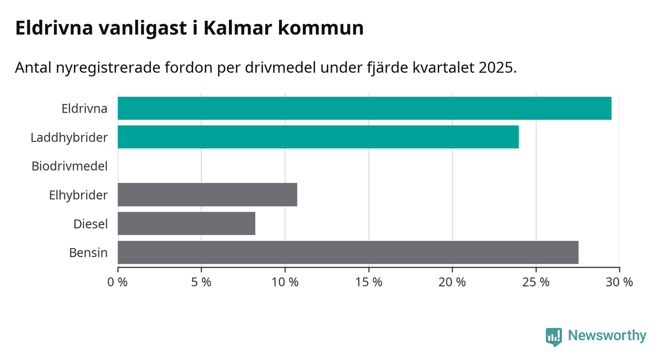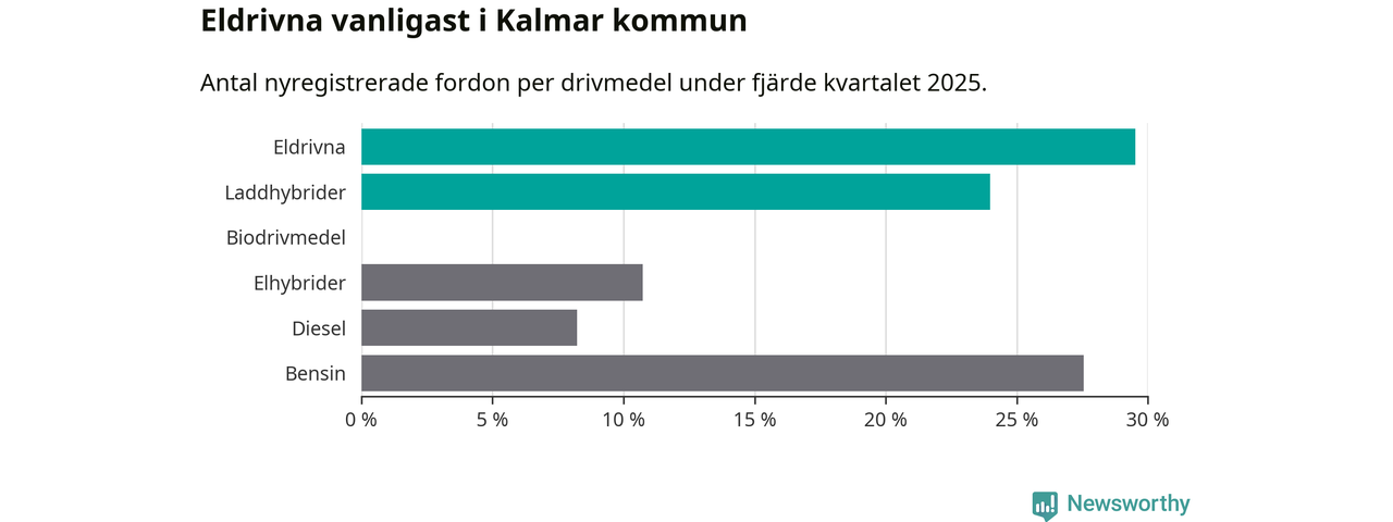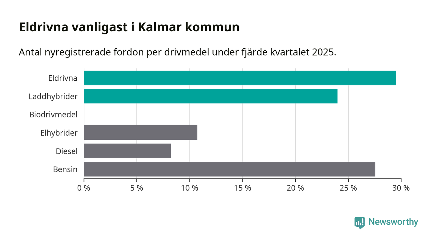 Under fjärde kvartalet 2025 var 53 procent av alla nyregistrerade personbilar i Kalmar kommun laddbara (sammanlagt registrerades 559 nya bilar). Merparten av de laddbara bilarna var rena elbilar (30 procent av alla).