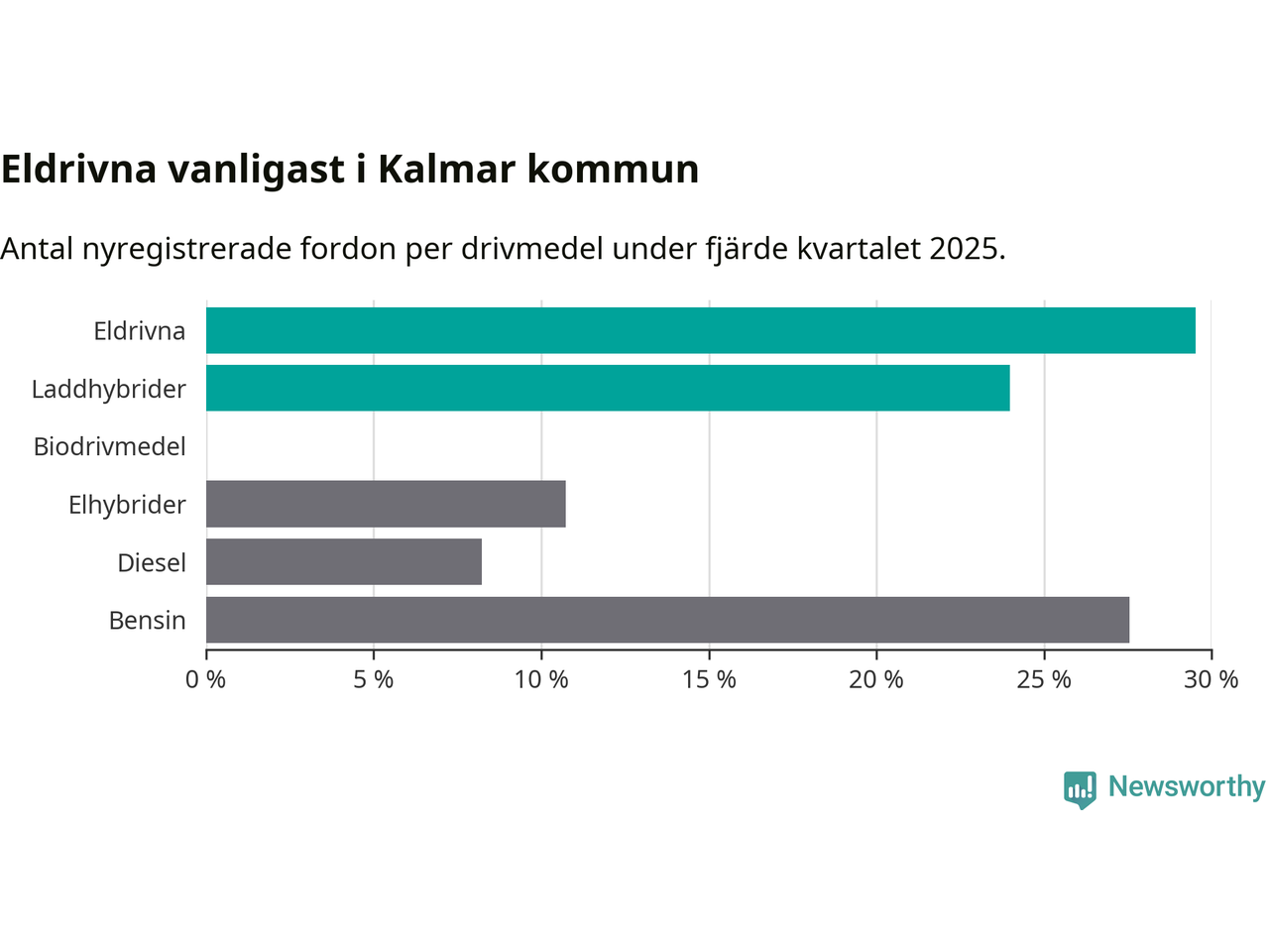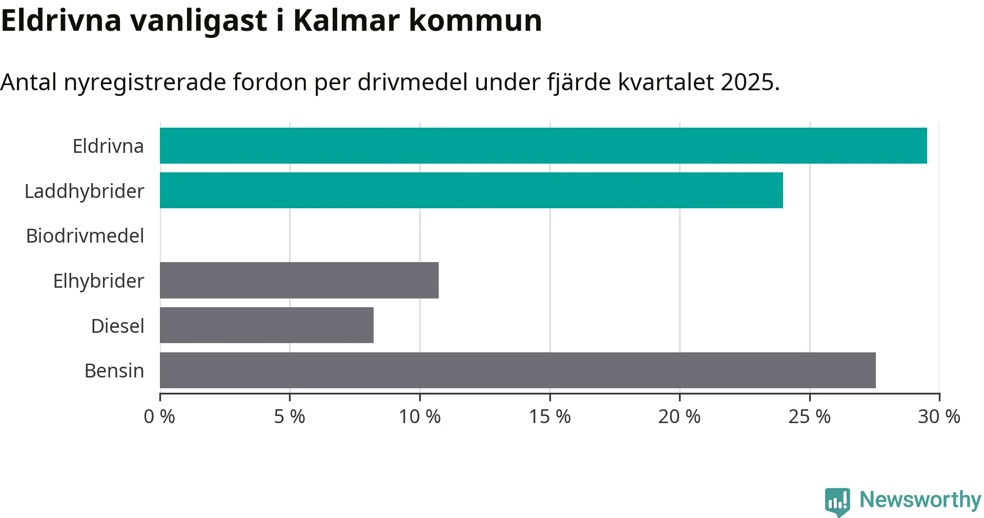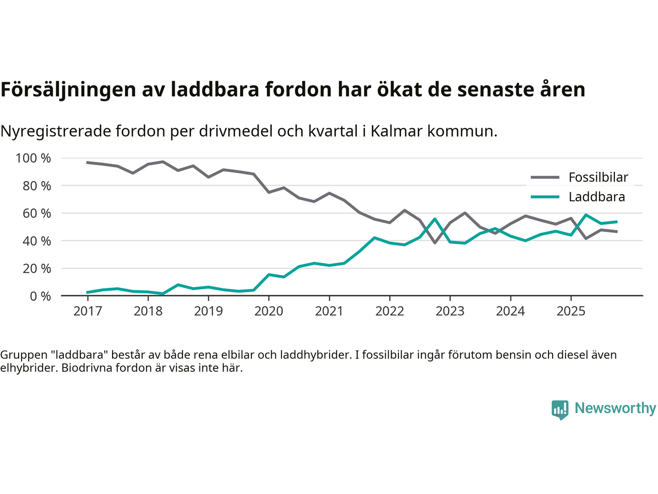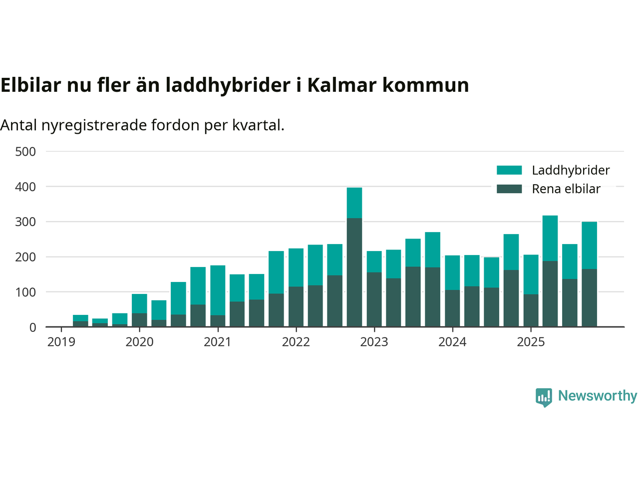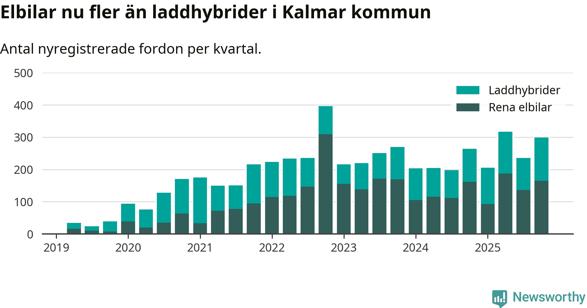 Under fjärde kvartalet 2025 var 53 procent av alla nyregistrerade personbilar i Kalmar kommun laddbara (sammanlagt registrerades 559 nya bilar). Merparten av de laddbara bilarna var rena elbilar (30 procent av alla).