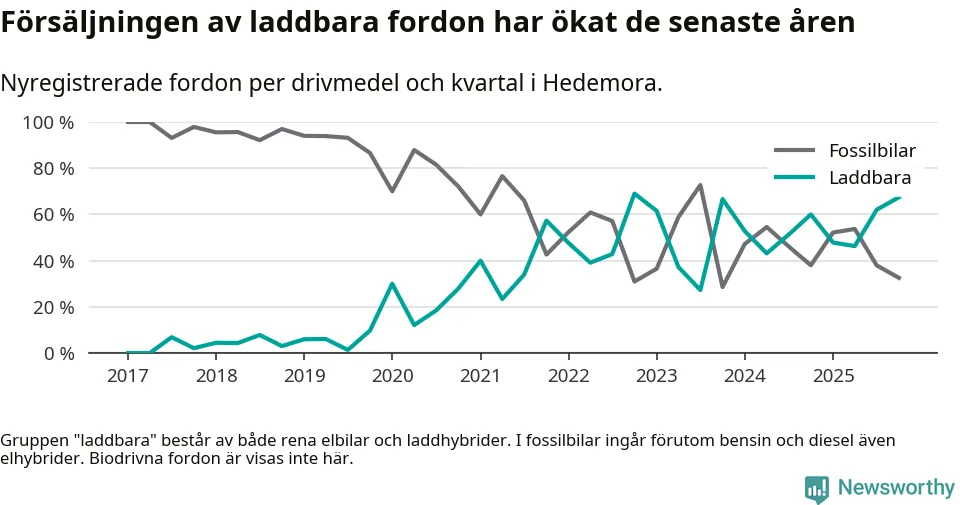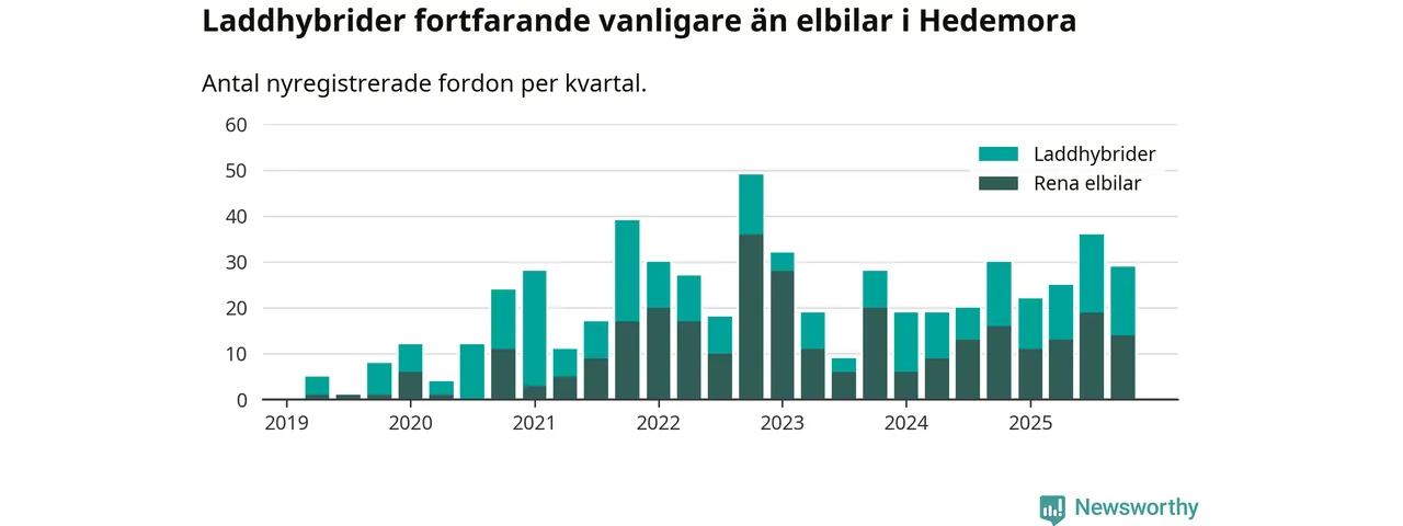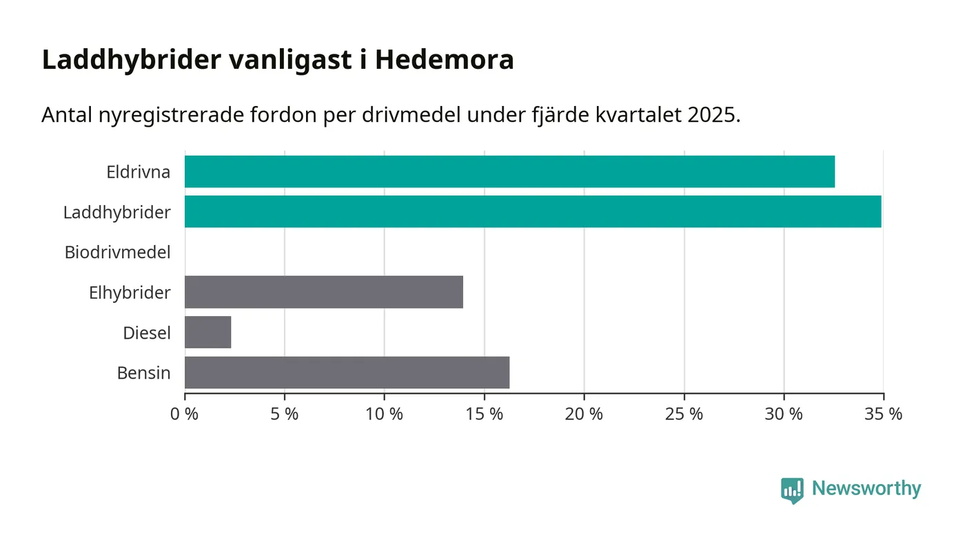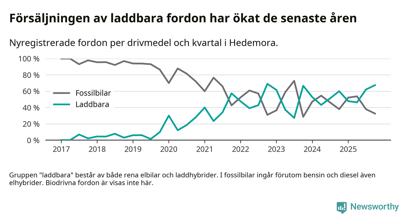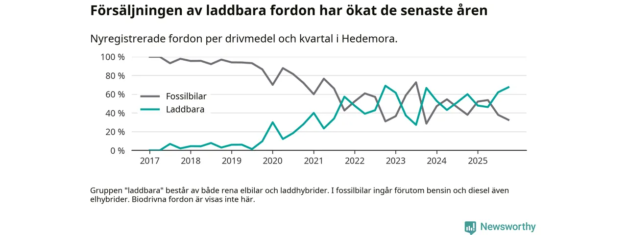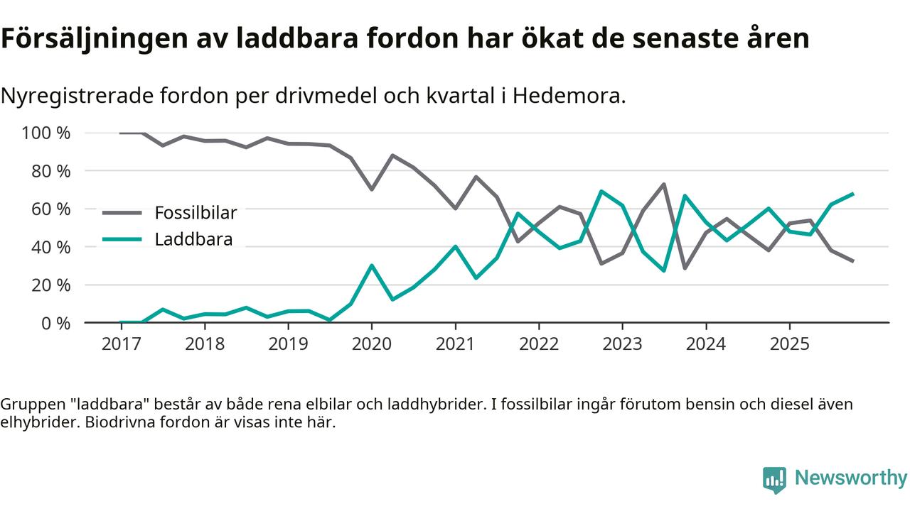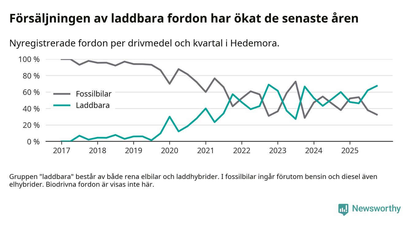 Under fjärde kvartalet 2025 var 67 procent av alla nyregistrerade personbilar i Hedemora laddbara (sammanlagt registrerades 43 nya bilar). Merparten av de laddbara bilarna var så kallade laddhybrider, det vill säga fordon som går att ladda och köra på el, men som även har en förbränningsmotor. 33 procent av alla nya bilar var rena elbilar.
