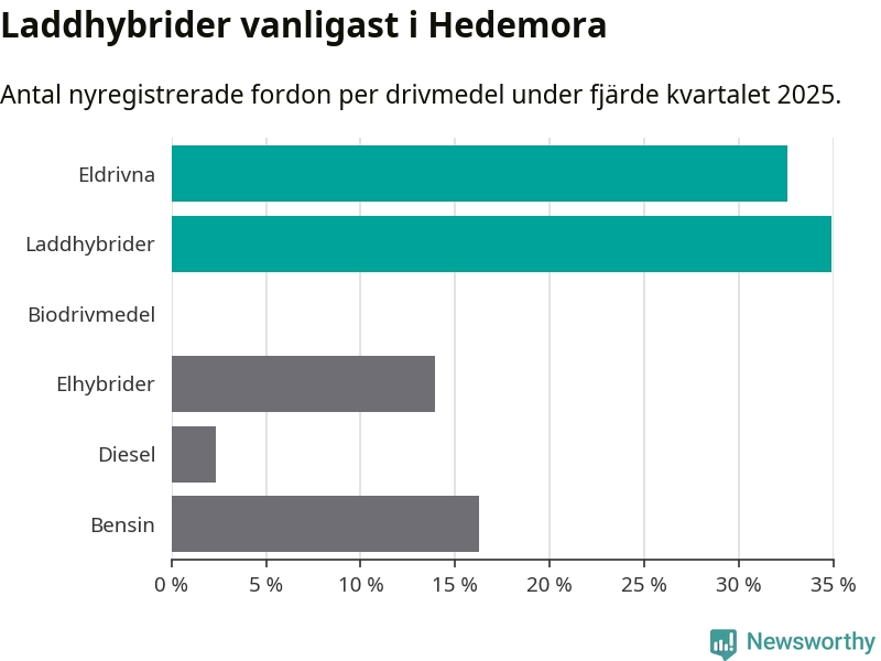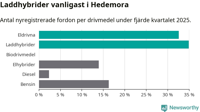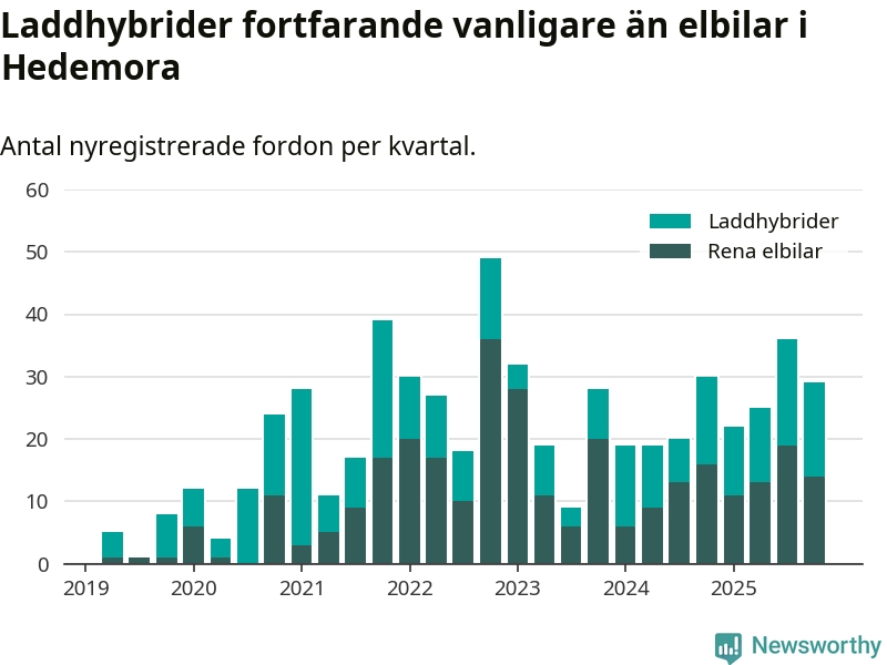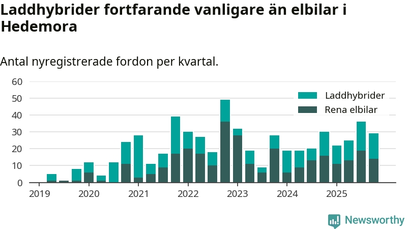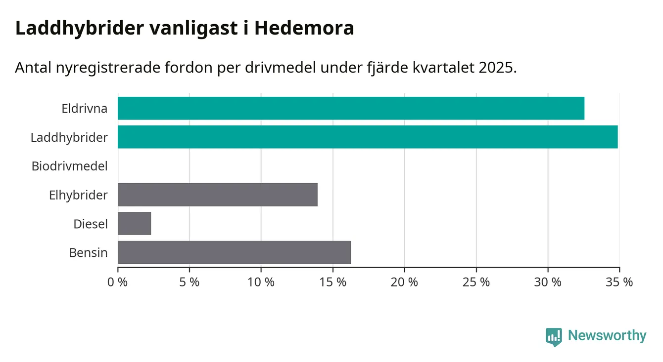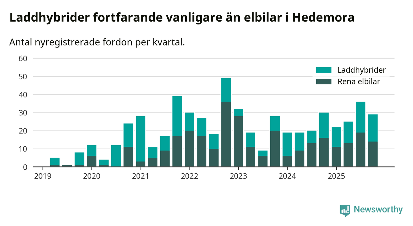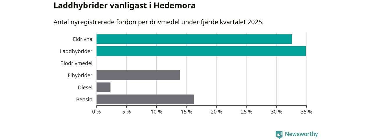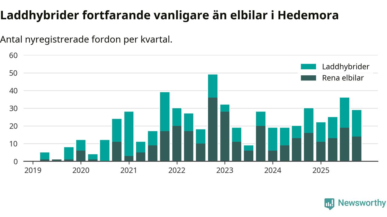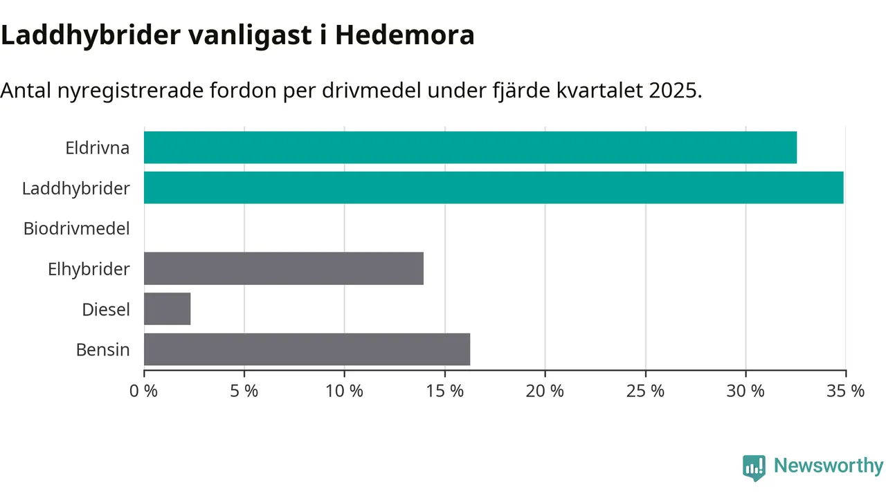 Under fjärde kvartalet 2025 var 67 procent av alla nyregistrerade personbilar i Hedemora laddbara (sammanlagt registrerades 43 nya bilar). Merparten av de laddbara bilarna var så kallade laddhybrider, det vill säga fordon som går att ladda och köra på el, men som även har en förbränningsmotor. 33 procent av alla nya bilar var rena elbilar.
