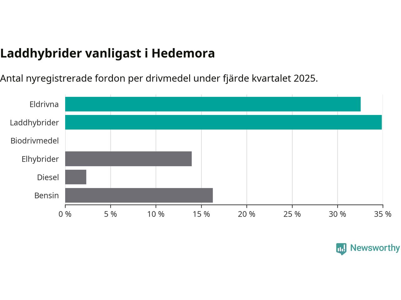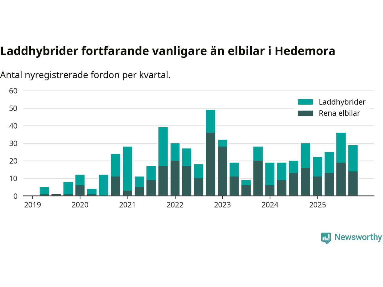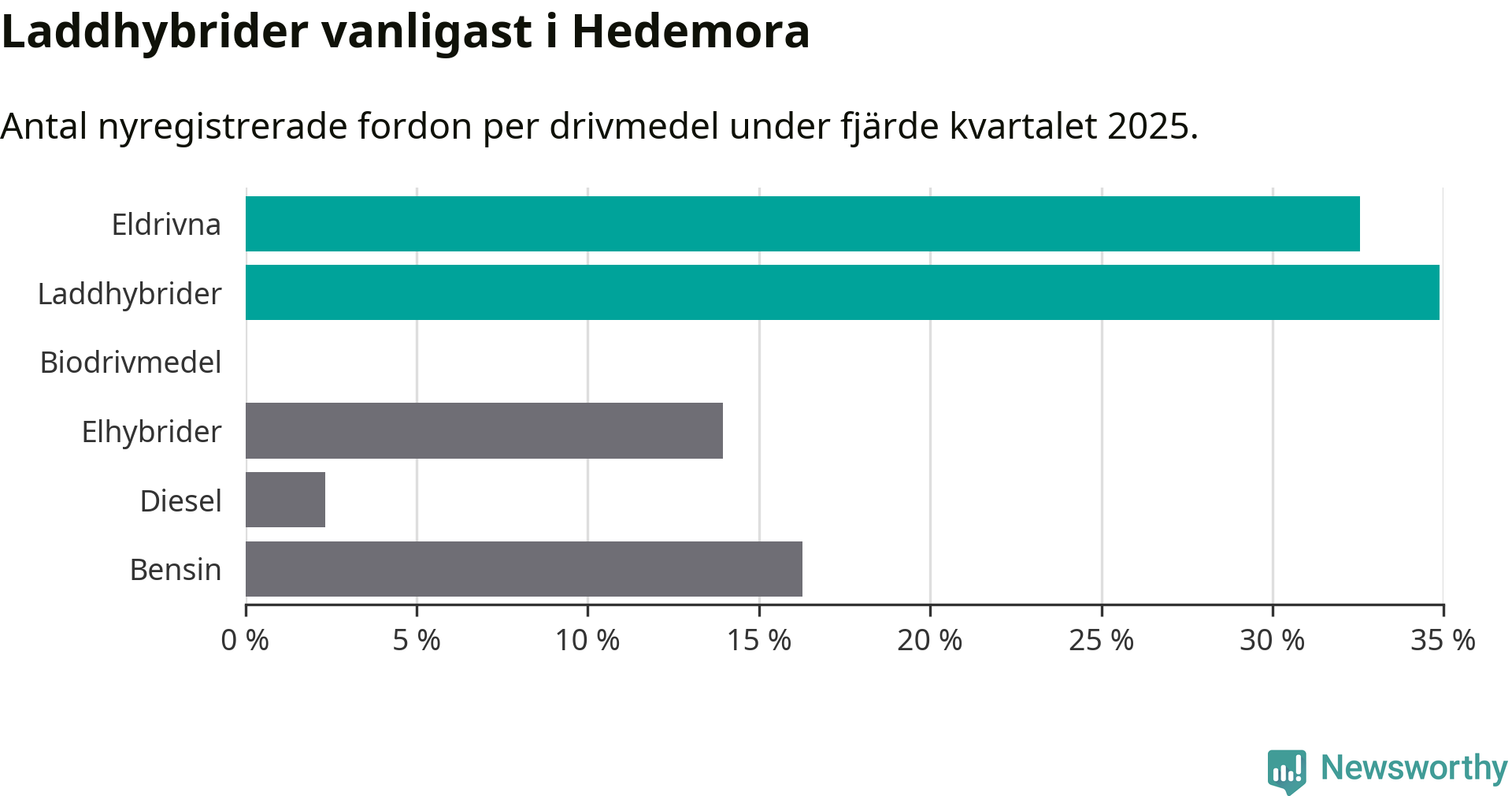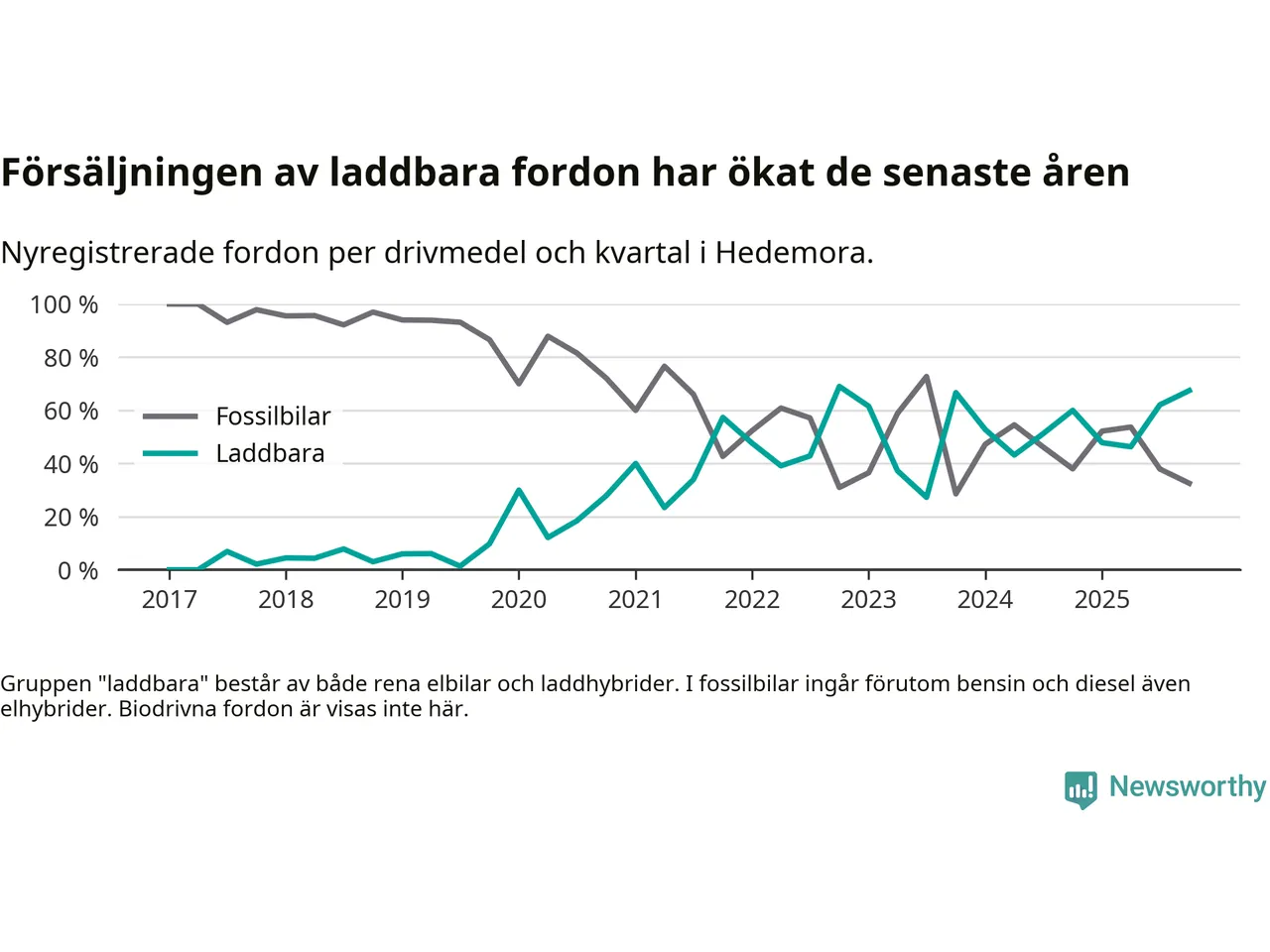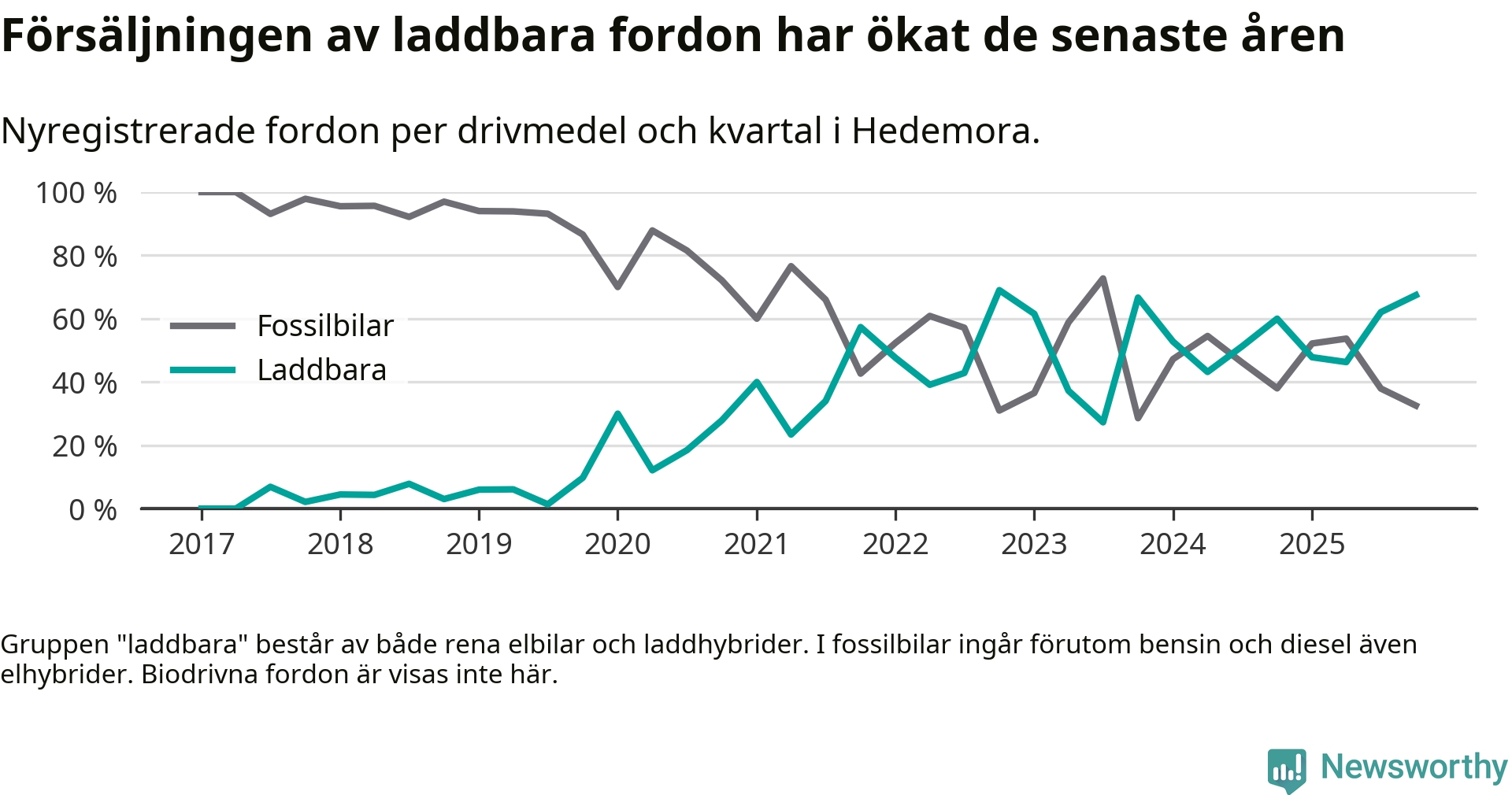 Under fjärde kvartalet 2025 var 67 procent av alla nyregistrerade personbilar i Hedemora laddbara (sammanlagt registrerades 43 nya bilar). Merparten av de laddbara bilarna var så kallade laddhybrider, det vill säga fordon som går att ladda och köra på el, men som även har en förbränningsmotor. 33 procent av alla nya bilar var rena elbilar.