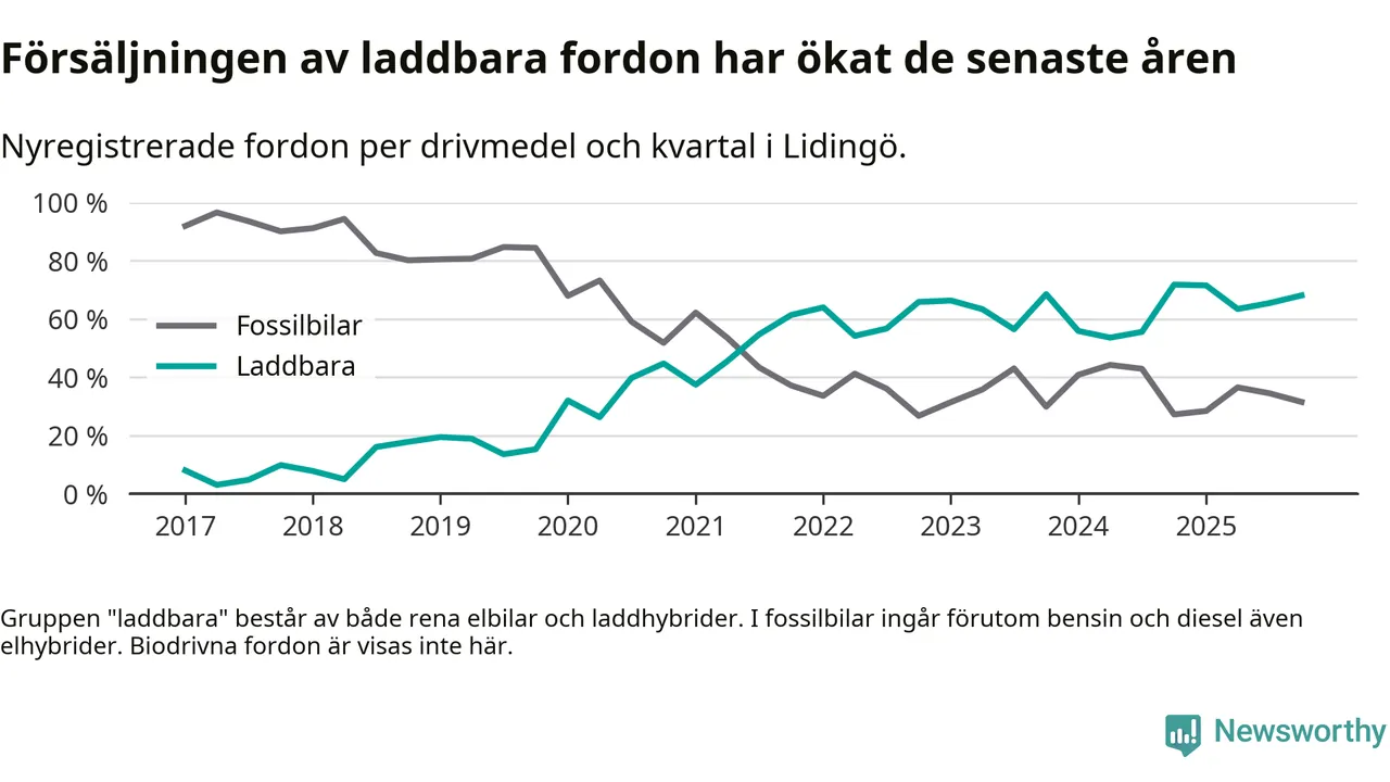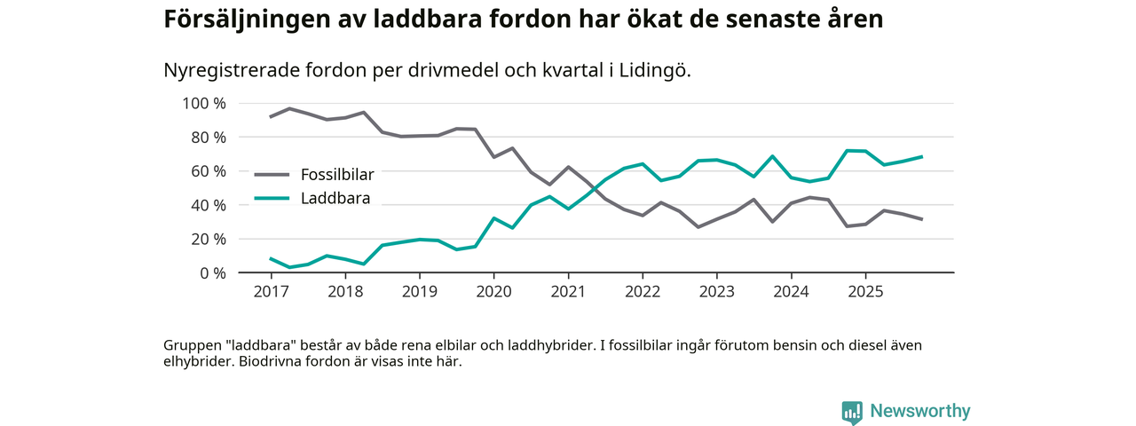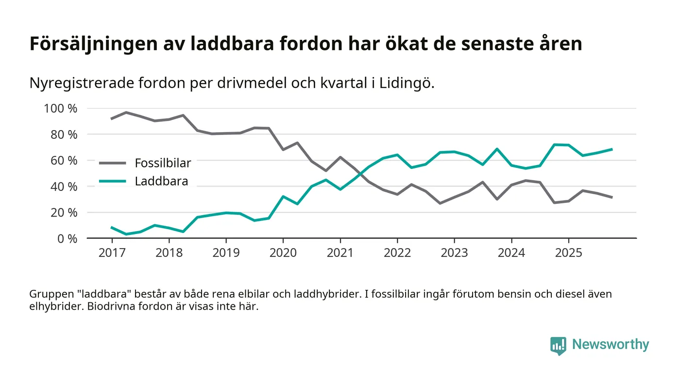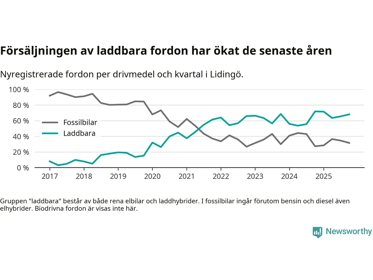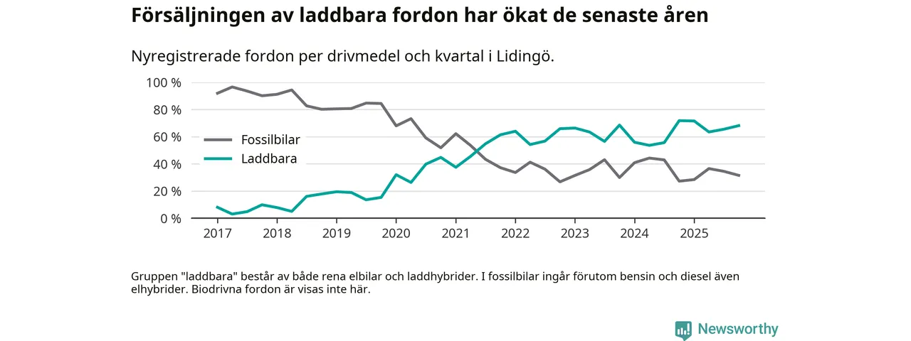 Under fjärde kvartalet 2025 var 68 procent av alla nyregistrerade personbilar på Lidingö laddbara (sammanlagt registrerades 295 nya bilar). Merparten av de laddbara bilarna var rena elbilar (38 procent av alla).