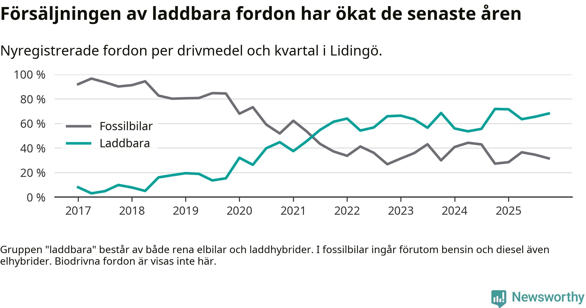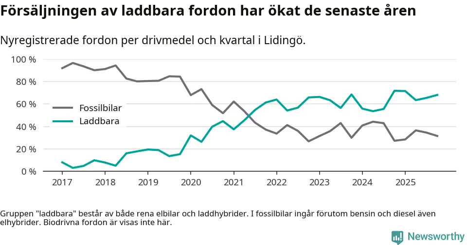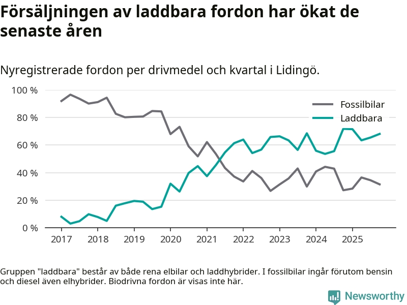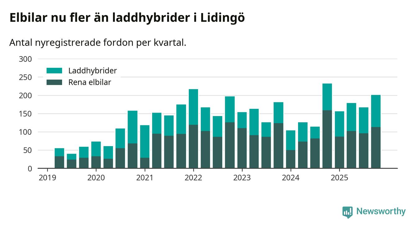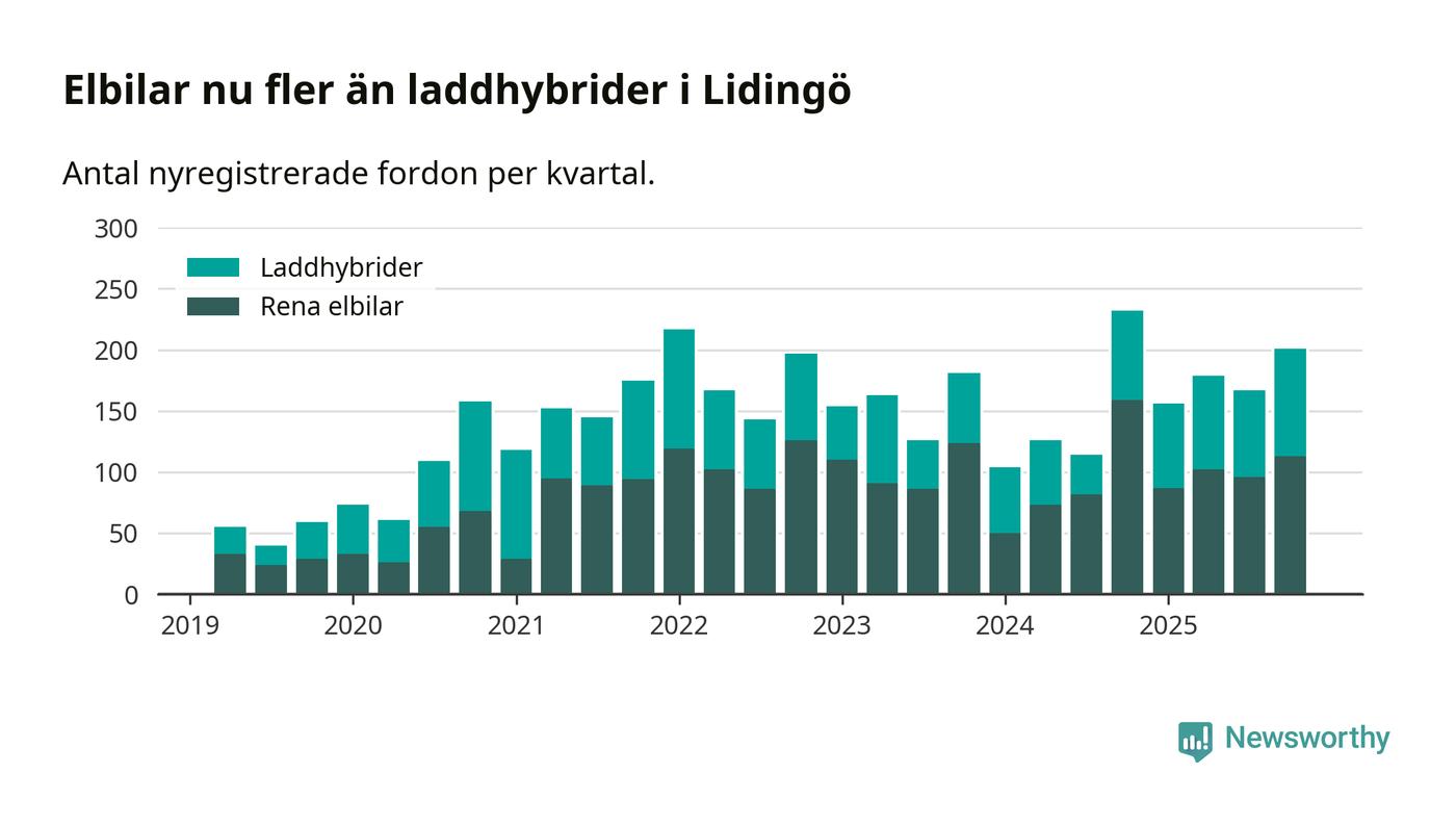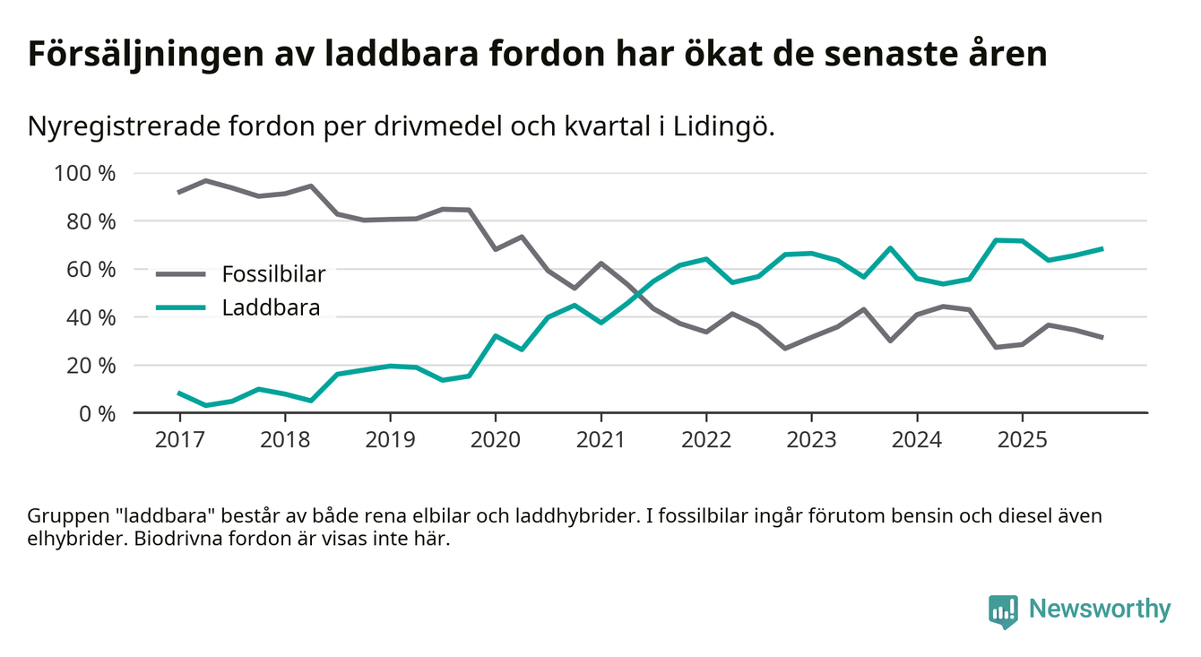 Under fjärde kvartalet 2025 var 68 procent av alla nyregistrerade personbilar på Lidingö laddbara (sammanlagt registrerades 295 nya bilar). Merparten av de laddbara bilarna var rena elbilar (38 procent av alla).